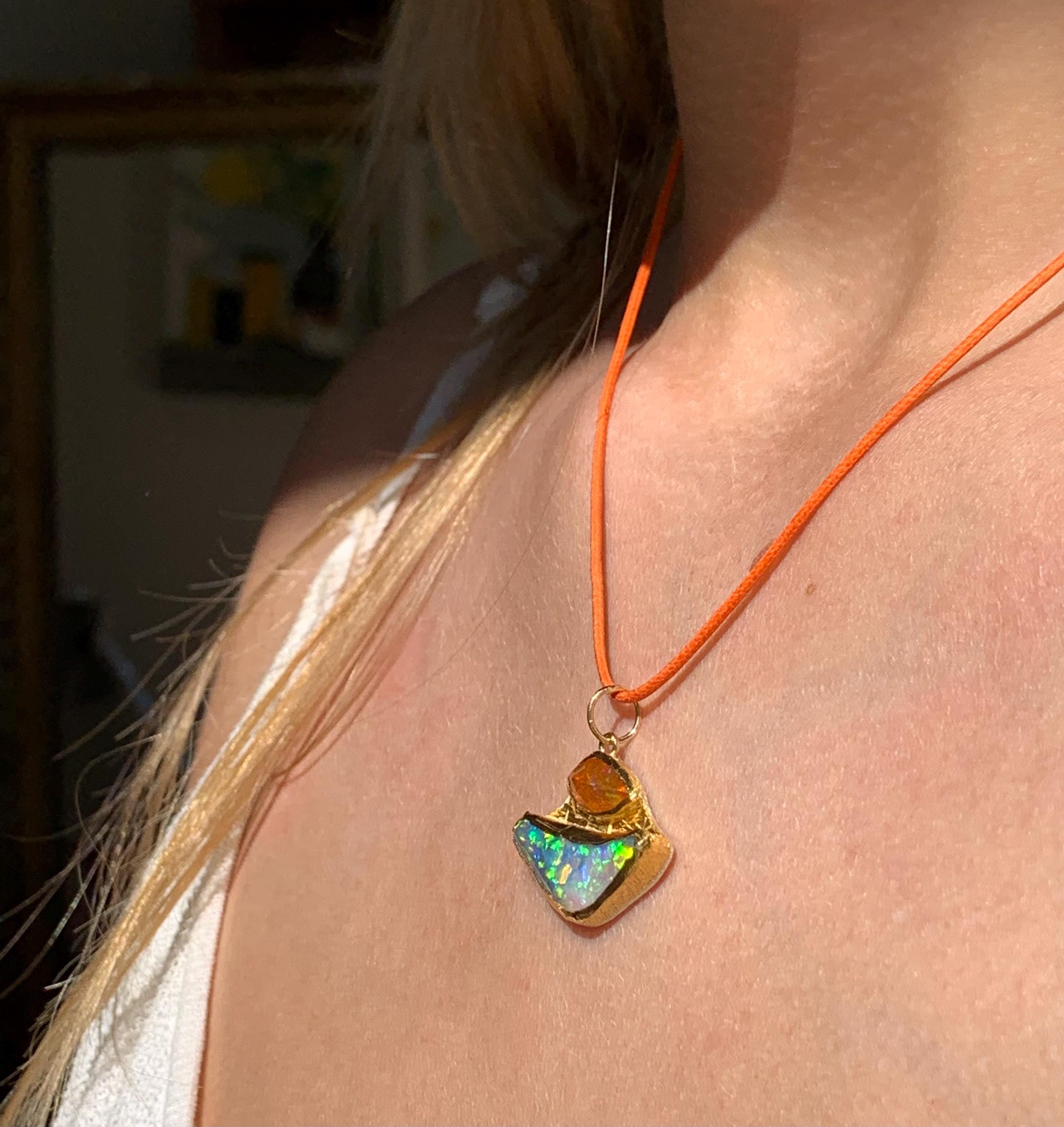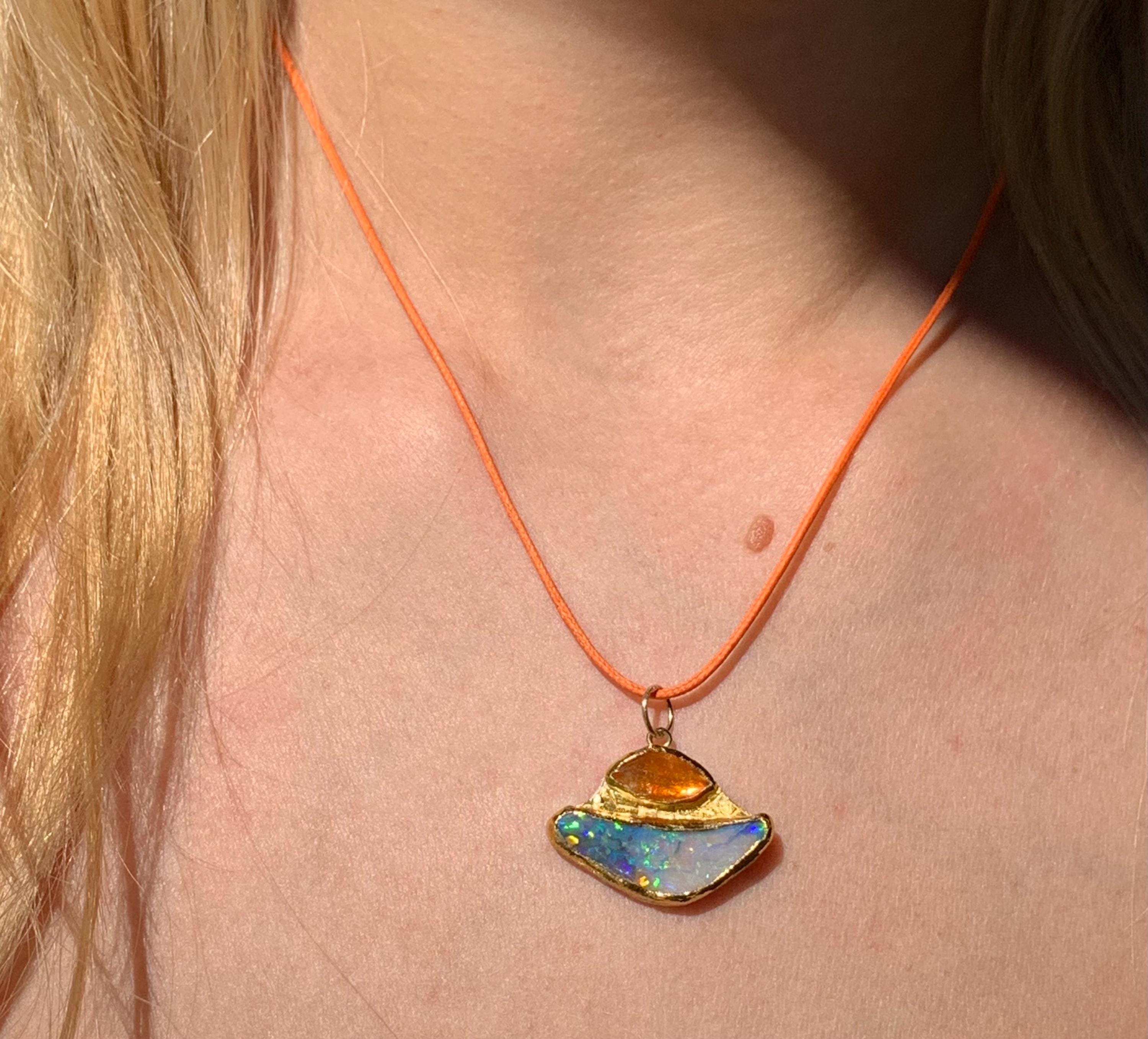 The pendant is done with 1 mexikan fire opal and 1 australian precious opal ( fine opal, cristal opal ) of 4,5 ct ( 0,8 cm x 2,46 cm ) which are setted in solid 24 k gold.