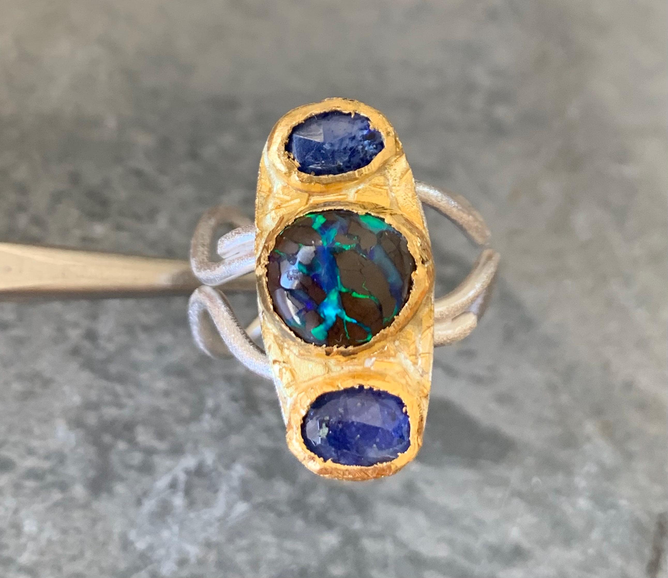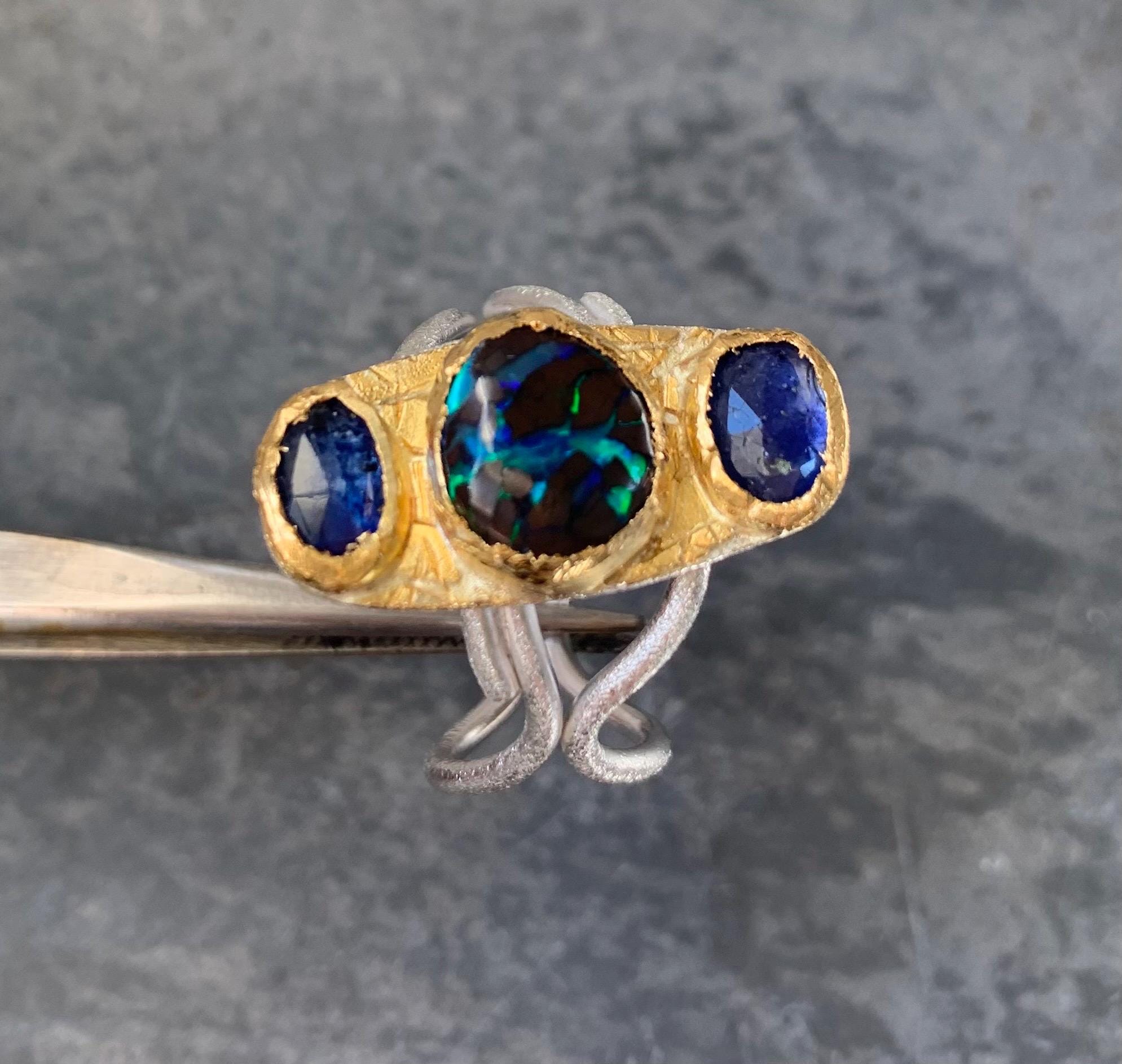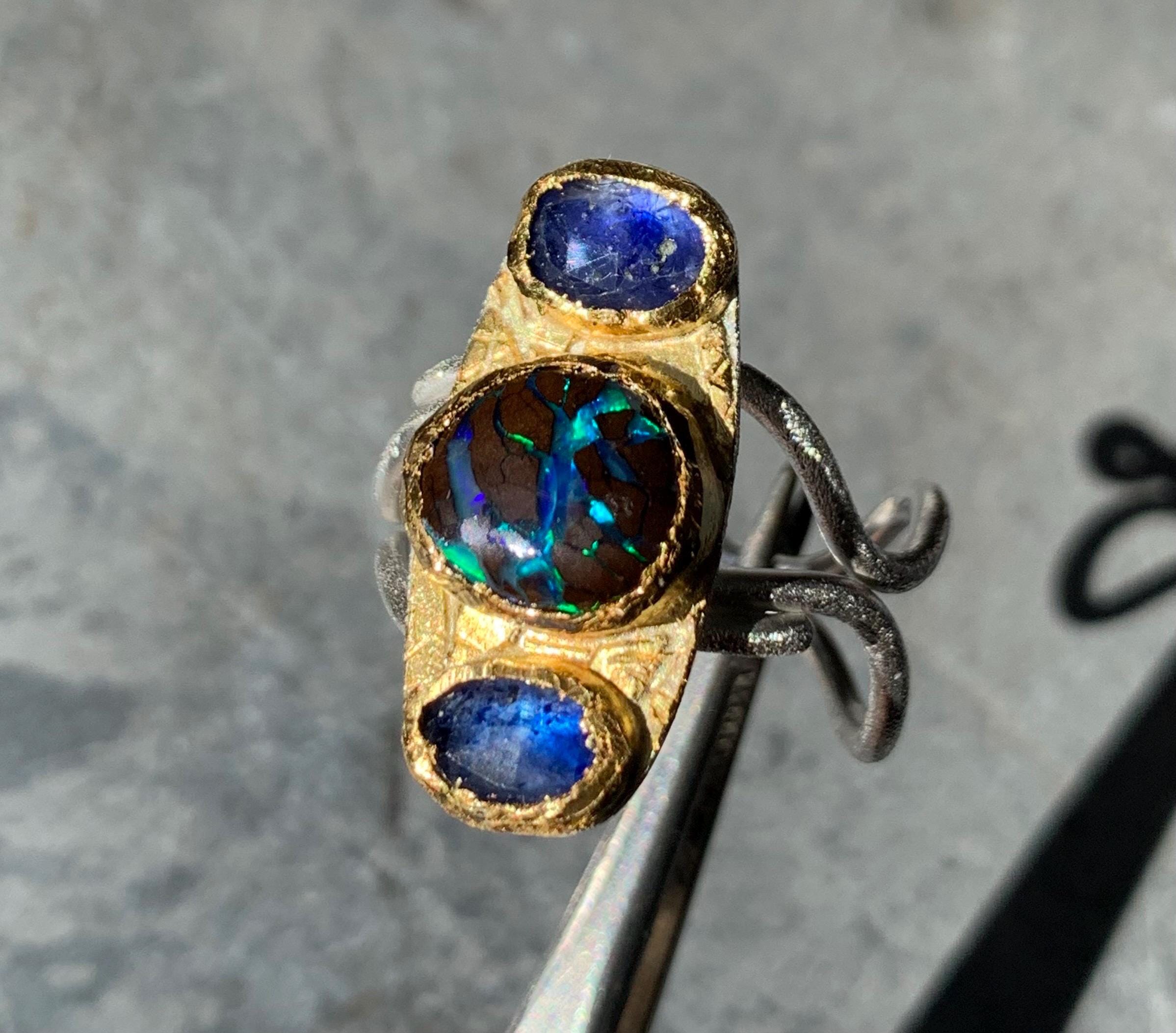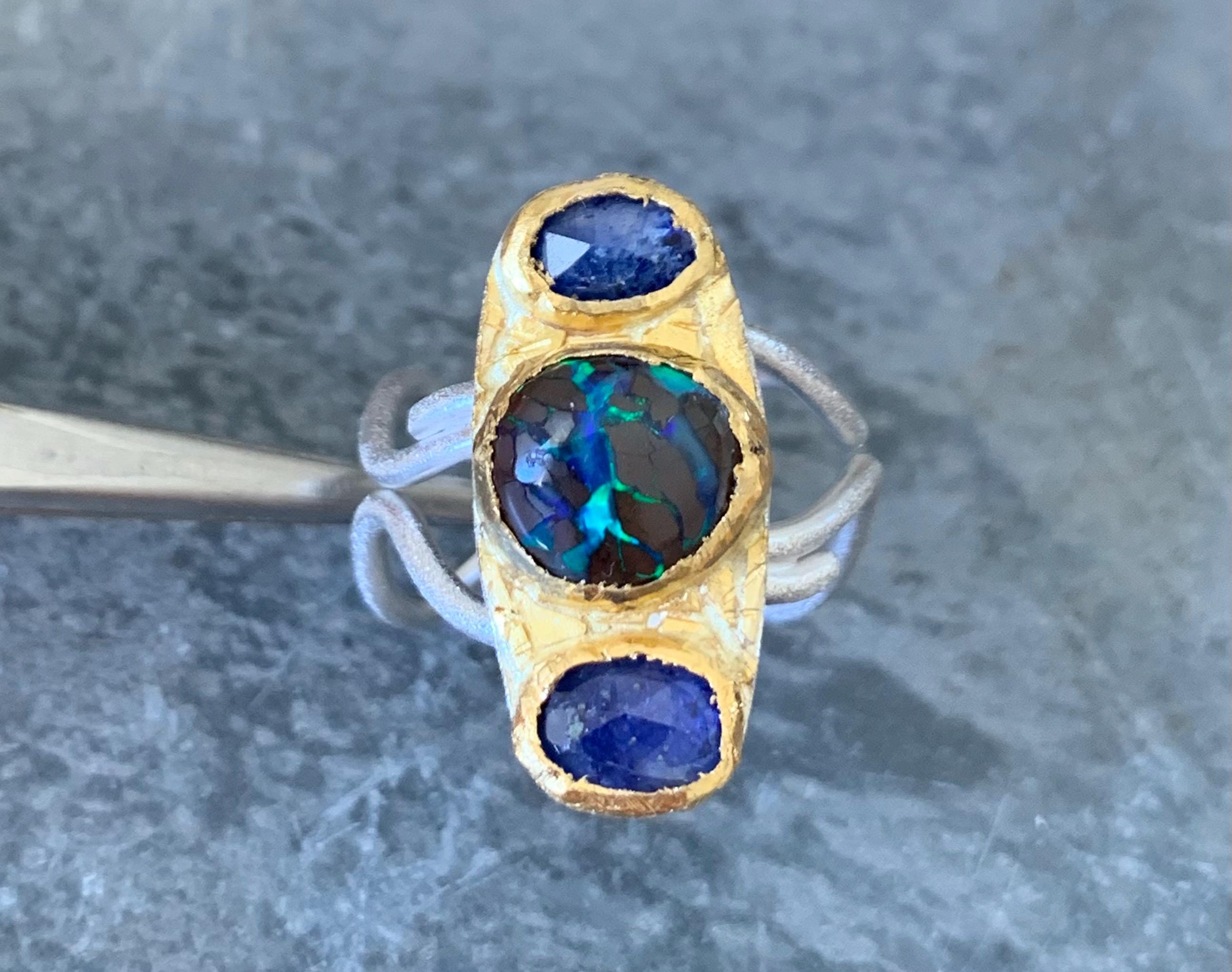 The ring is done with 2 sapphires ( 1,4 ct, ( the both ); 6,6 mm x 4,6 mm ) and 1 australian boulder opal ( 3,25 ct; 8,8 x 8,5 mm ) which are setted in an irregular way in 24 ct fine gold.