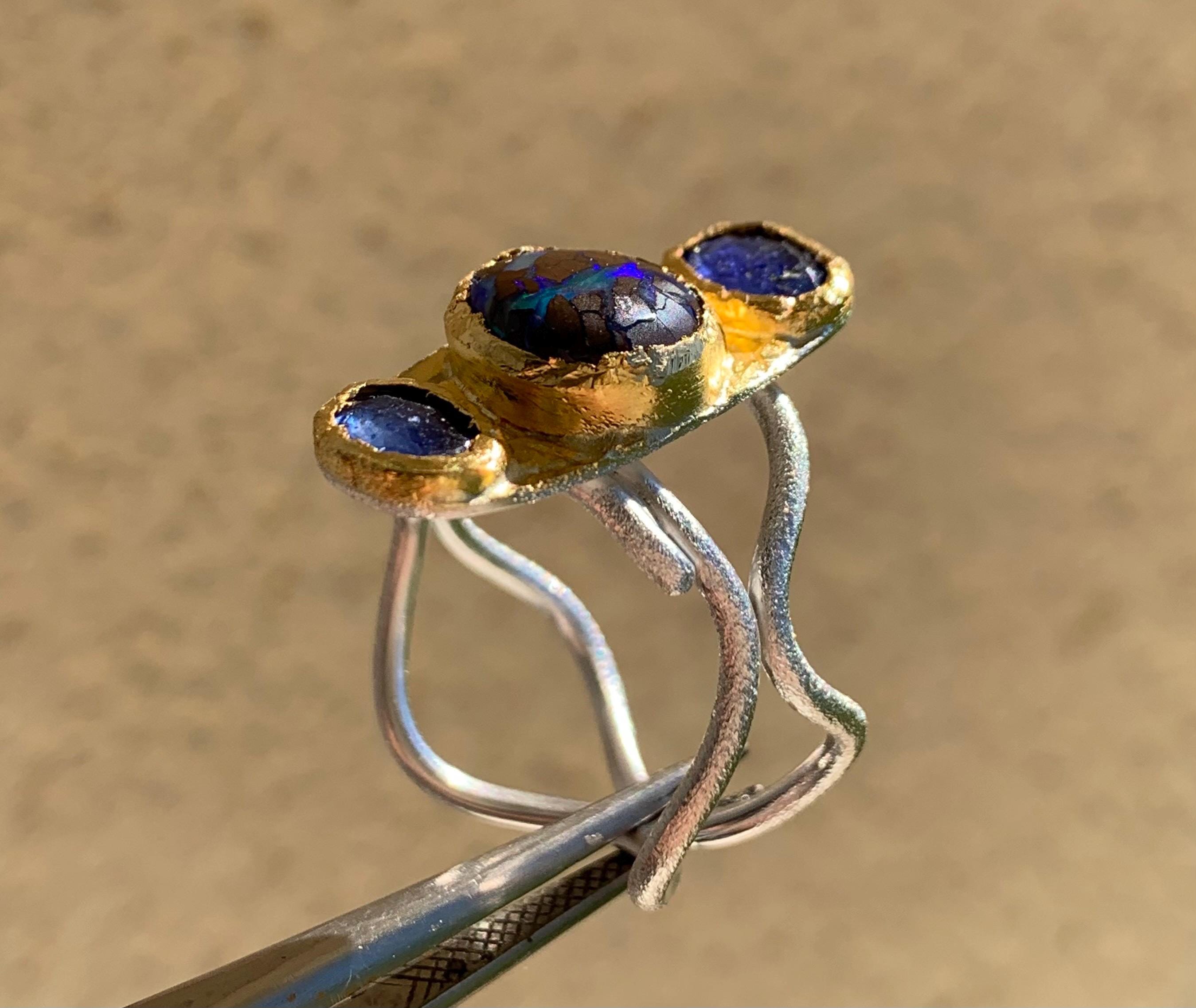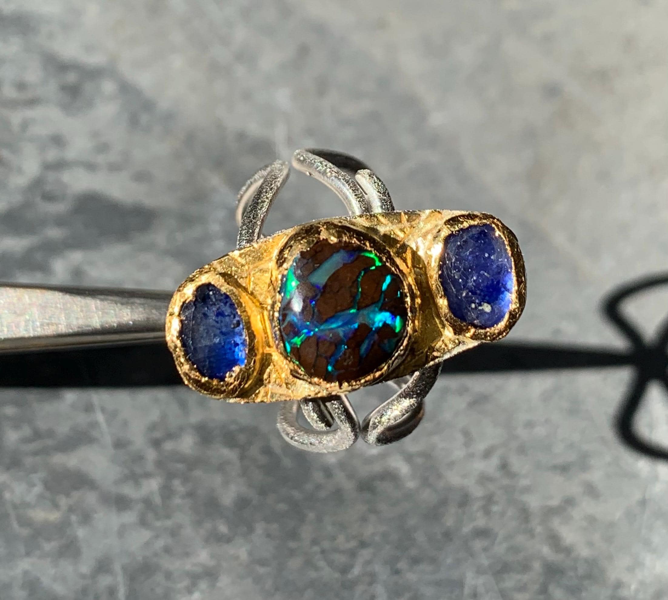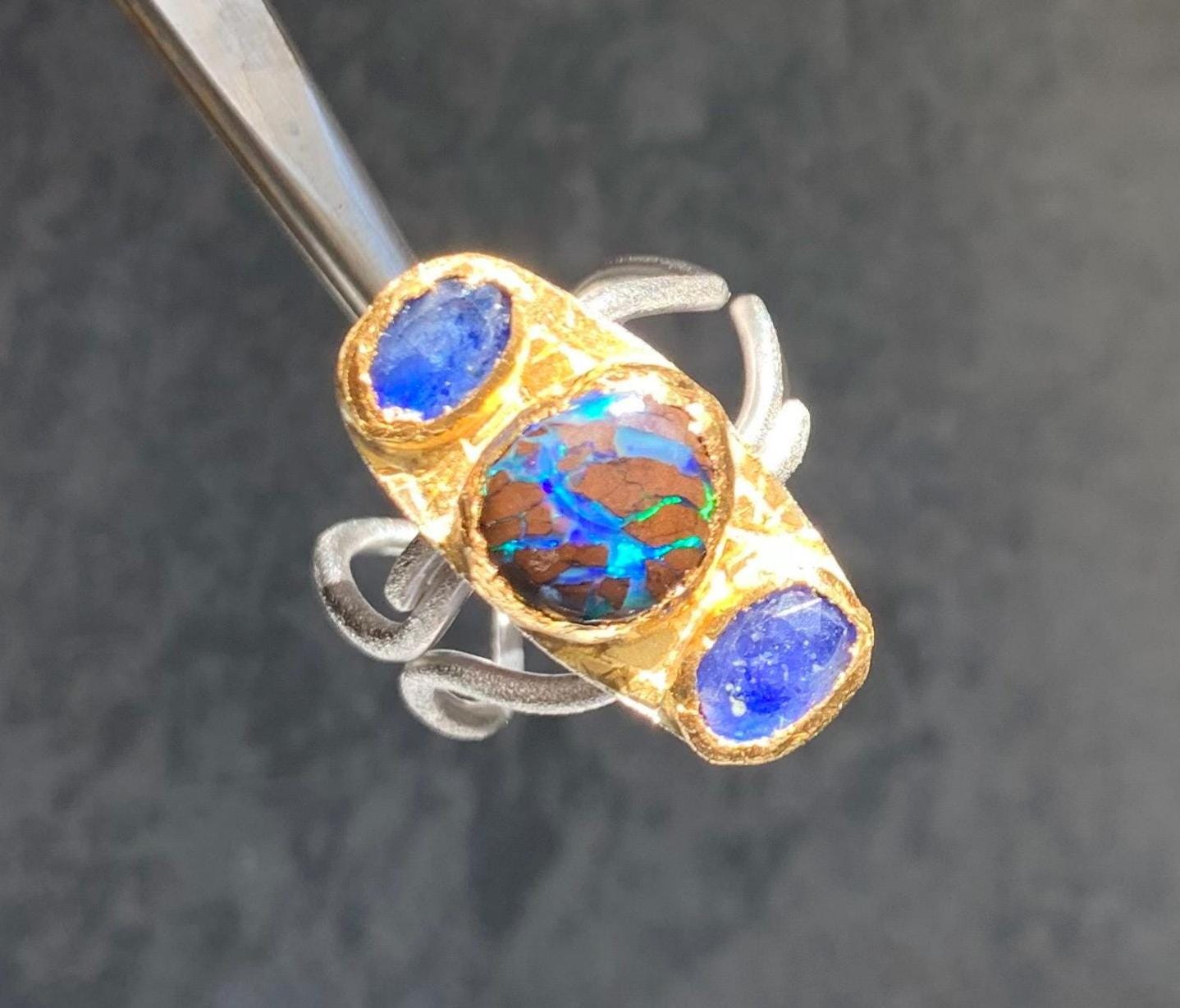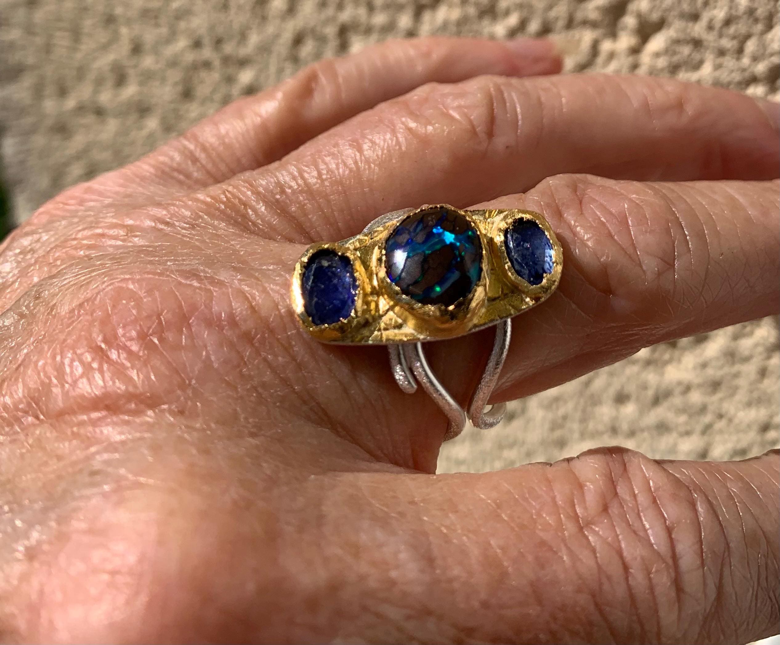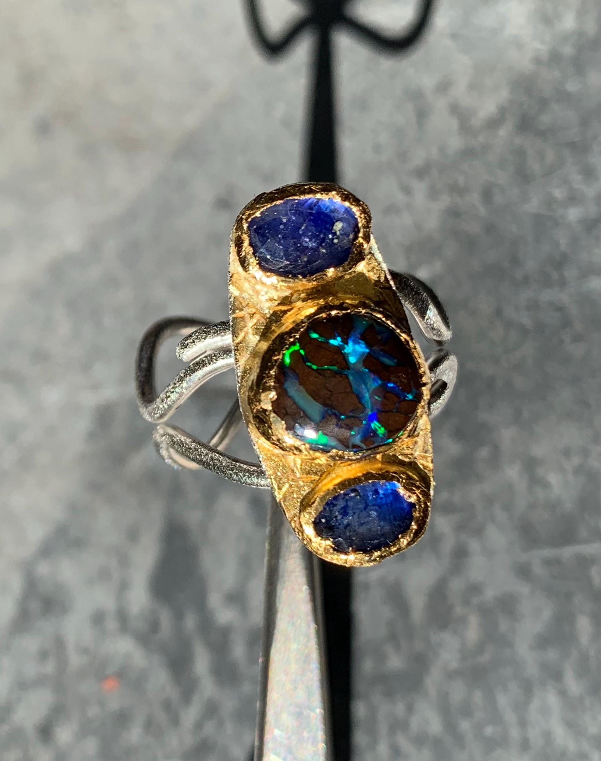 The ring is done with 2 sapphires ( 1,4 ct, ( the both ); 6,6 mm x 4,6 mm ) and 1 australian boulder opal ( 3,25 ct; 8,8 x 8,5 mm ) which are setted in an irregular way in 24 ct fine gold.