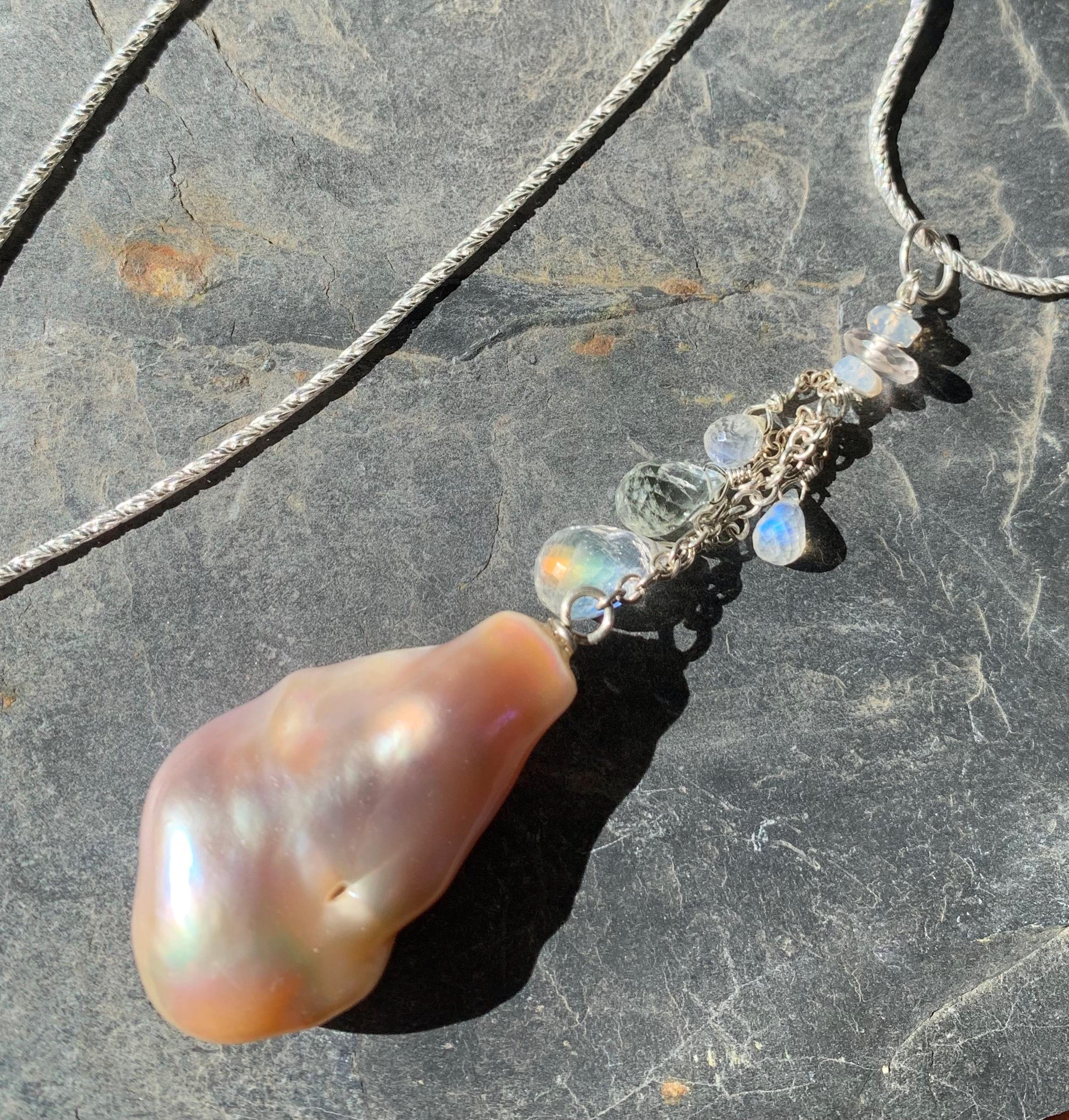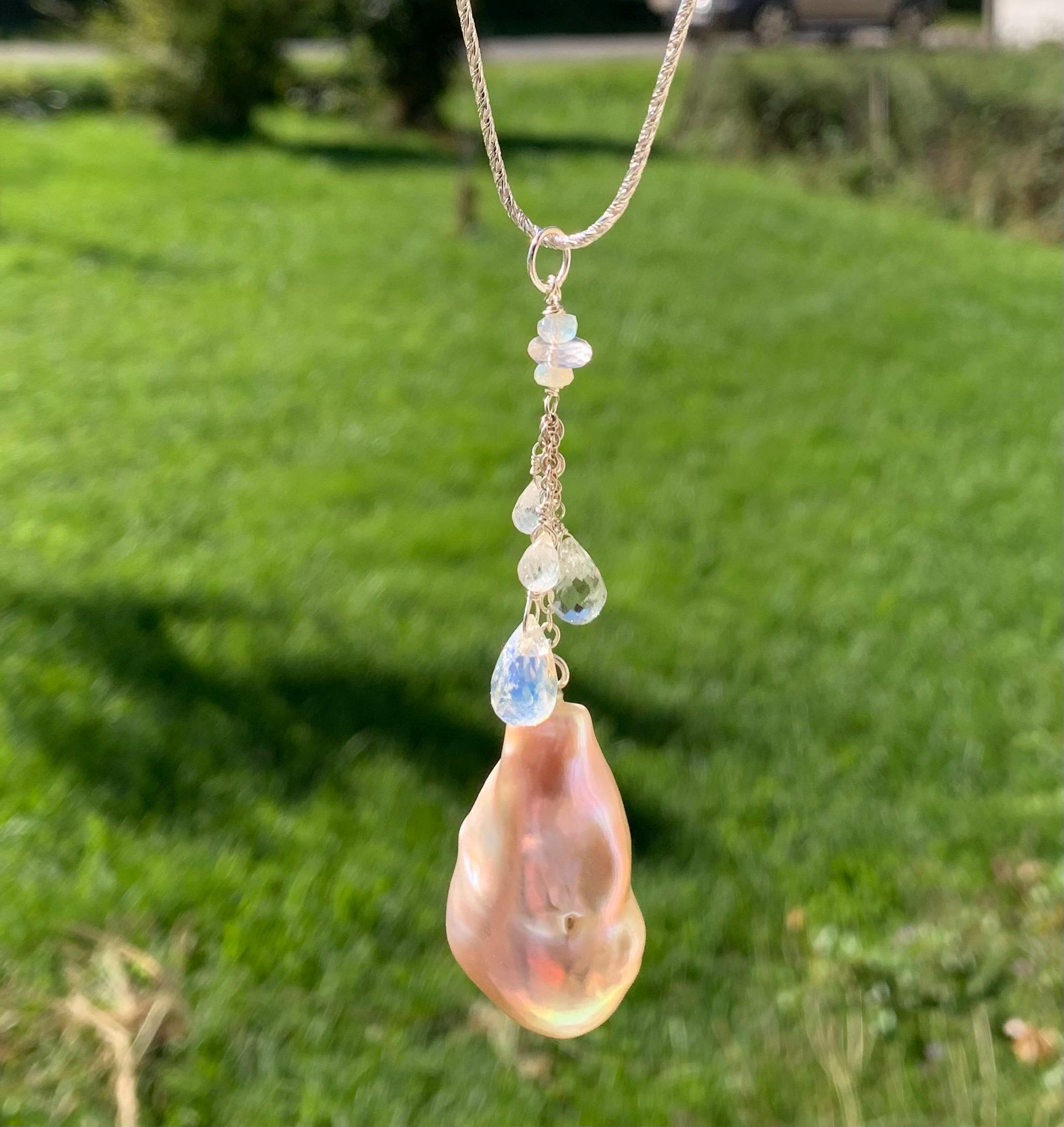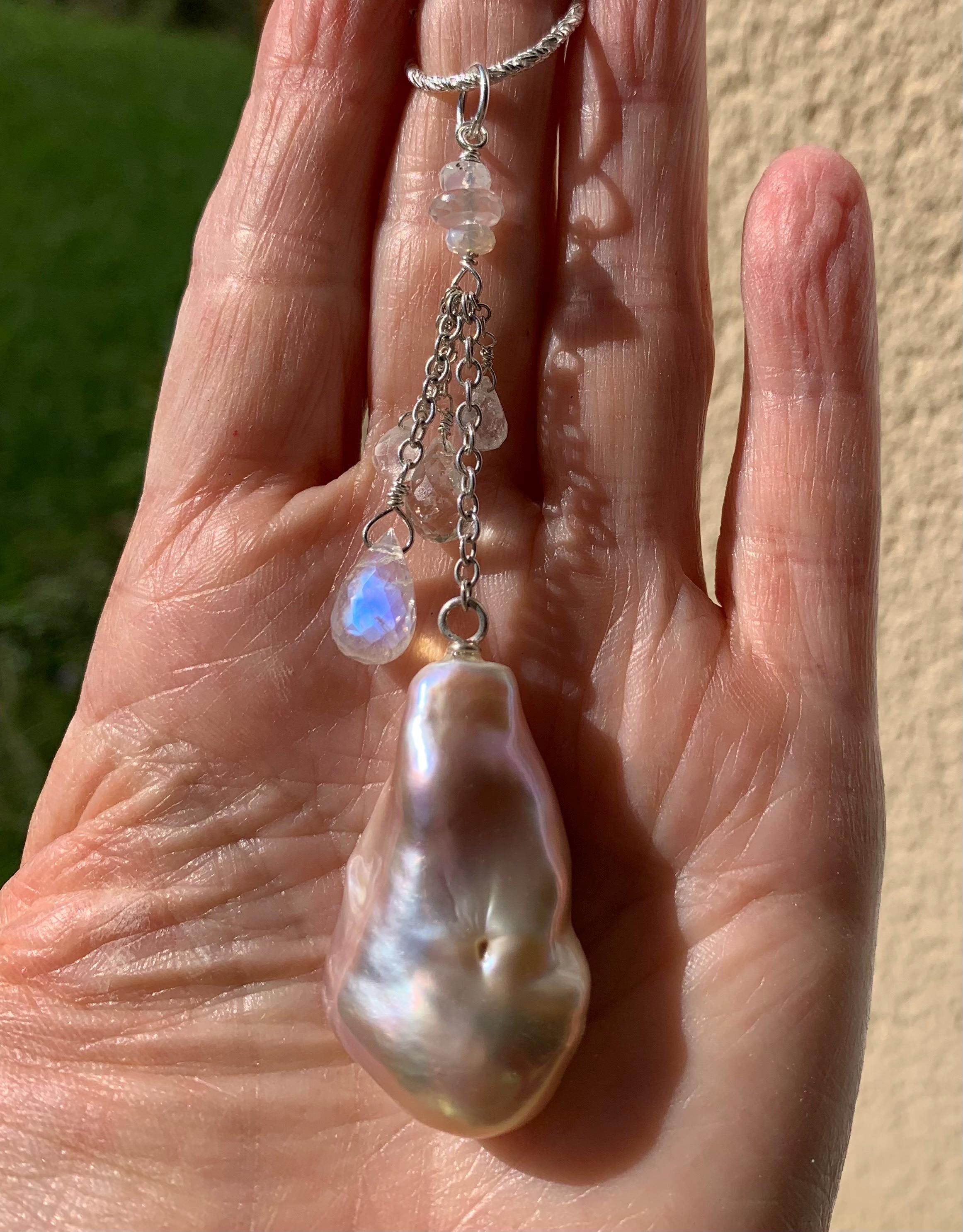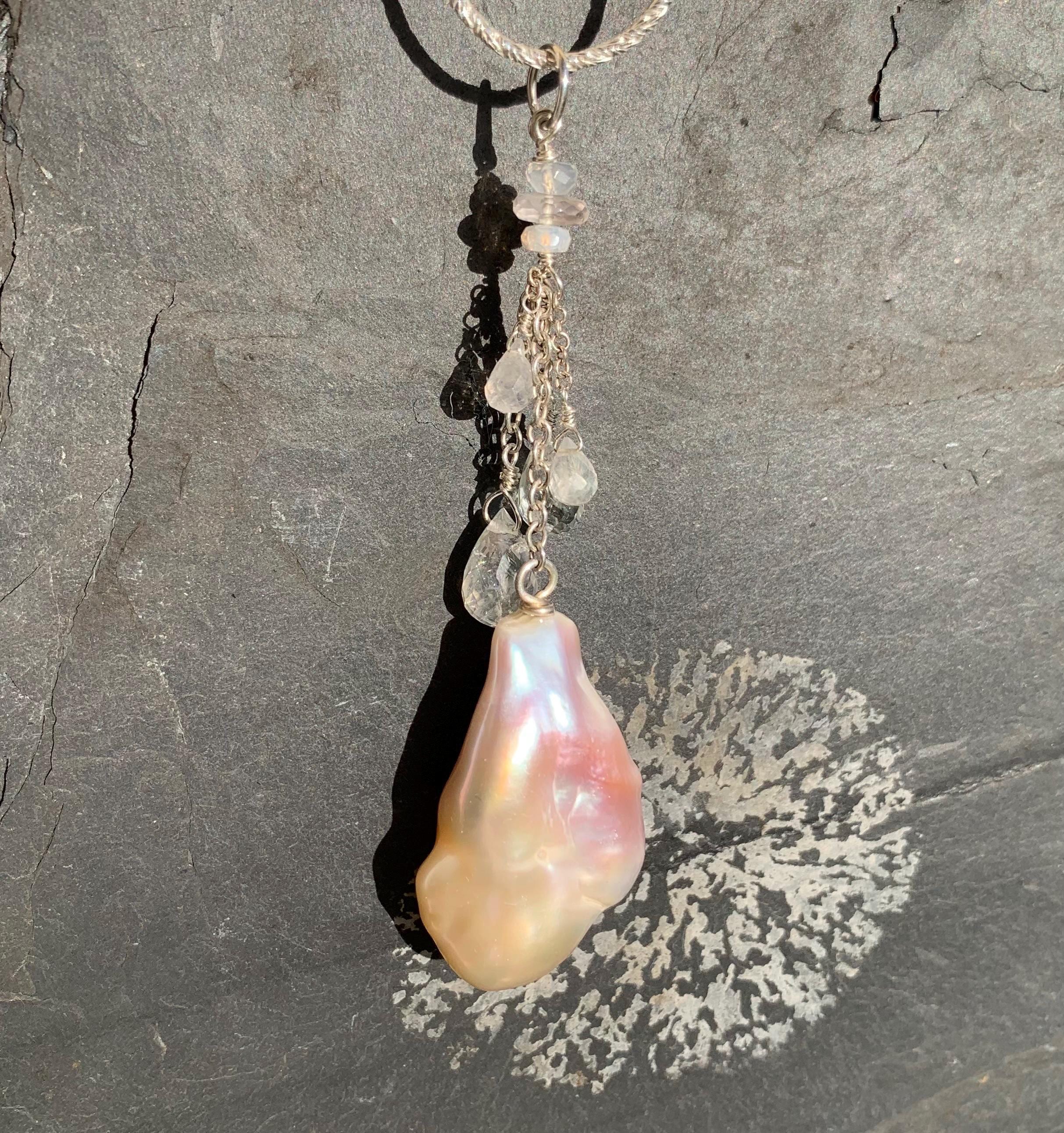 The main piece of the pendant is a very big freshwater baroque pearl,, 3 little ethiopian opals and 4 moonstone briolettes hanging on tiny silver chains and wire.