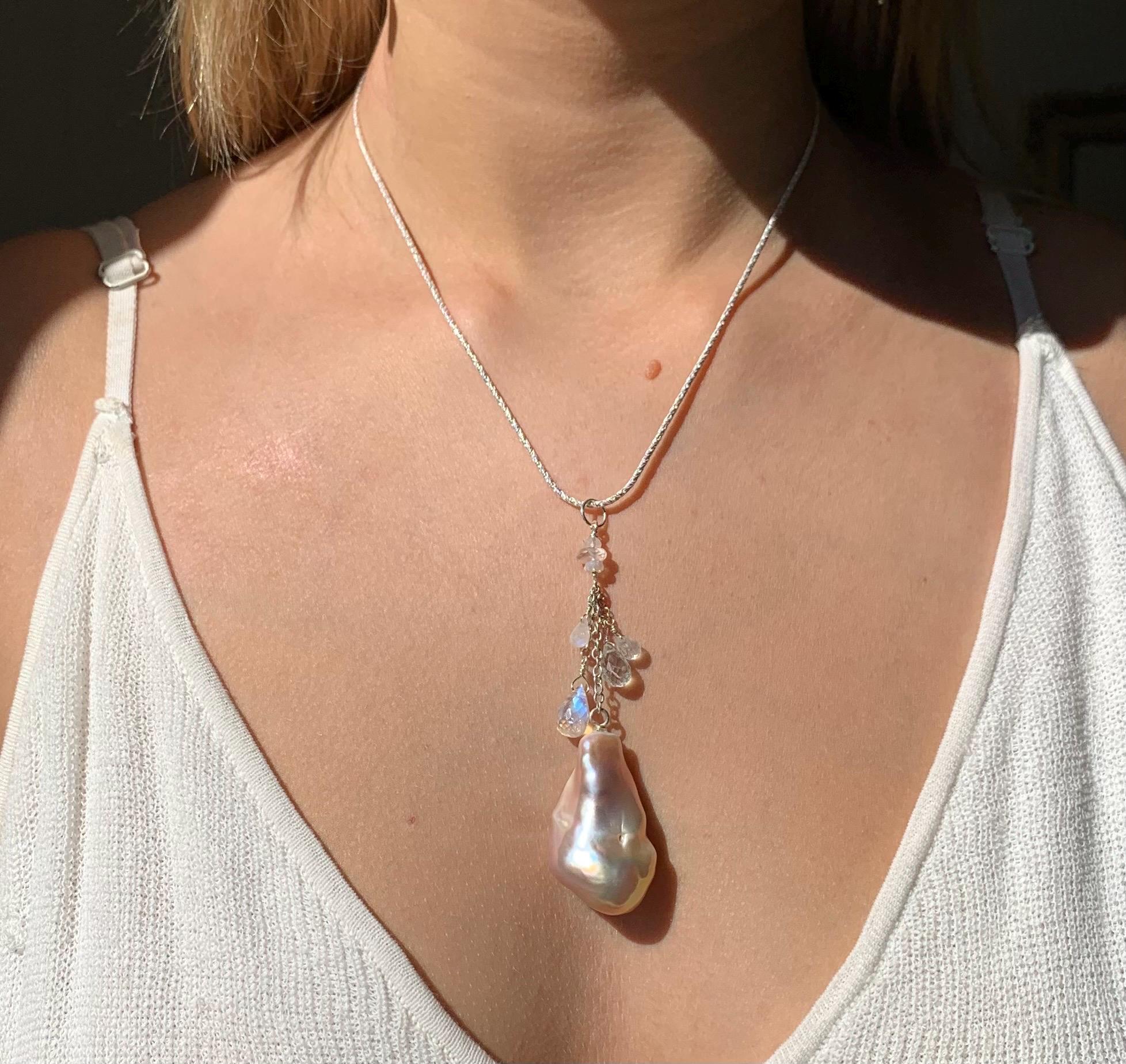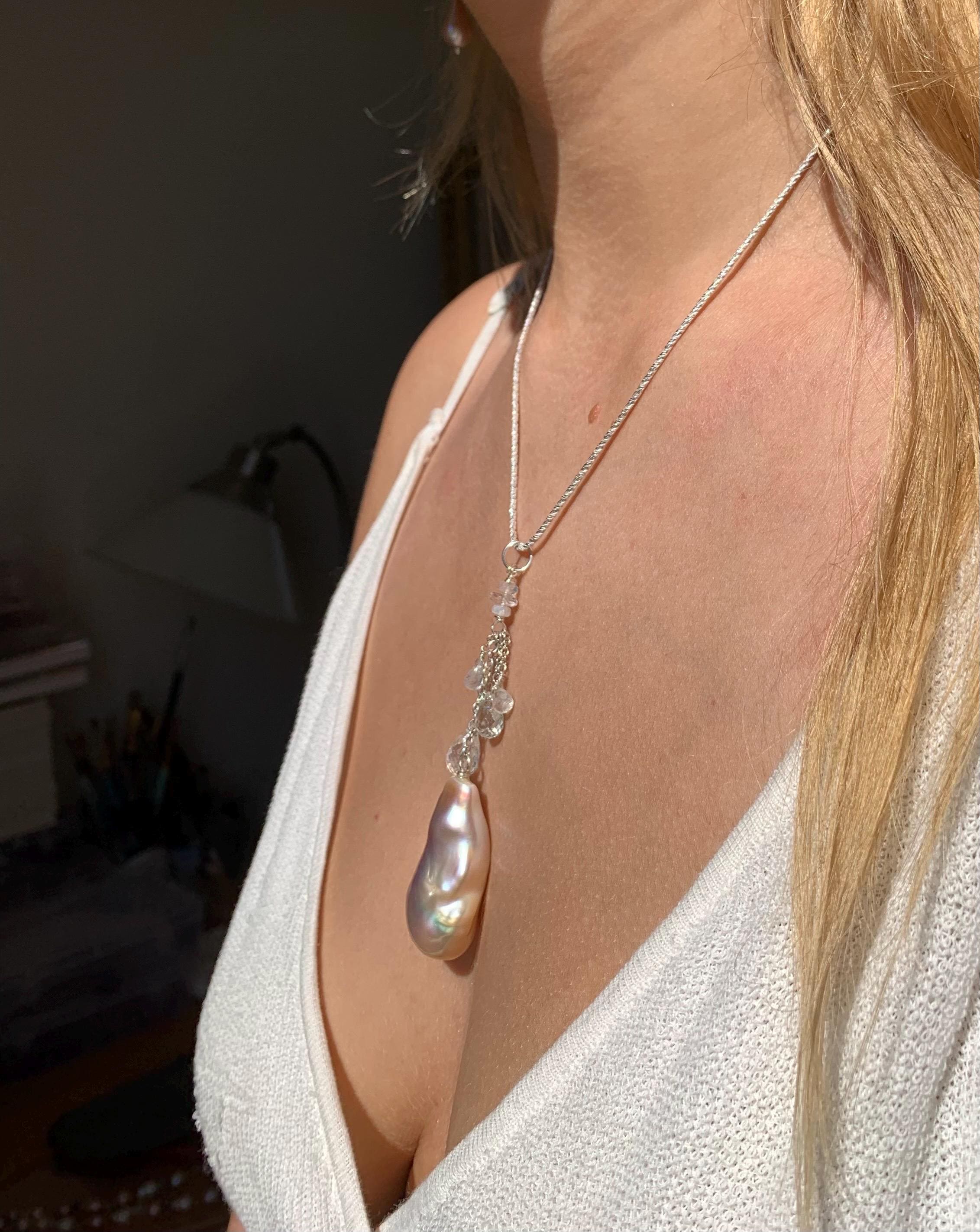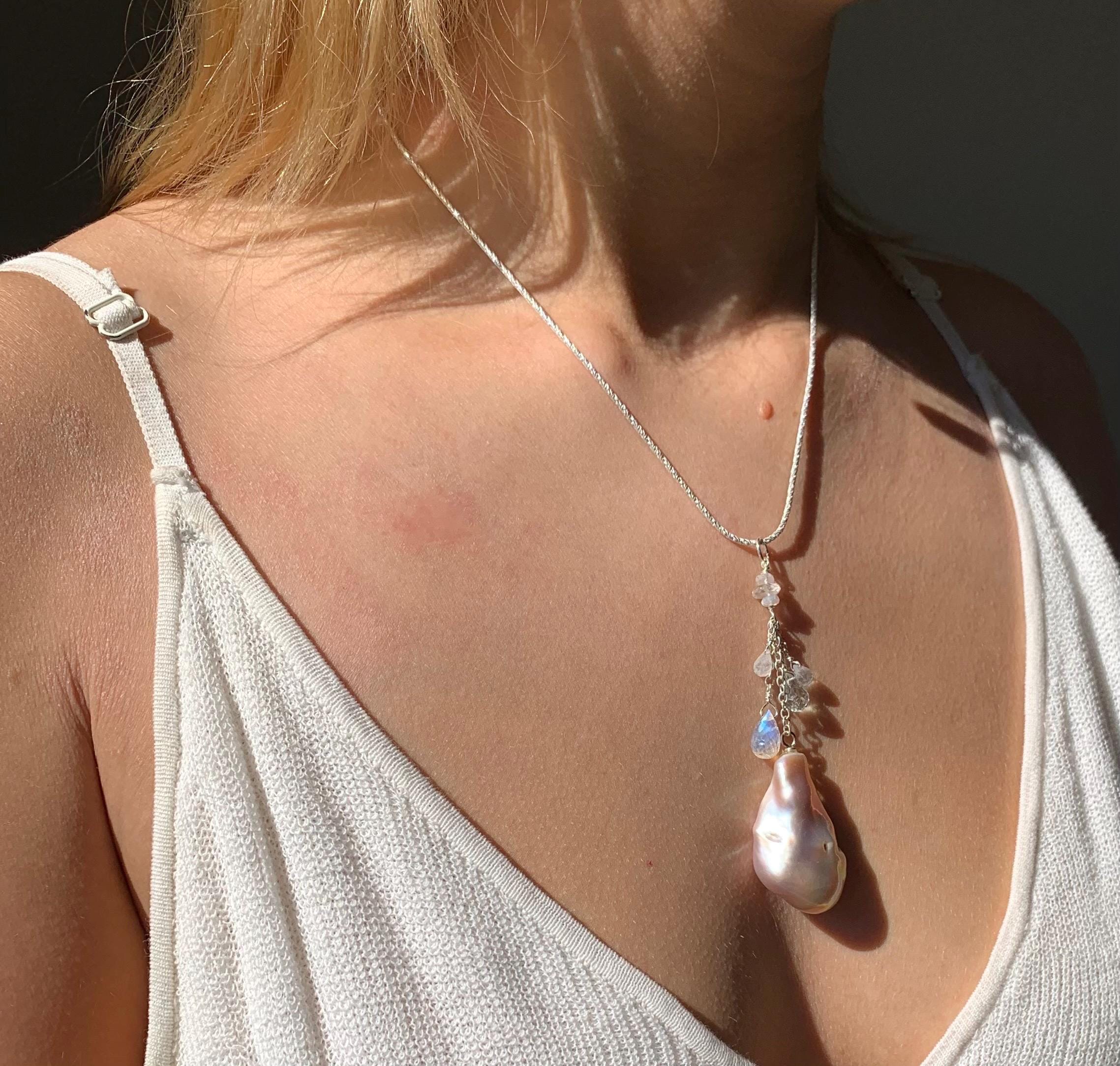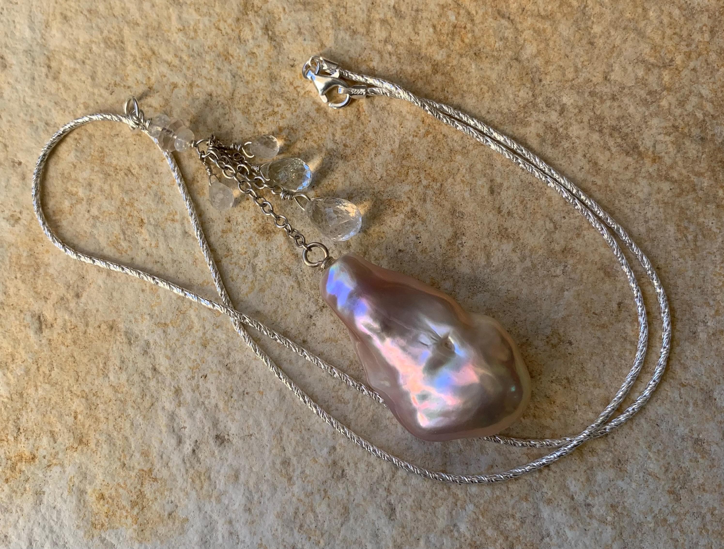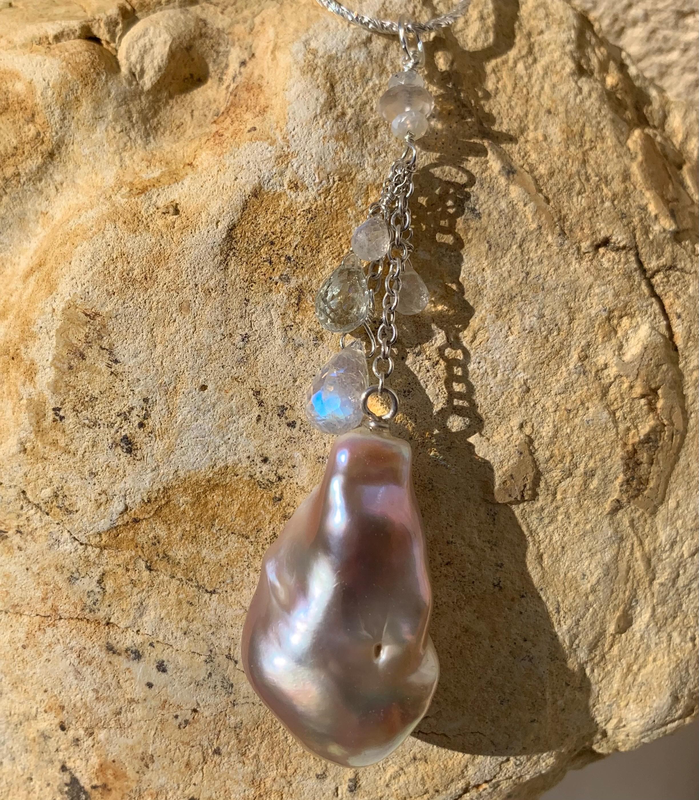 The main piece of the pendant is a very big freshwater baroque pearl,, 3 little ethiopian opals and 4 moonstone briolettes hanging on tiny silver chains and wire.