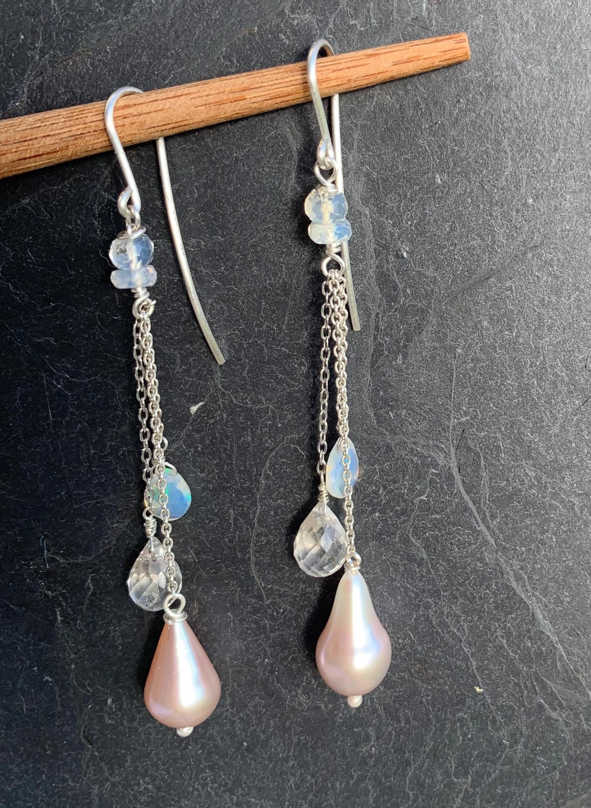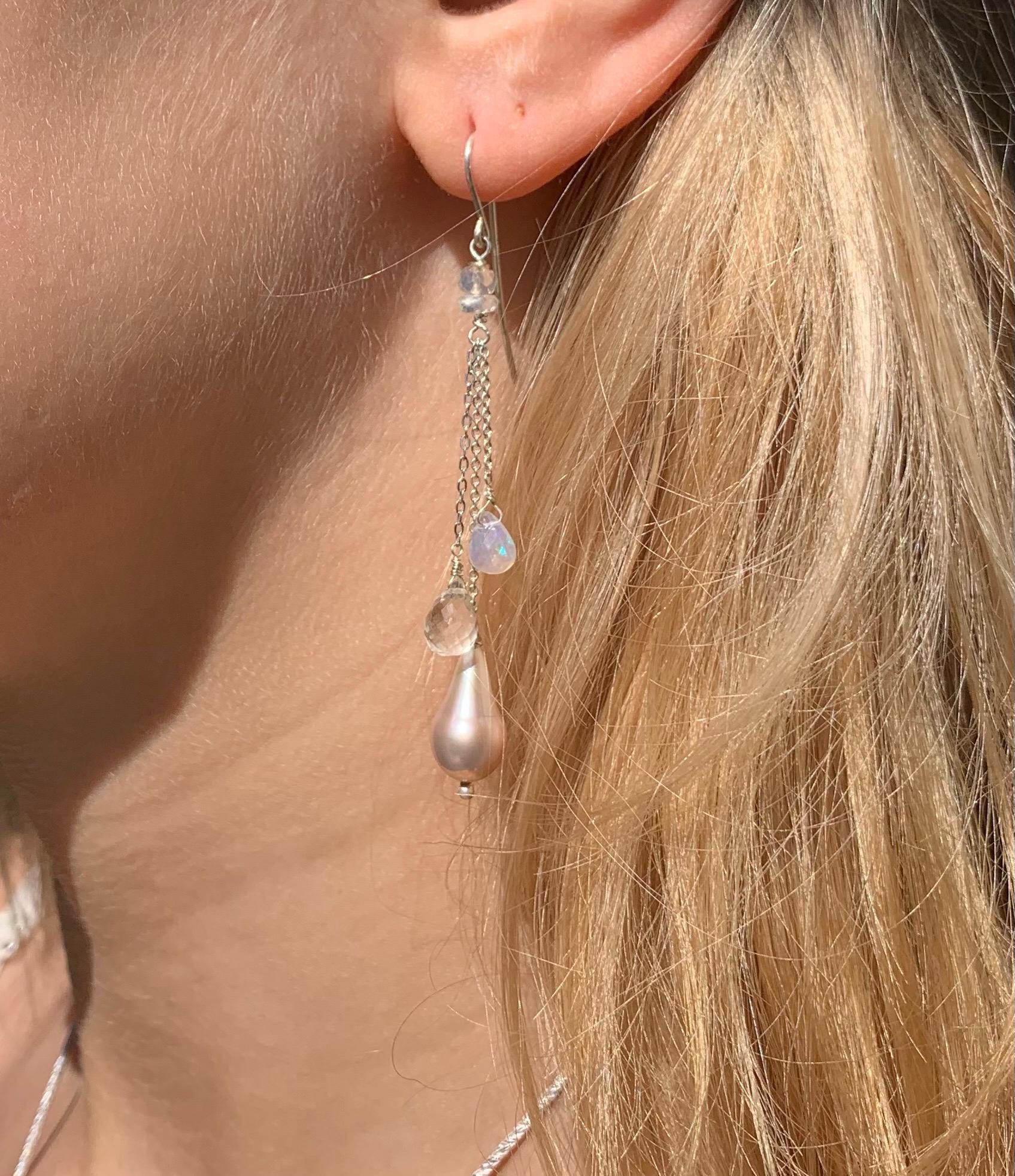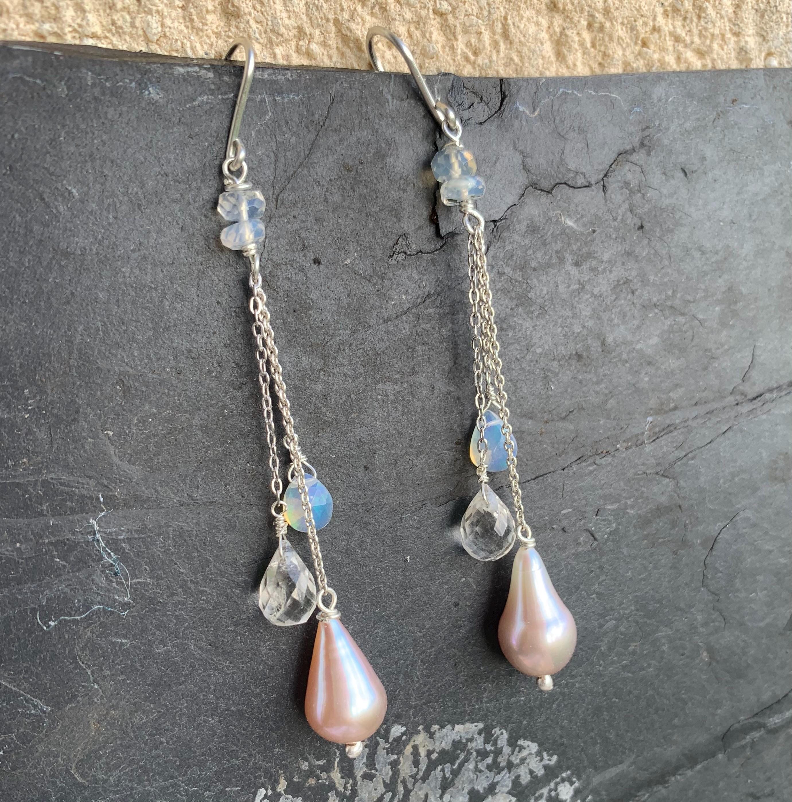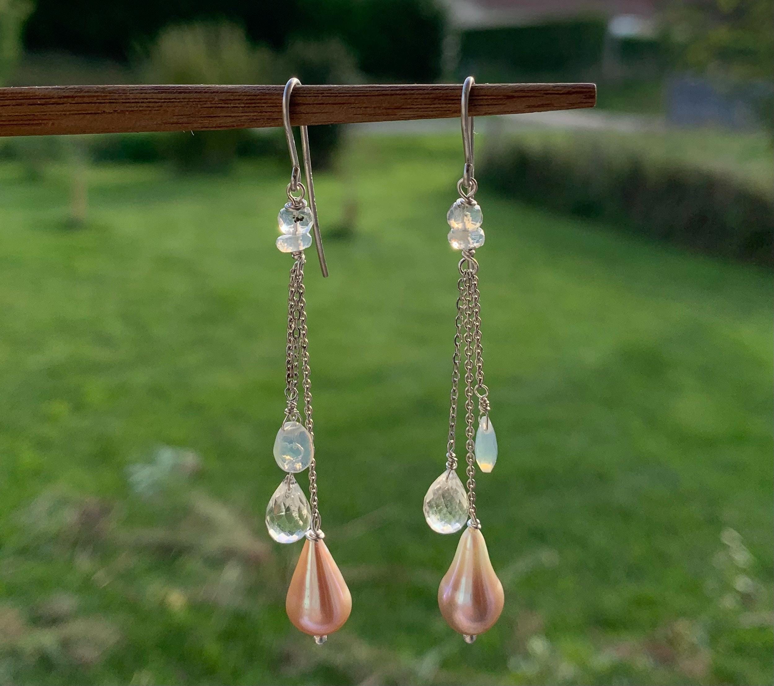 The earrings are done with 2 briolettes of moonstones, 2 x 3 ethiopian opals and 2 freshwater pearls hanging on silver wire.