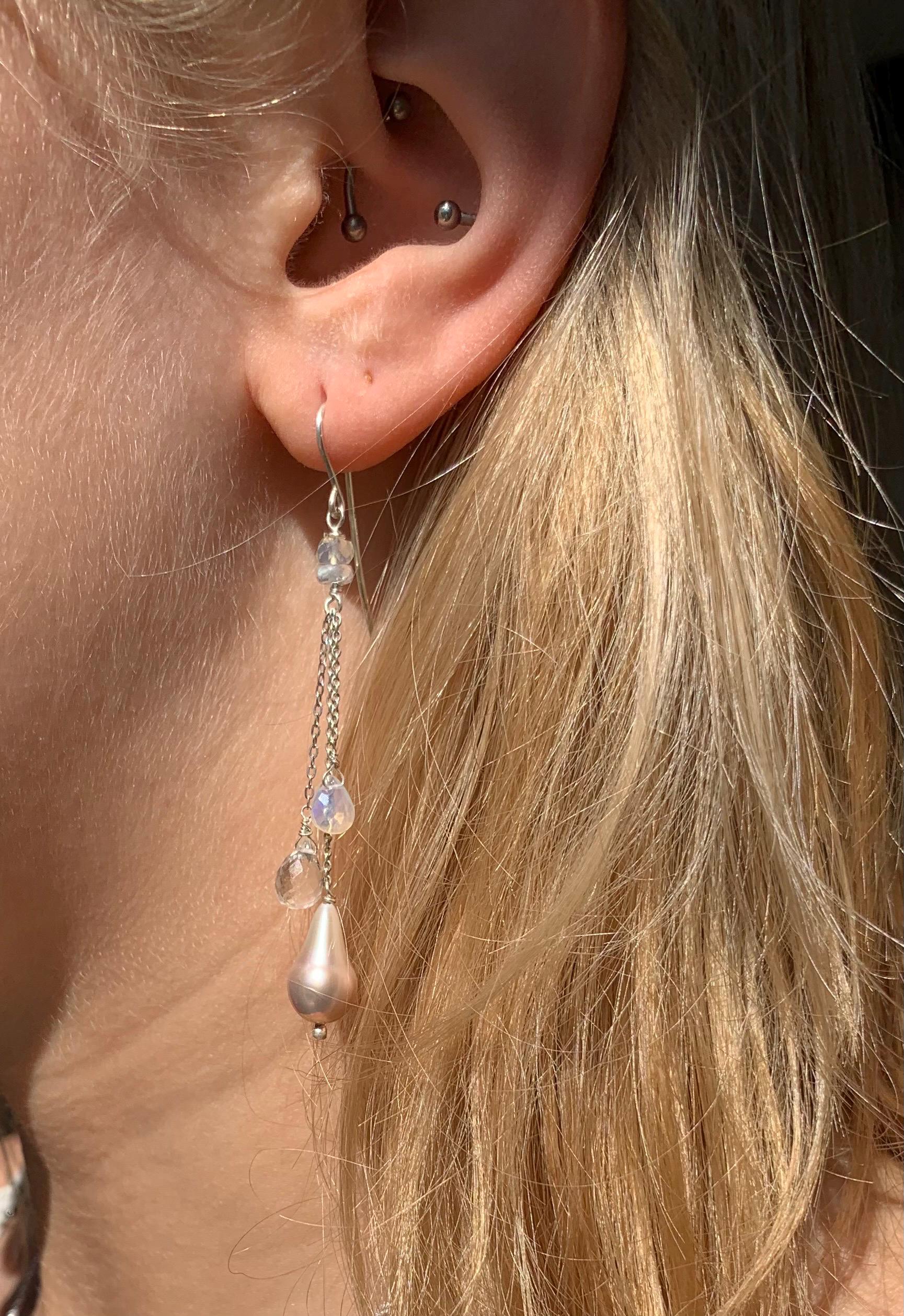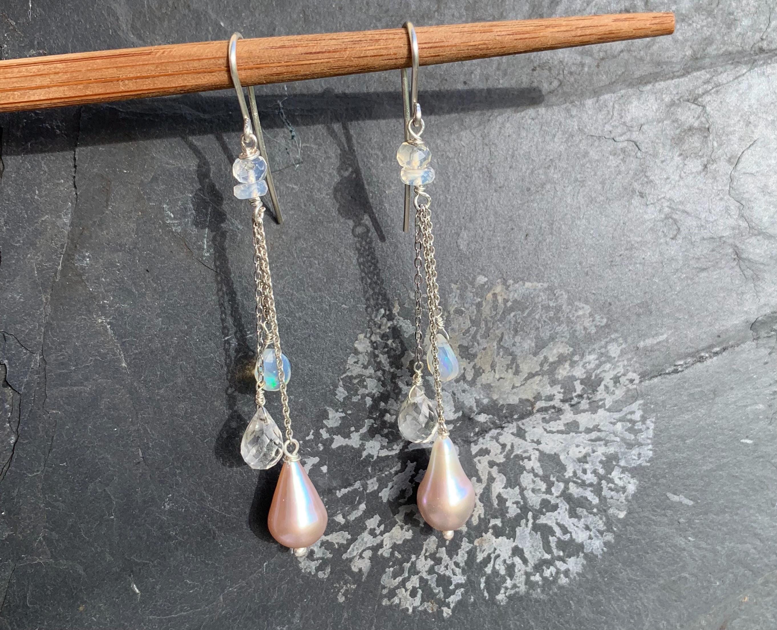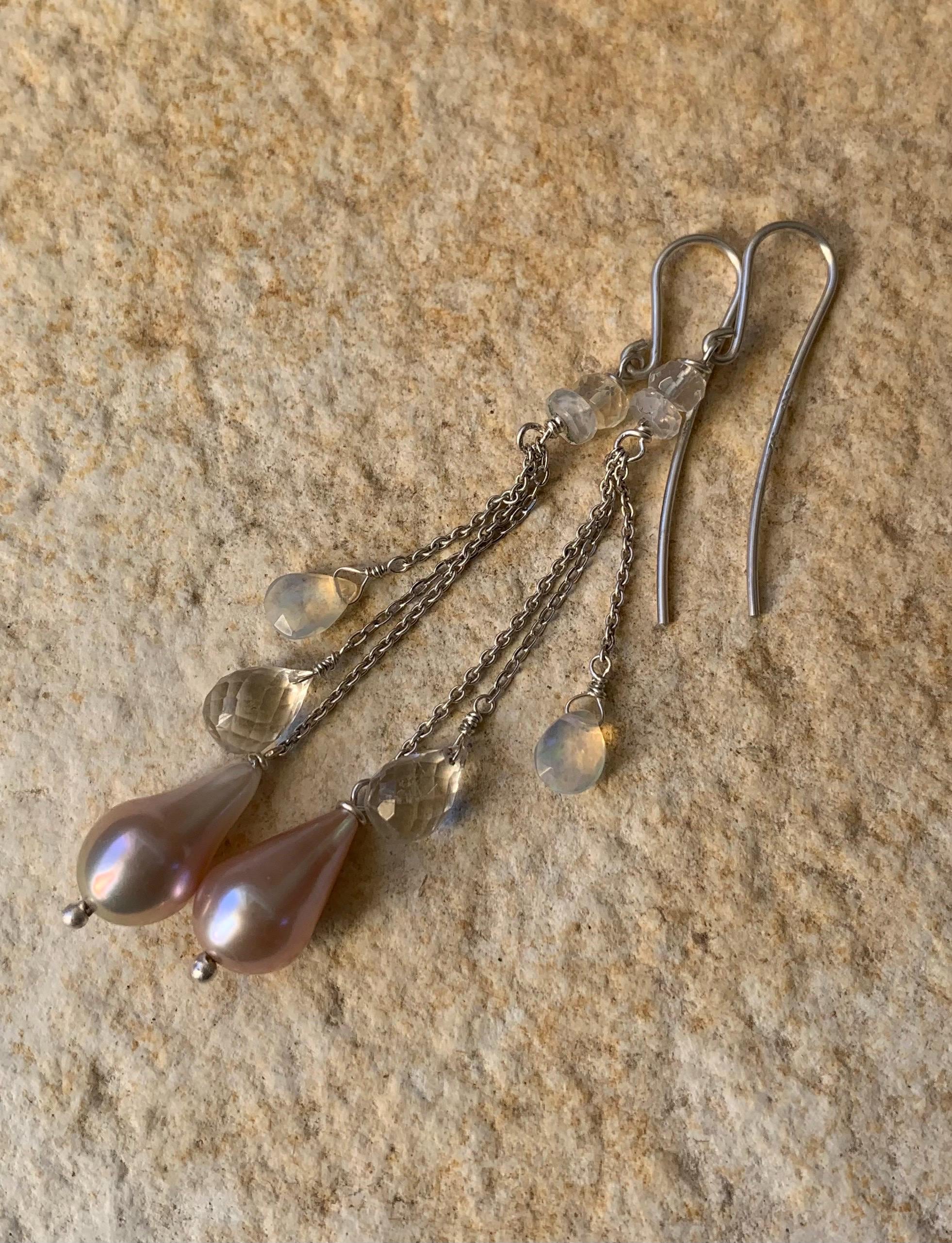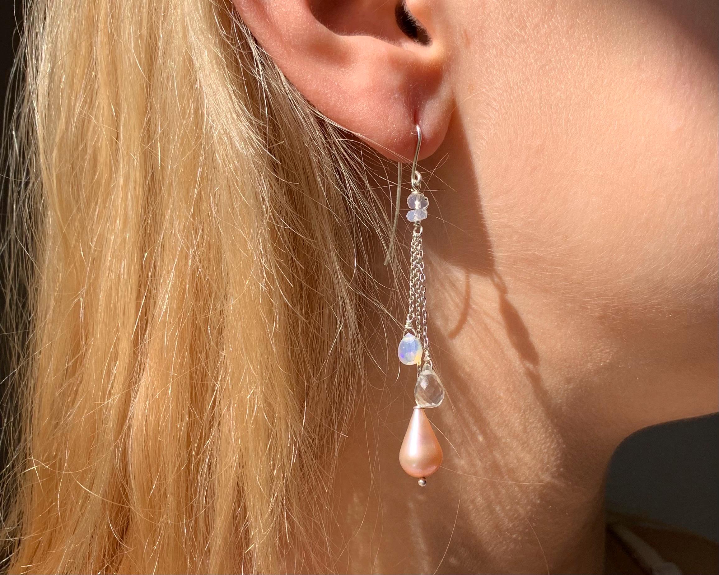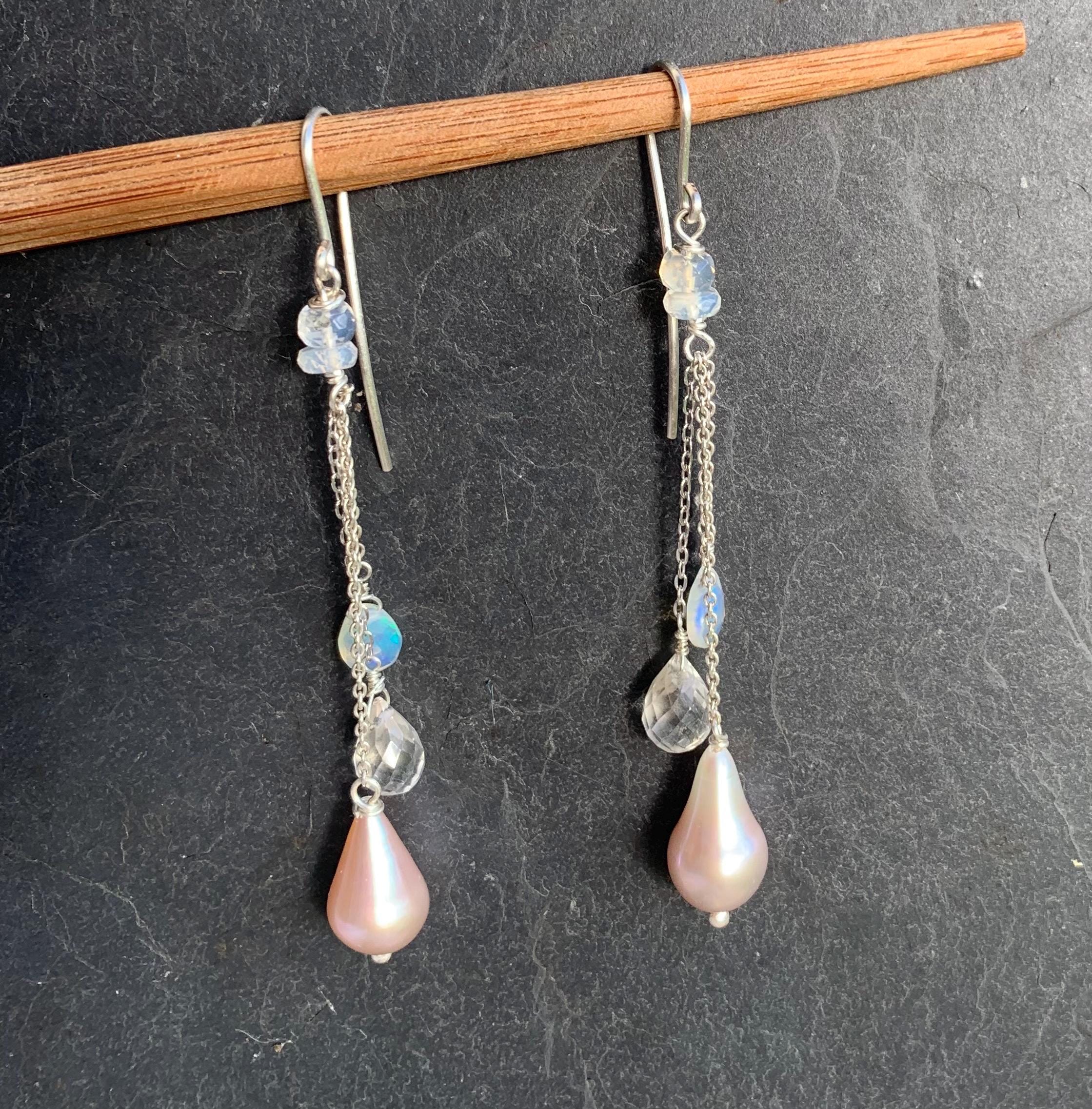 The earrings are done with 2 briolettes of moonstones, 2 x 3 ethiopian opals and 2 freshwater pearls hanging on silver wire.
