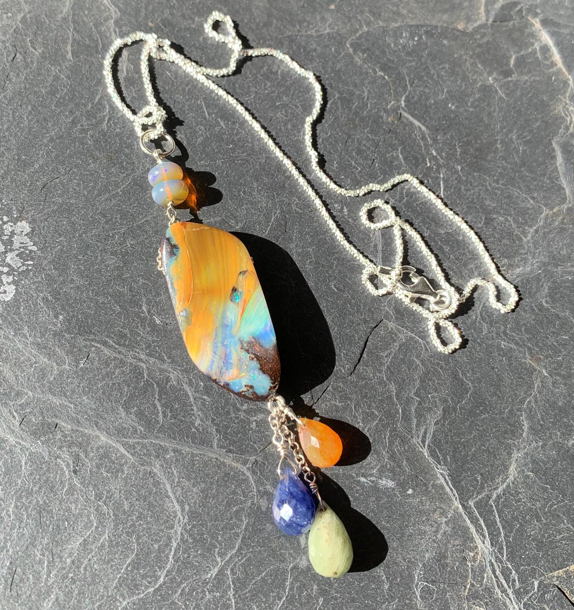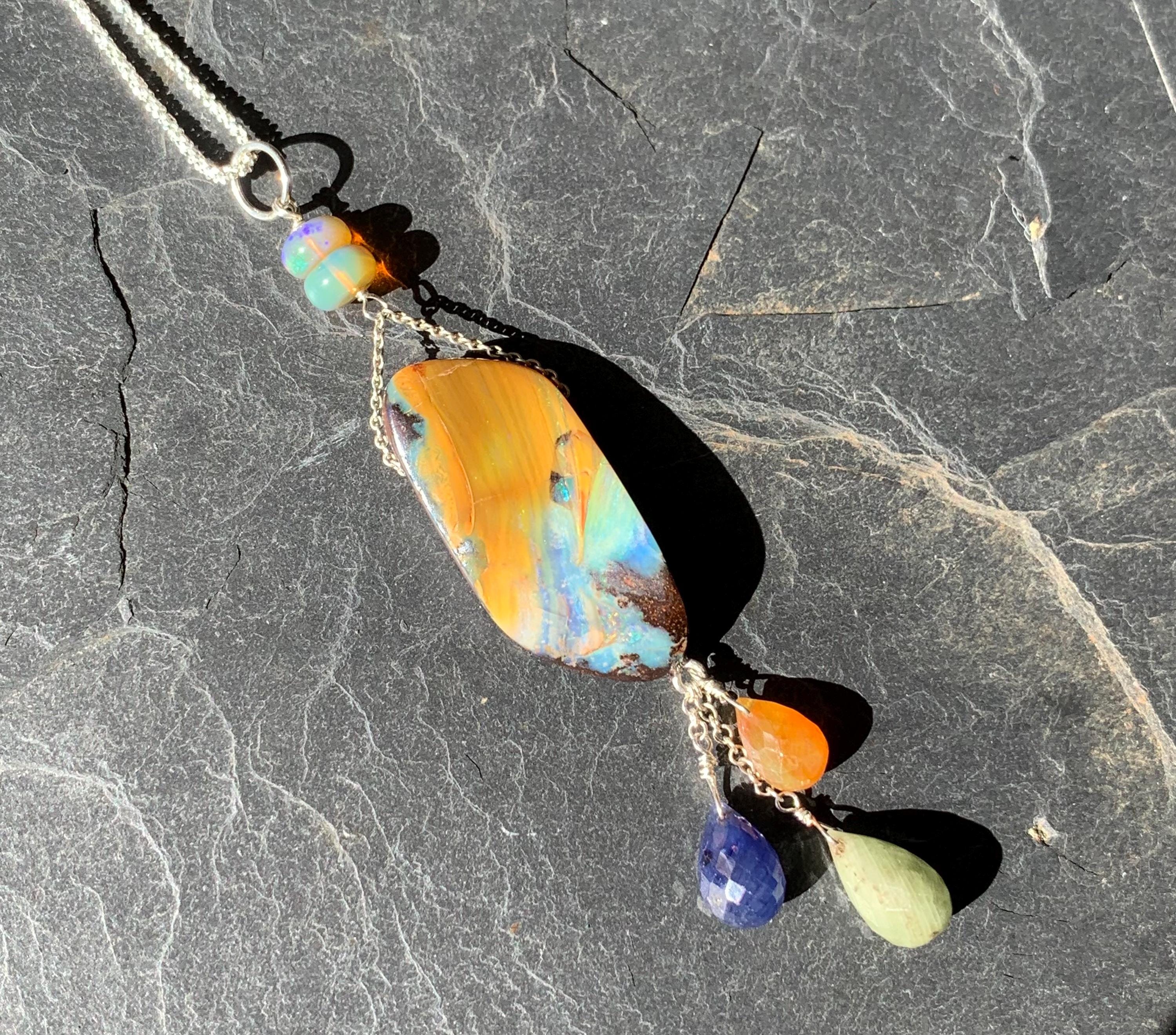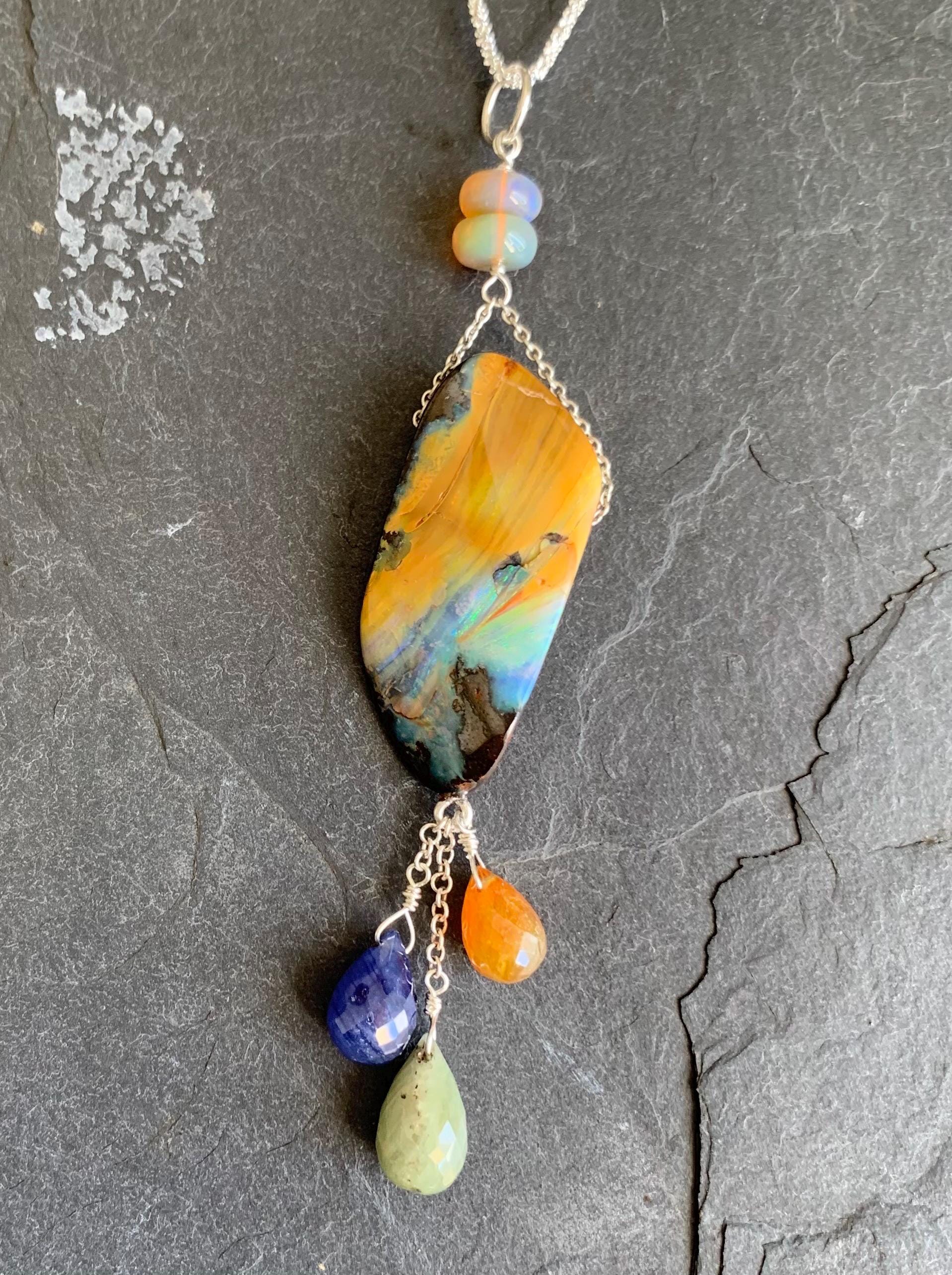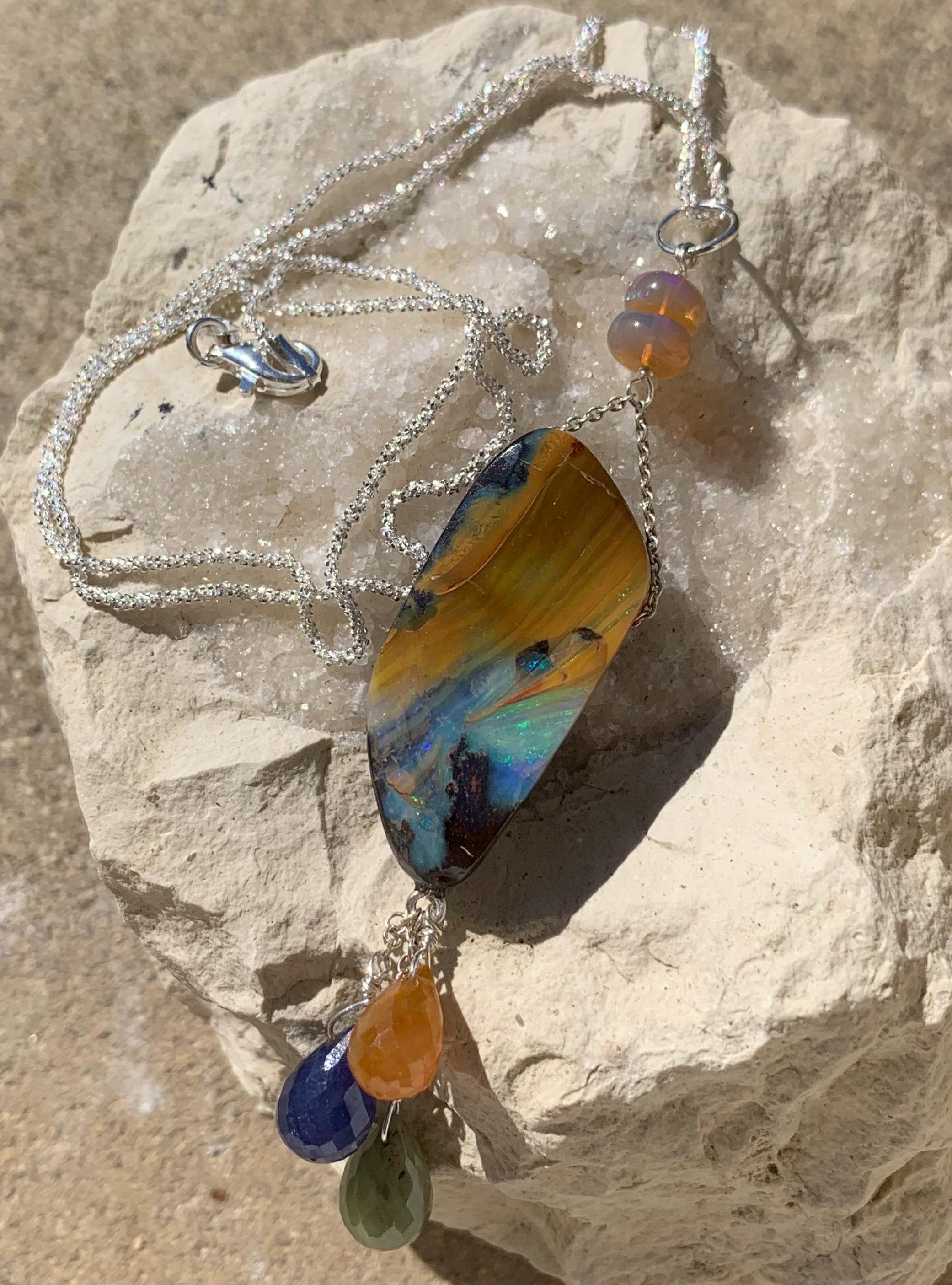 It is done in silver with 1 big australian boulder opal, 2 ethiopian opals and 3 sapphires ' orange, green, blue )