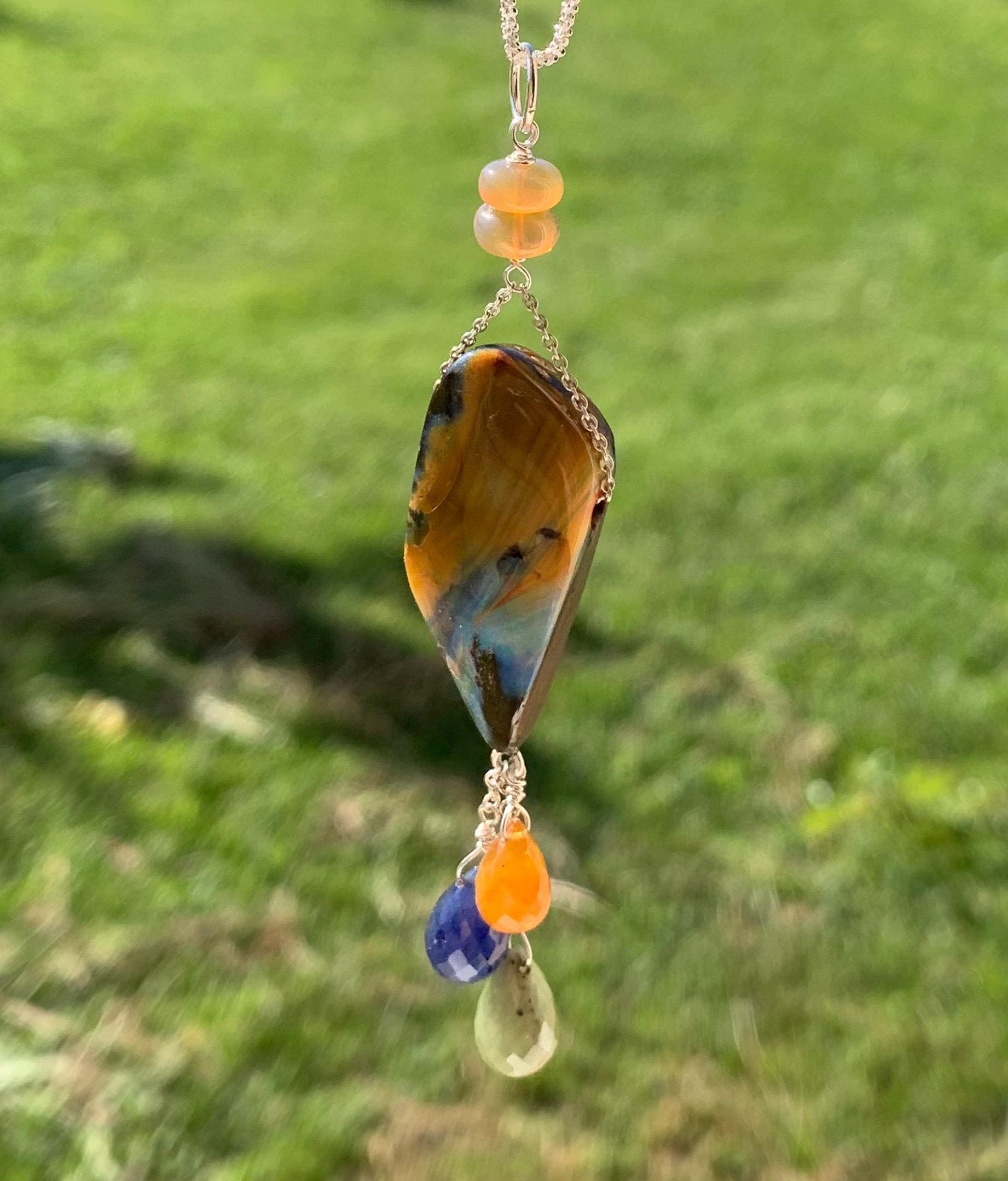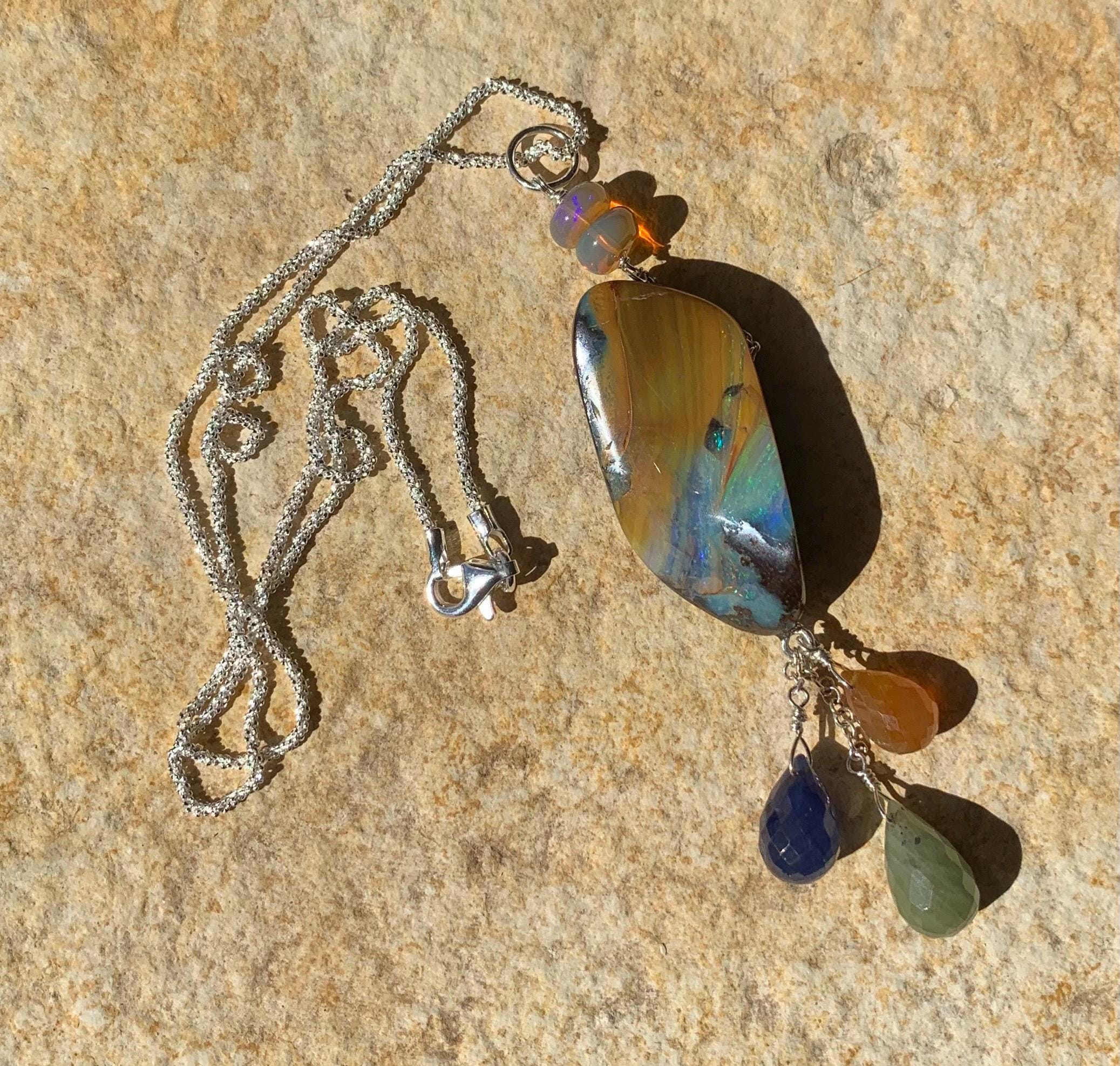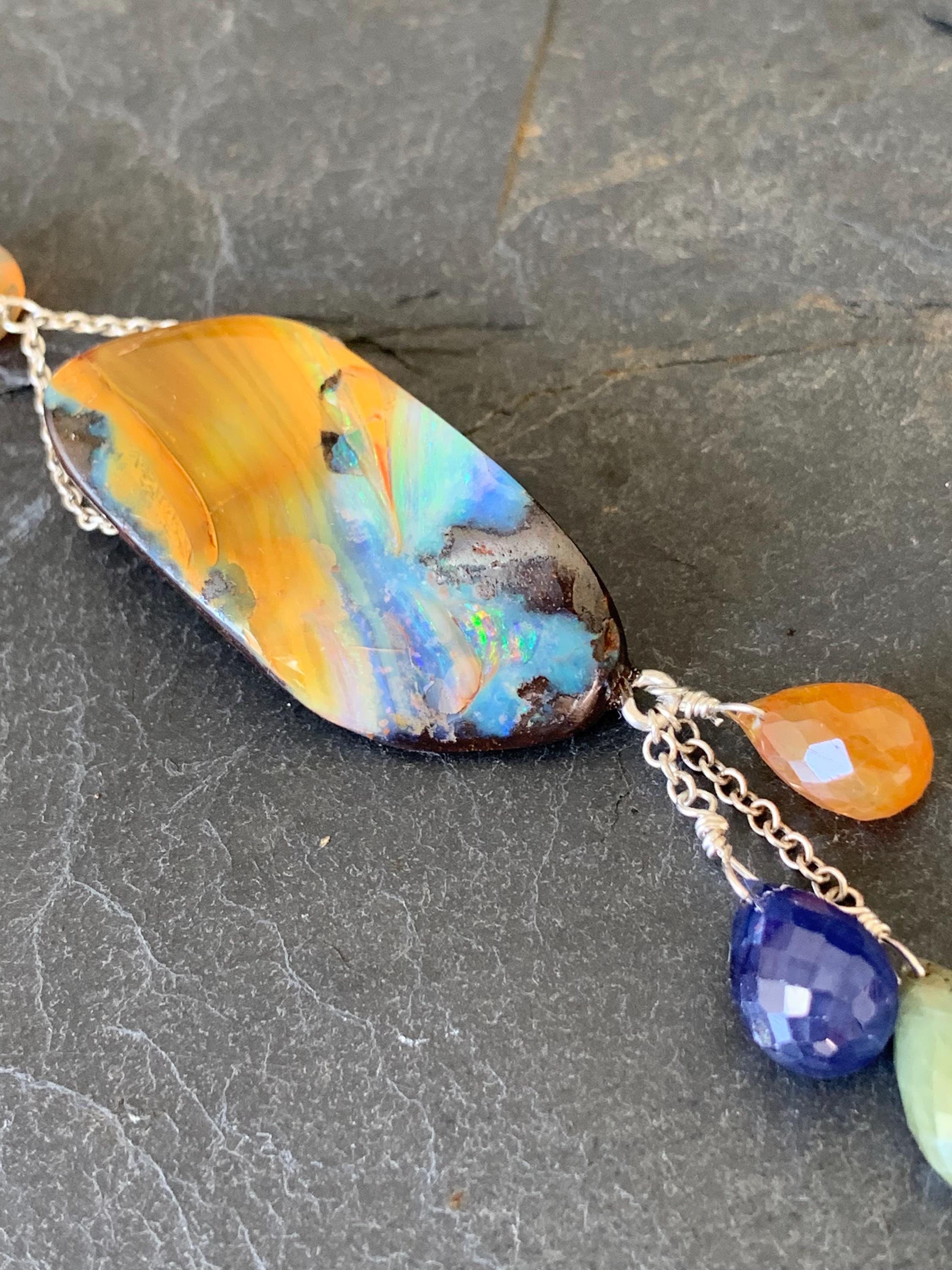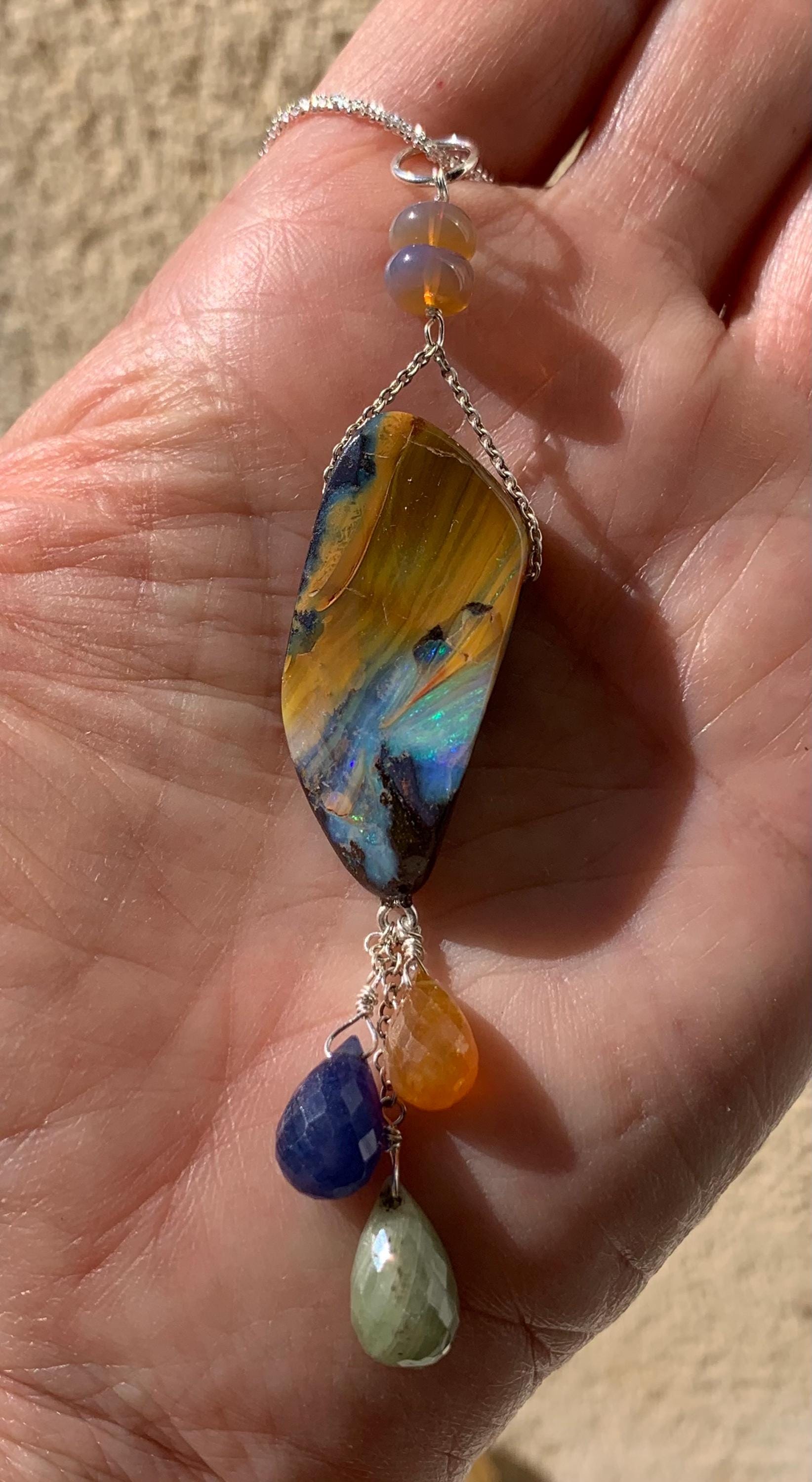It is done in silver with 1 big australian boulder opal, 2 ethiopian opals and 3 sapphires ' orange, green, blue )