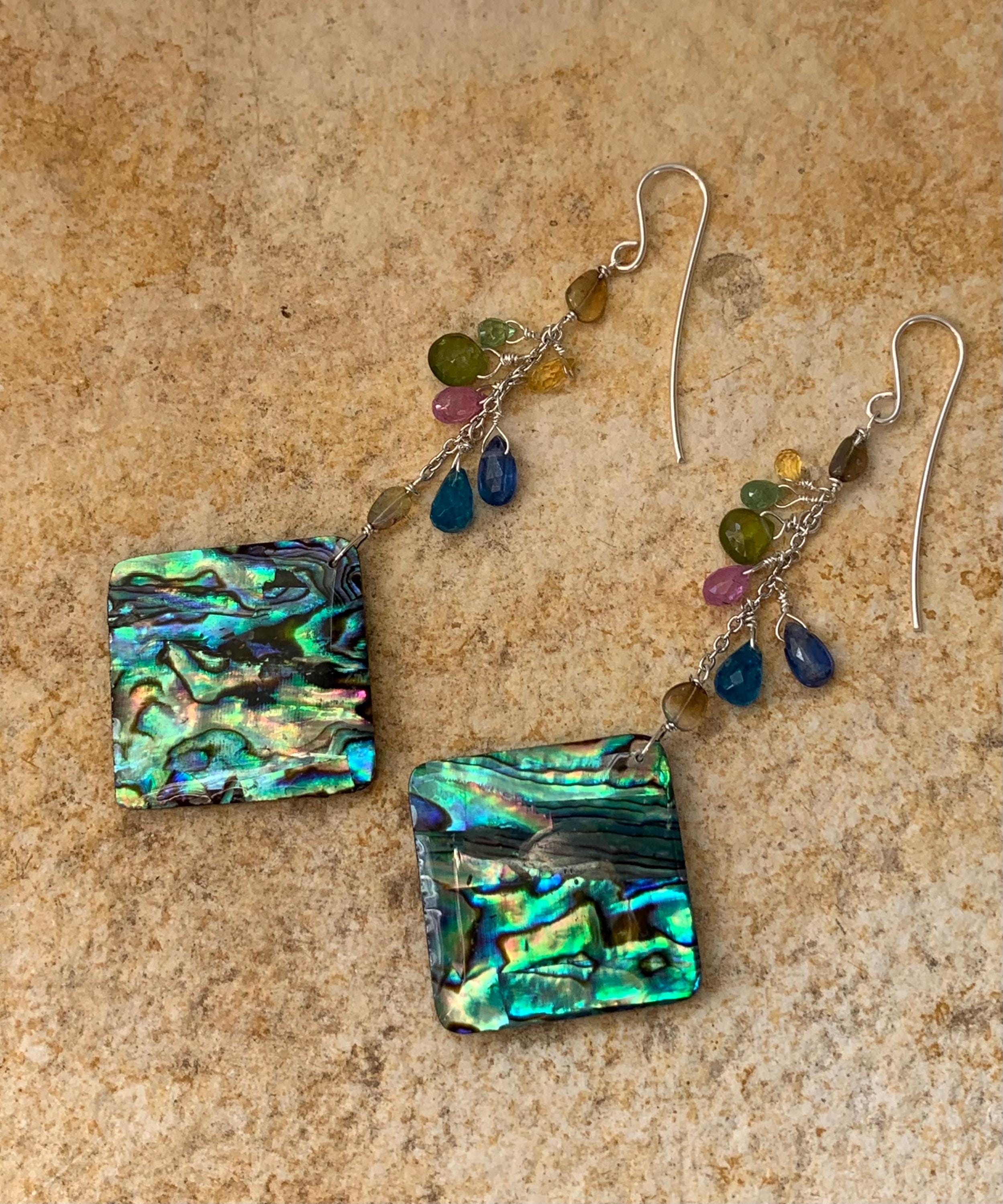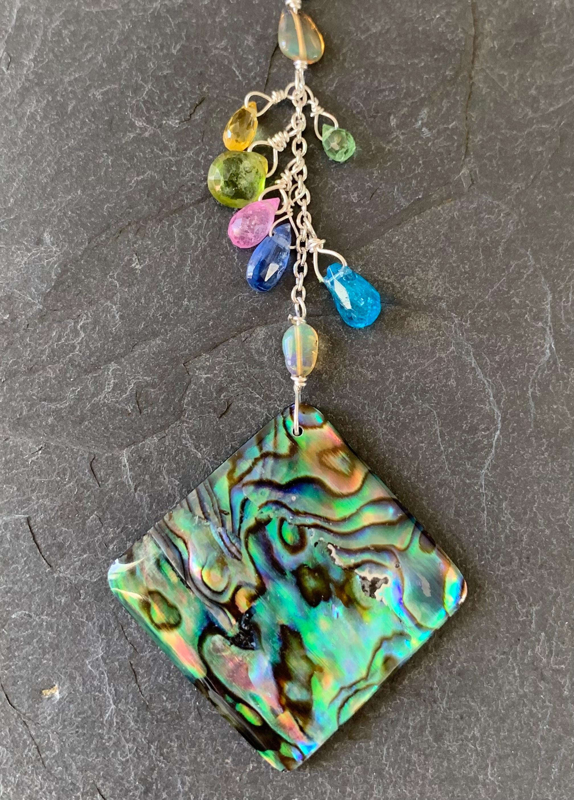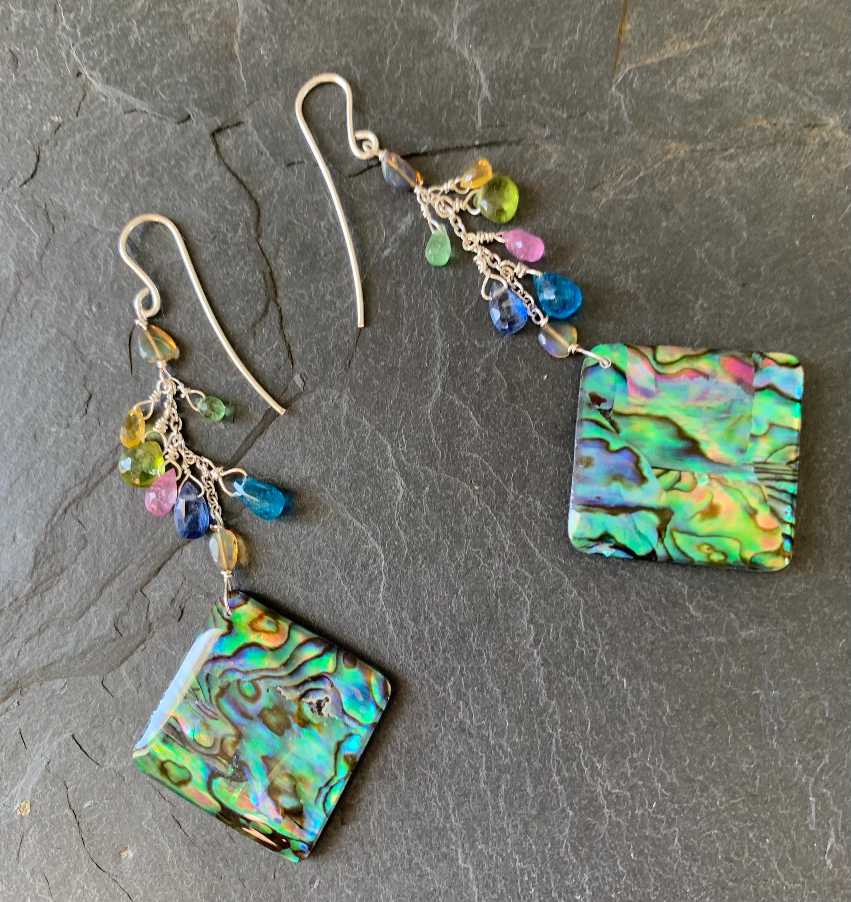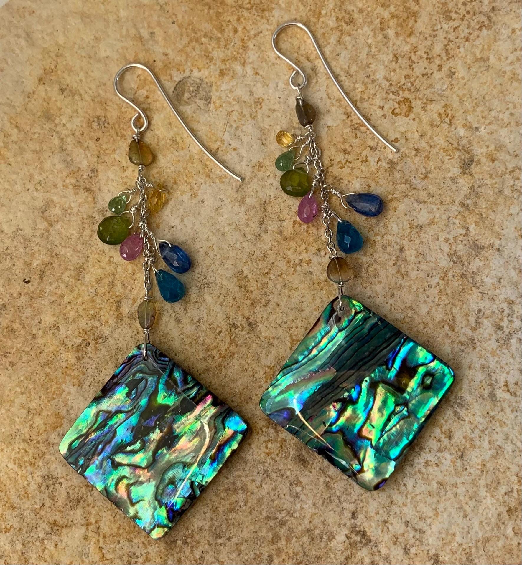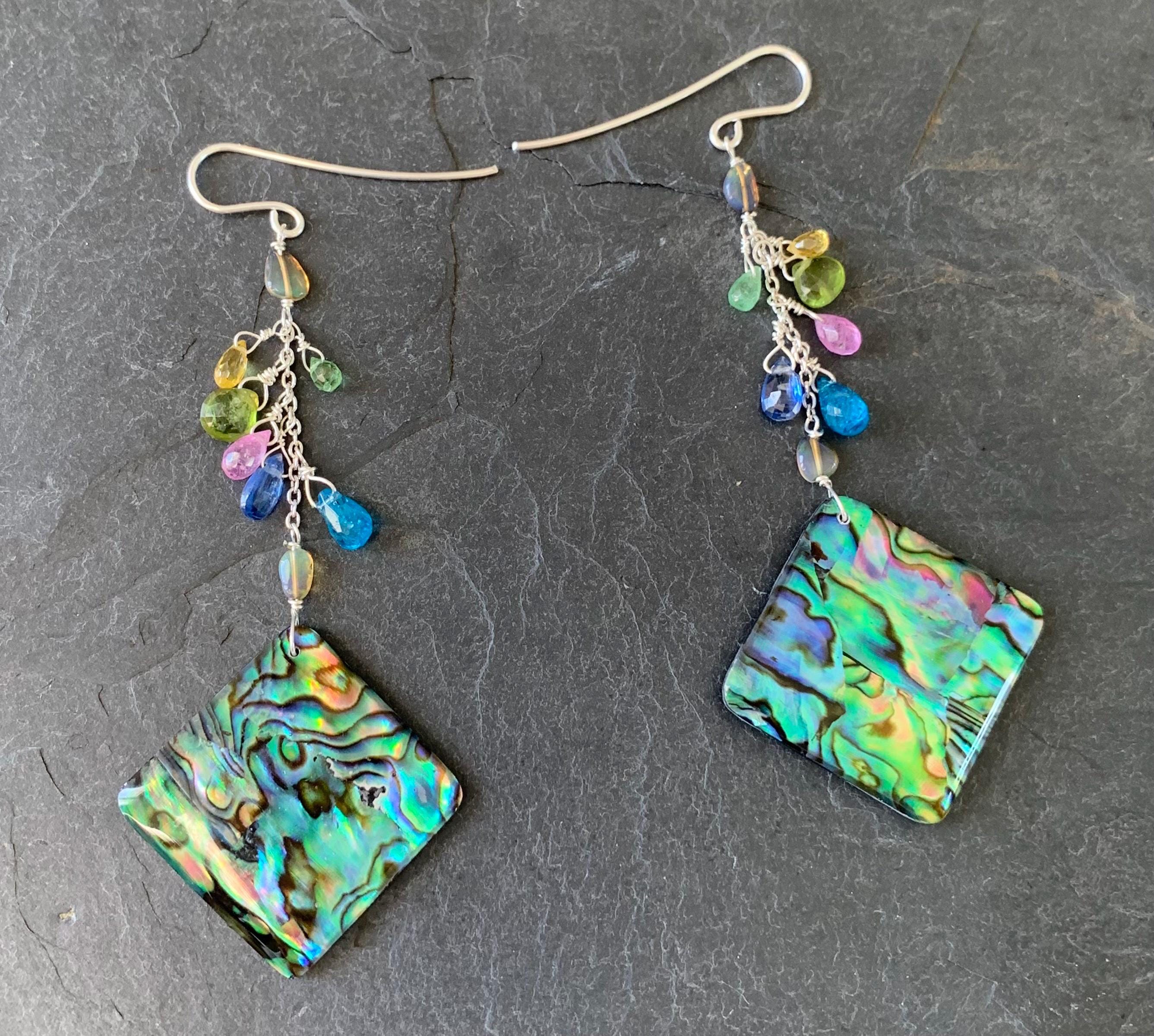 They are done in silver with 2 paua abalone shells, ethiopian opals, tourmalines, cyanites, peridots, apatites and rose and yellow sapphires.