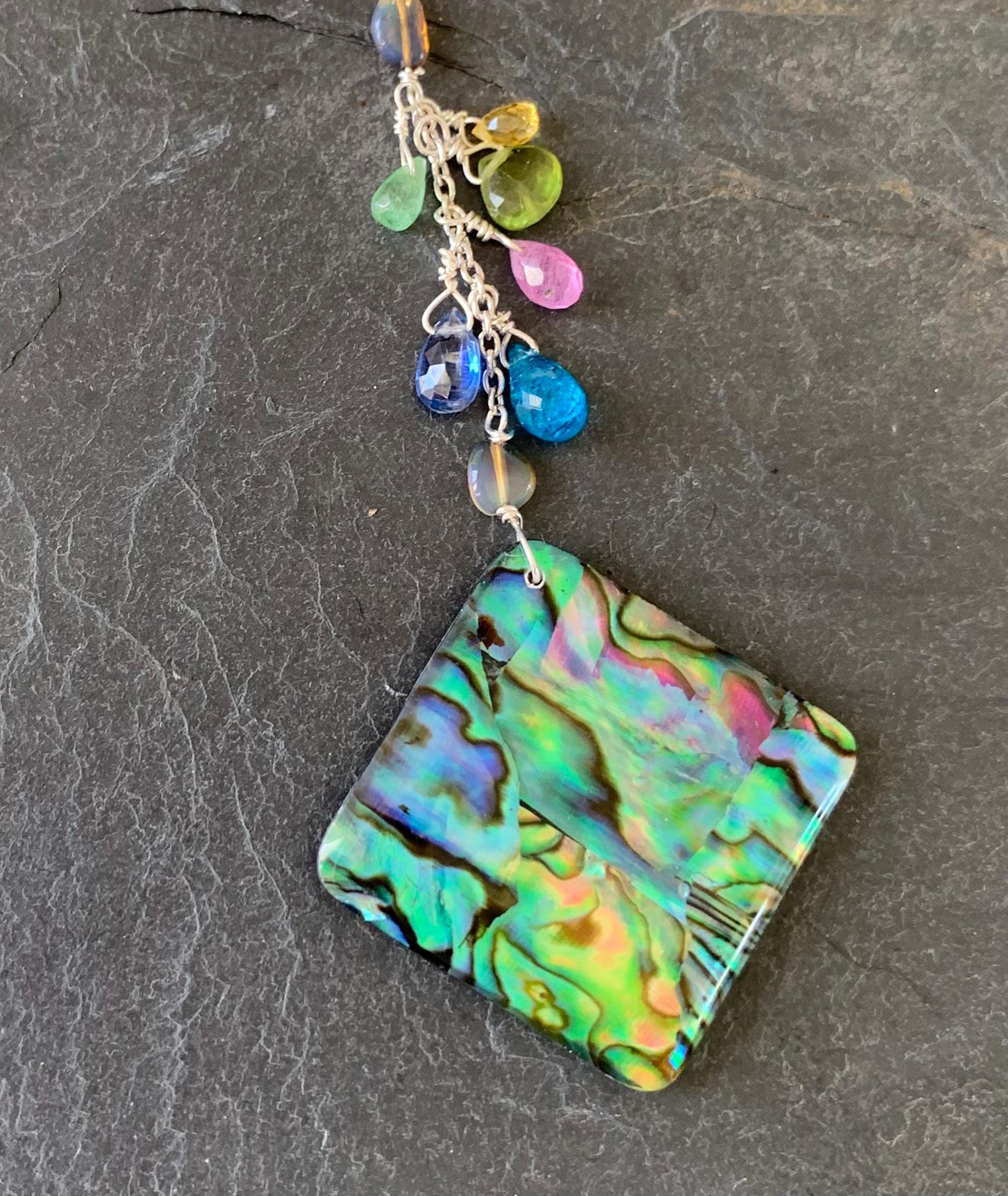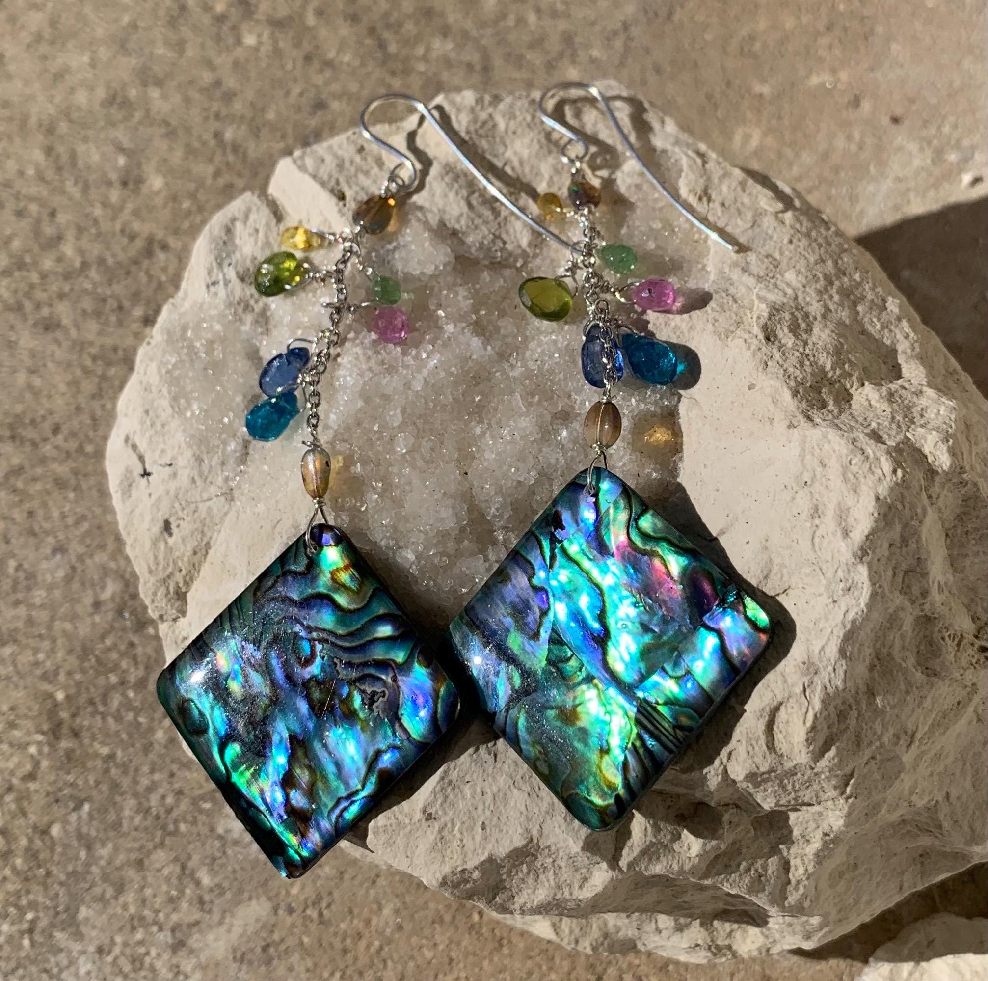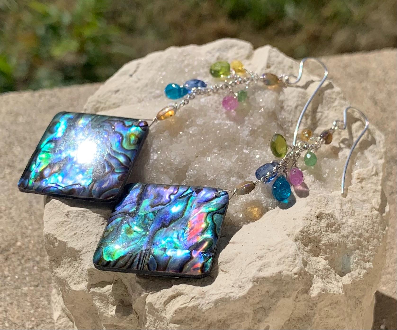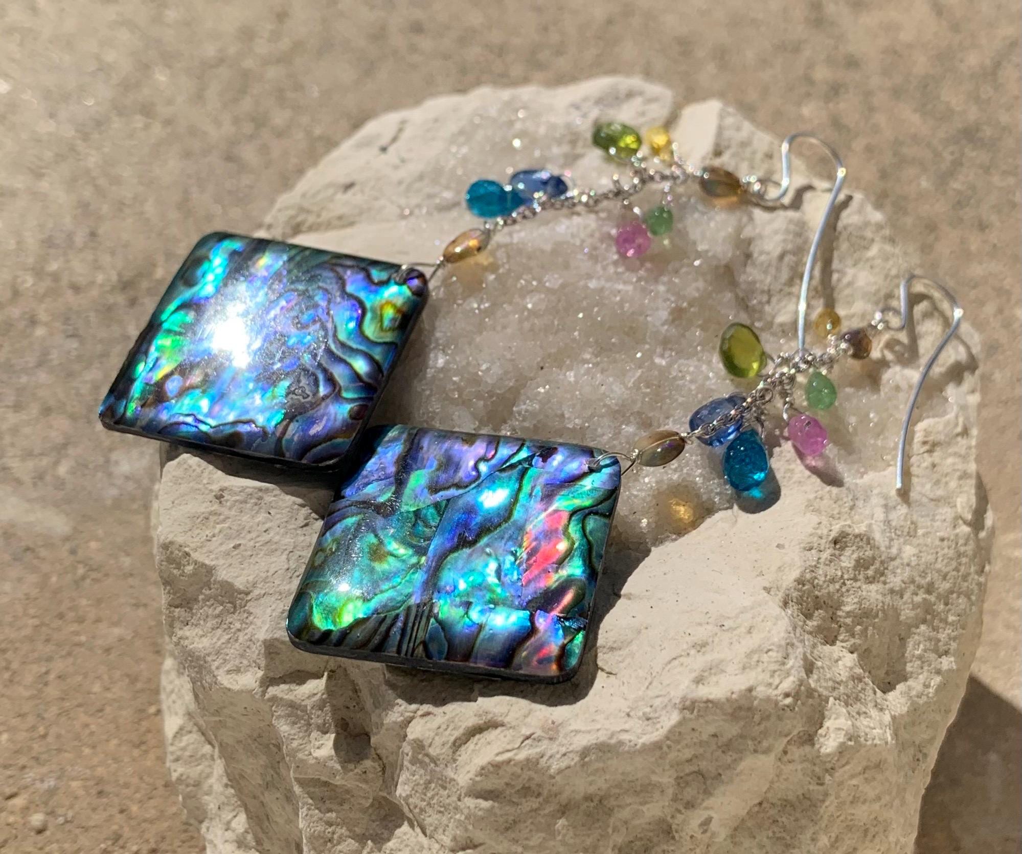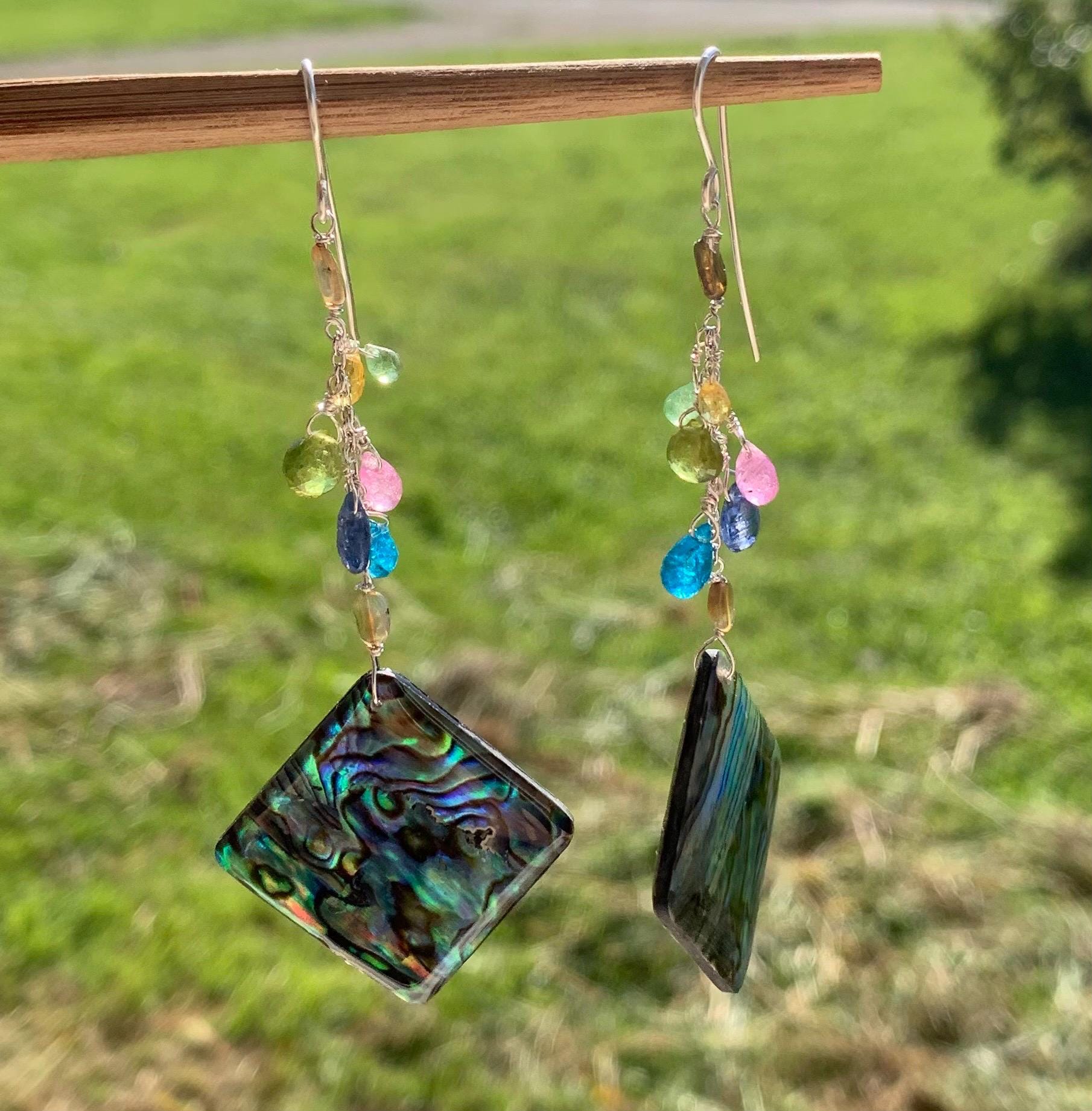 They are done in silver with 2 paua abalone shells, ethiopian opals, tourmalines, cyanites, peridots, apatites and rose and yellow sapphires.