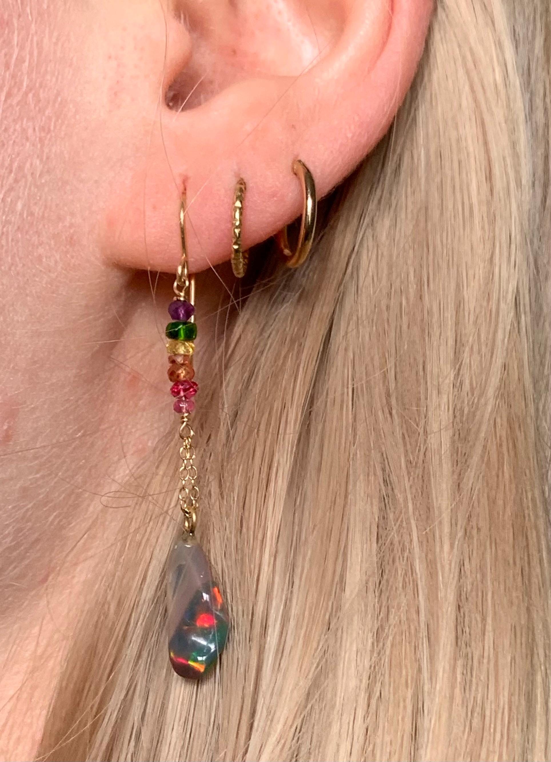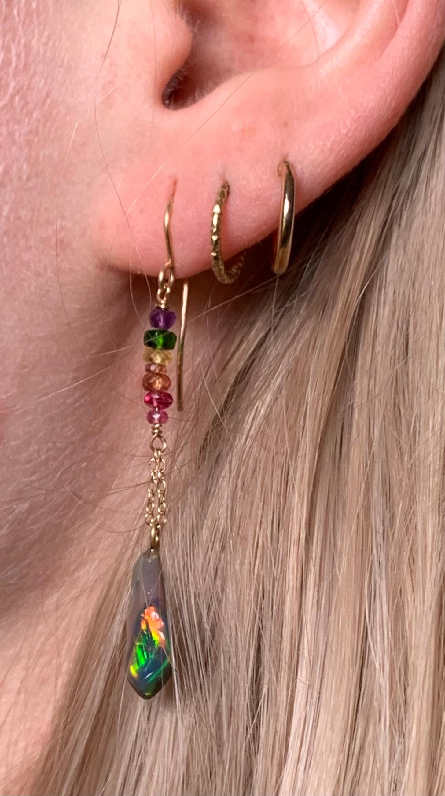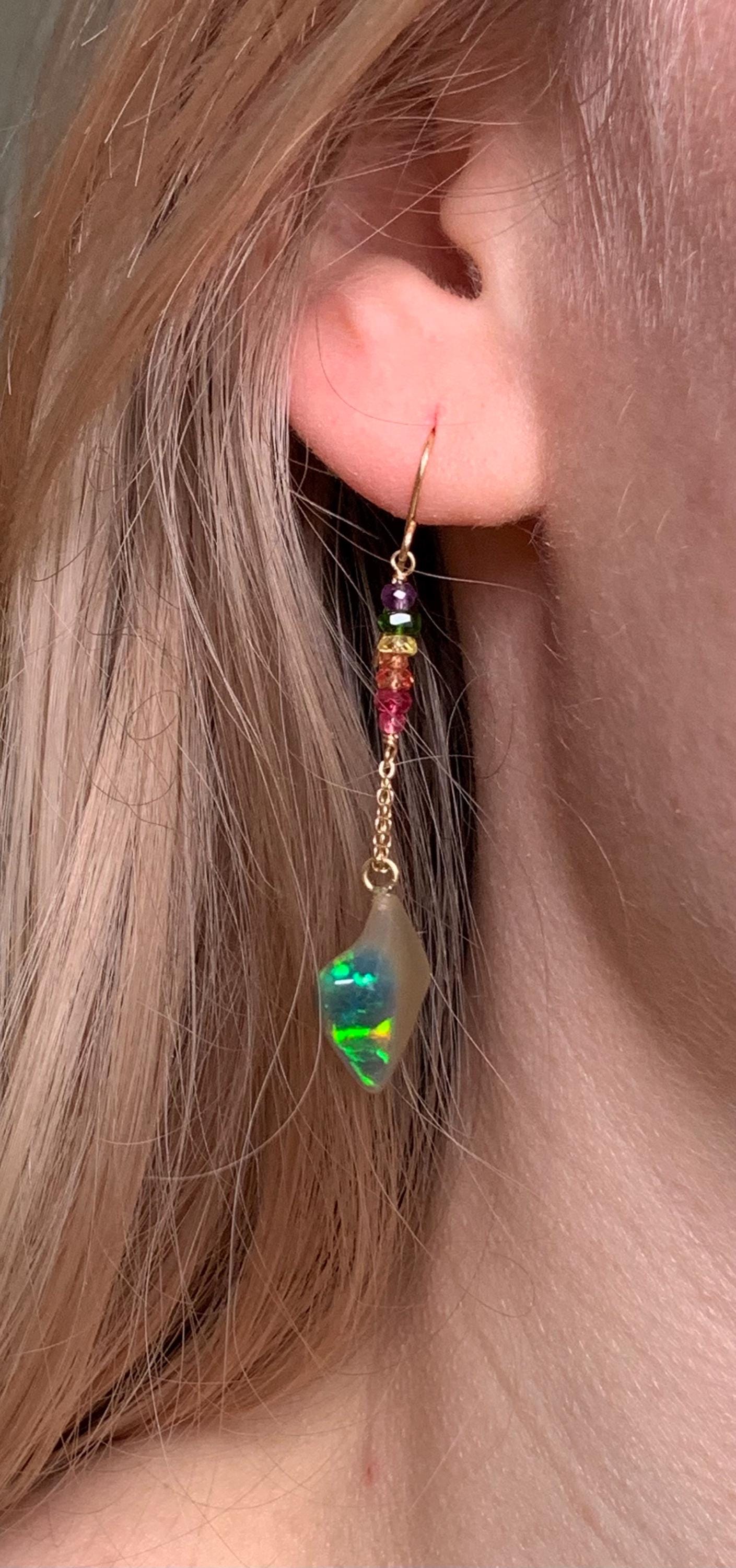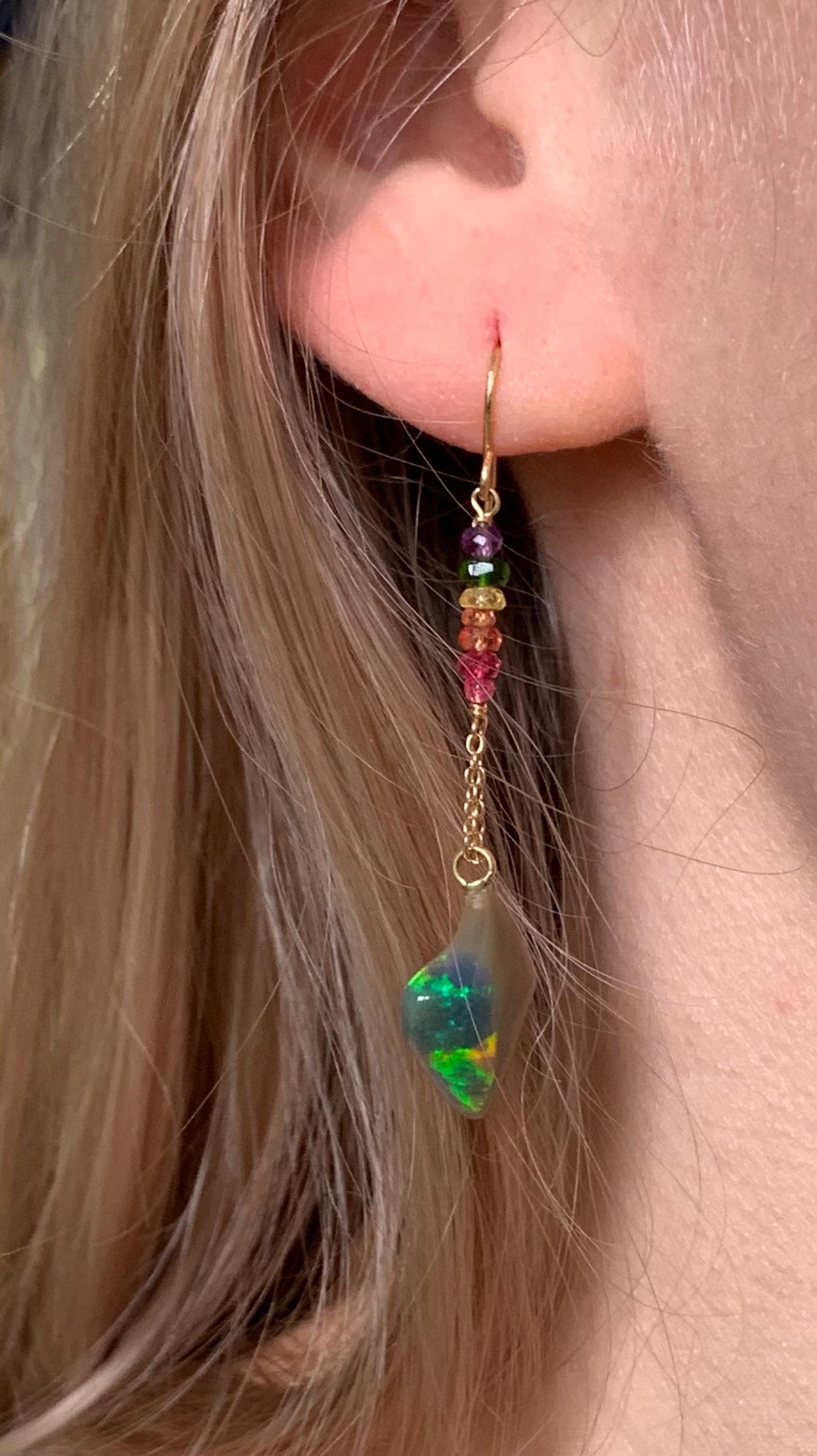 They are done in 18kt yellow gold with 2 ethiopian, freeform opals and little precious ston pearls ( amethysts, sapphires, spinels, chrom diopsides ) hanging on 18 k gold wire and chains.