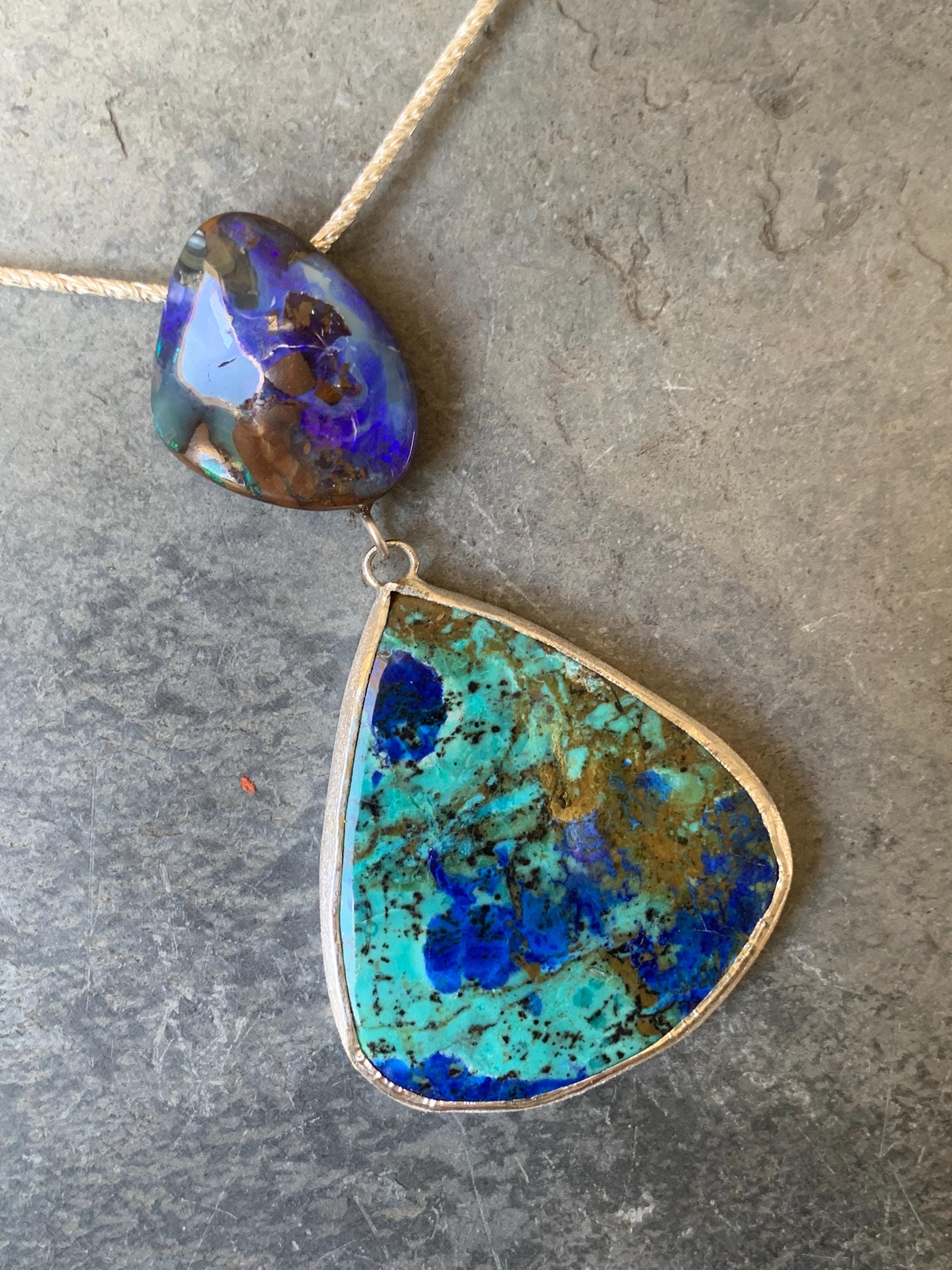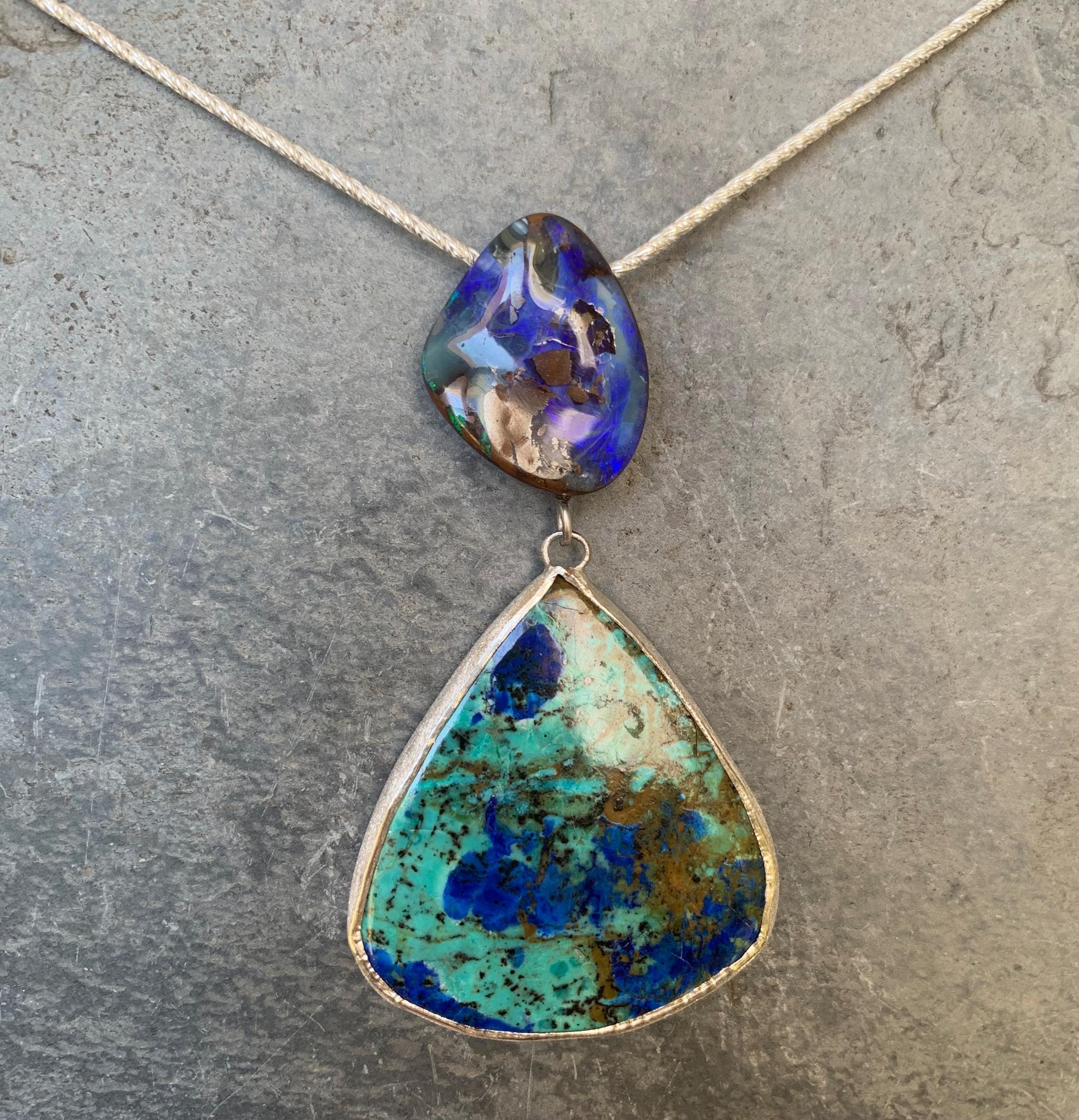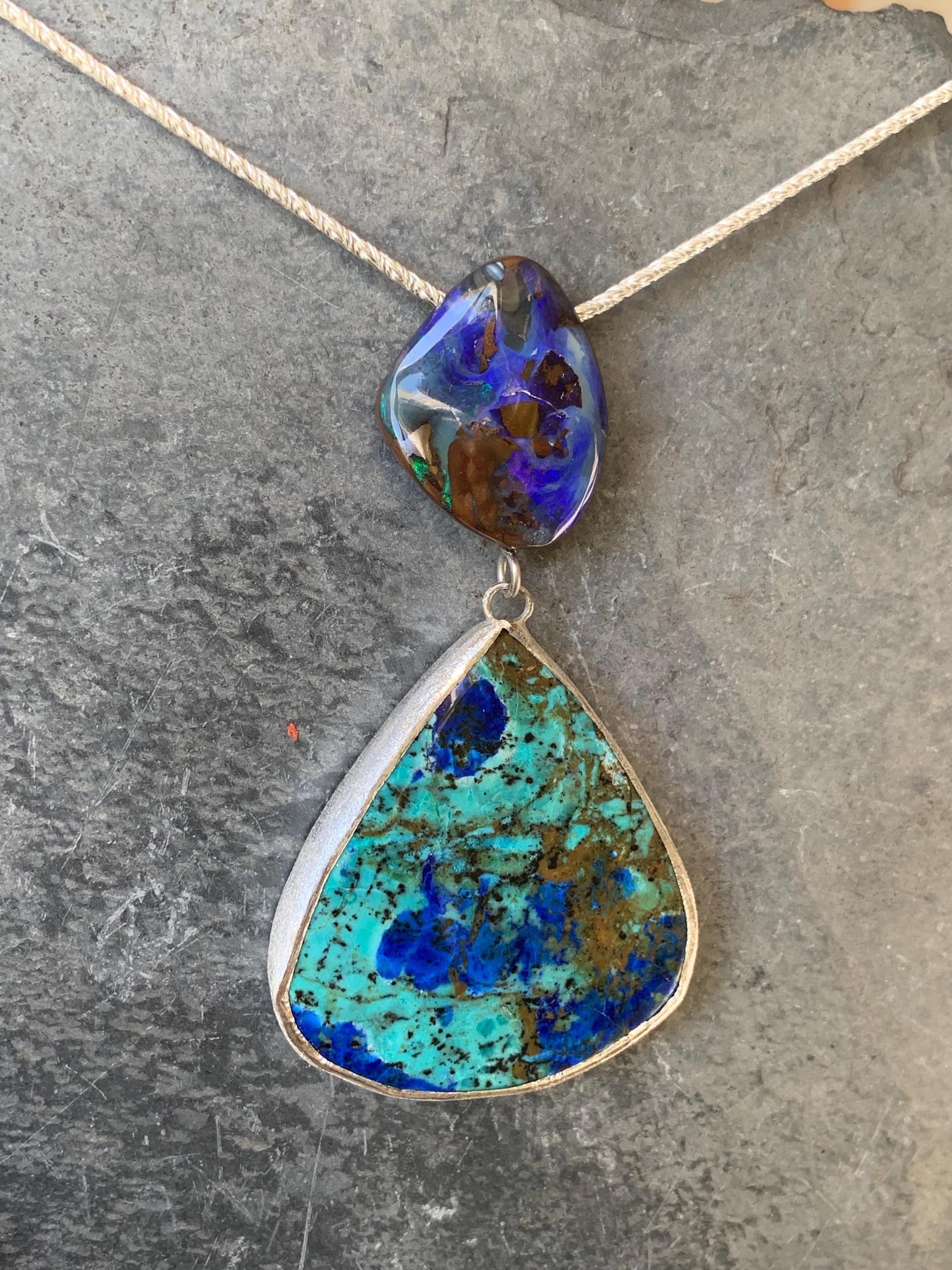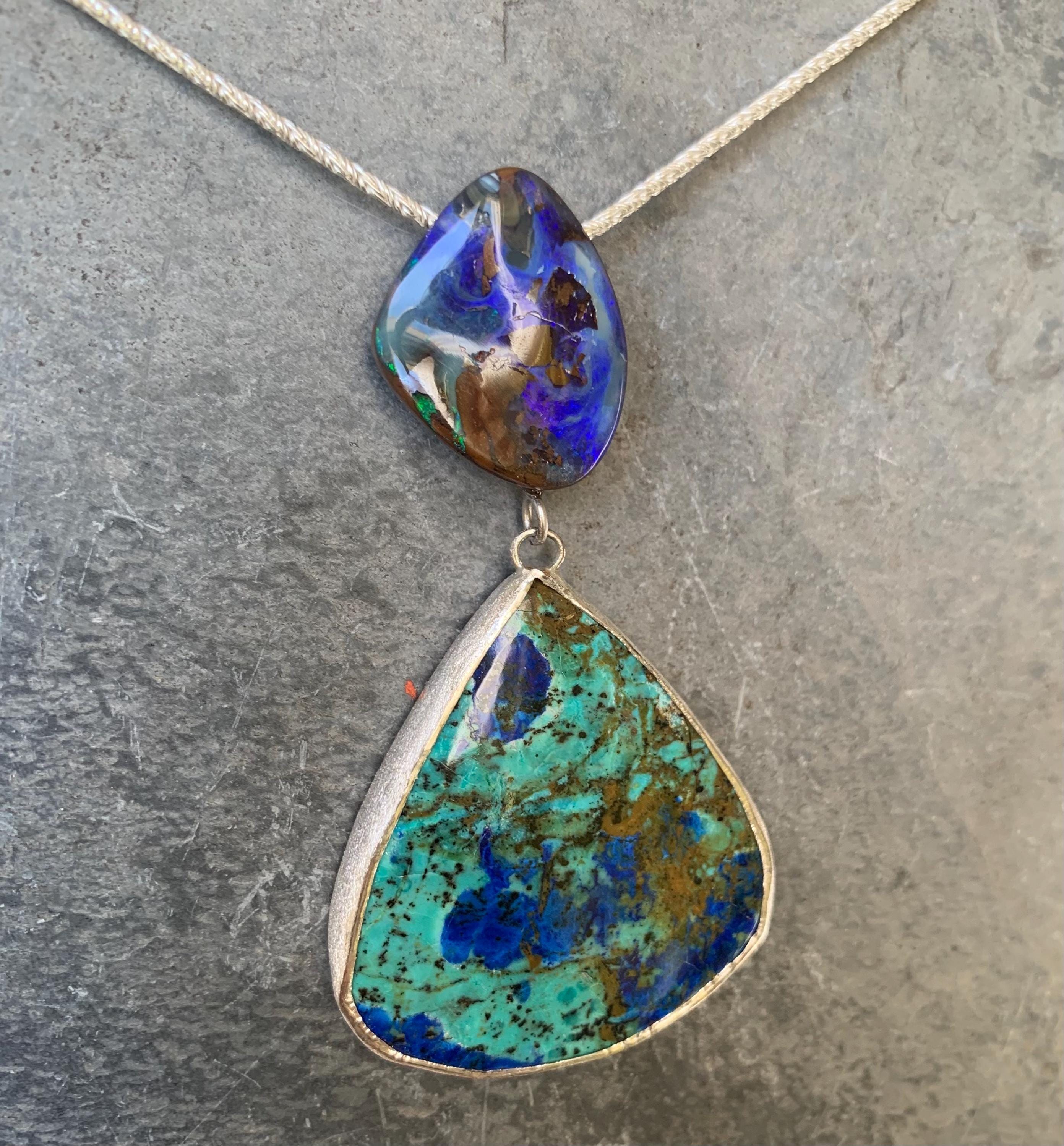 It is done in silver with 1 australian boulder opal and 1 big azurit-chrysocolle setted in silver.