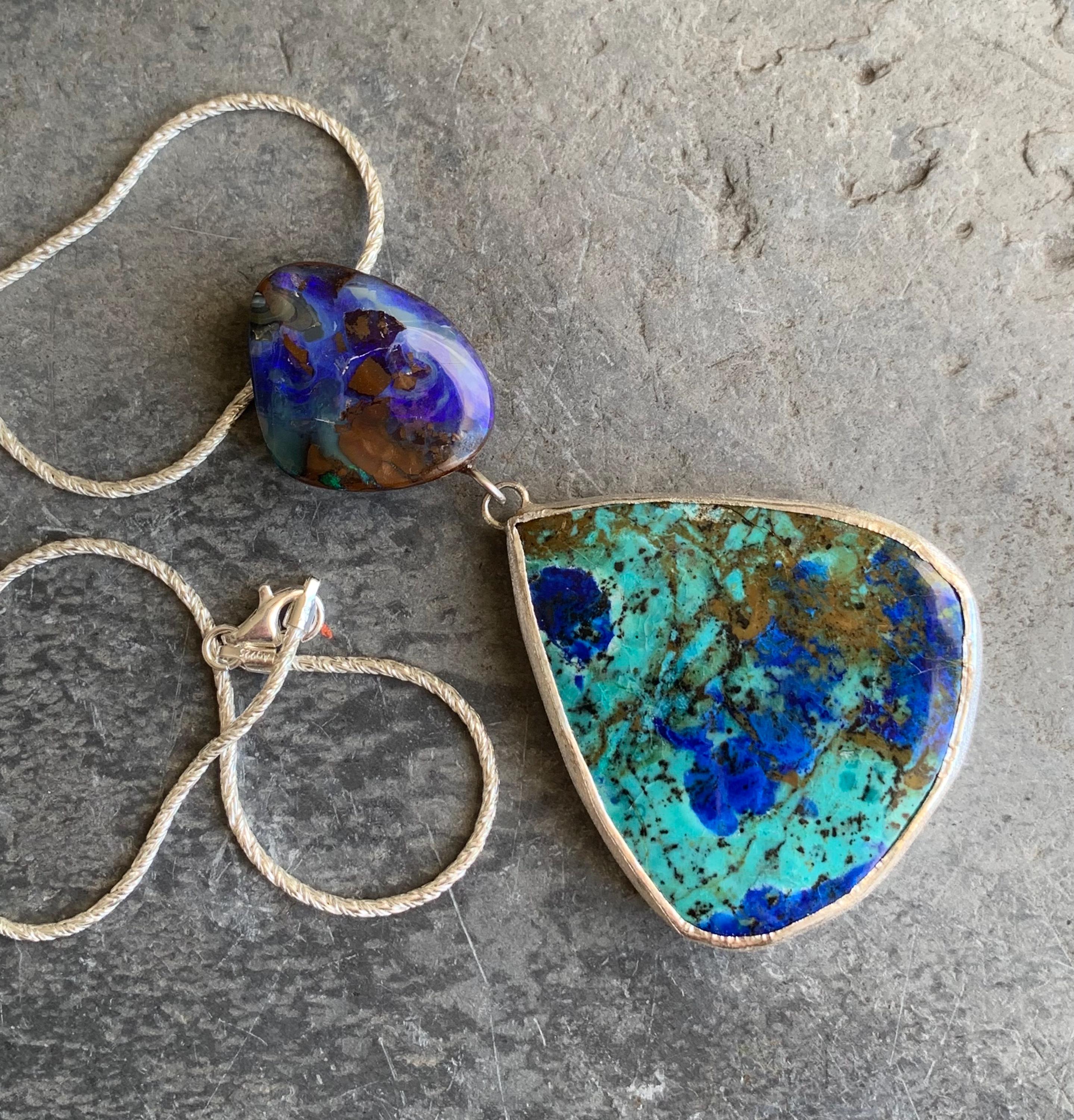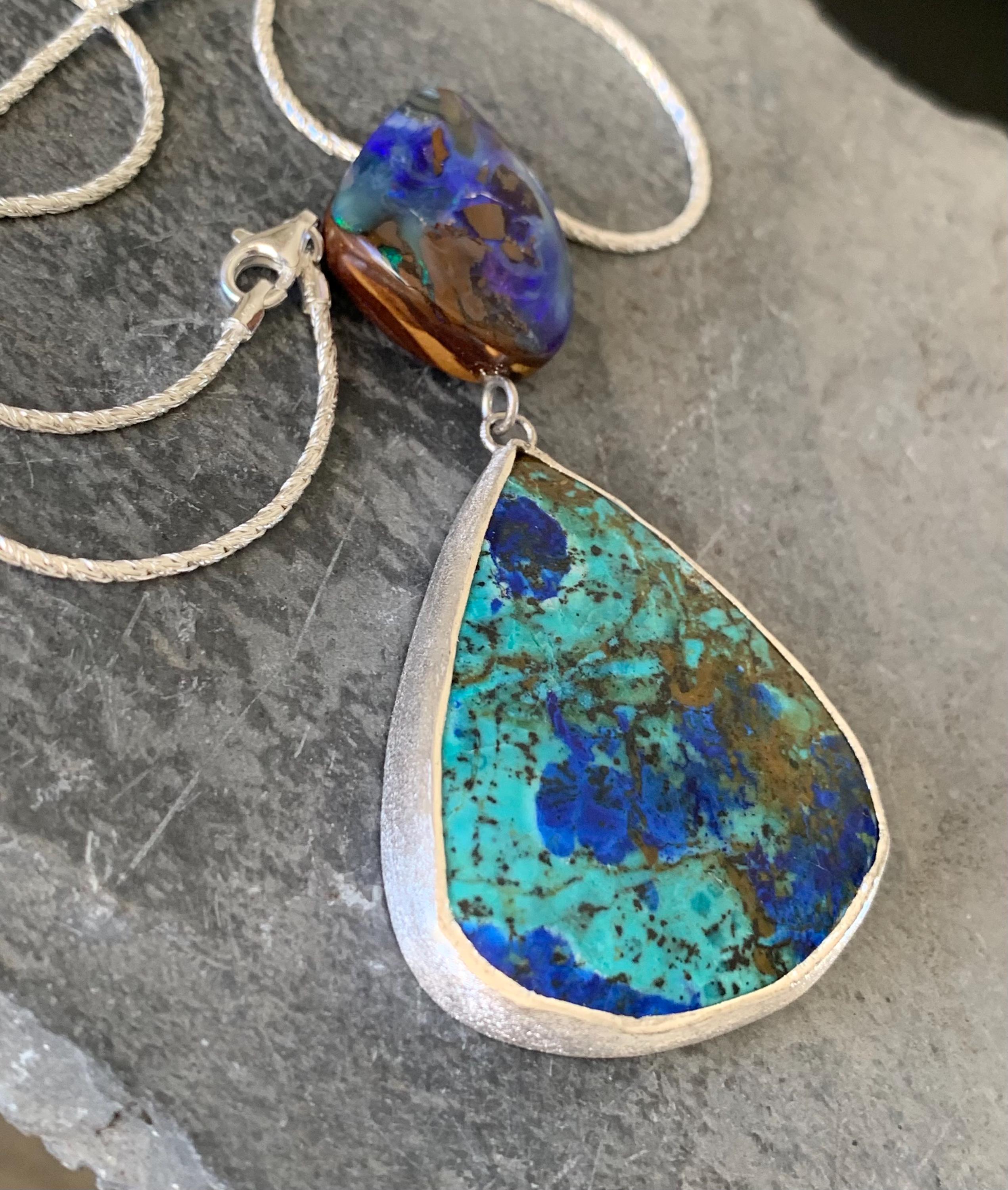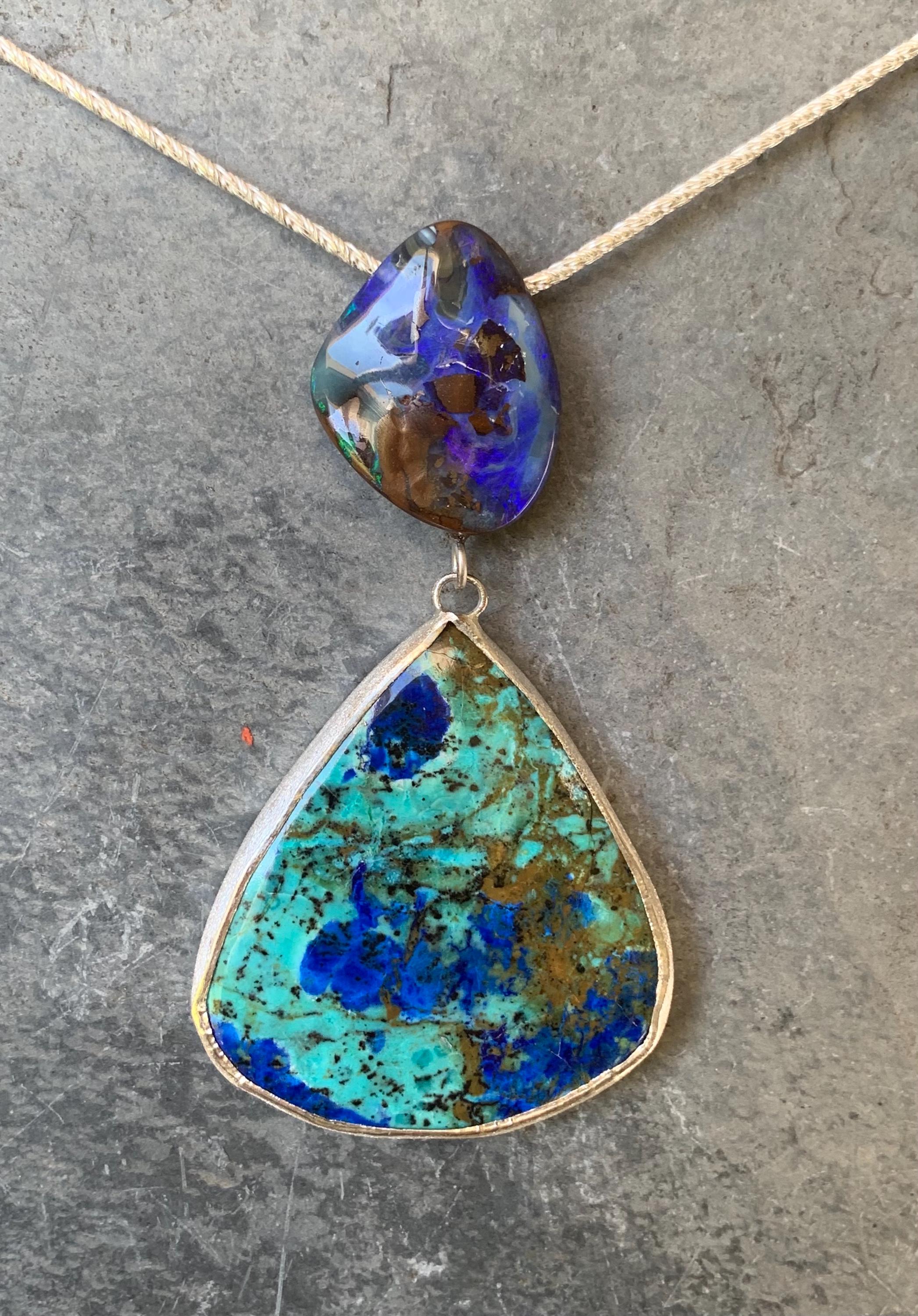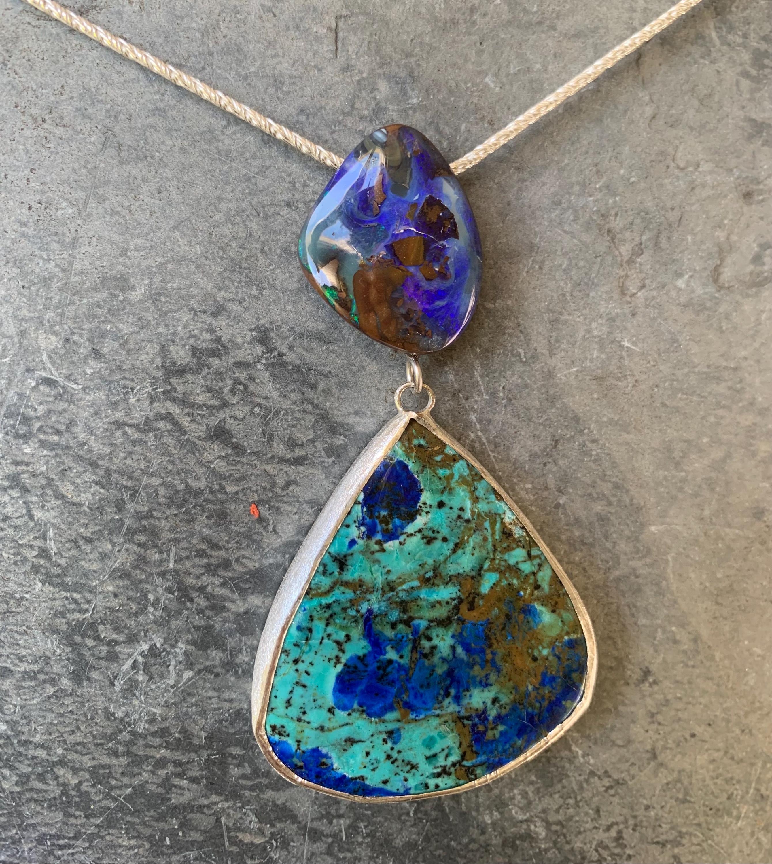 It is done in silver with 1 australian boulder opal and 1 big azurit-chrysocolle setted in silver.