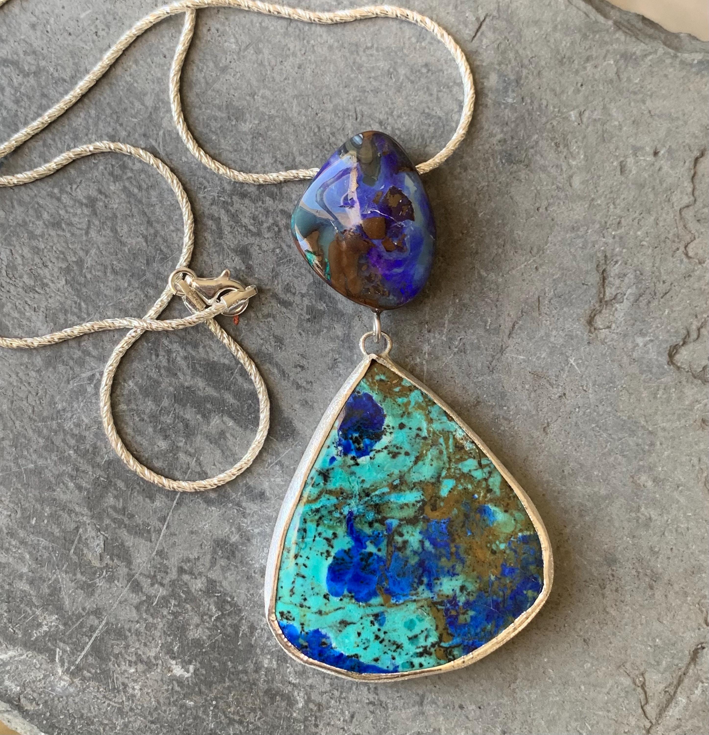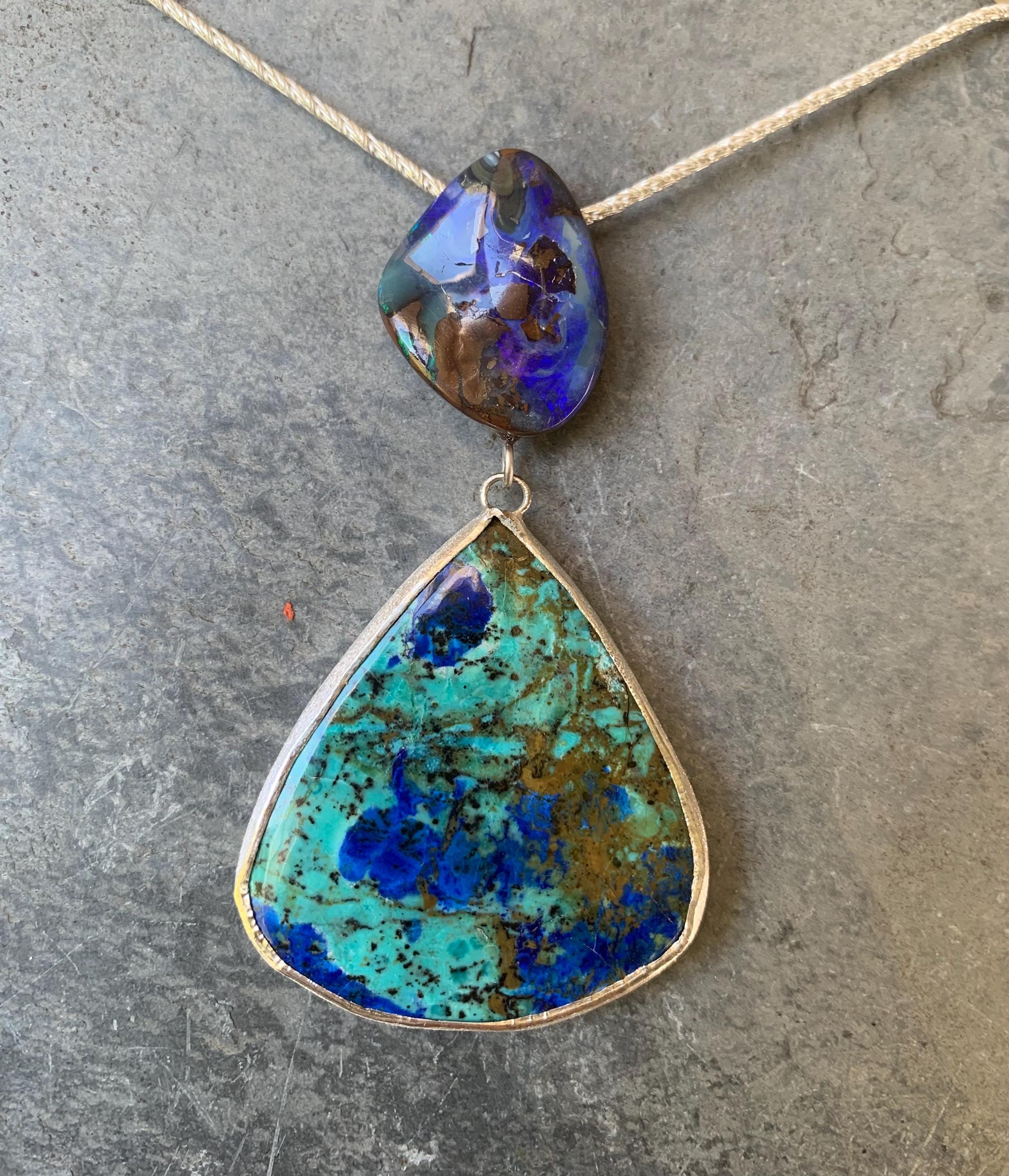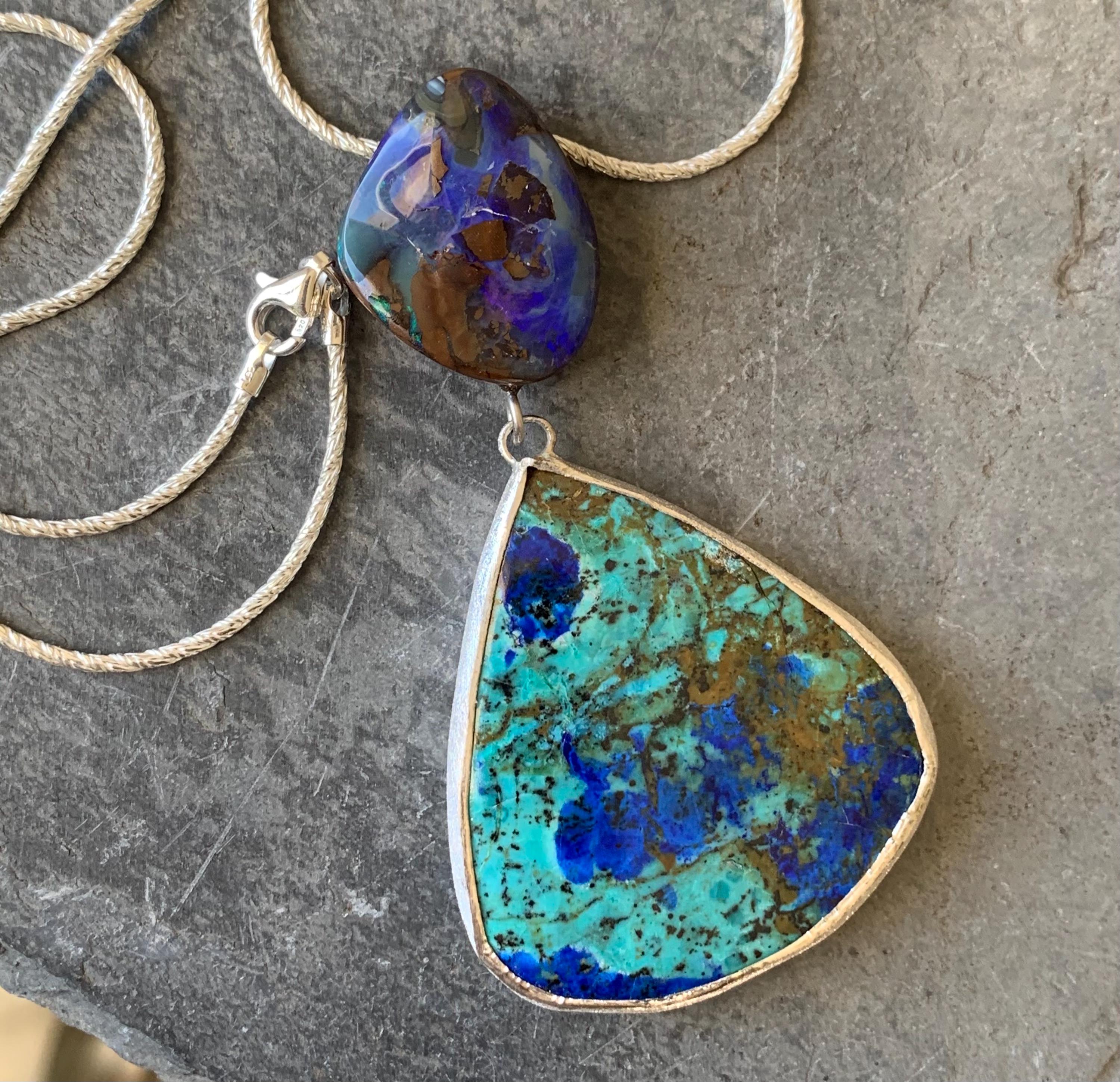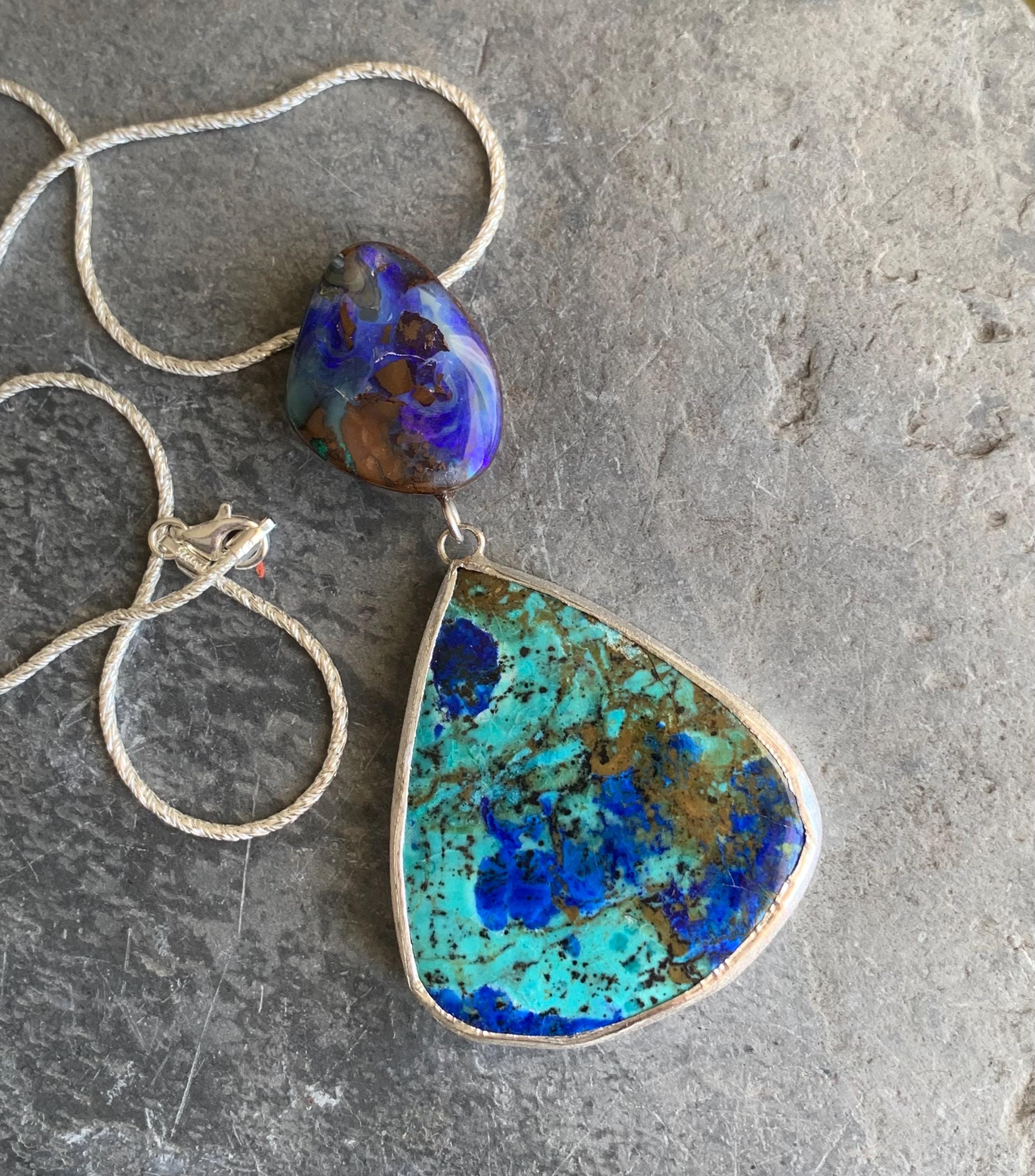 It is done in silver with 1 australian boulder opal and 1 big azurit-chrysocolle setted in silver.