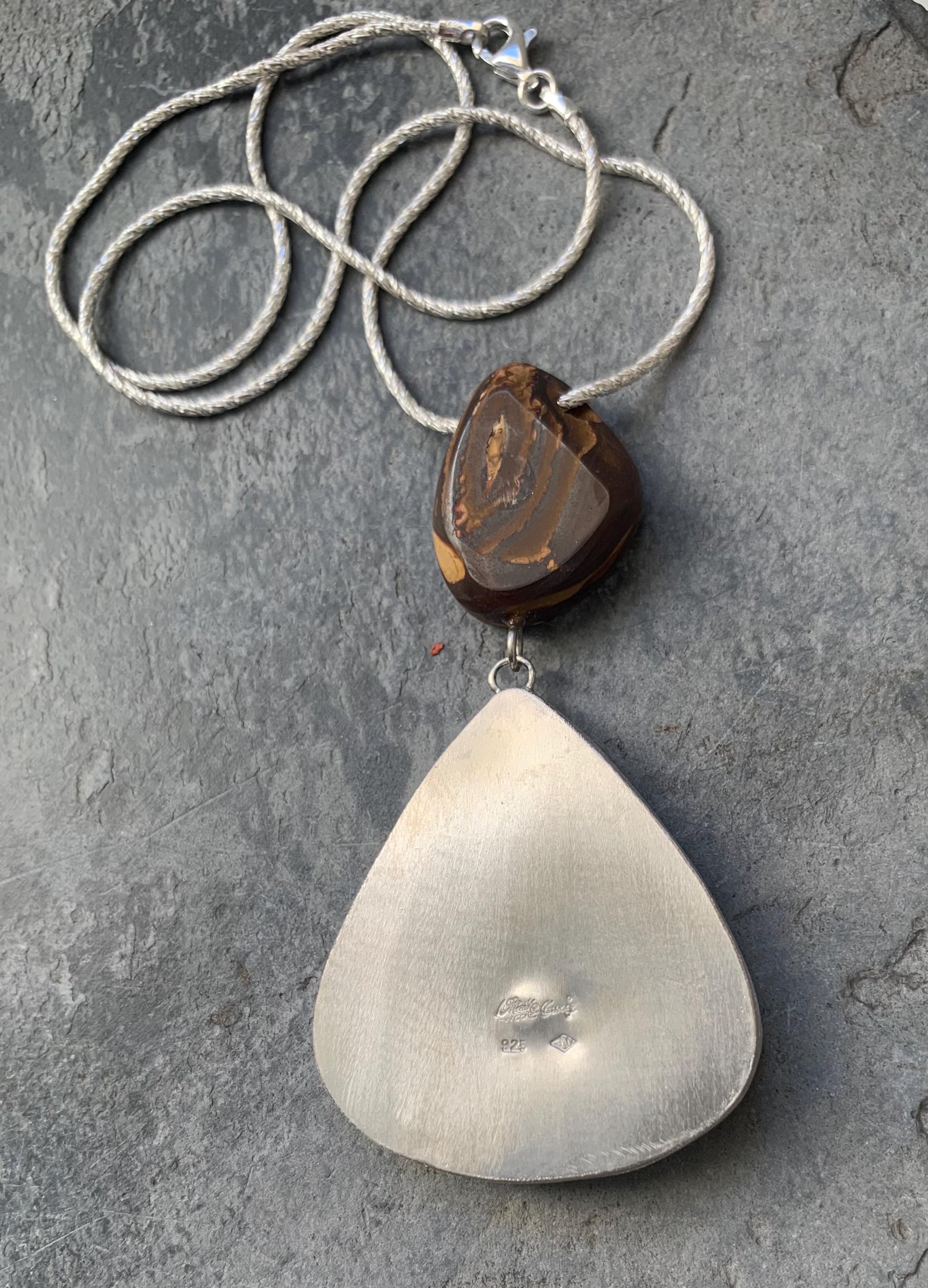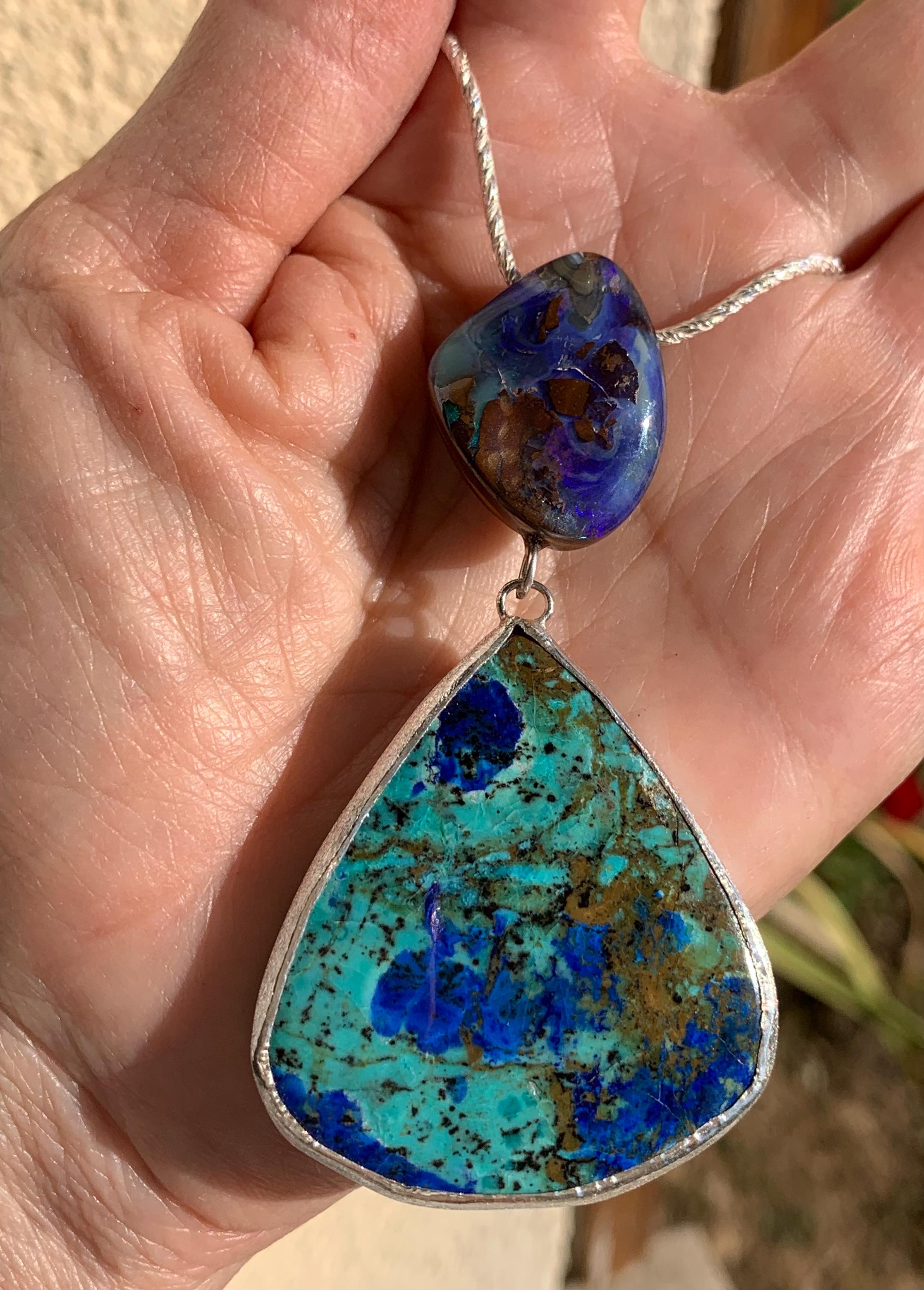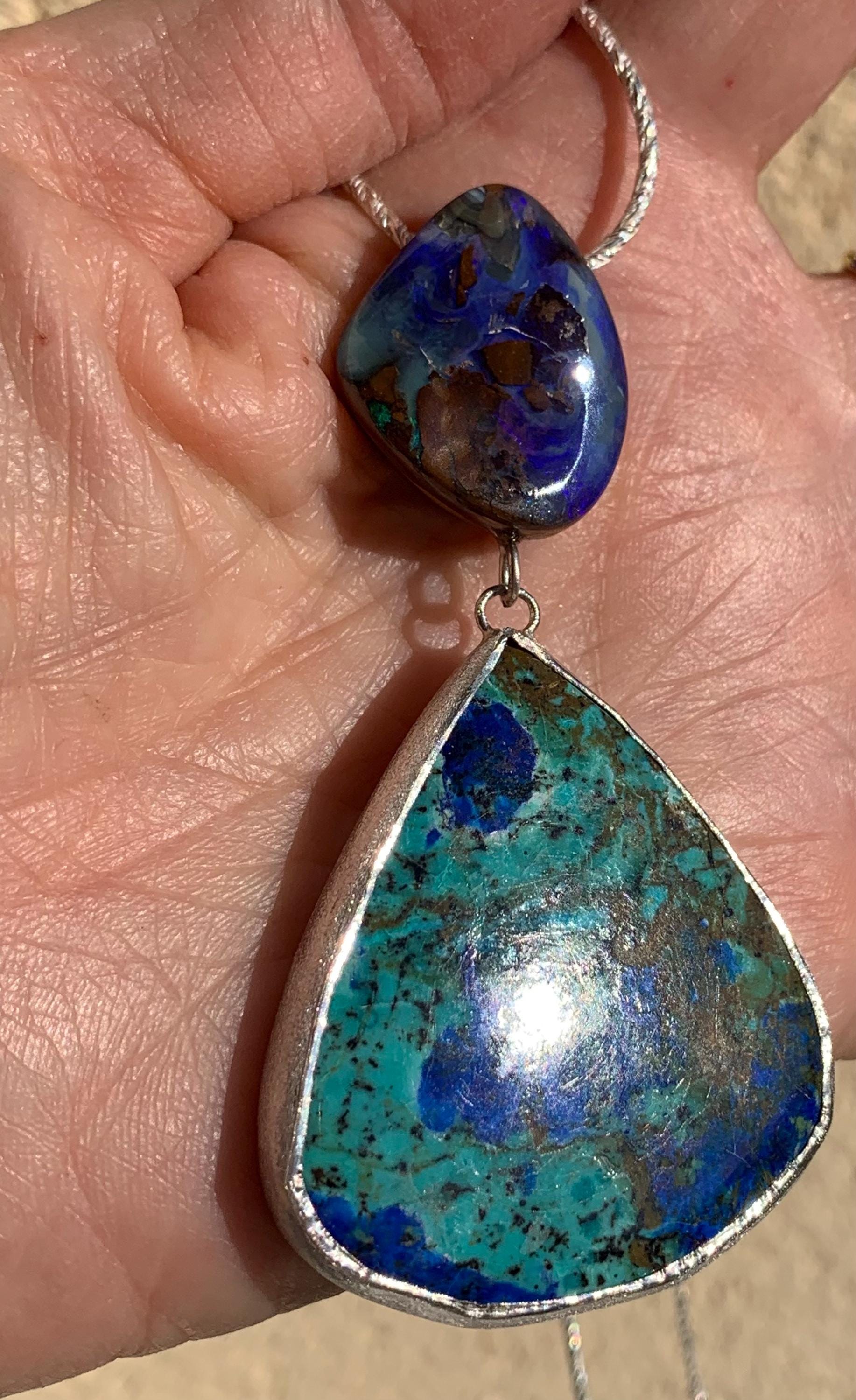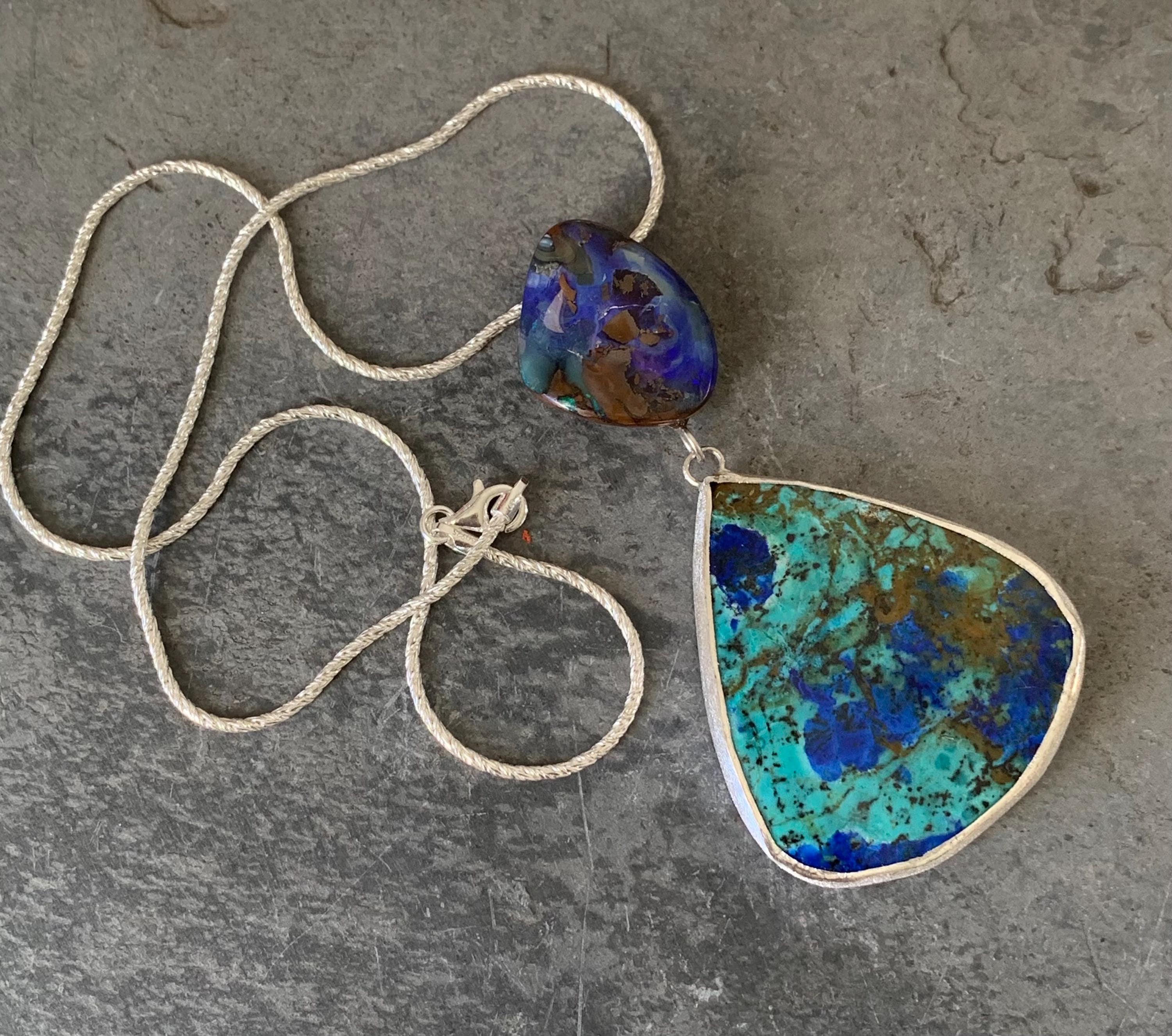It is done in silver with 1 australian boulder opal and 1 big azurit-chrysocolle setted in silver.