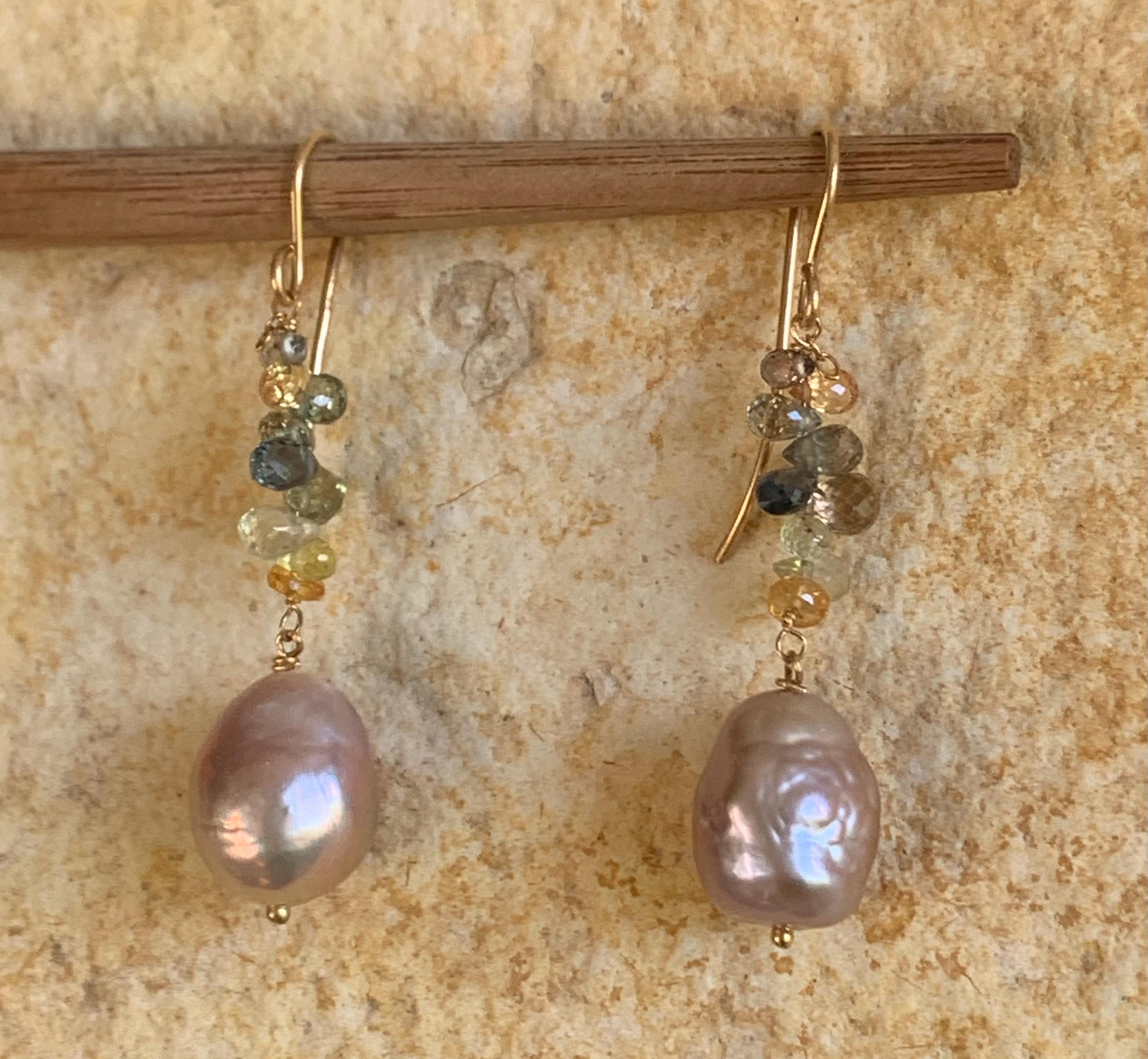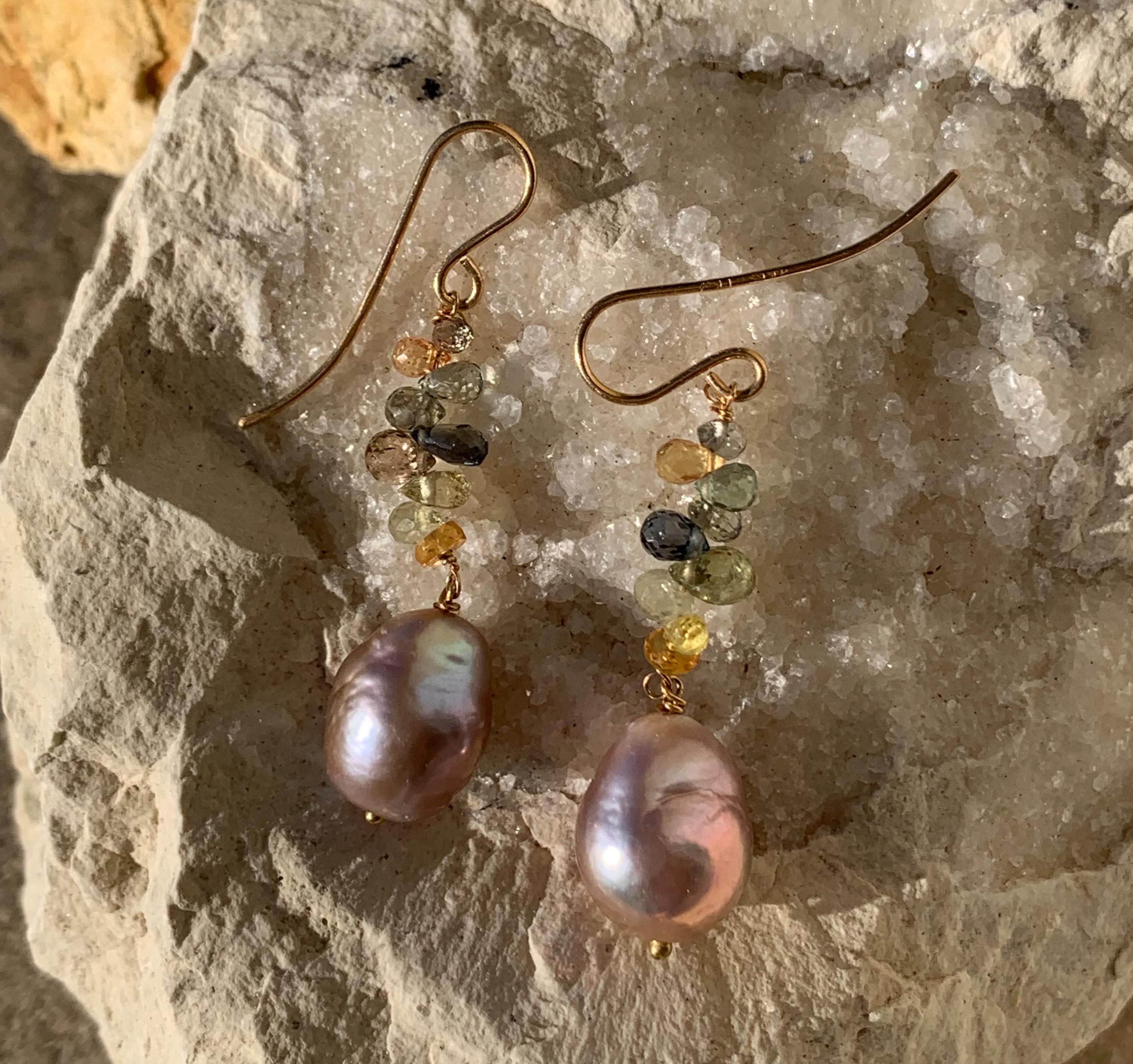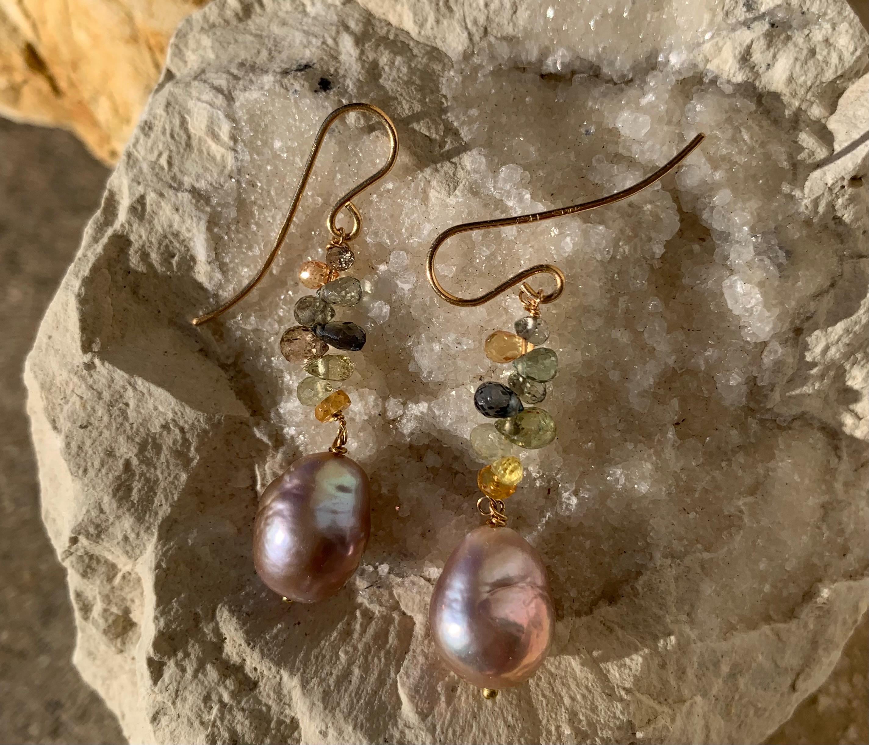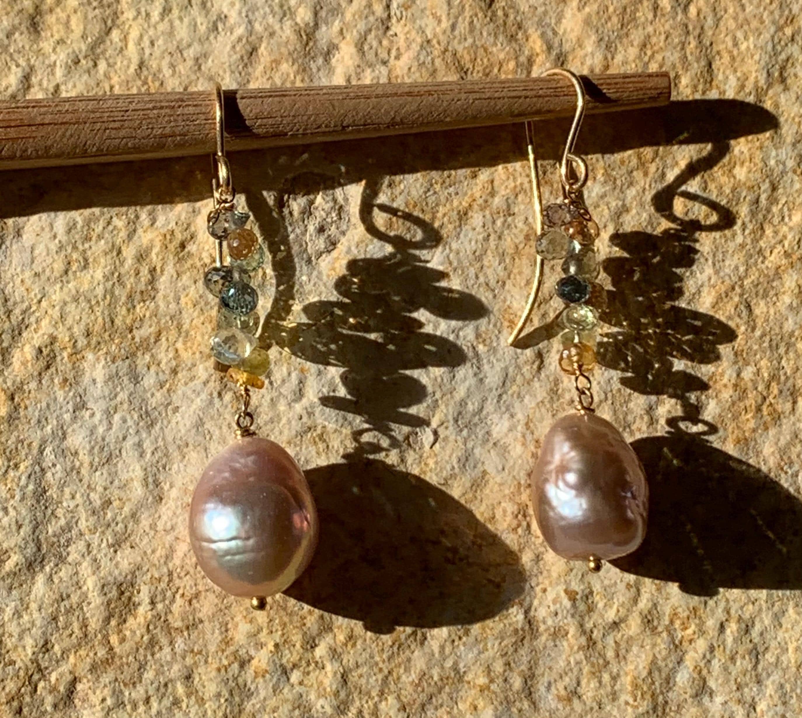 Under the systems are hanging yellow and green sapphire briolettes and 2 rose freshwaterpearls.