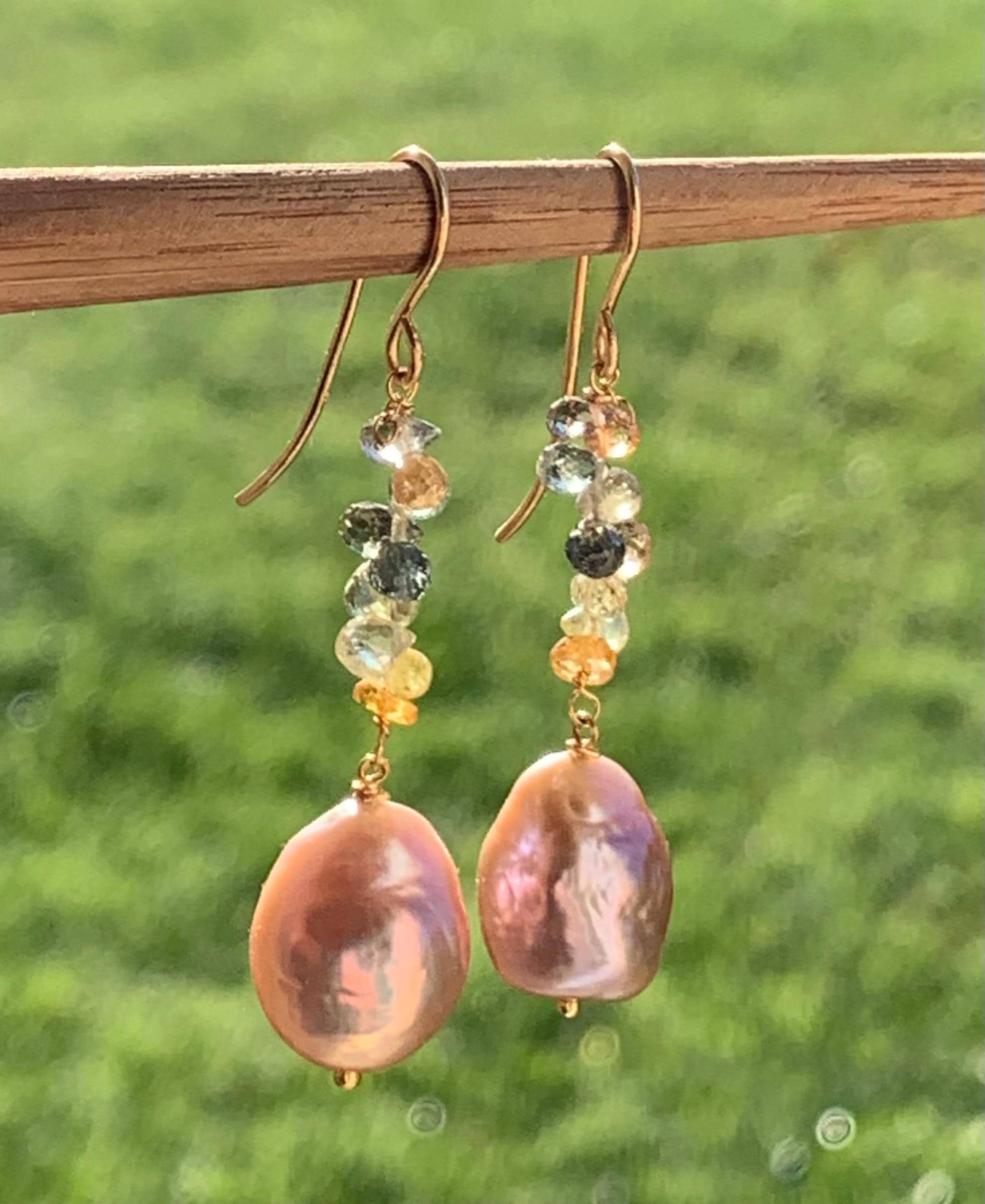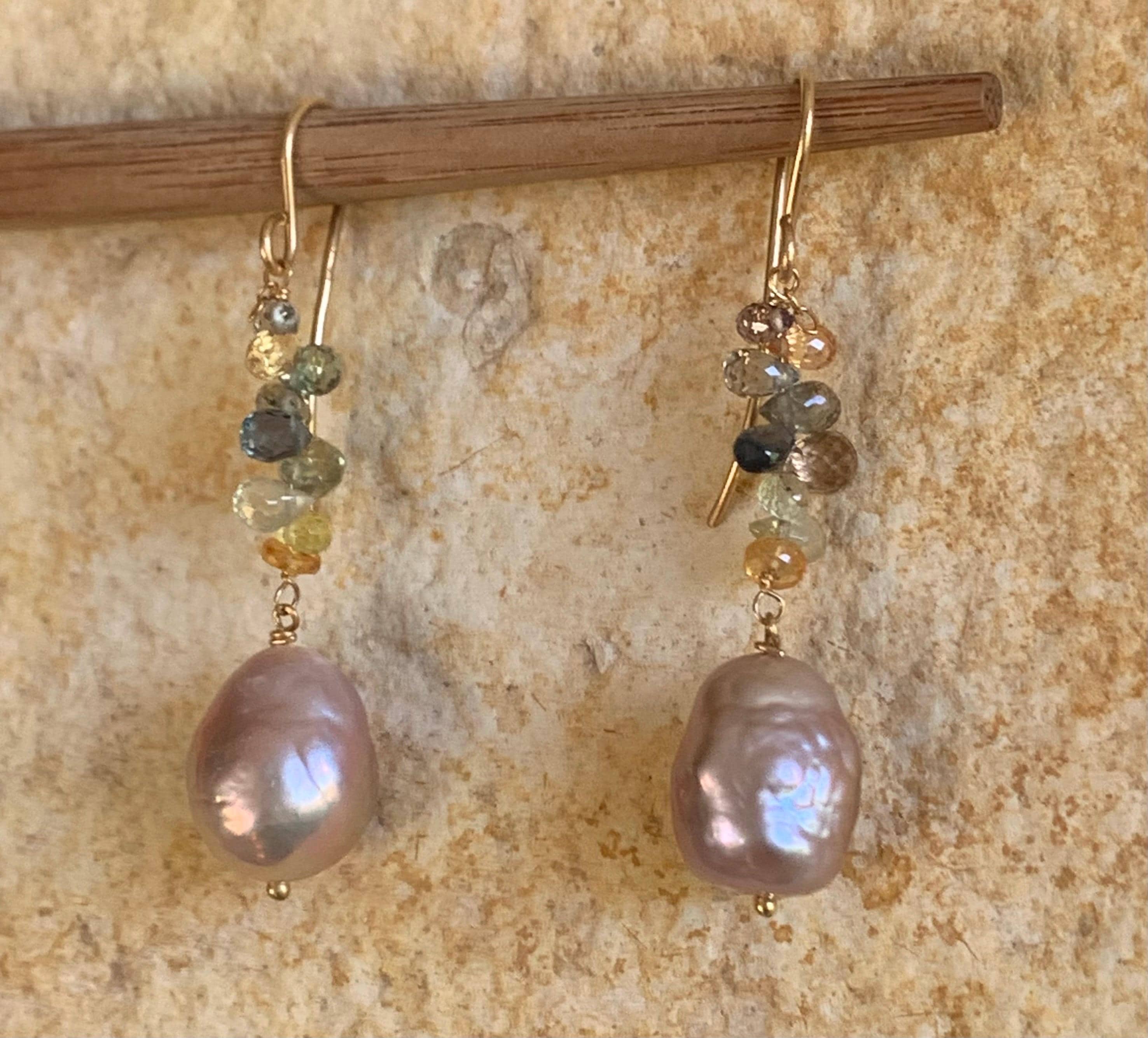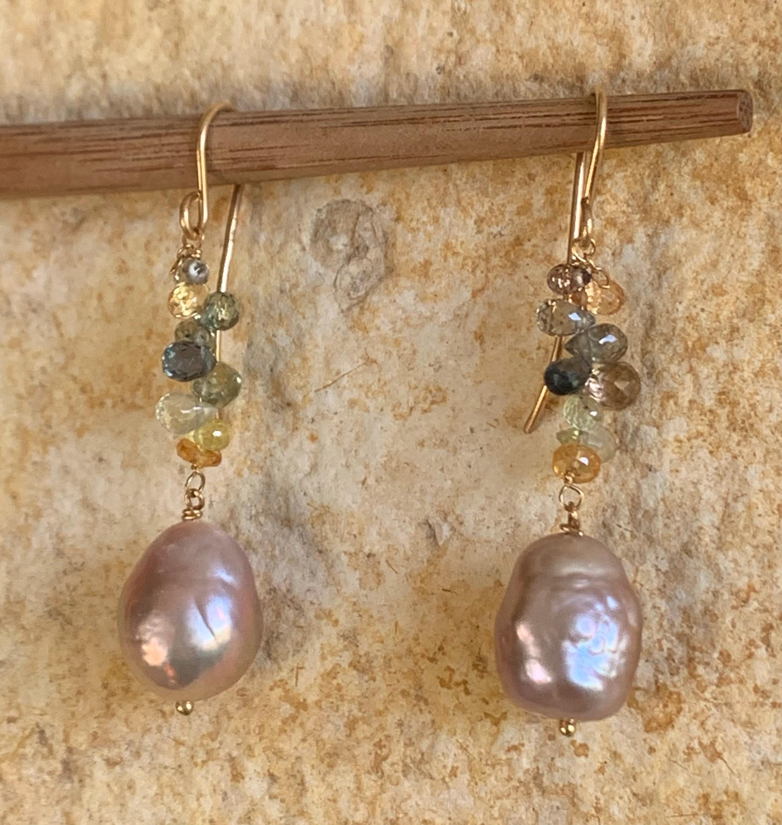 Under the systems are hanging yellow and green sapphire briolettes and 2 rose freshwaterpearls.