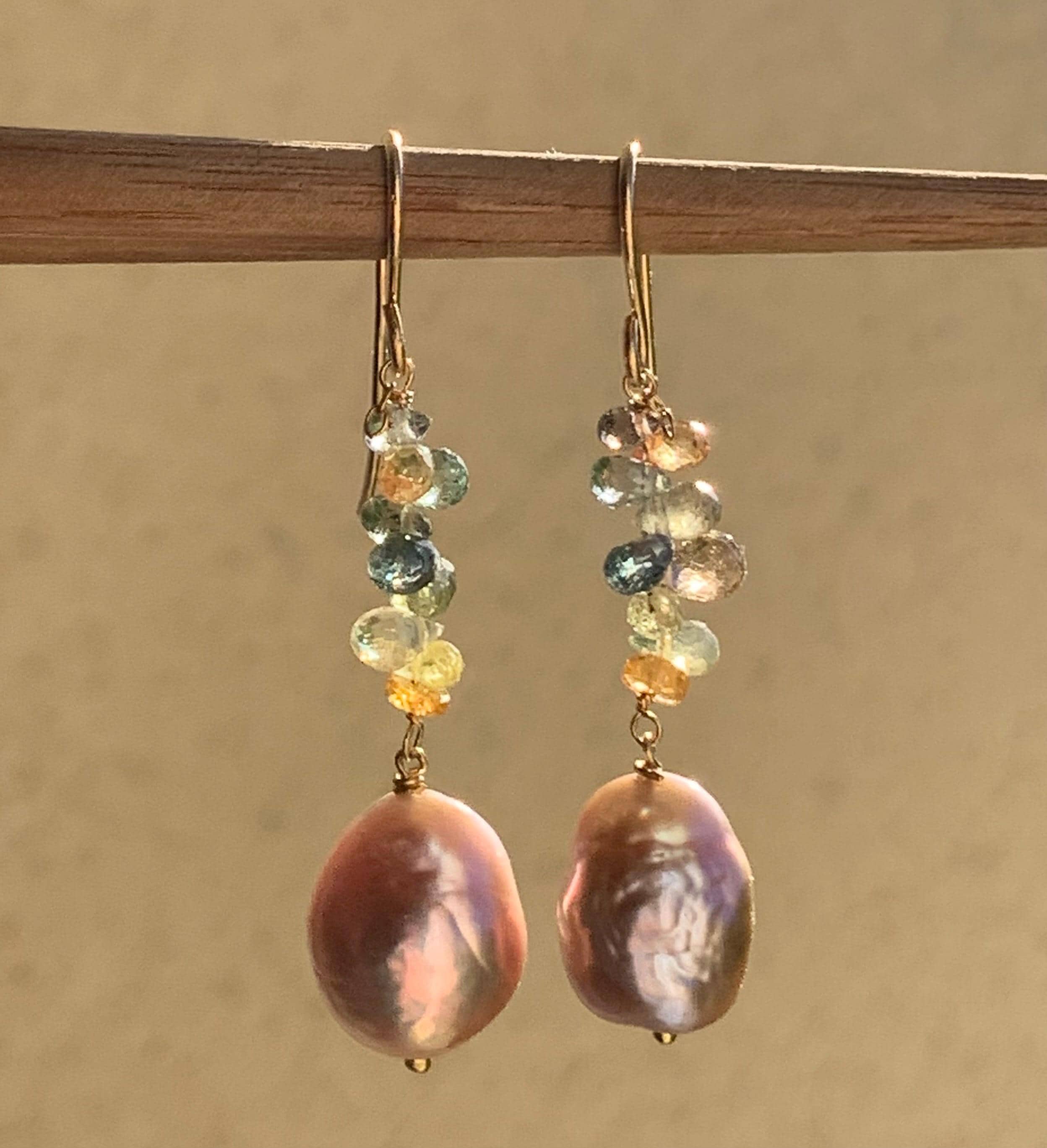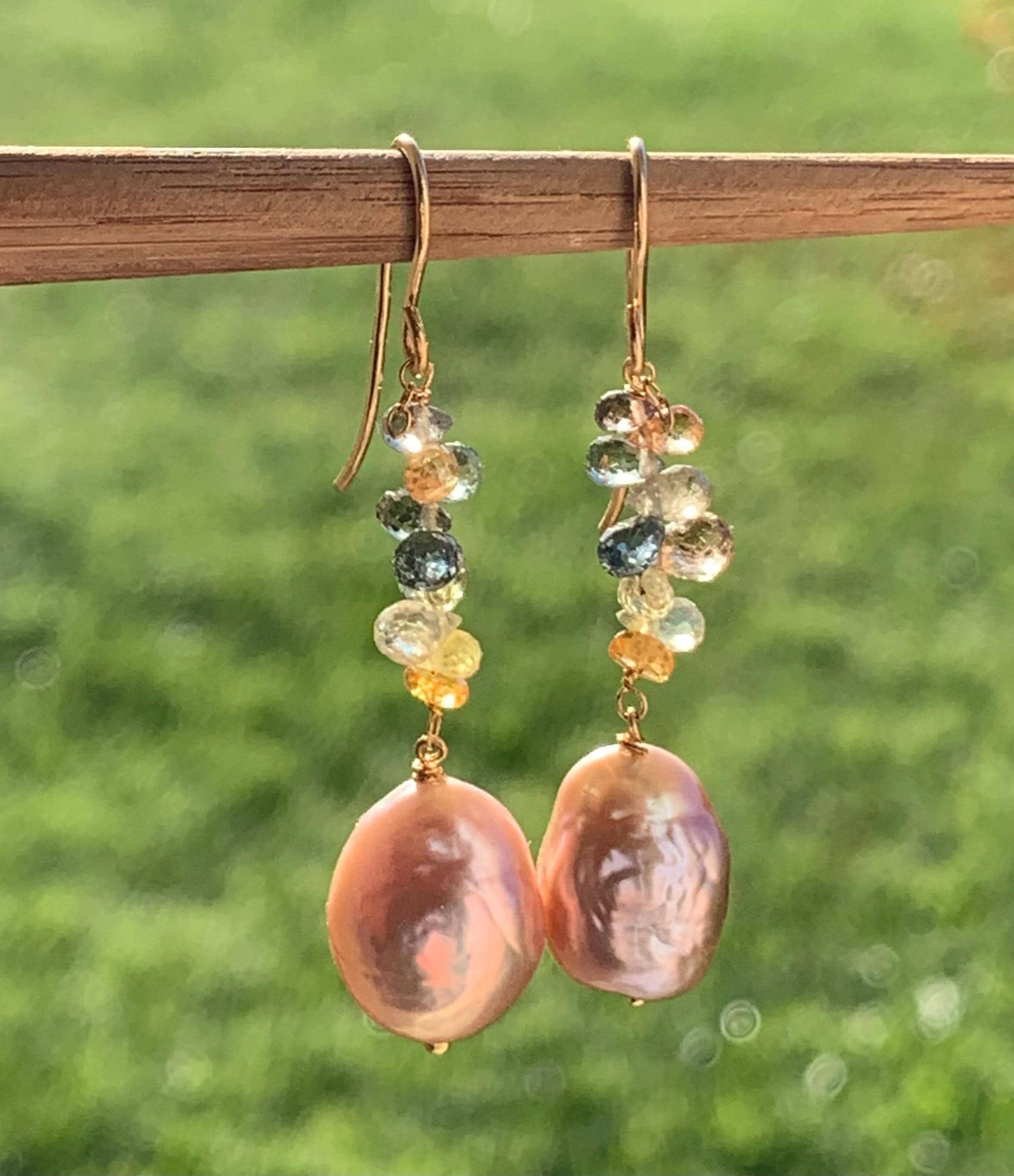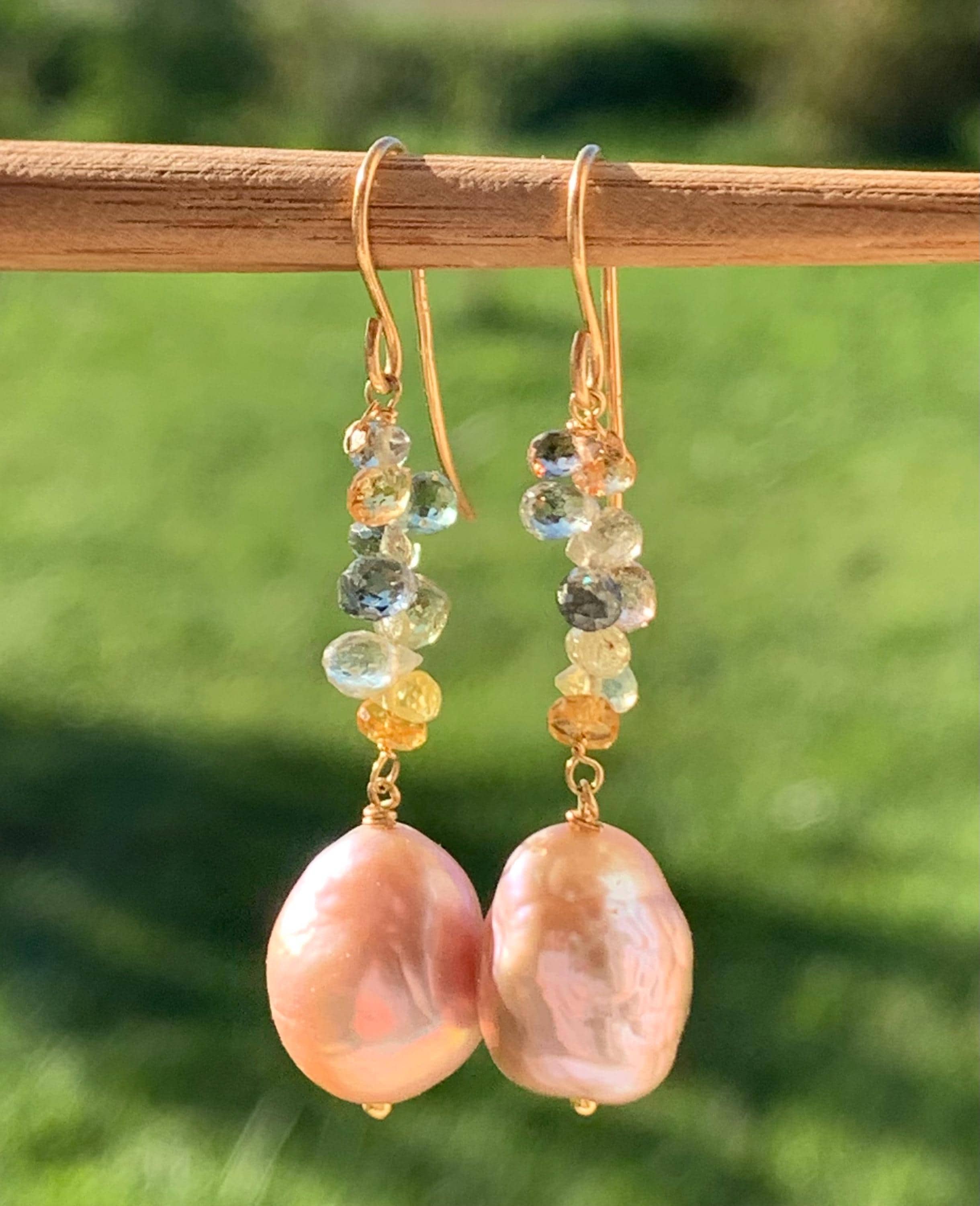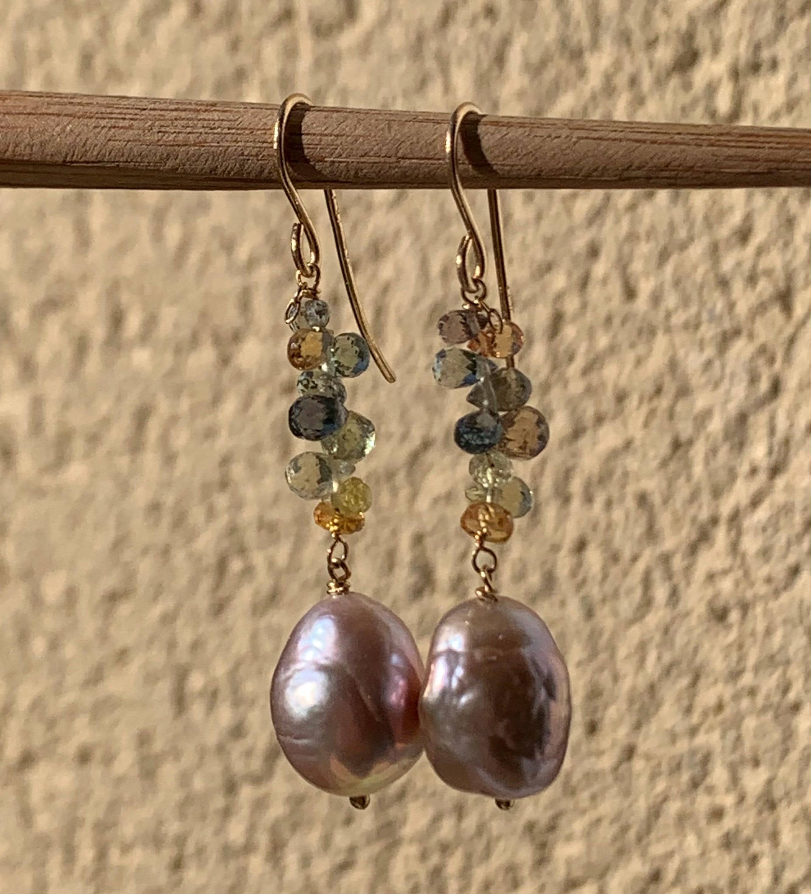 Under the systems are hanging yellow and green sapphire briolettes and 2 rose freshwaterpearls.