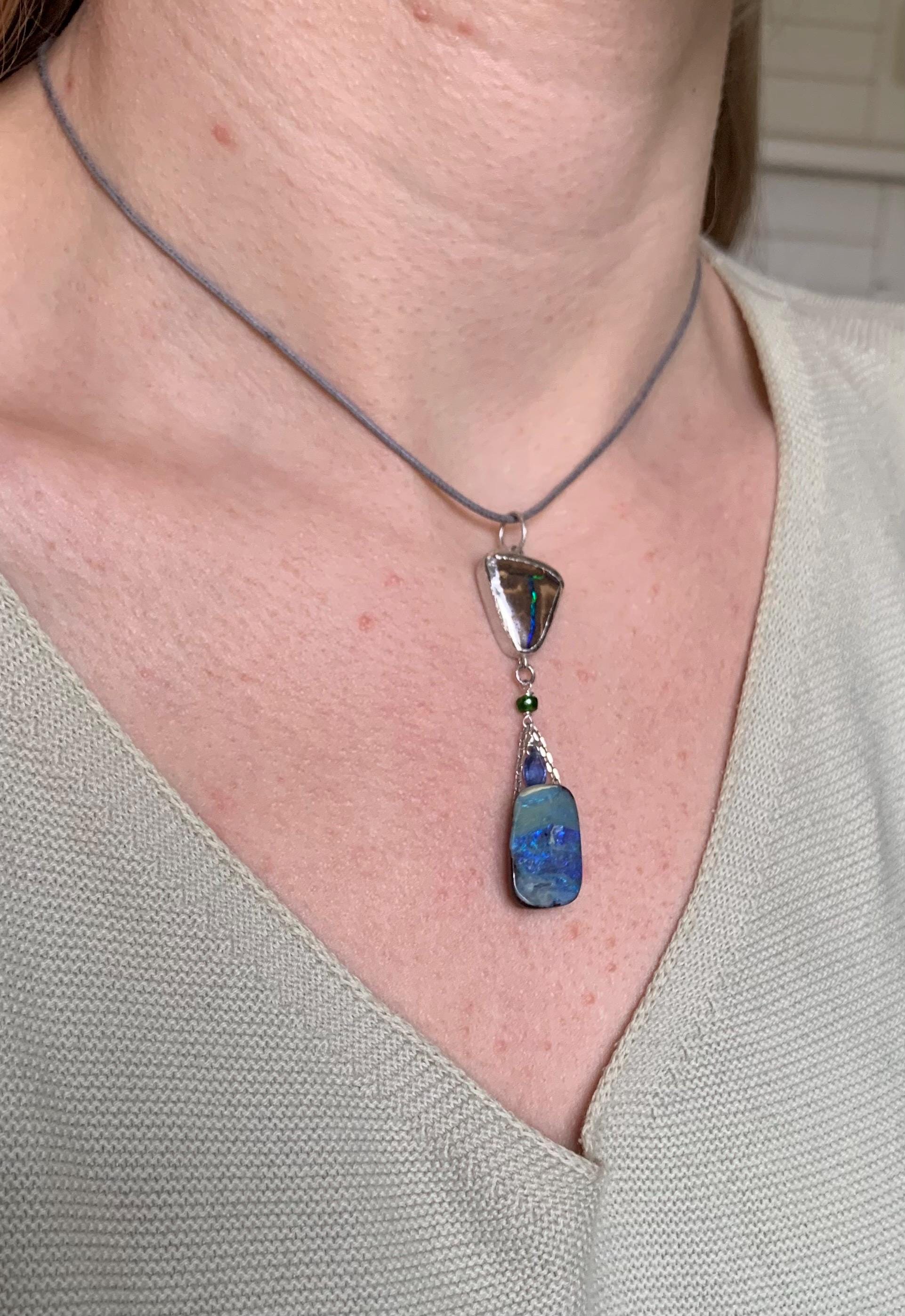 This pendant is done with 2 australian boulder opals ( one setted in solid 925 silver ), a chrom diopside and a cyanite briolette hanging on silver wire and chain,