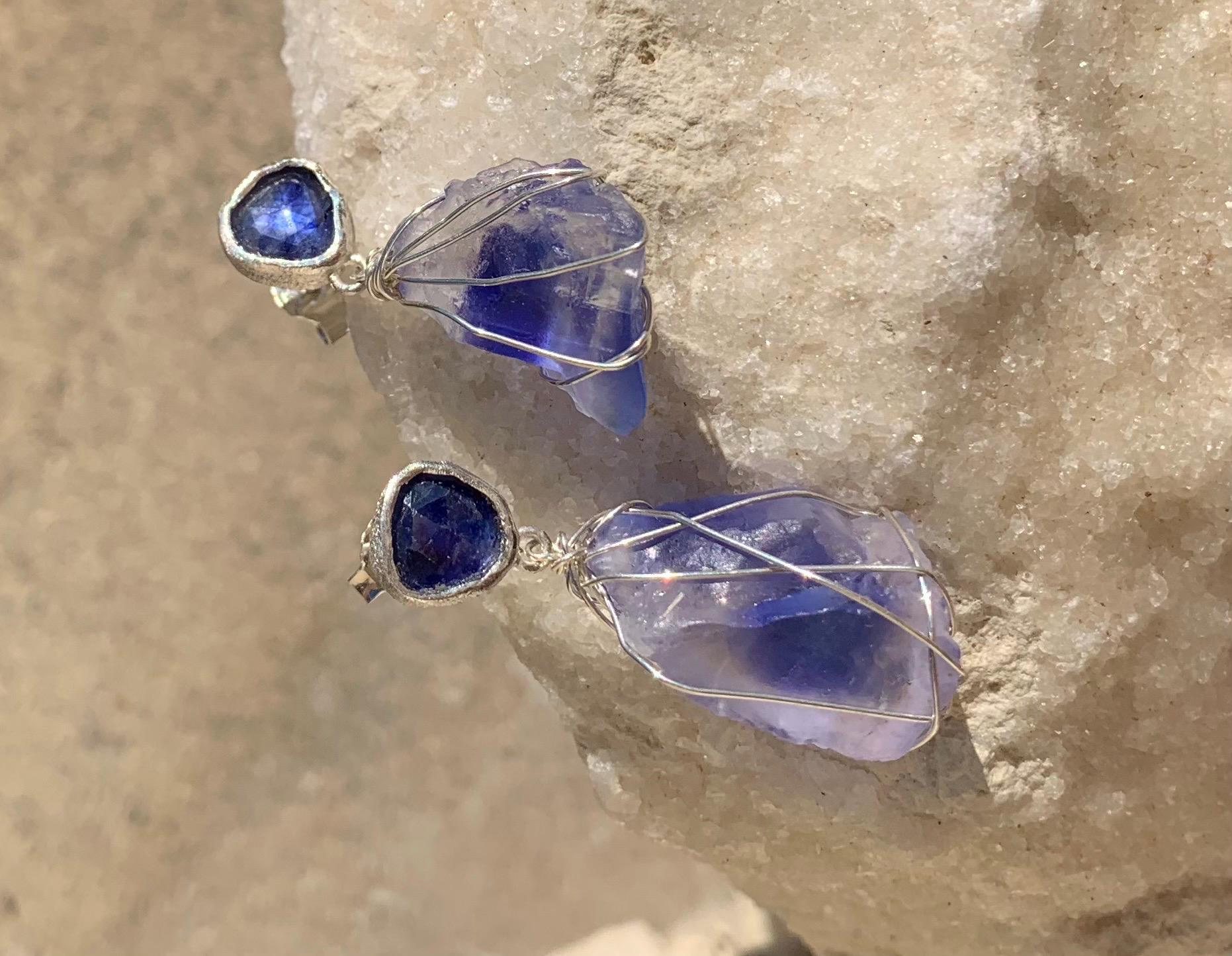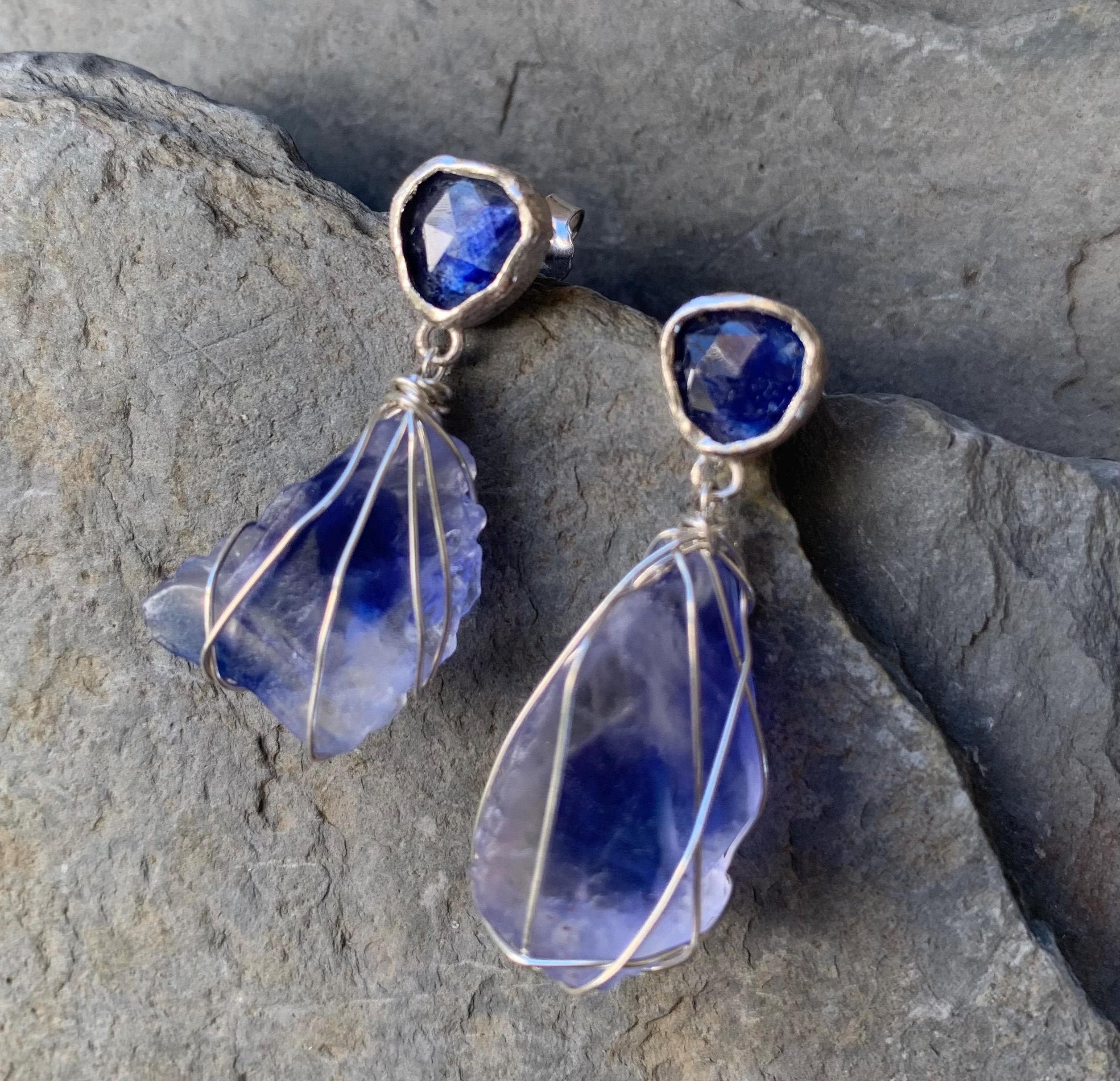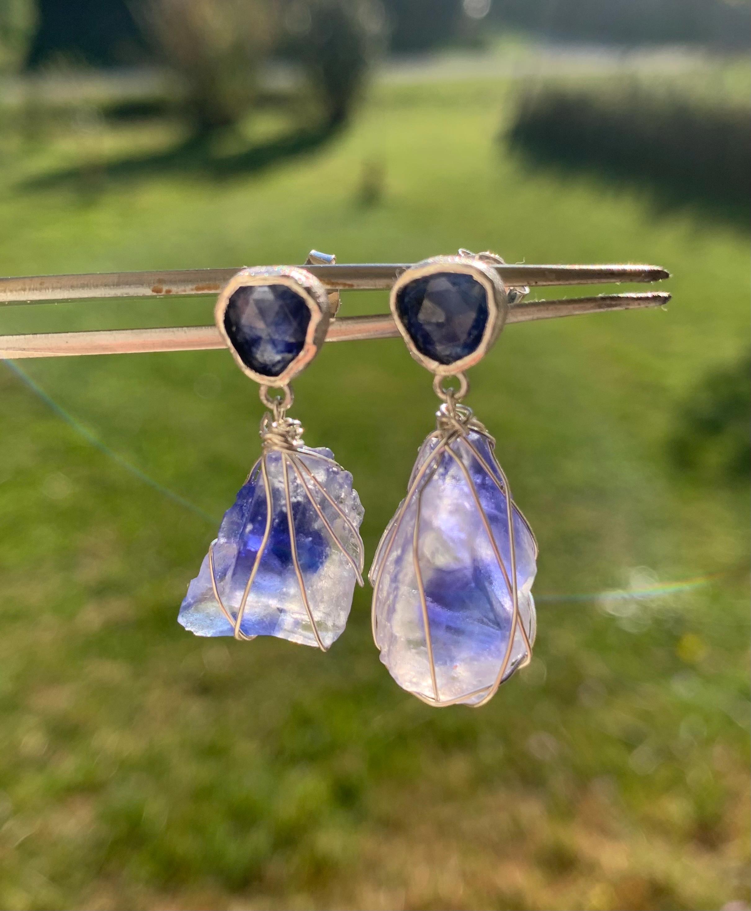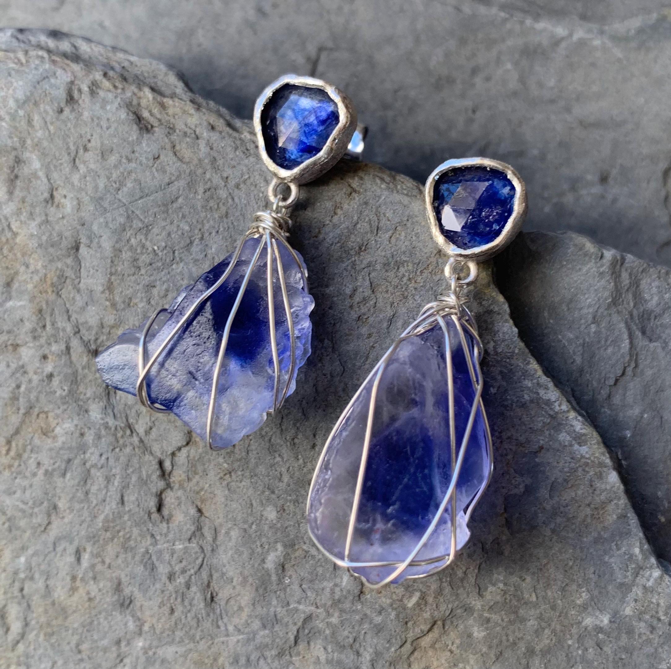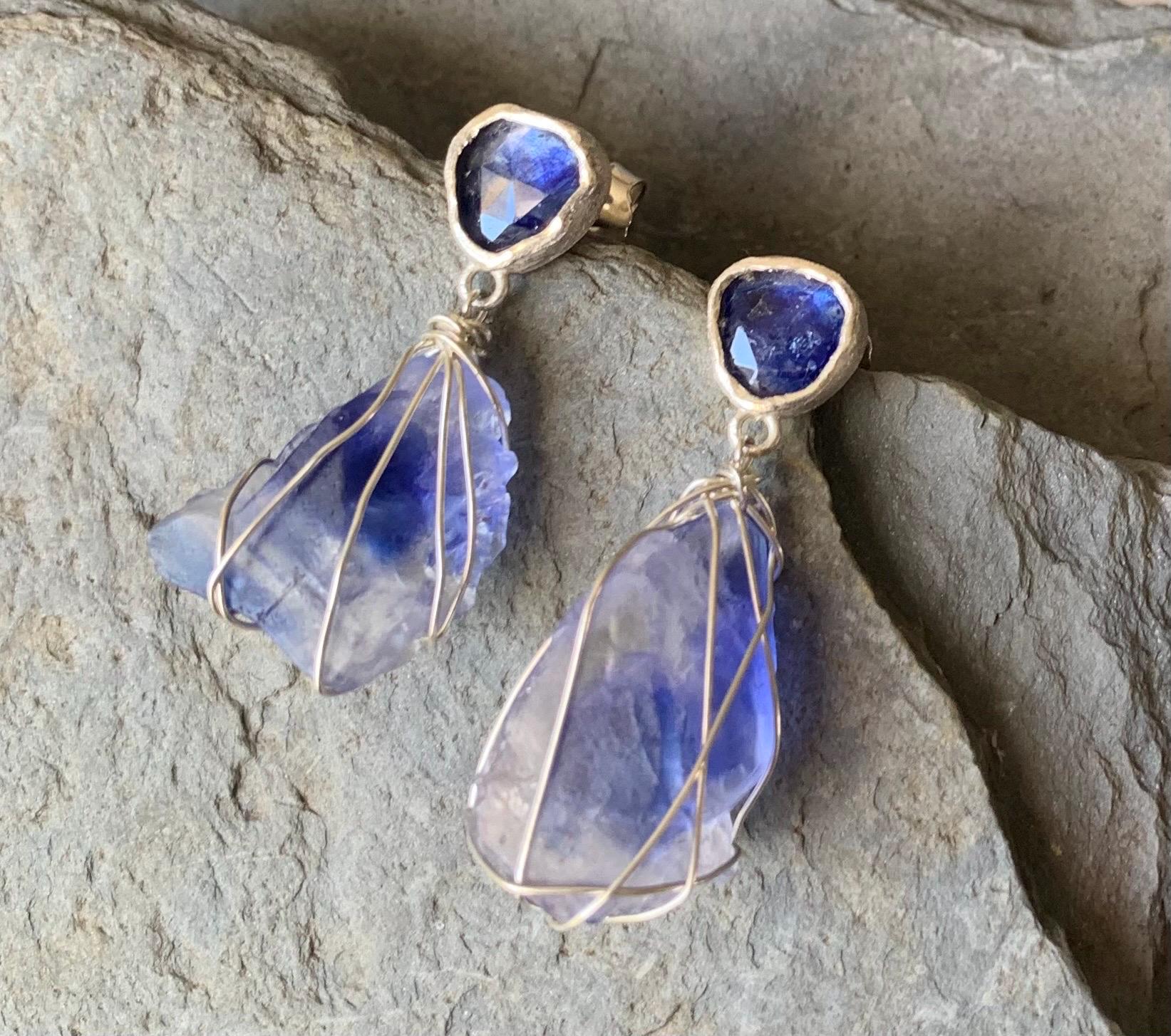 Under the sapphires are hanging 2 rough halits wrapped in silver wire.
