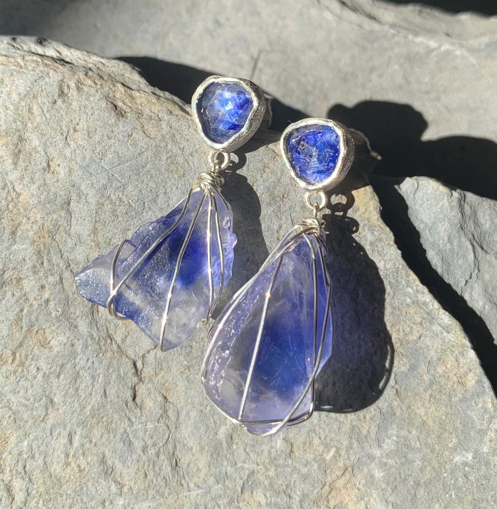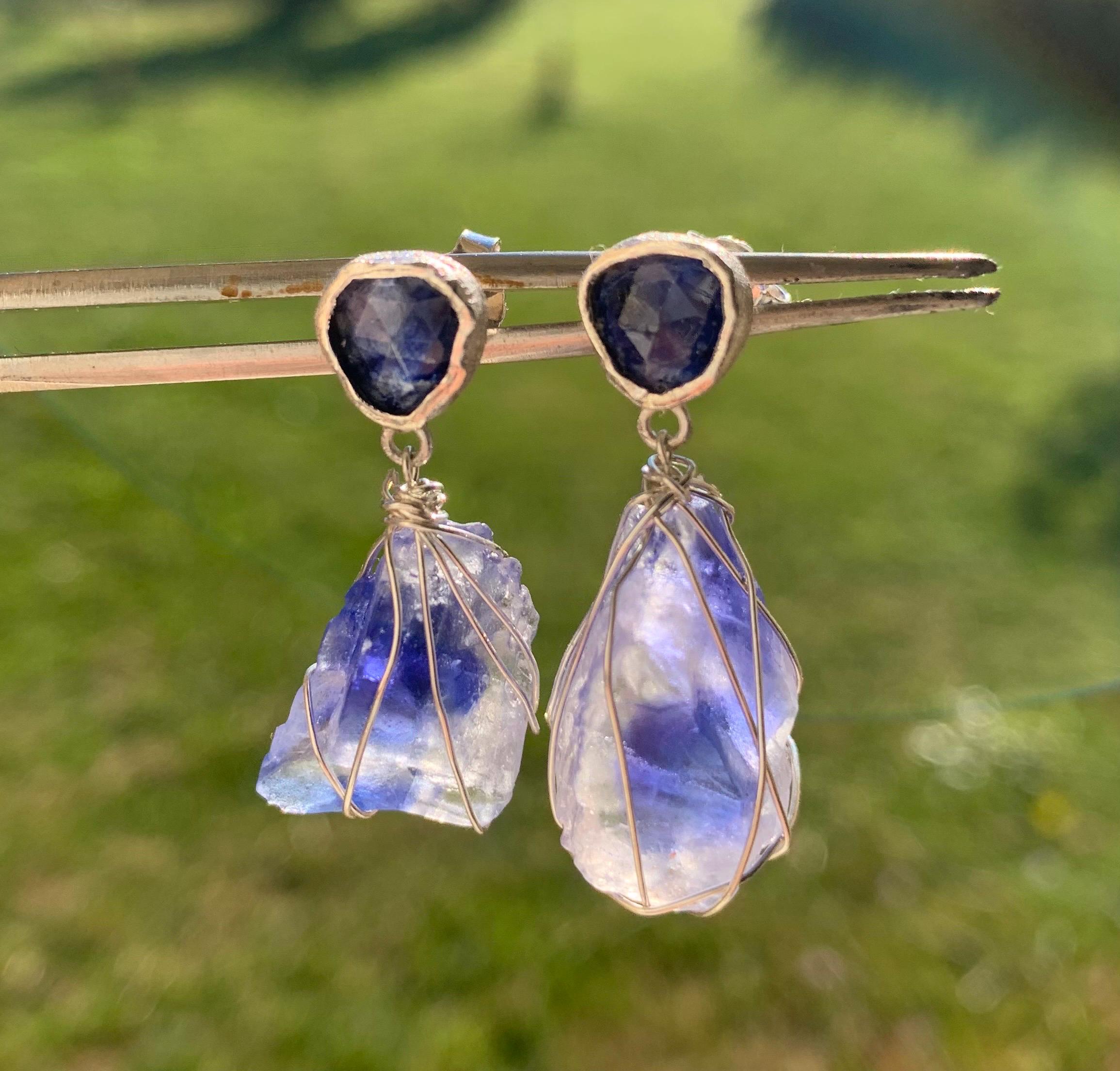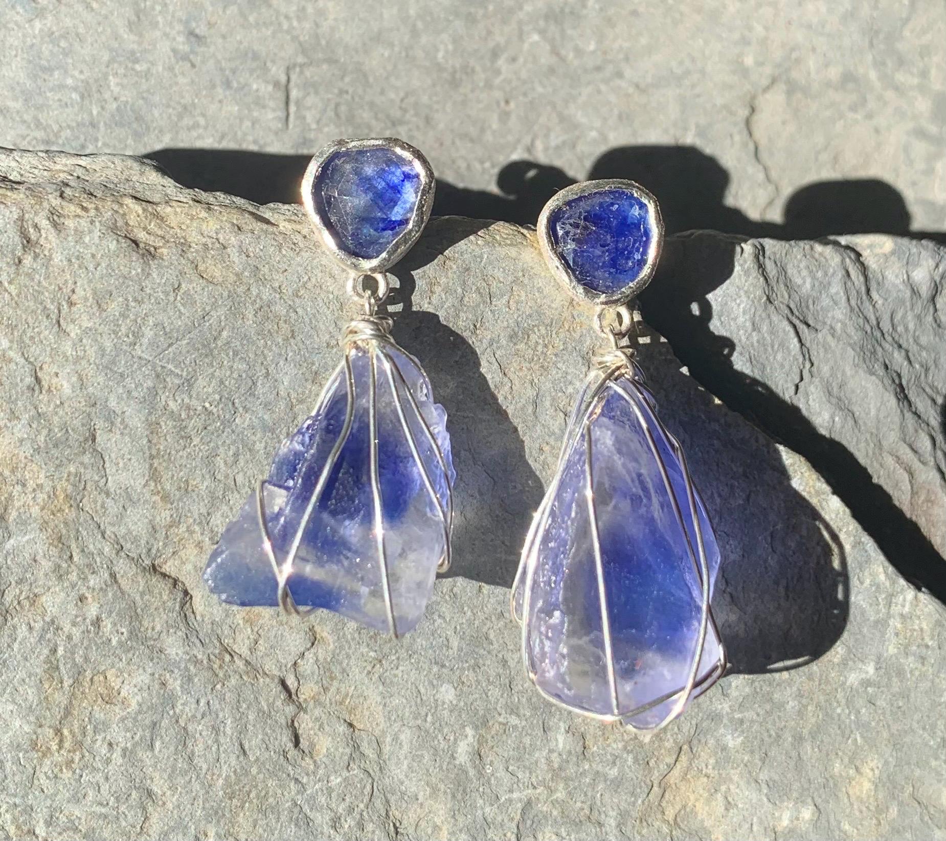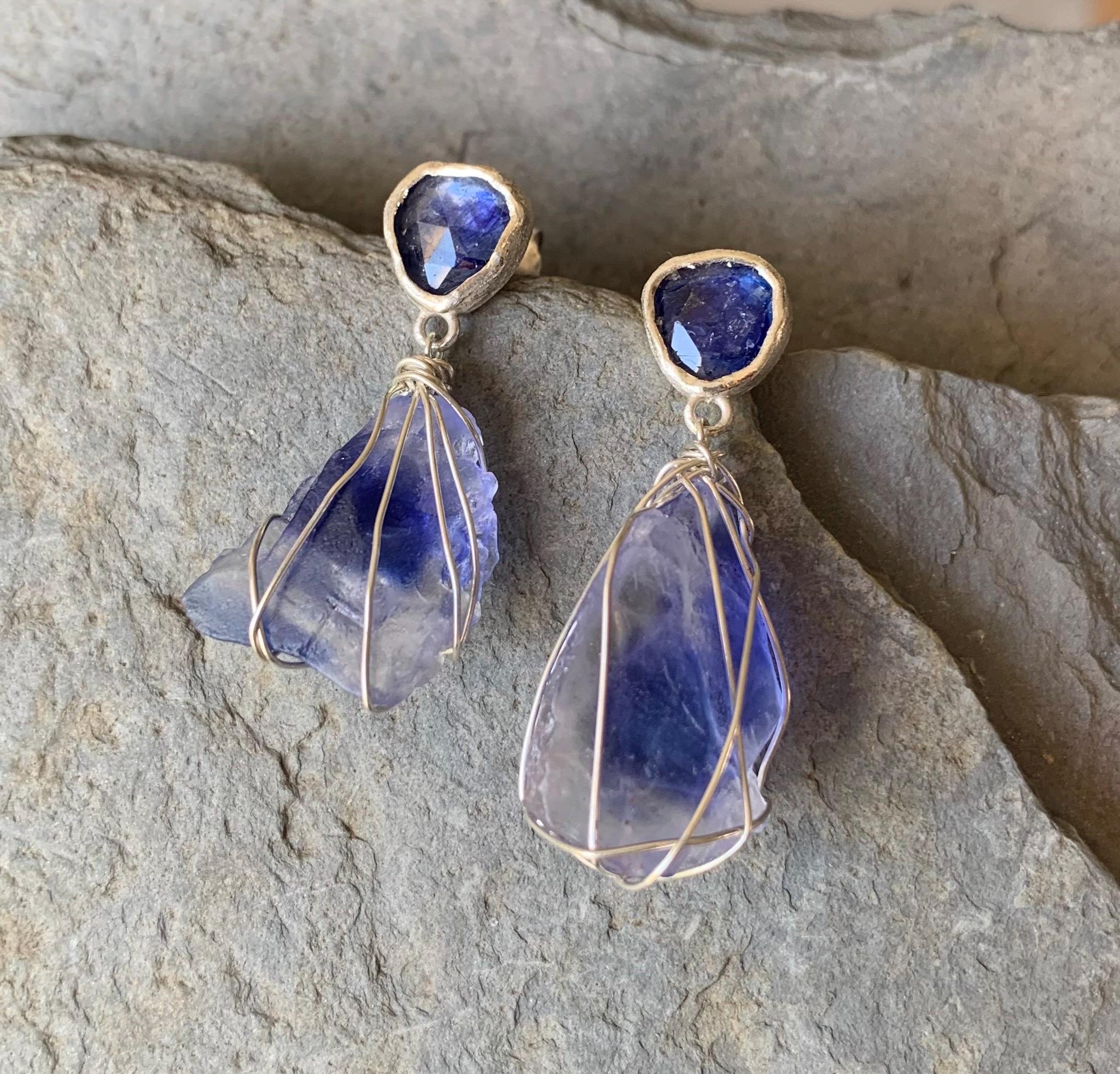 Under the sapphires are hanging 2 rough halits wrapped in silver wire.