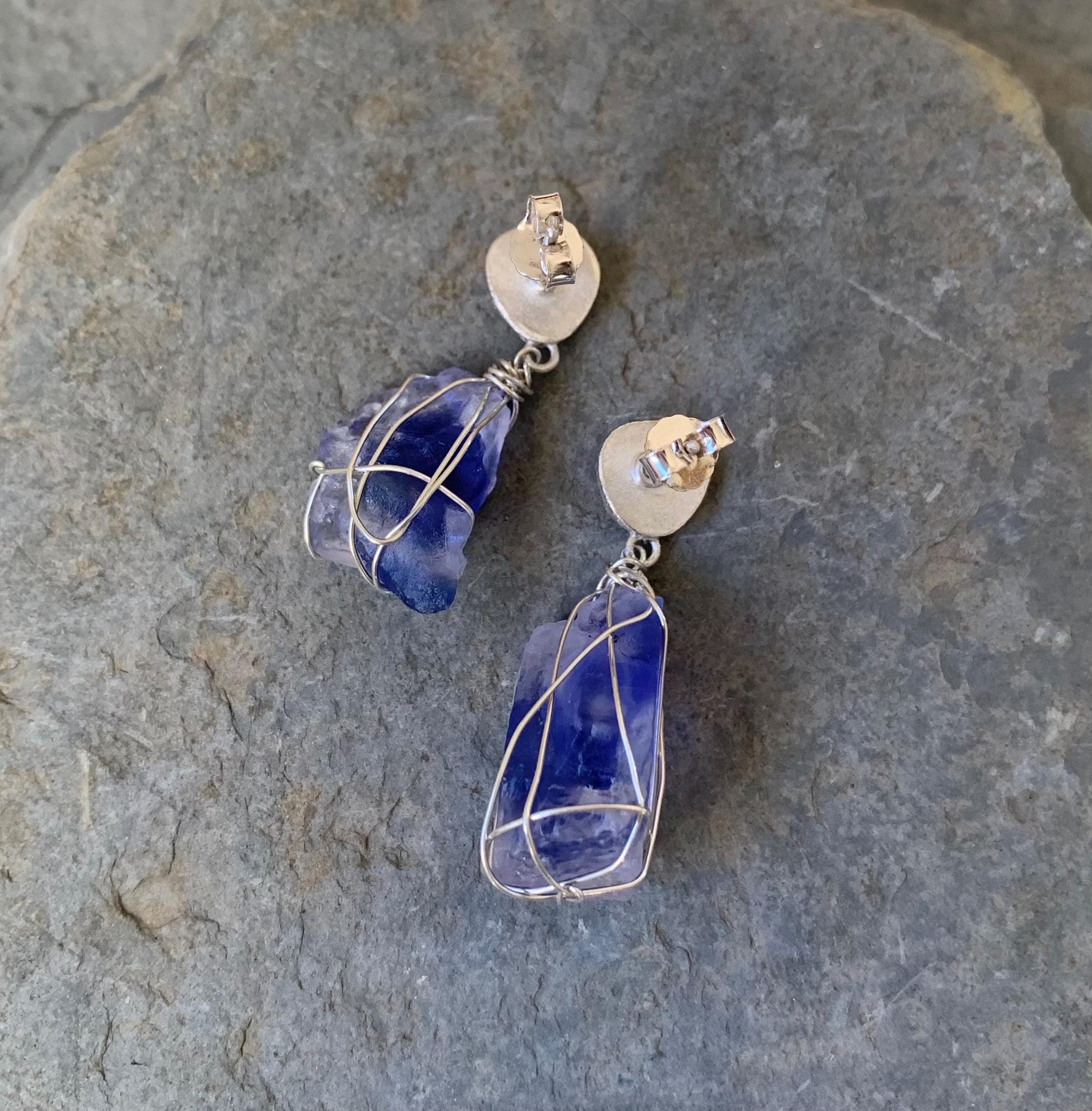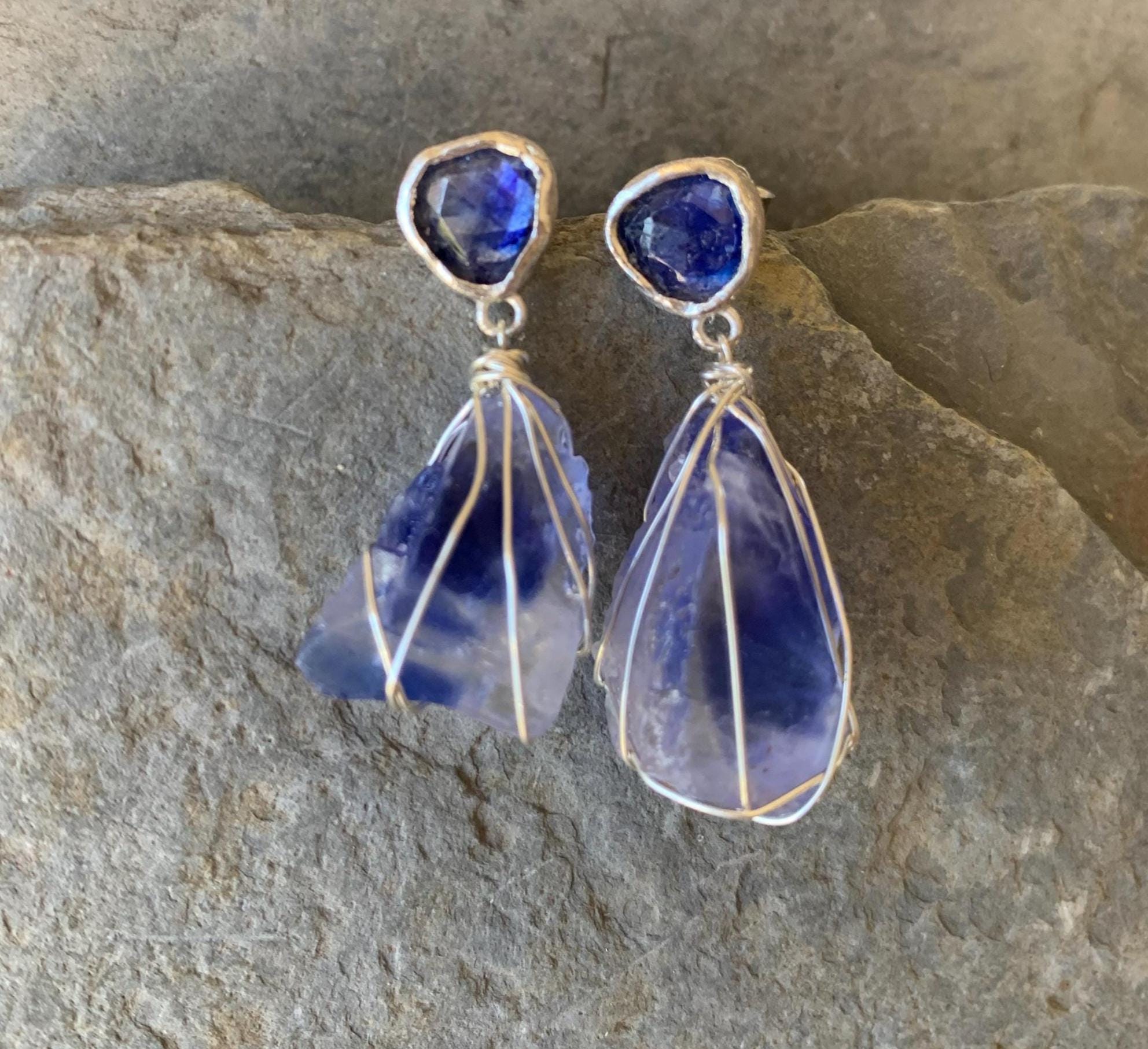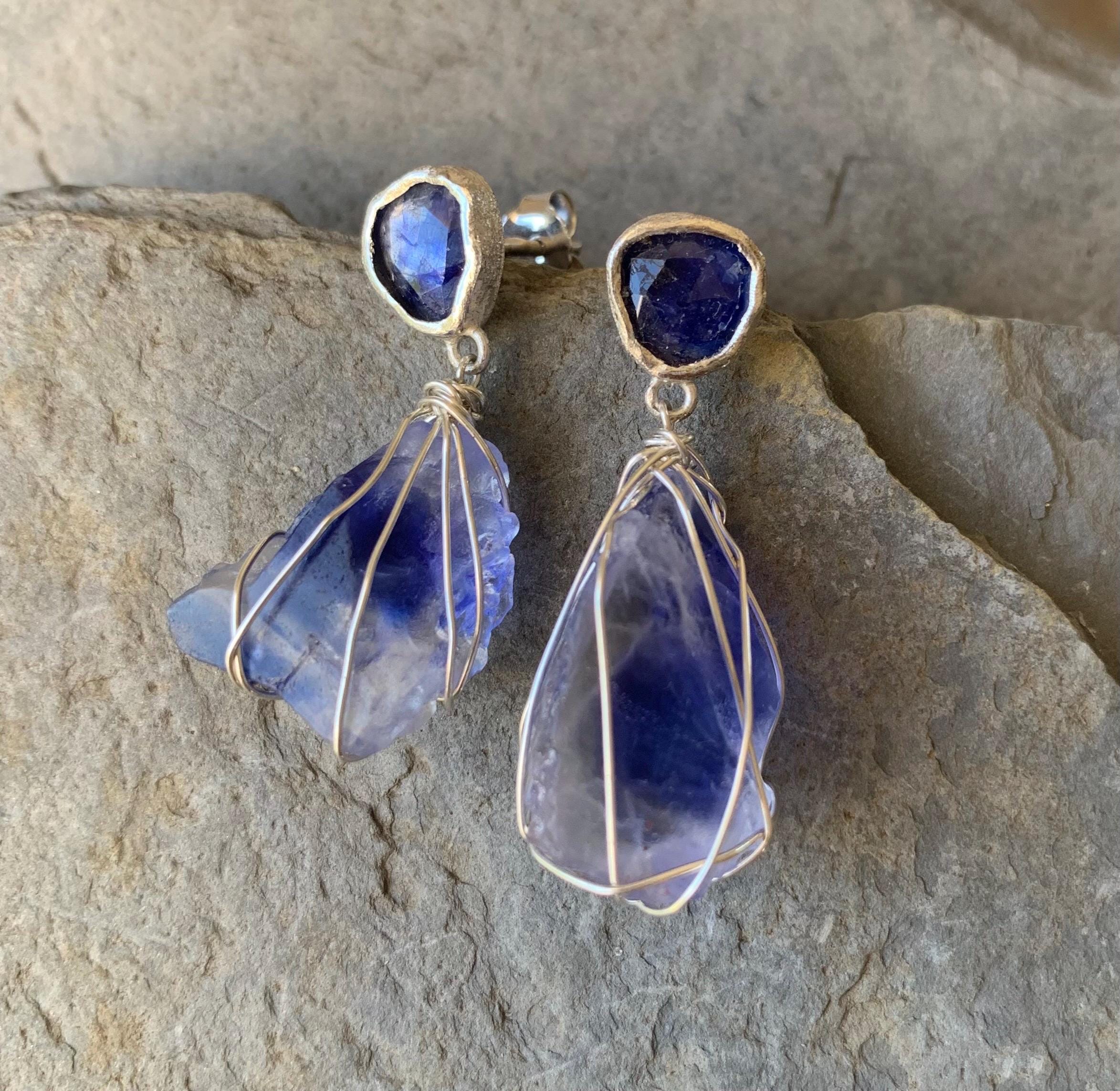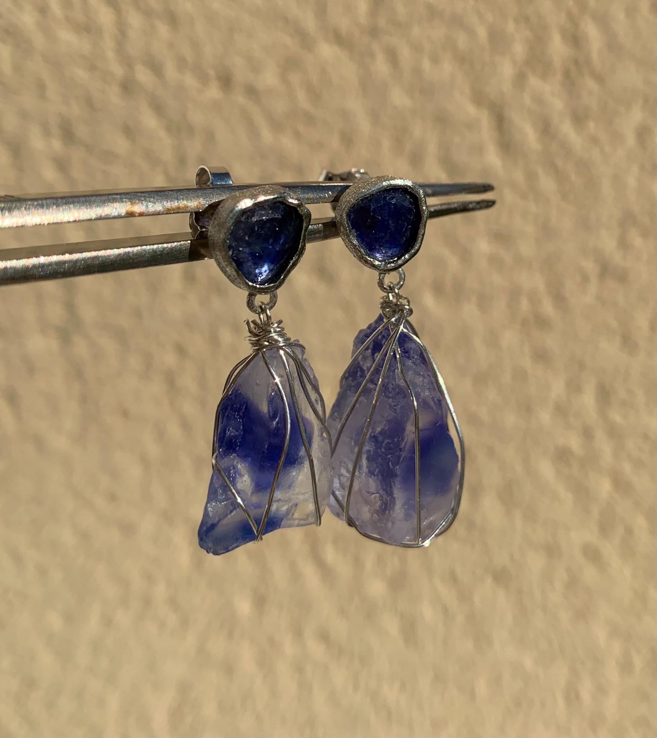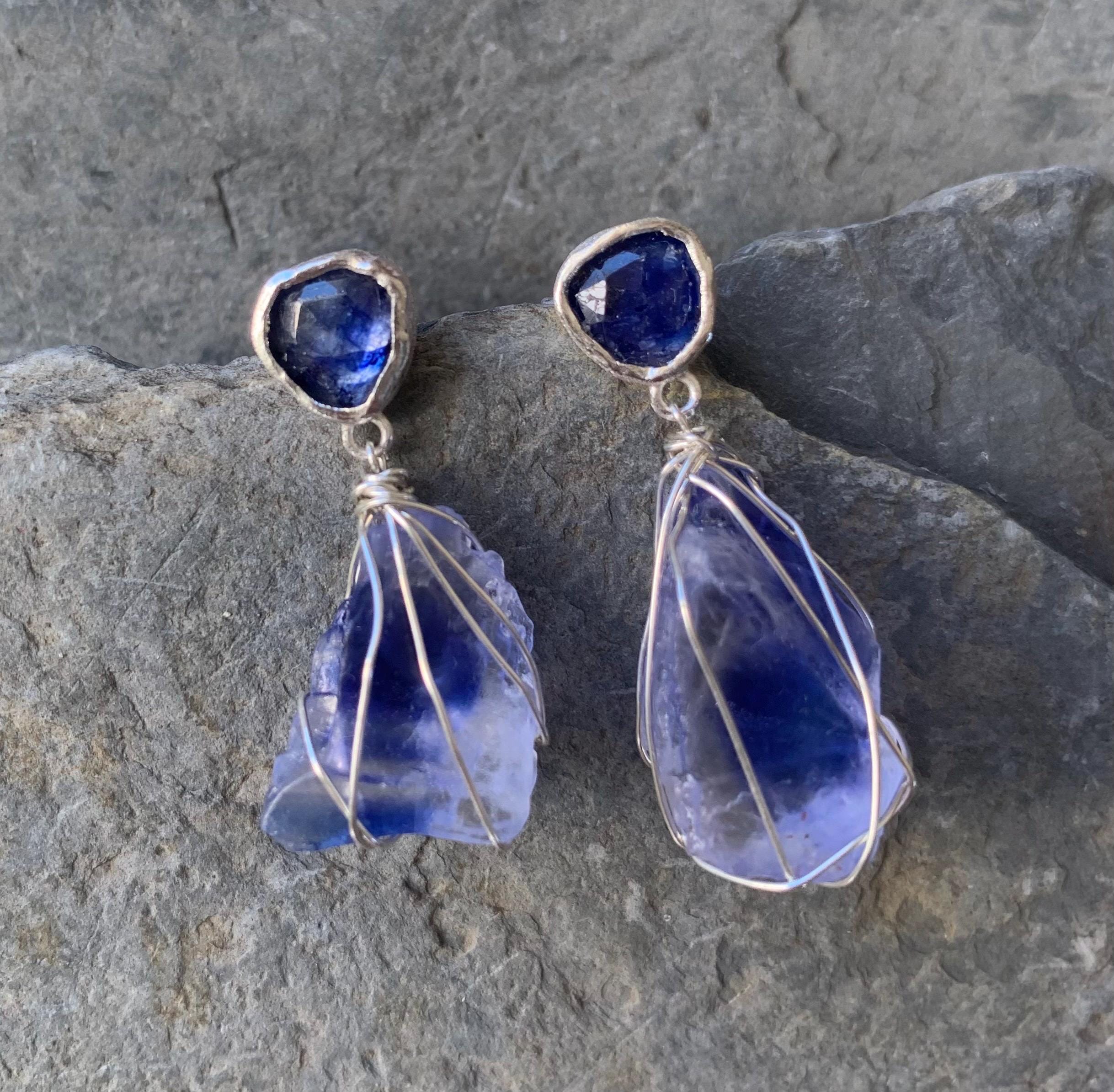 Under the sapphires are hanging 2 rough halits wrapped in silver wire.