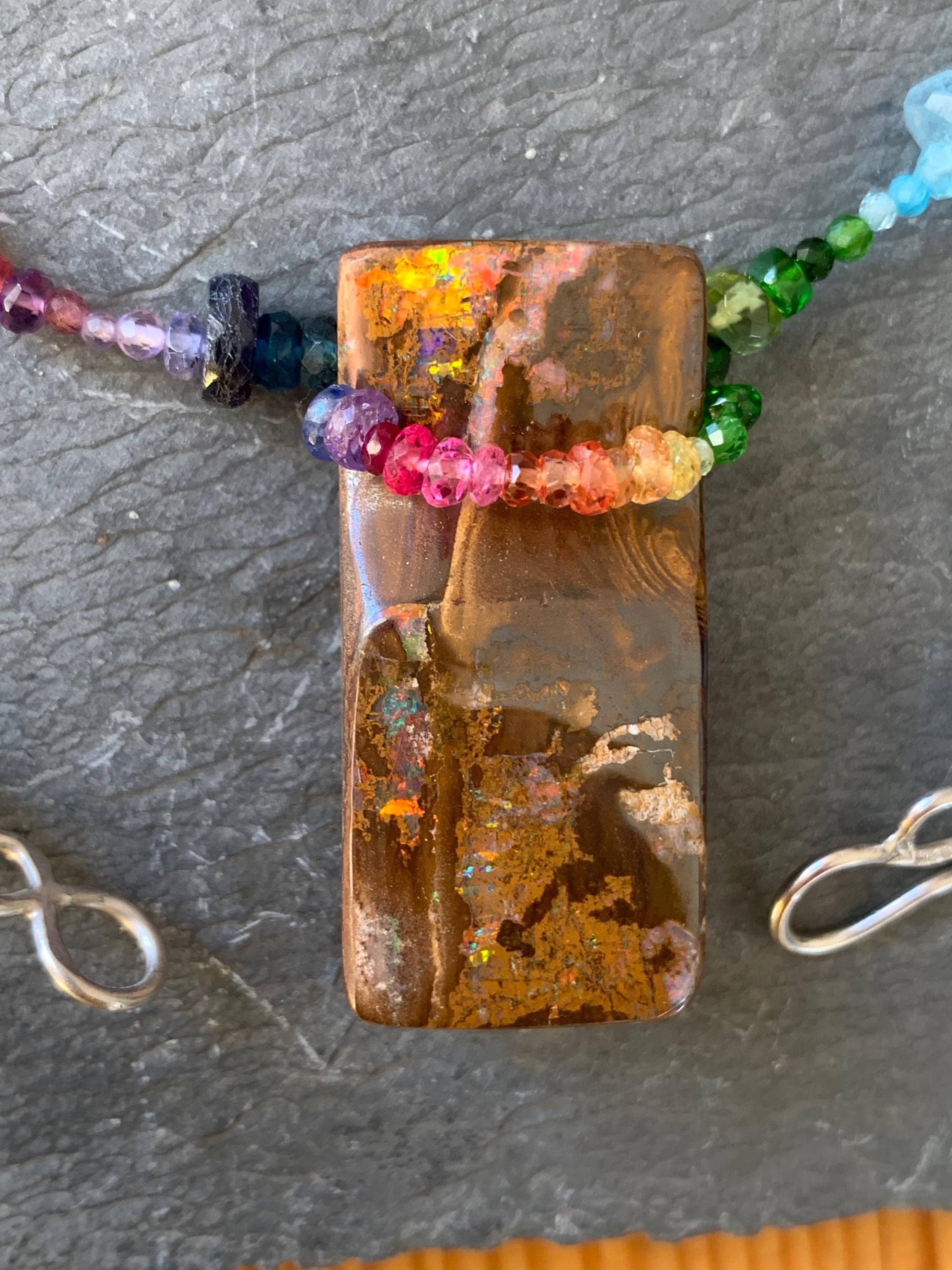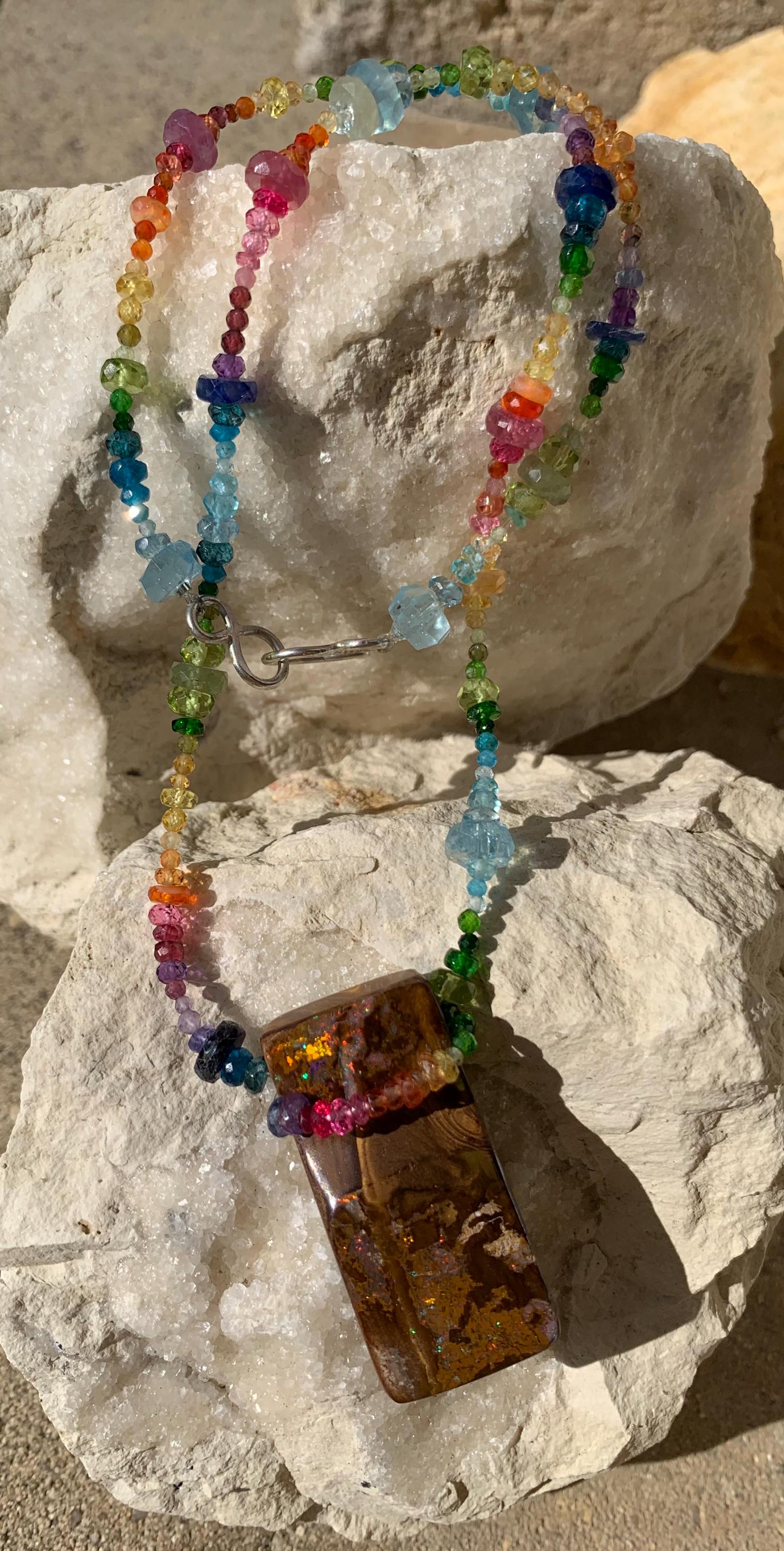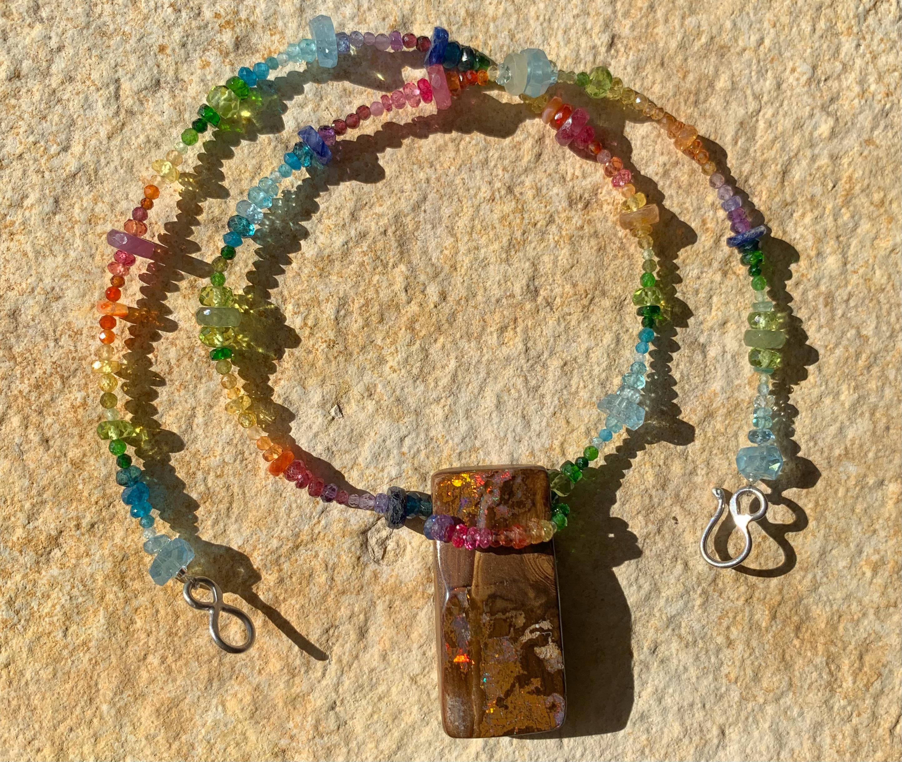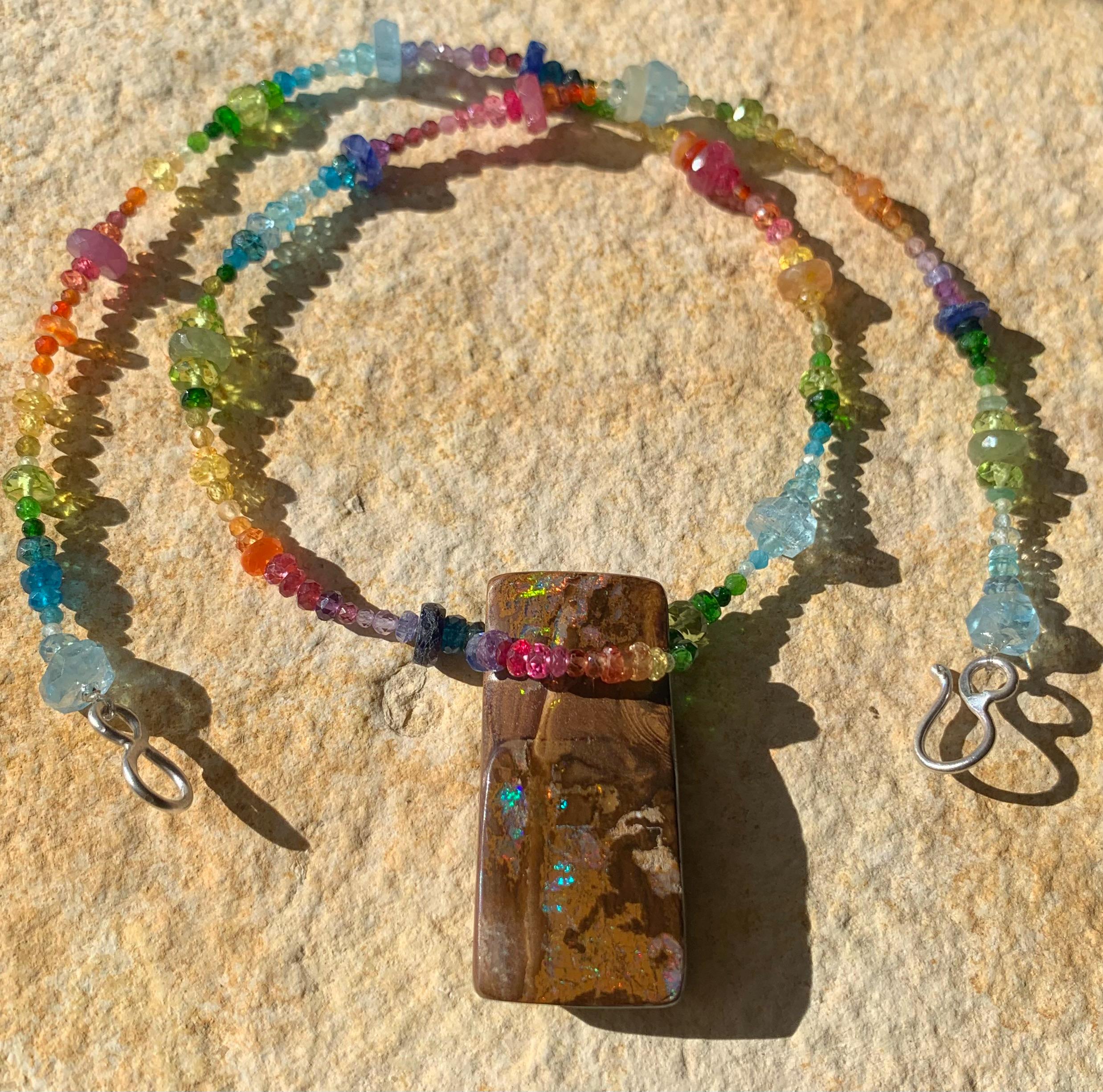 In the middle of the necklace is hanging a big australian, boulder opal with red, orange,yellow and green flashs.