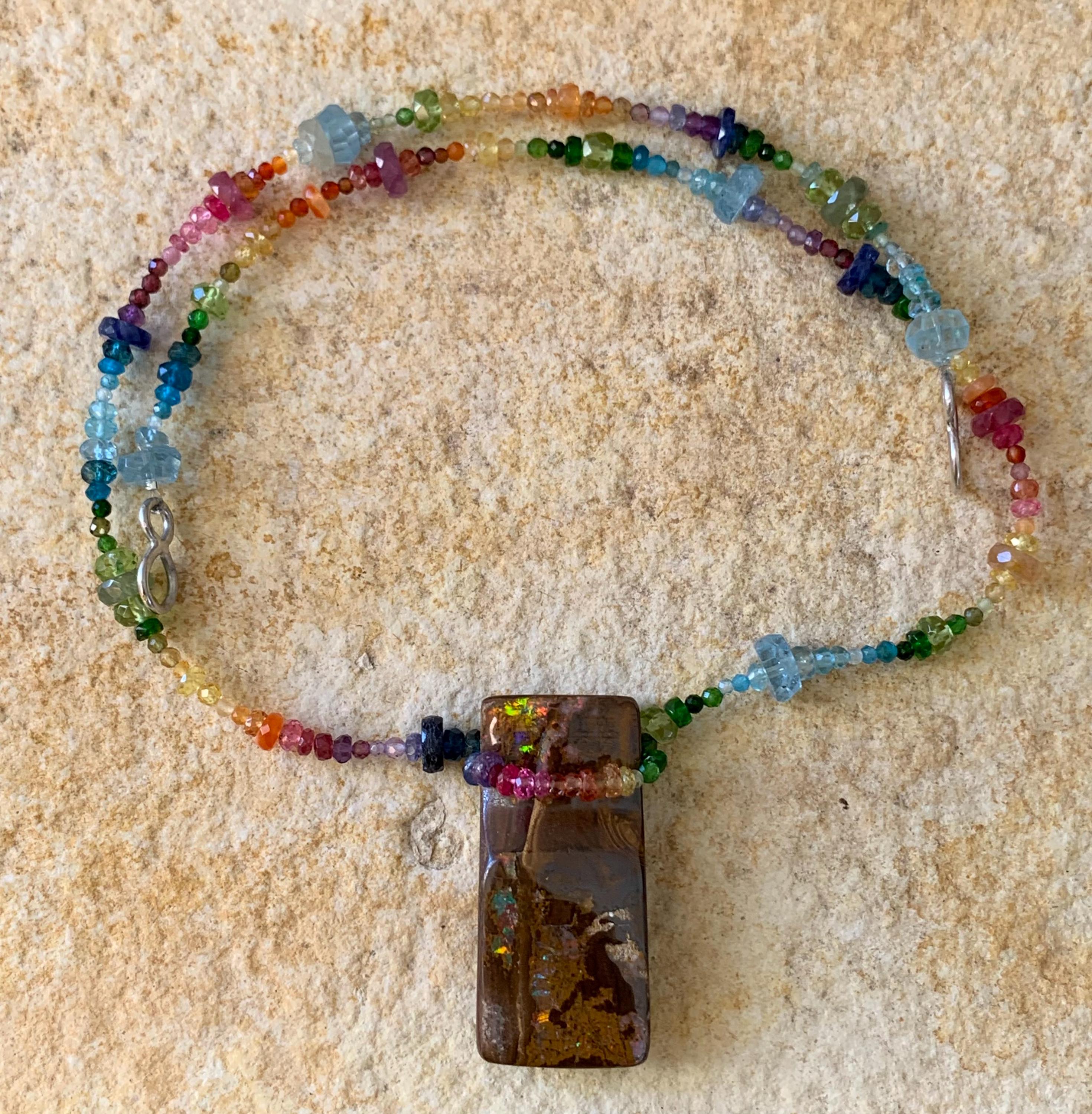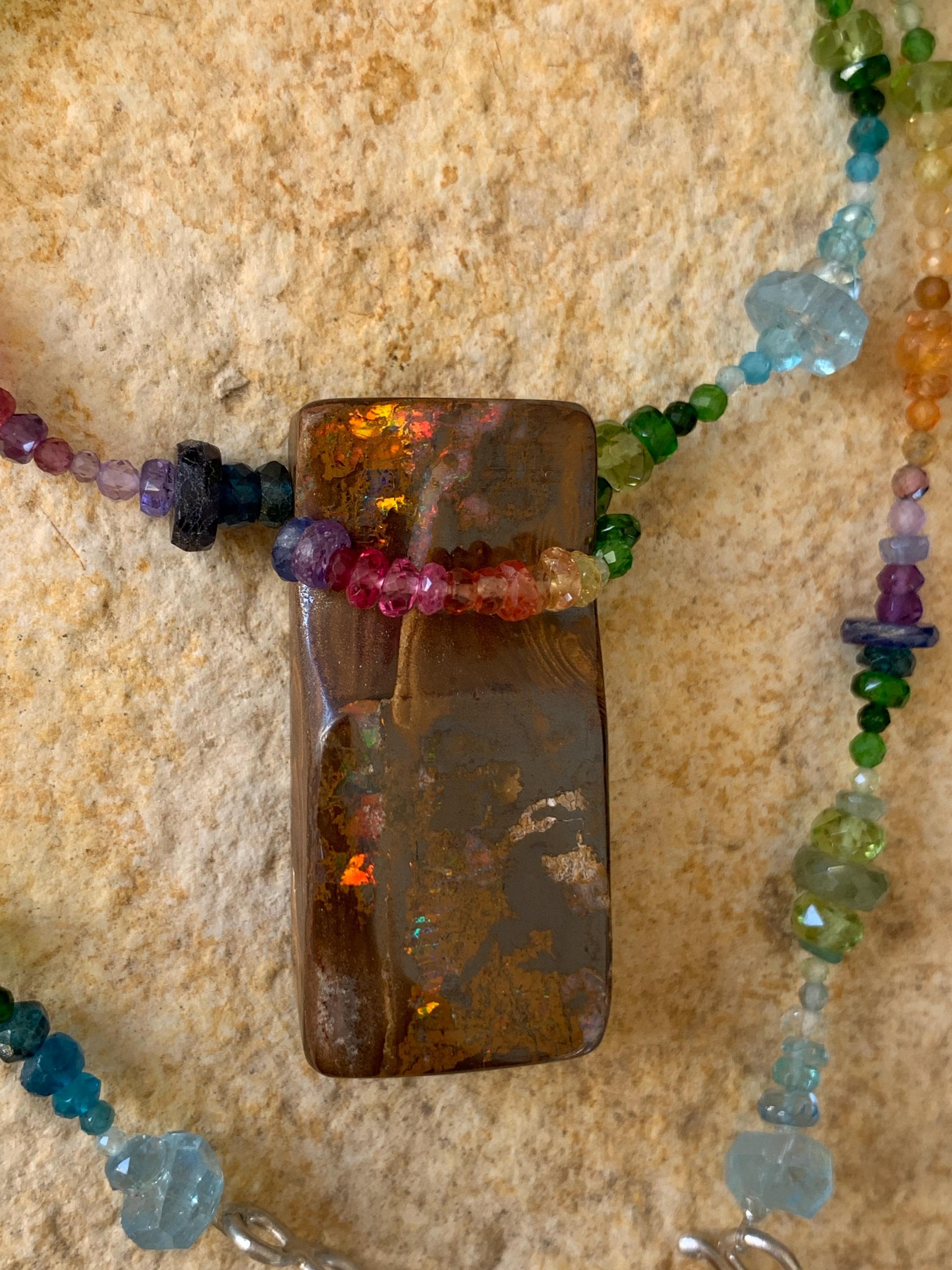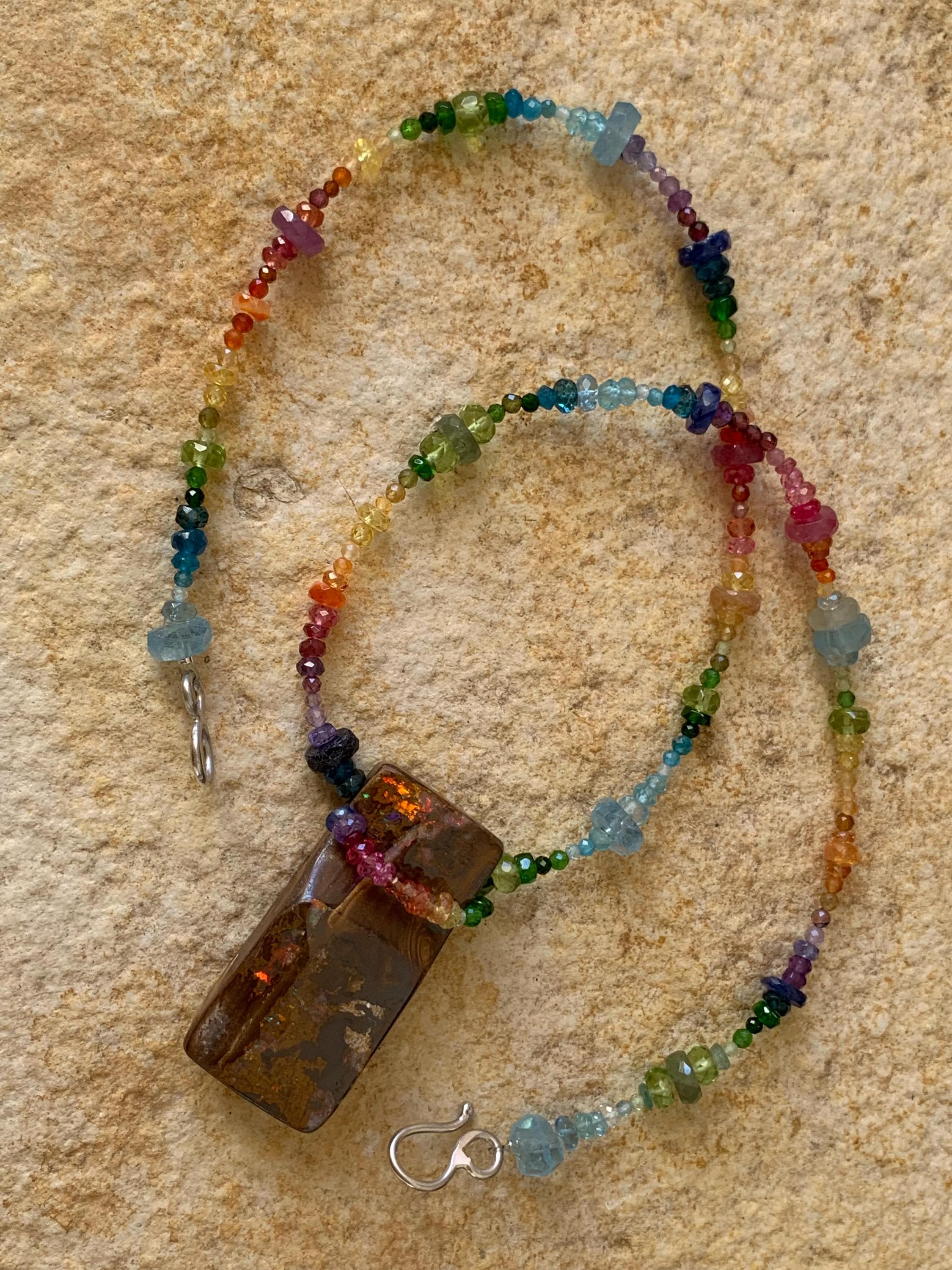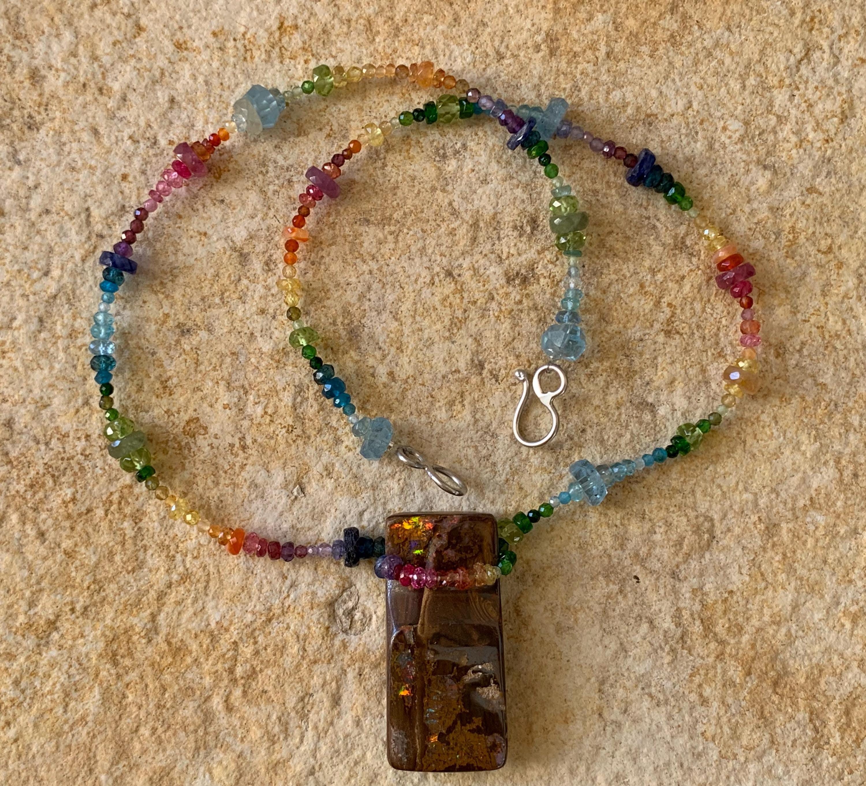In the middle of the necklace is hanging a big australian, boulder opal with red, orange,yellow and green flashs.