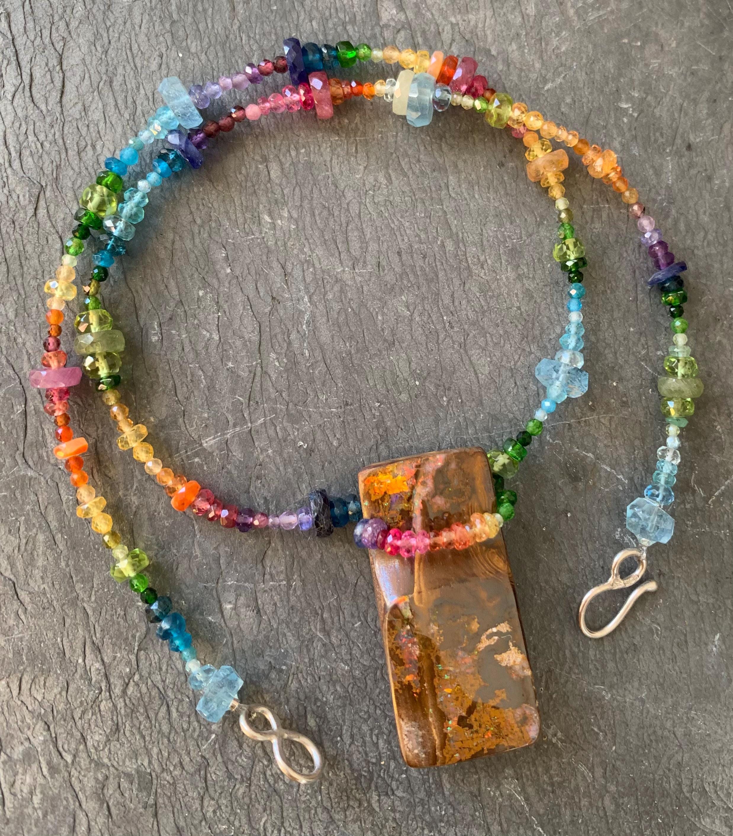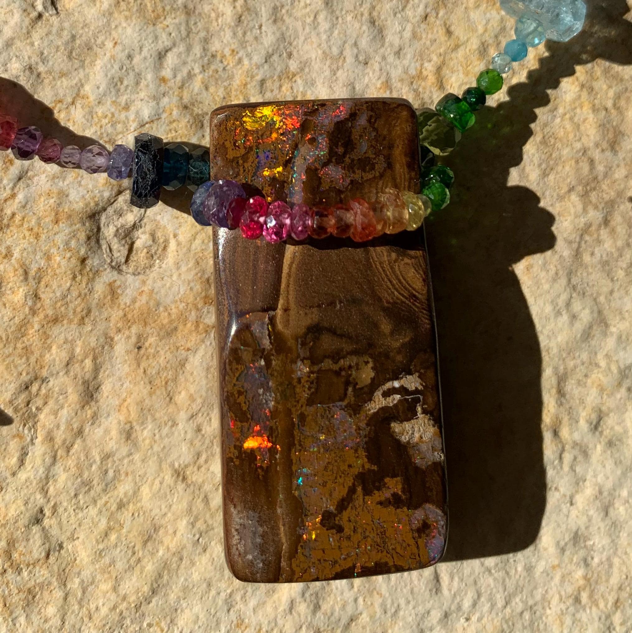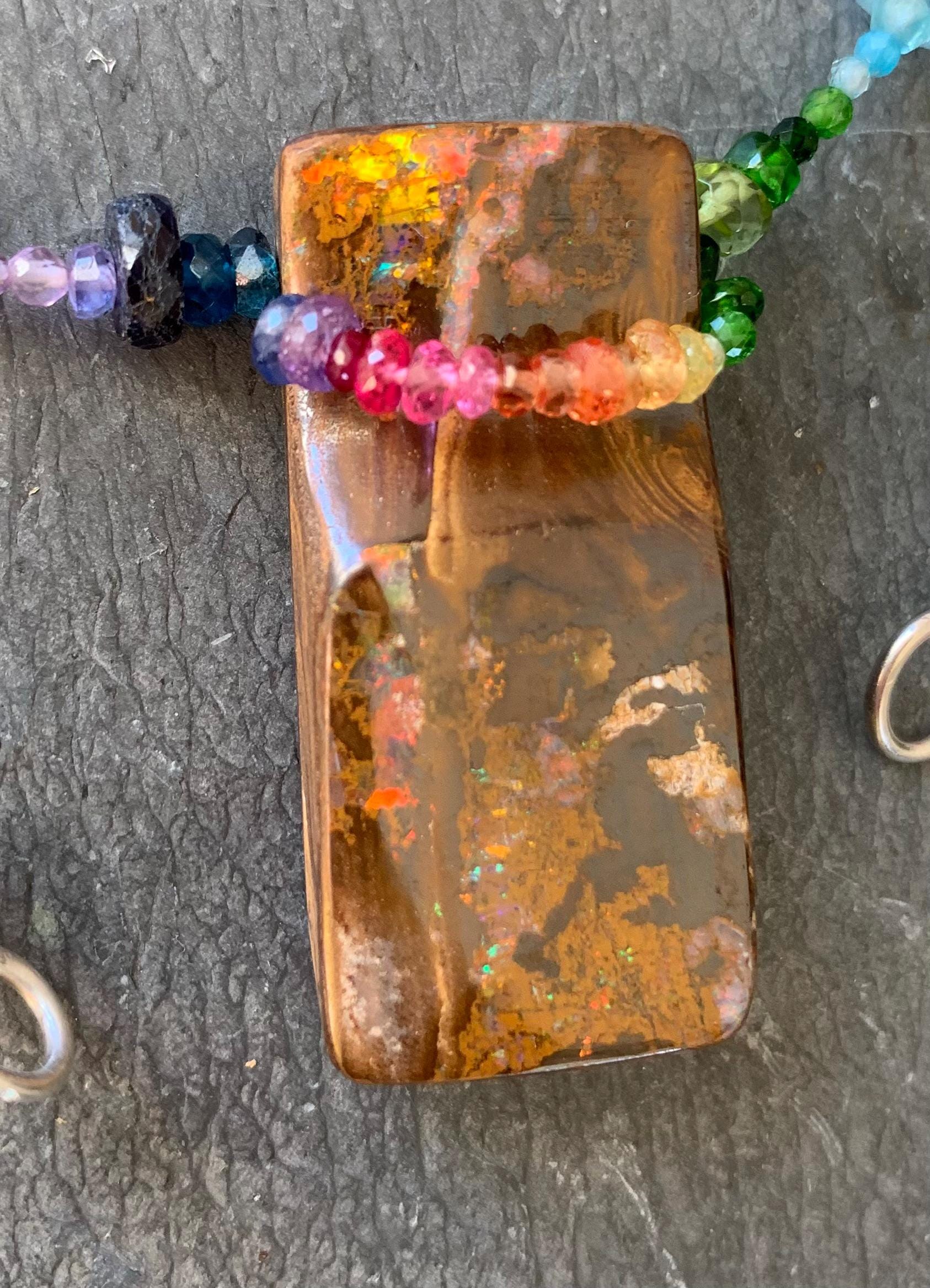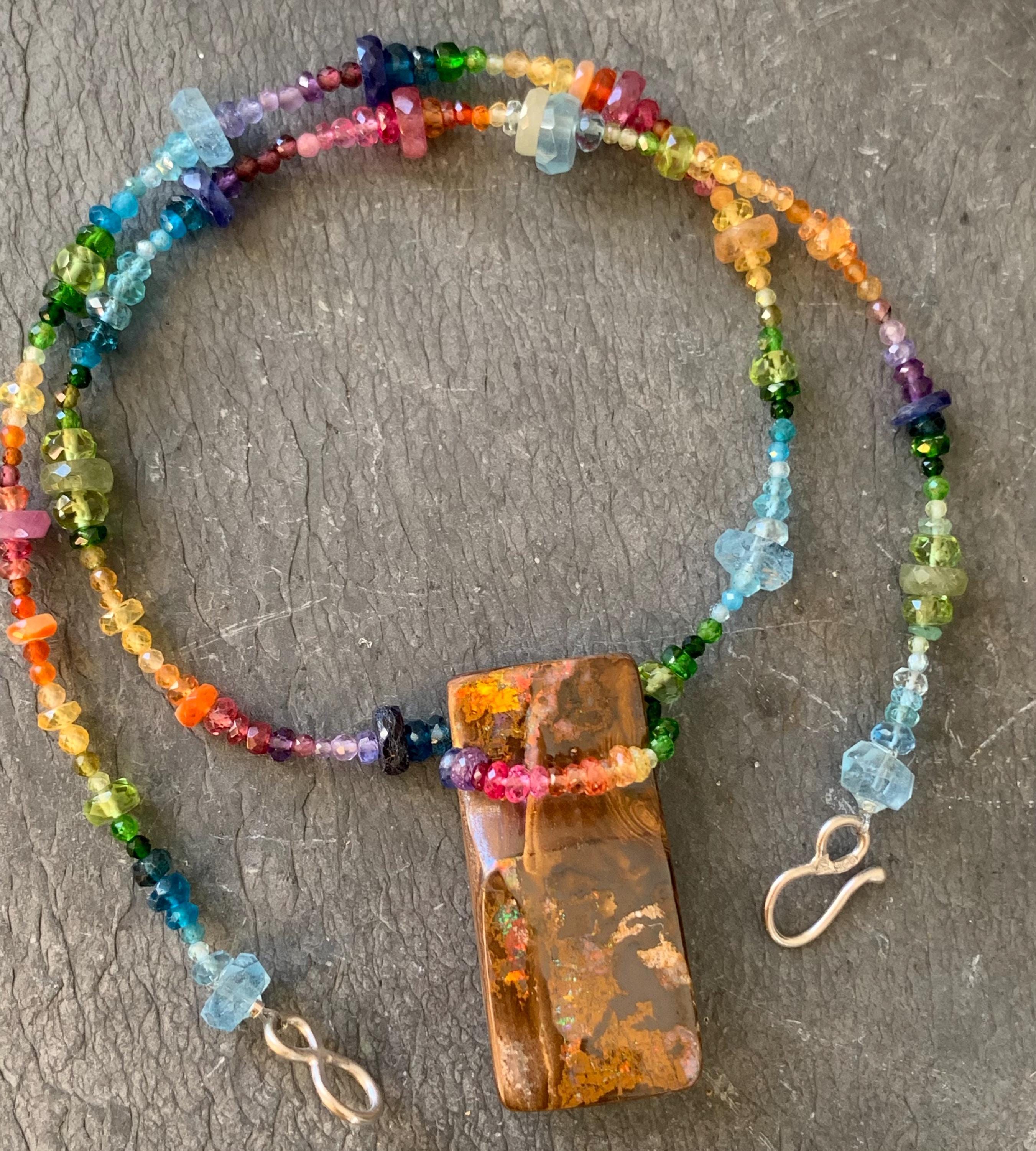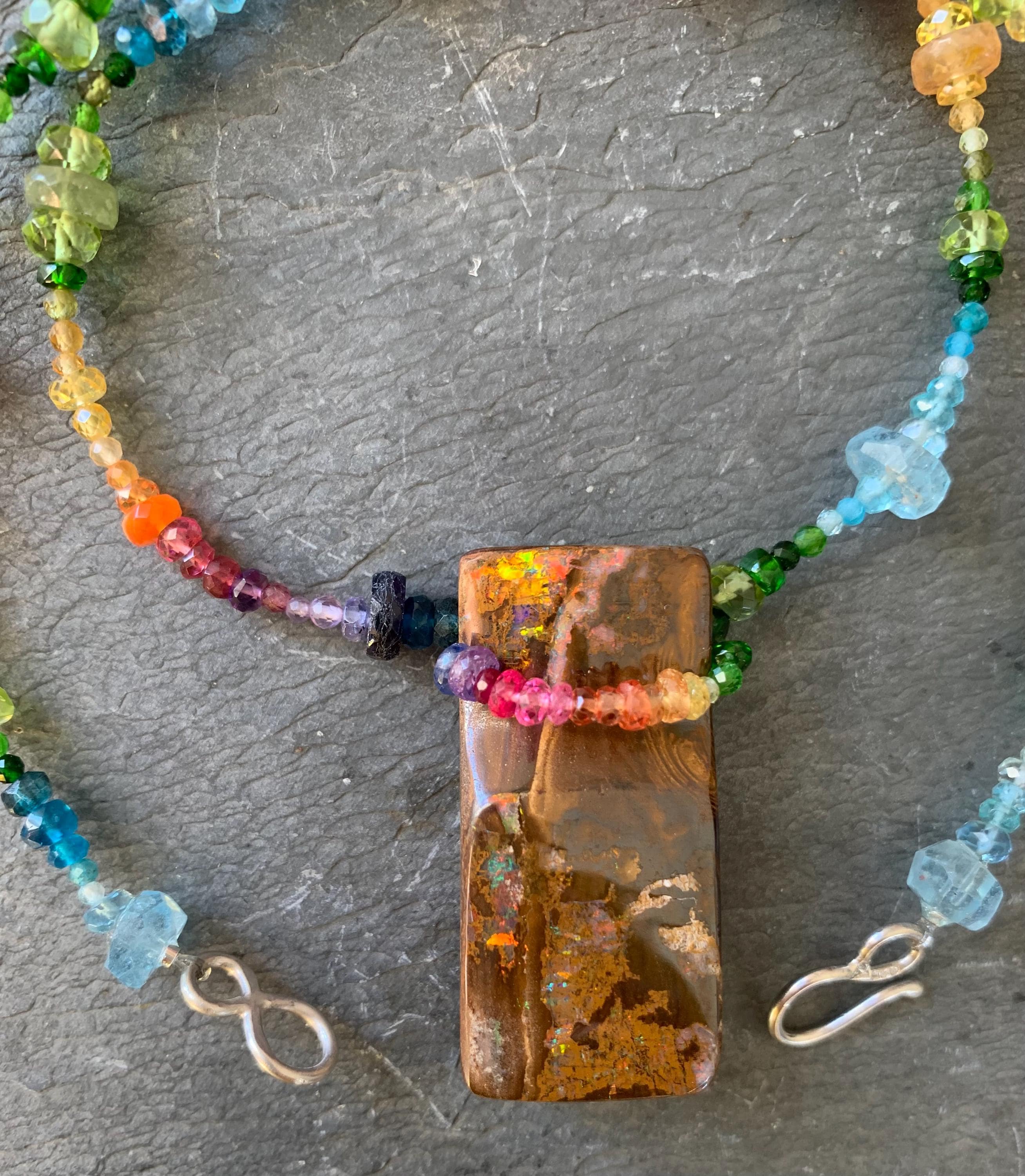 In the middle of the necklace is hanging a big australian, boulder opal with red, orange,yellow and green flashs.