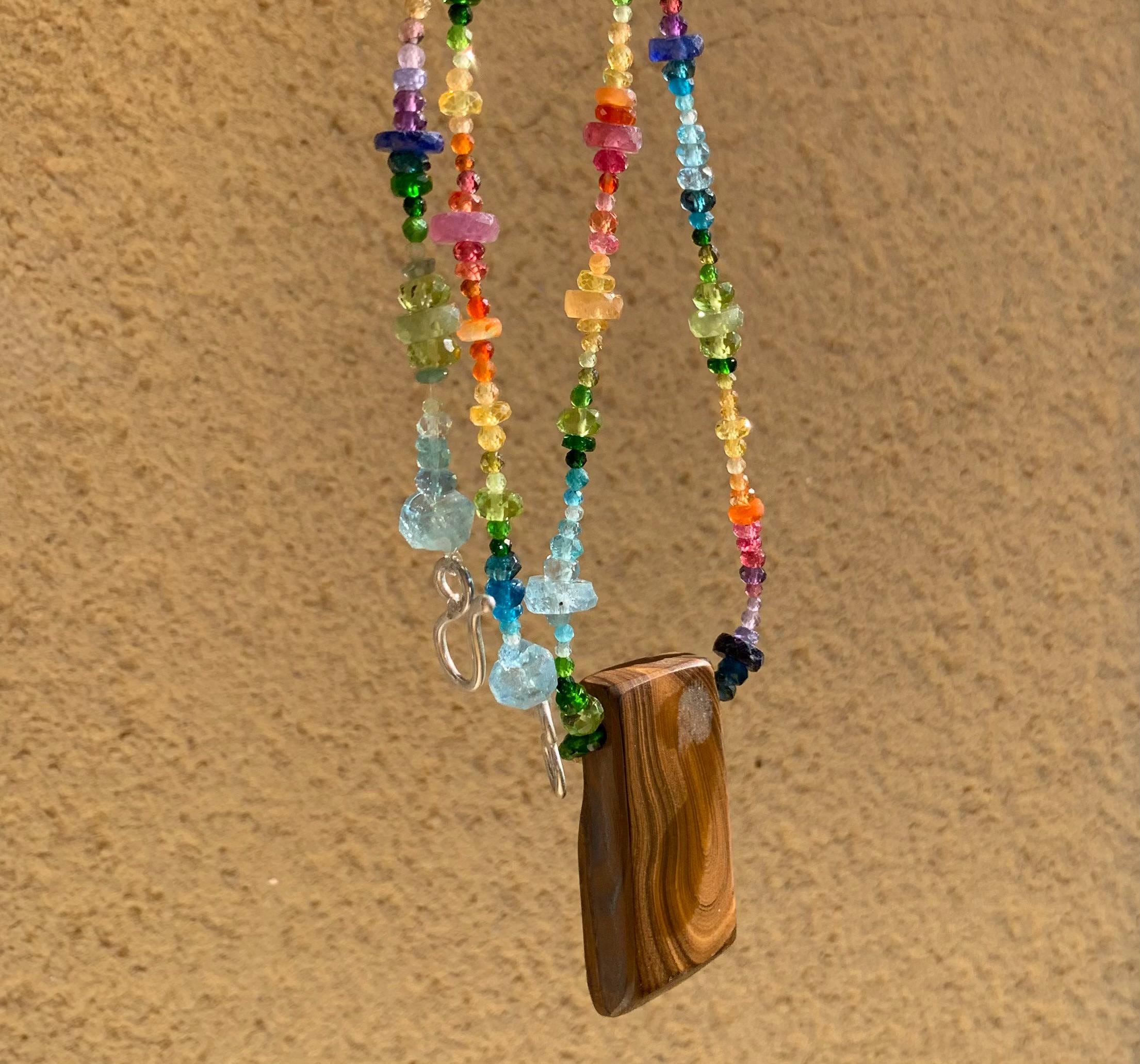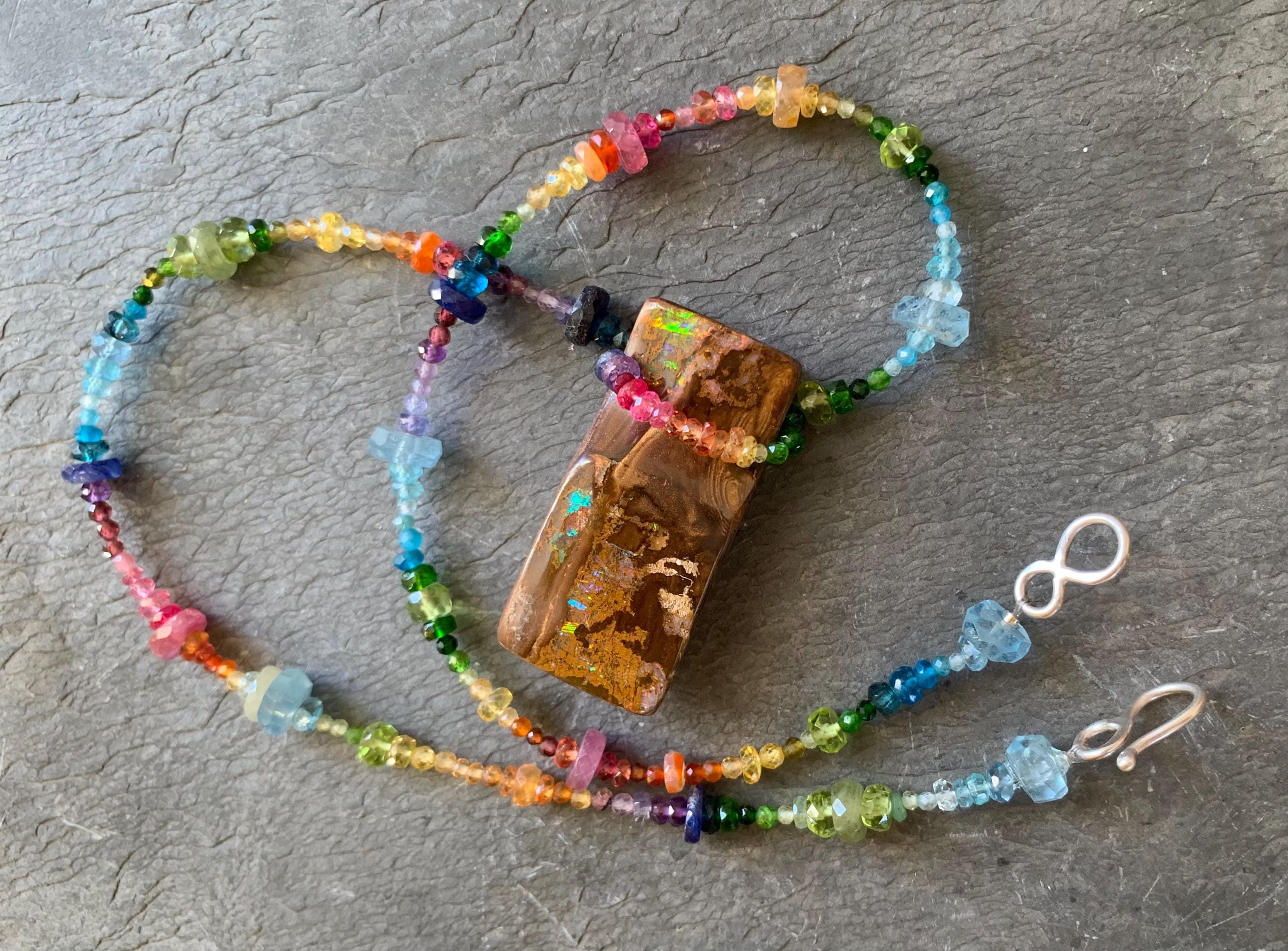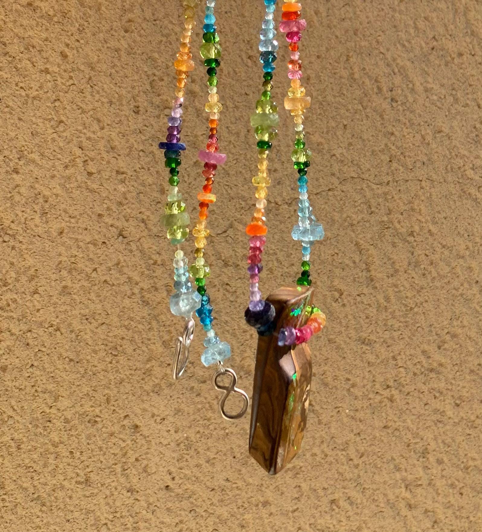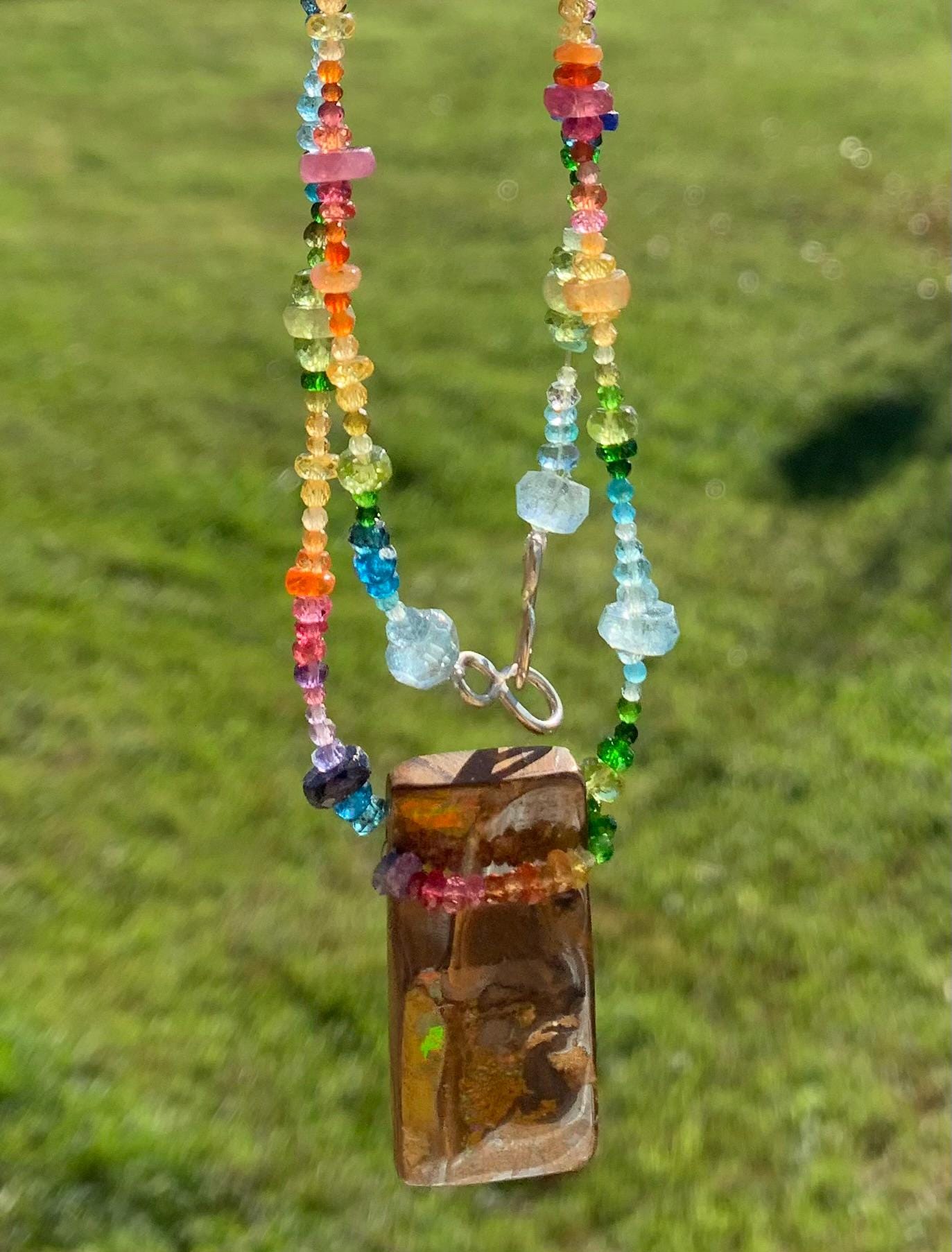 In the middle of the necklace is hanging a big australian, boulder opal with red, orange,yellow and green flashs.