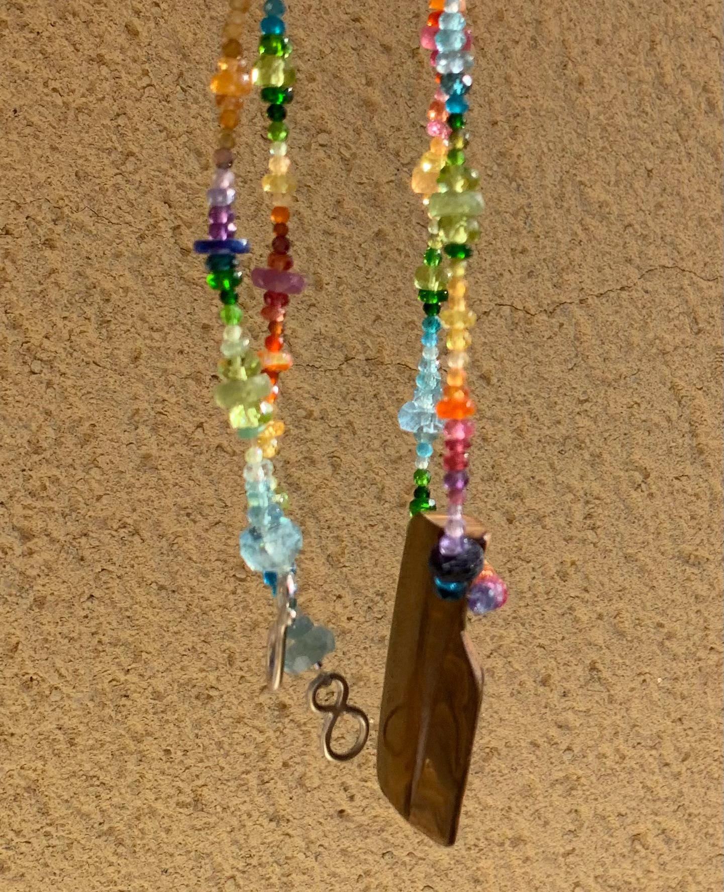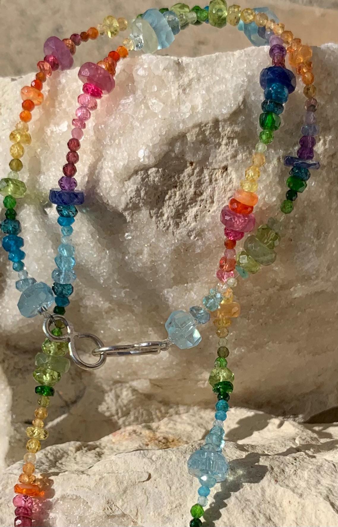 It's done with a handmade silver claps and gemstones ( rose, yellow and blue sapphire, mexikan fire opal, aqua marine, chromdiopside, spinel, ruby, amethysts, péridot and apatite).