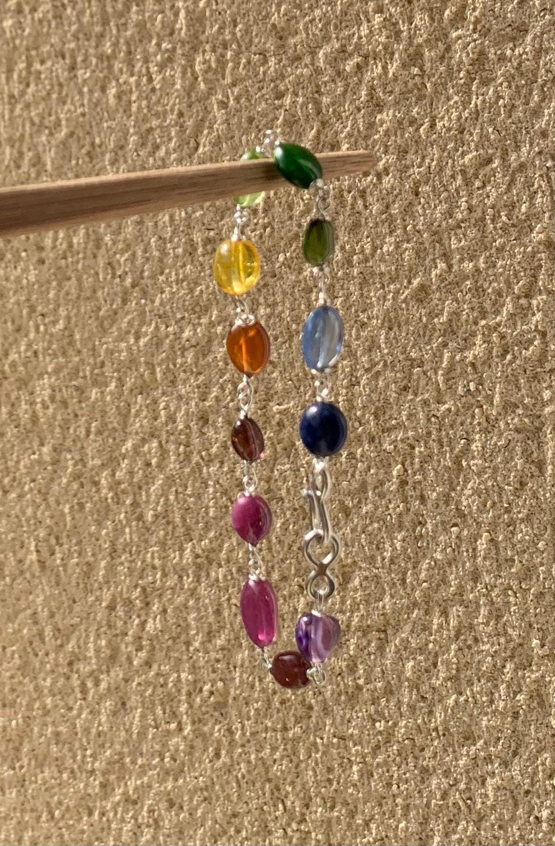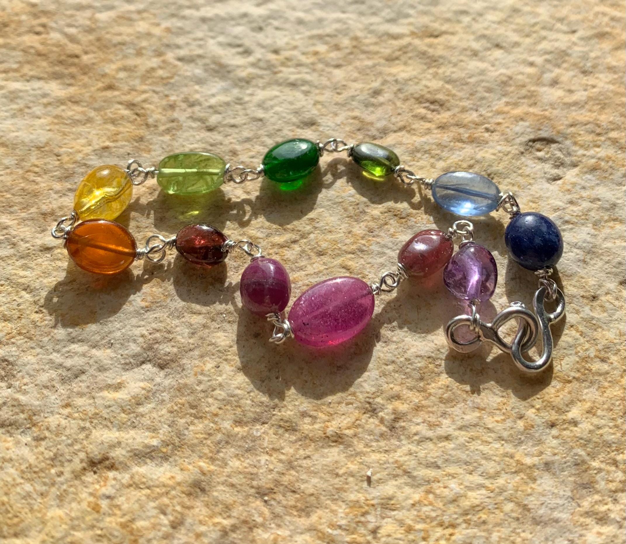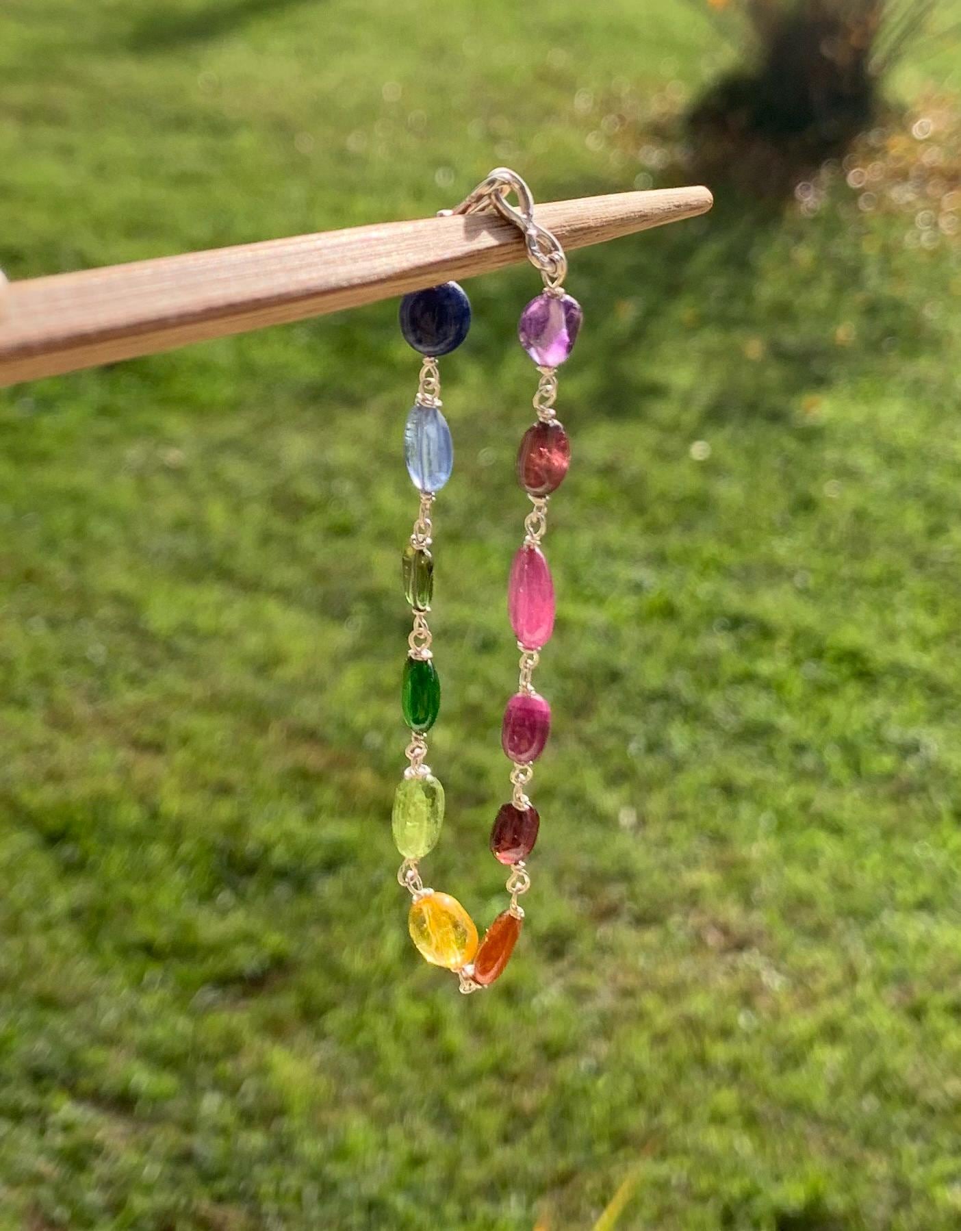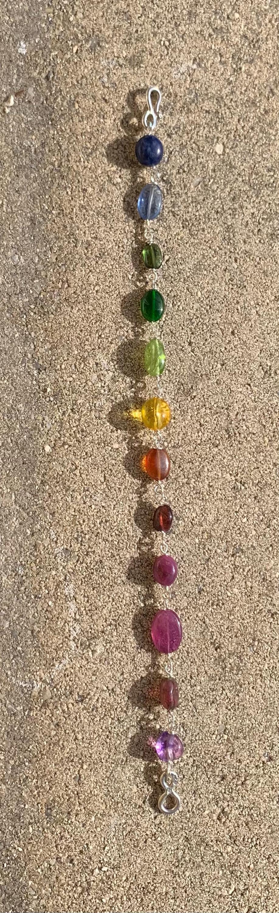It is done with 12 prescious stones ( peridot, prehnit, amethyste, citrine, carnelian, ruby, tourmaline, rose sapphire, cyanite, lapislazuli and garnet ) which are connected with a silver wire.
