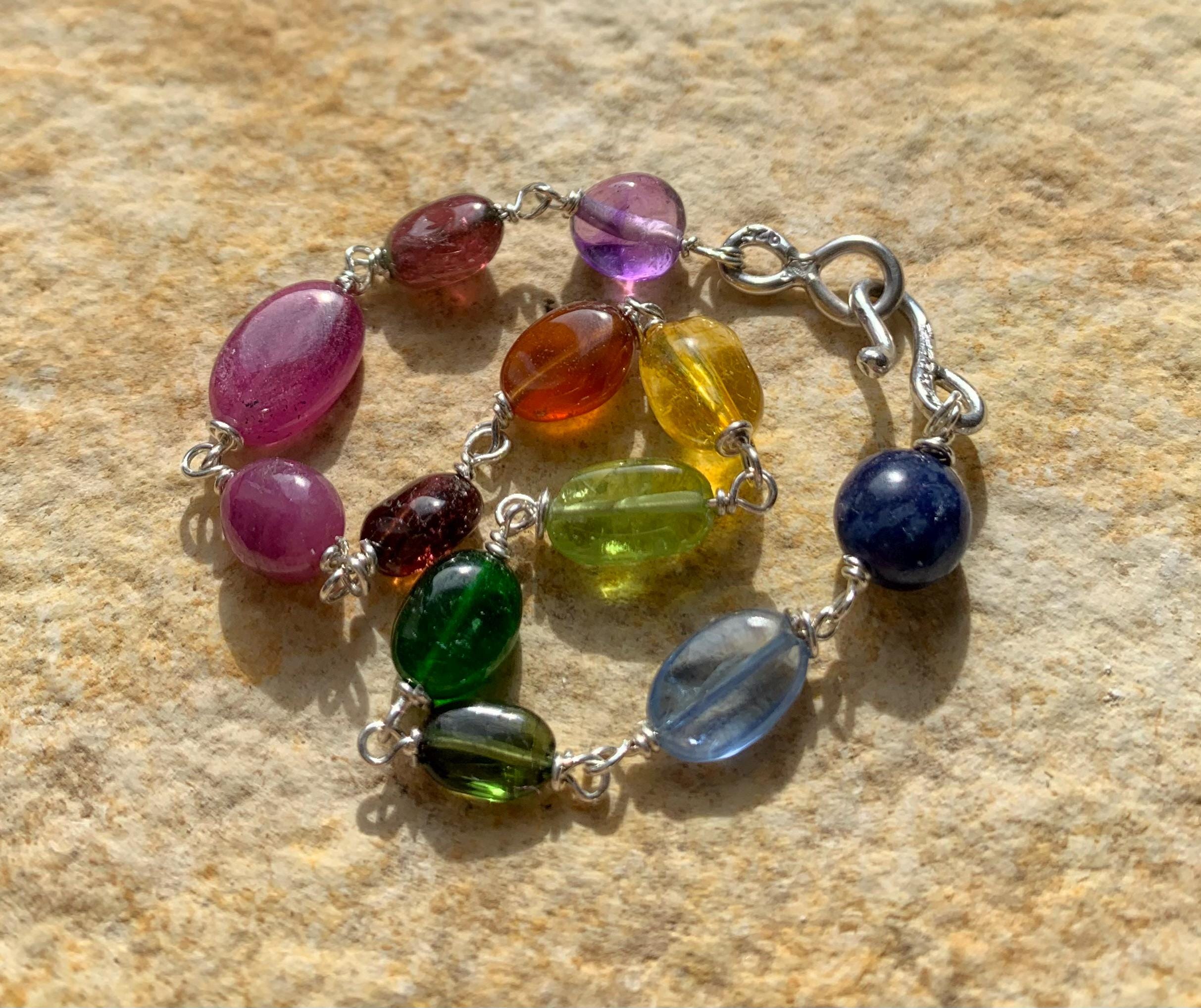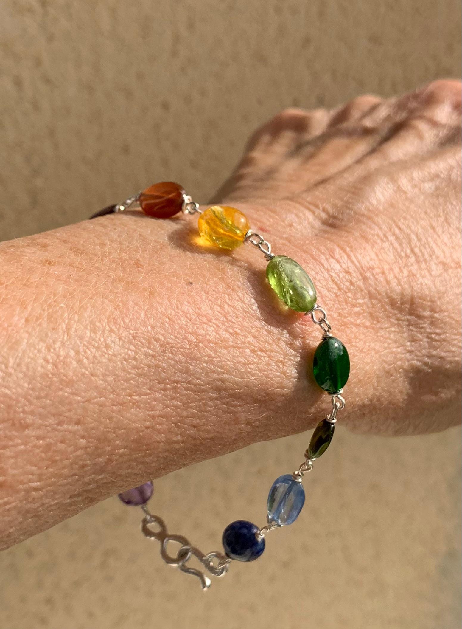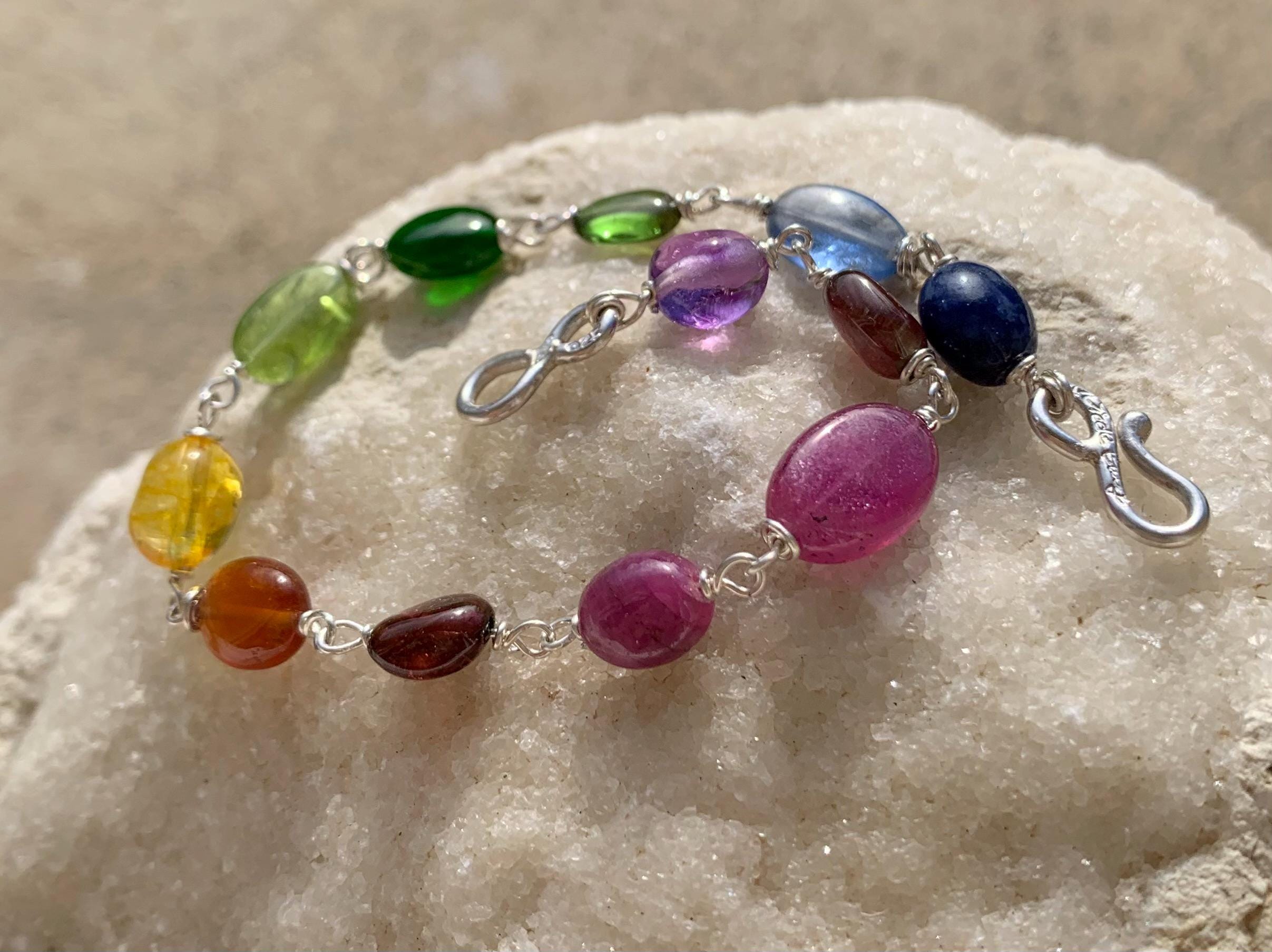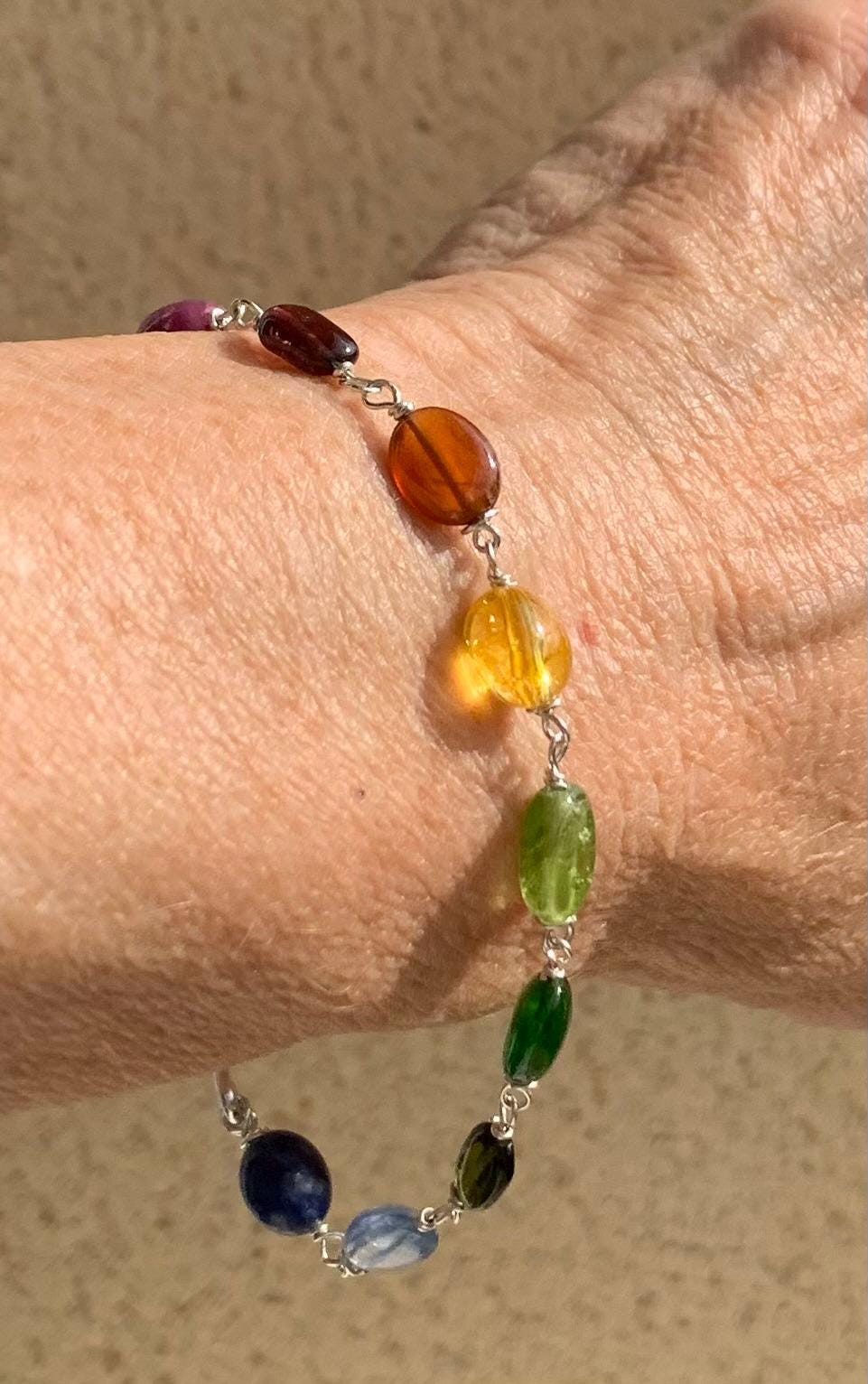 It is done with 12 prescious stones ( peridot, prehnit, amethyste, citrine, carnelian, ruby, tourmaline, rose sapphire, cyanite, lapislazuli and garnet ) which are connected with a silver wire.