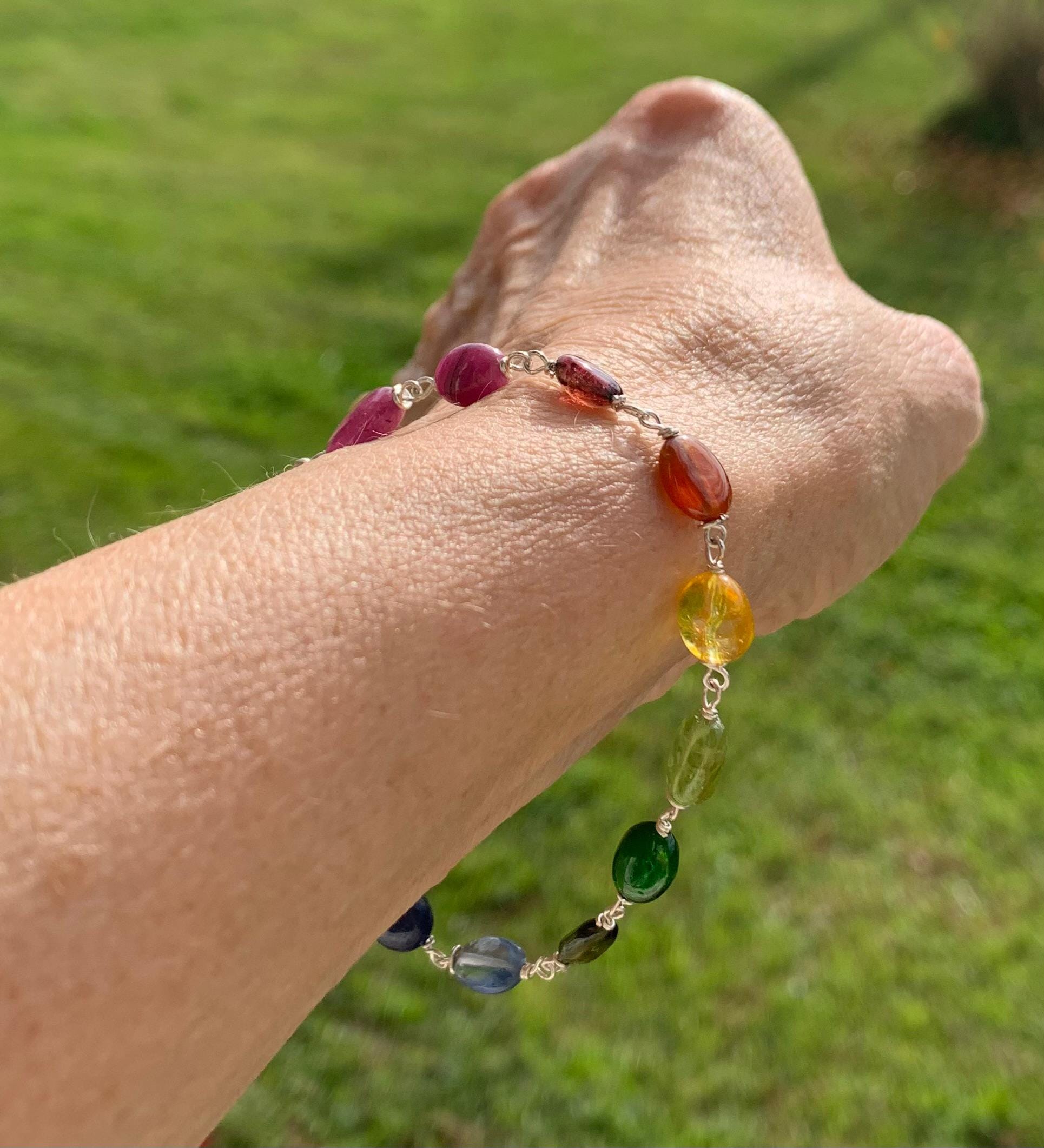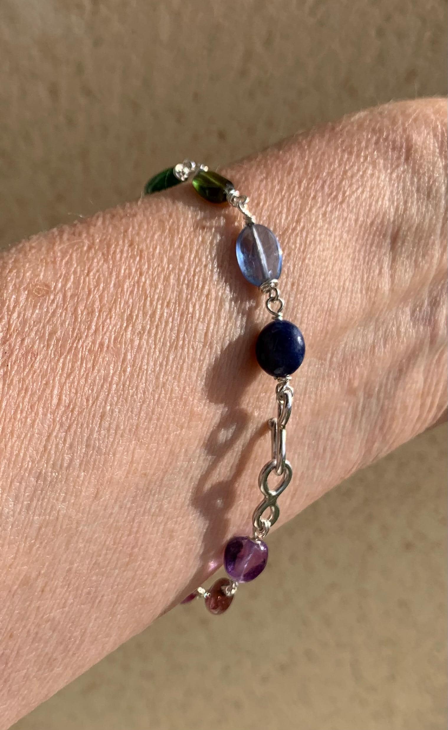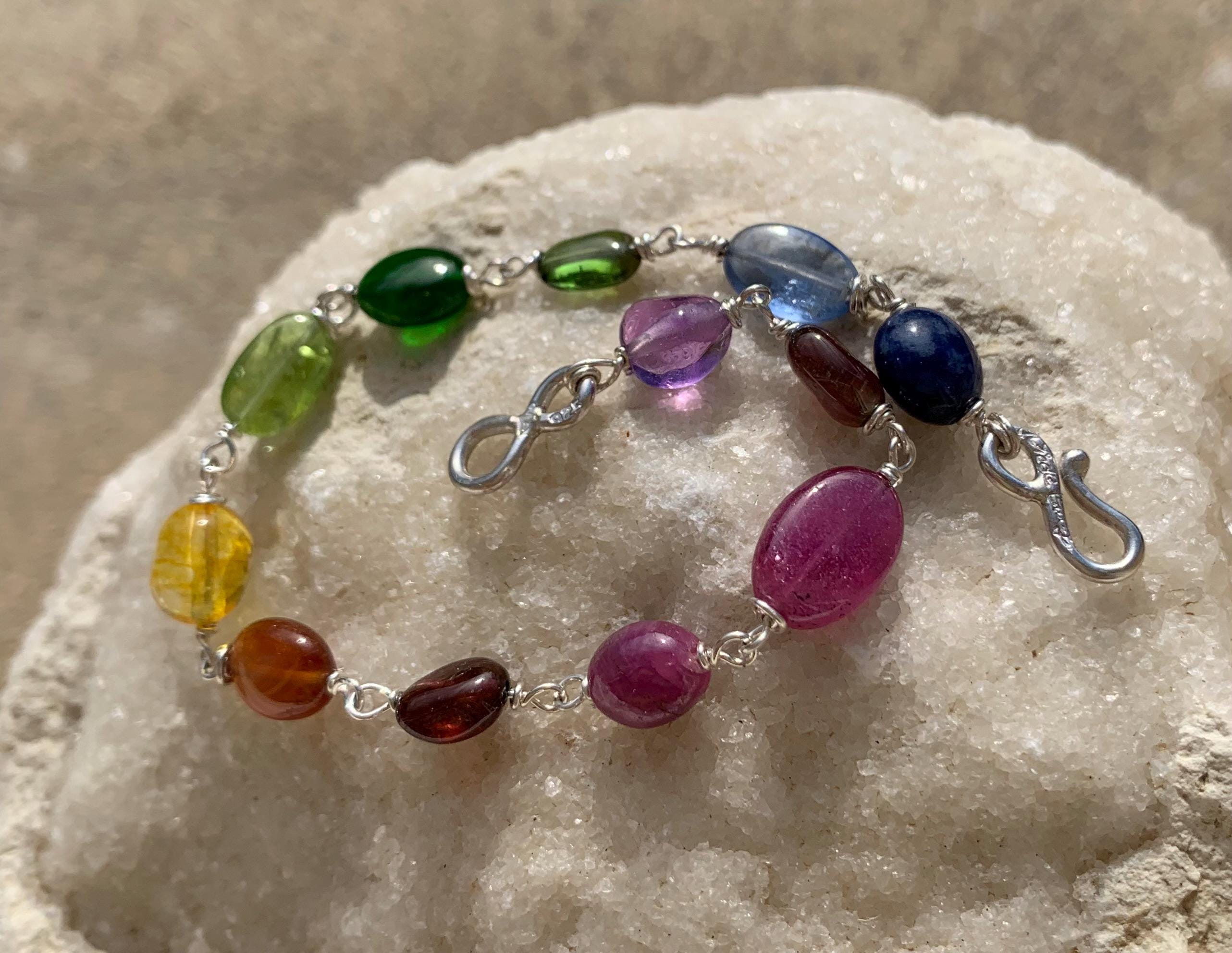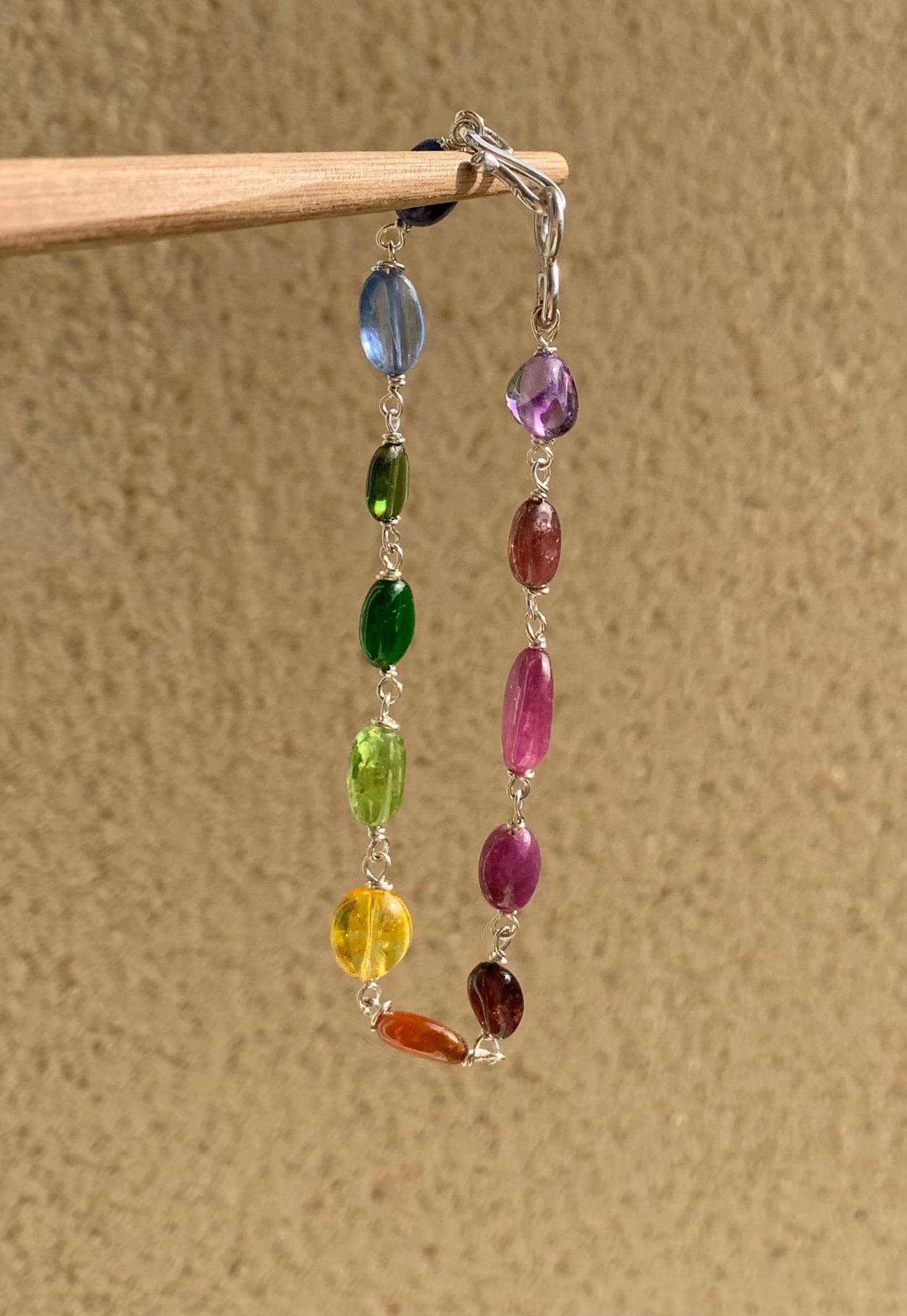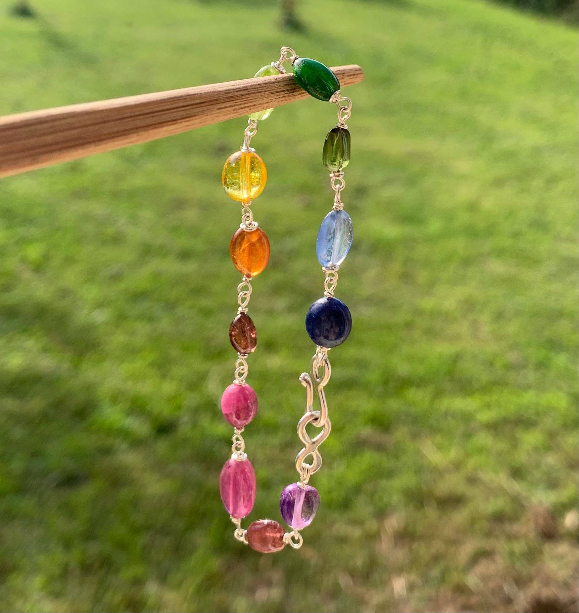 It is done with 12 prescious stones ( peridot, prehnit, amethyste, citrine, carnelian, ruby, tourmaline, rose sapphire, cyanite, lapislazuli and garnet ) which are connected with a silver wire.