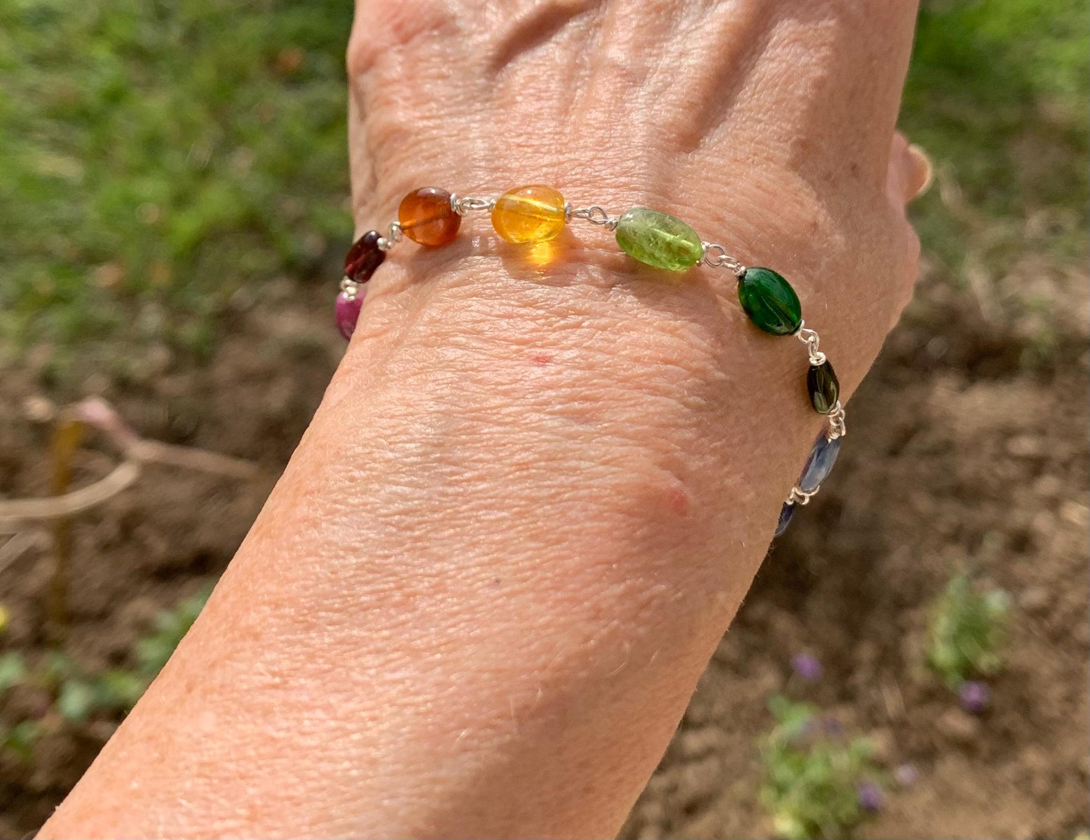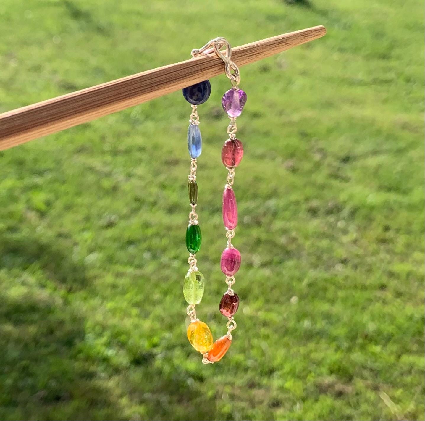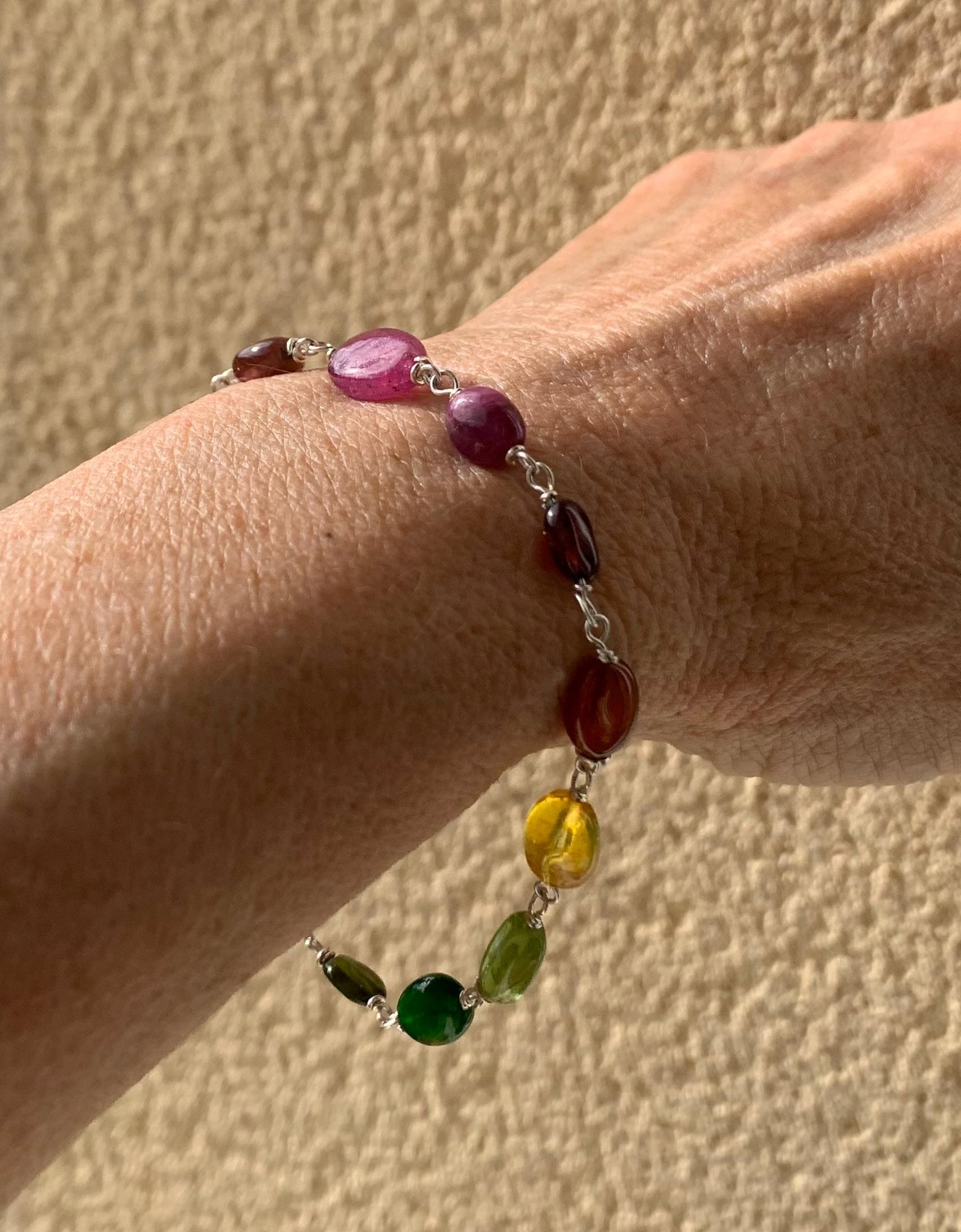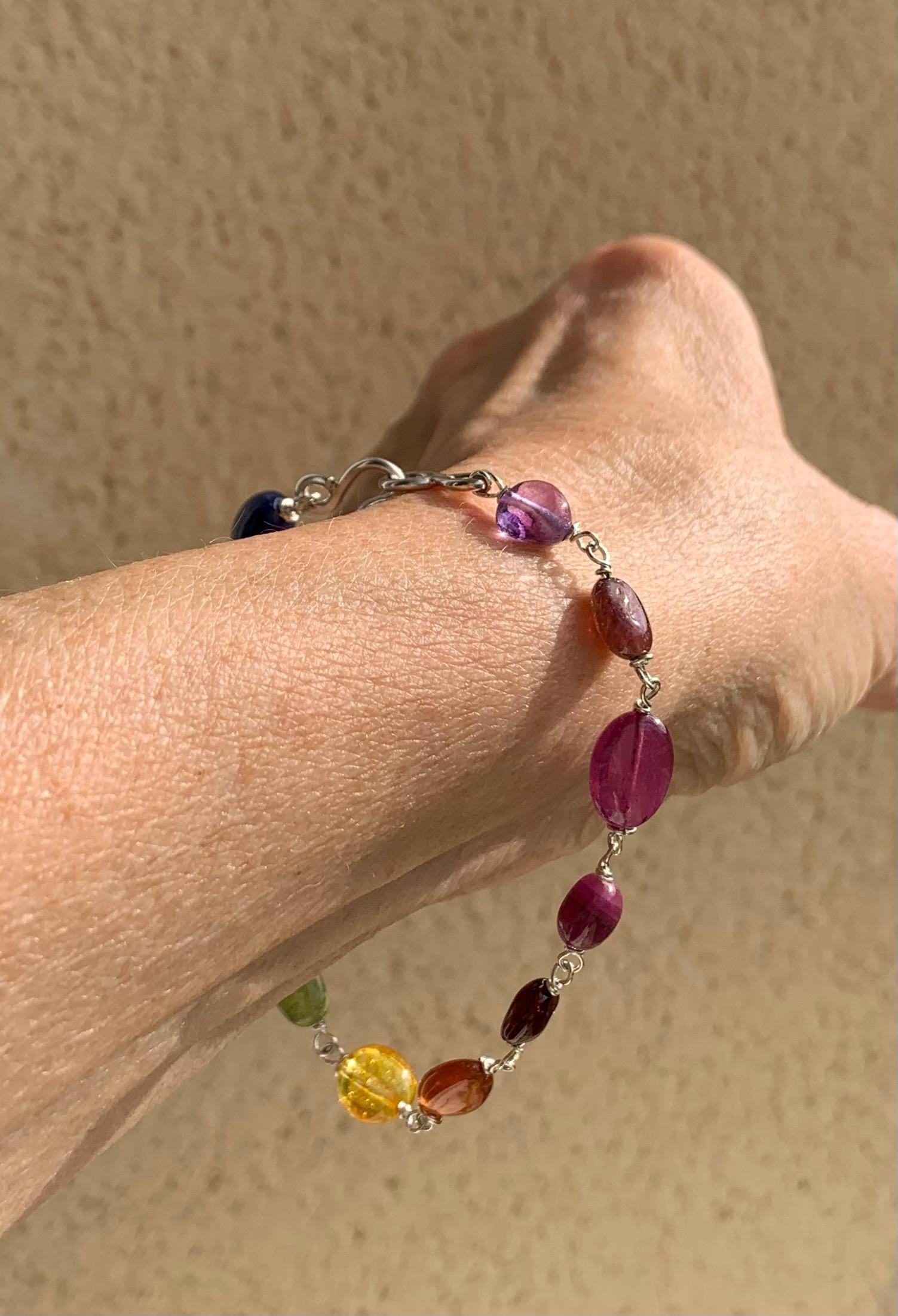 It is done with 12 prescious stones ( peridot, prehnit, amethyste, citrine, carnelian, ruby, tourmaline, rose sapphire, cyanite, lapislazuli and garnet ) which are connected with a silver wire.