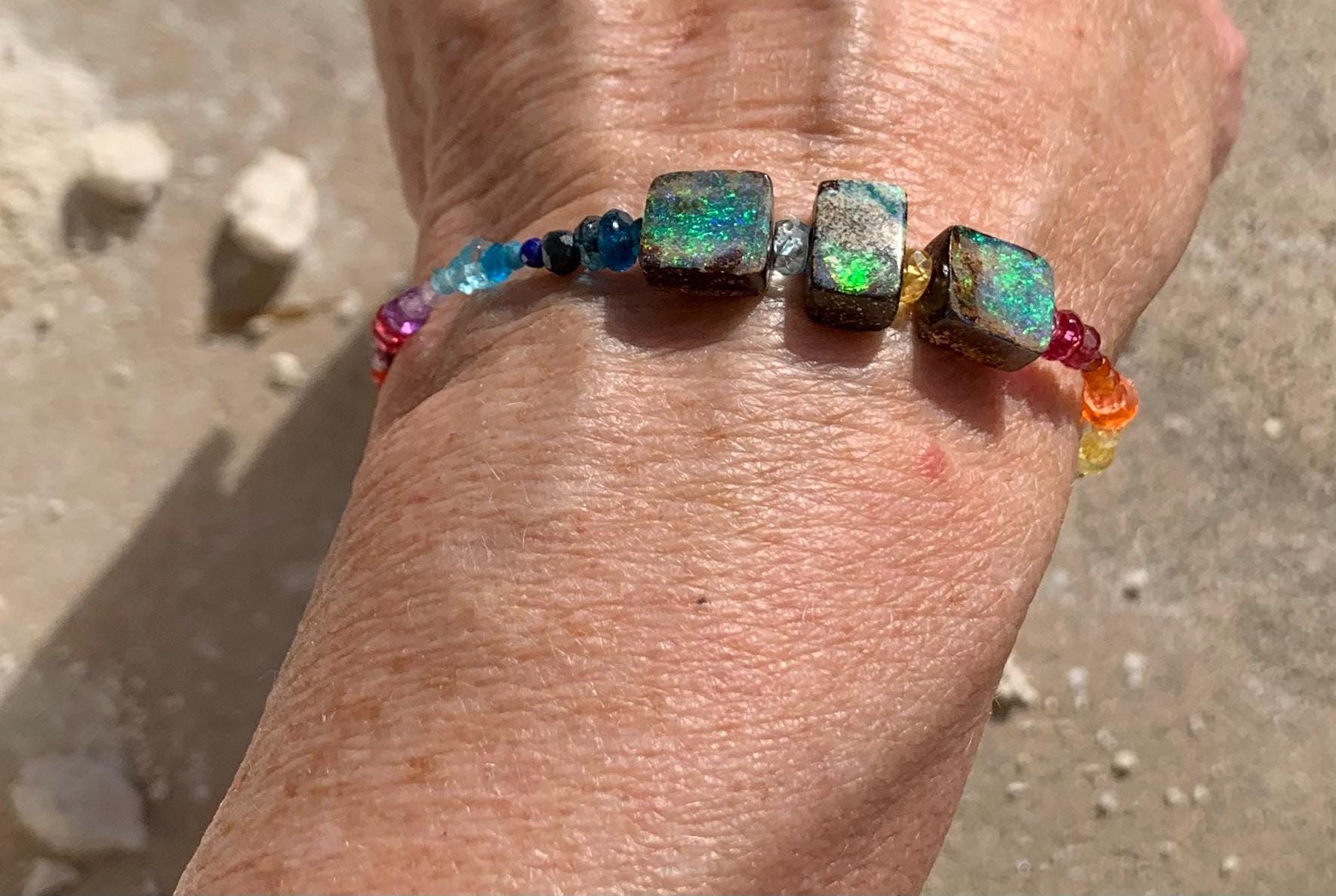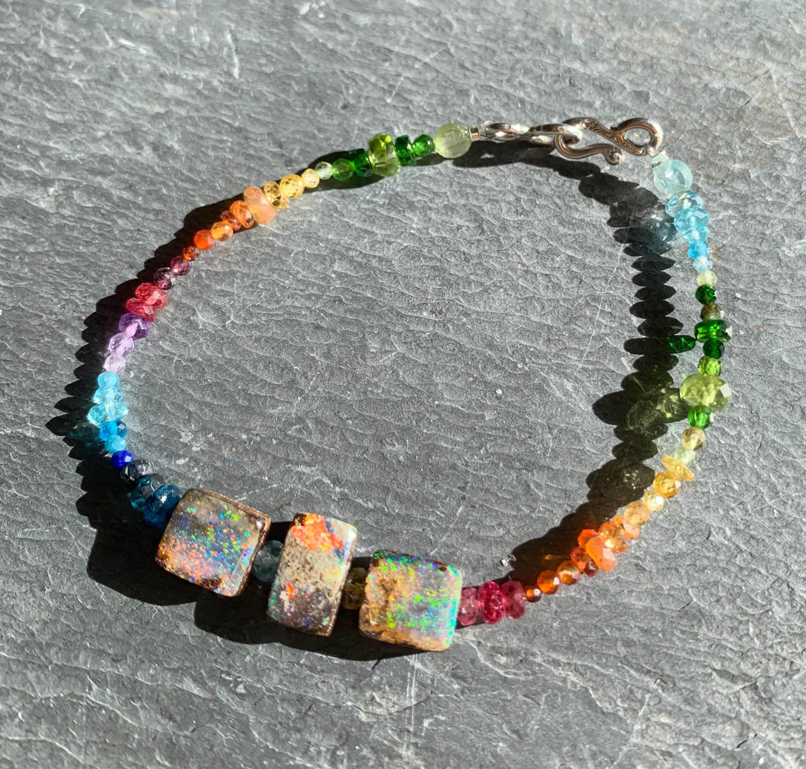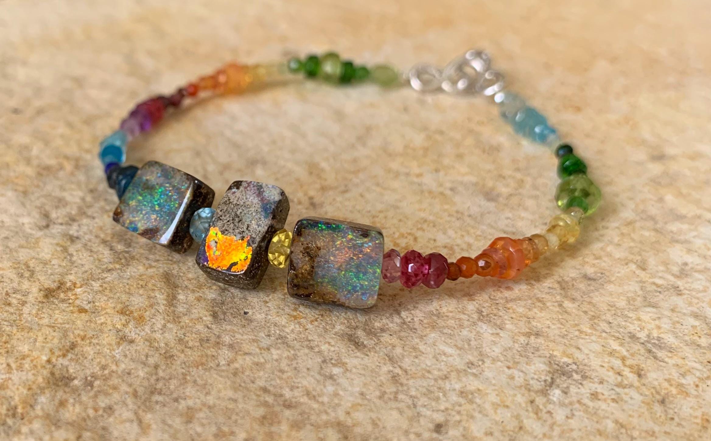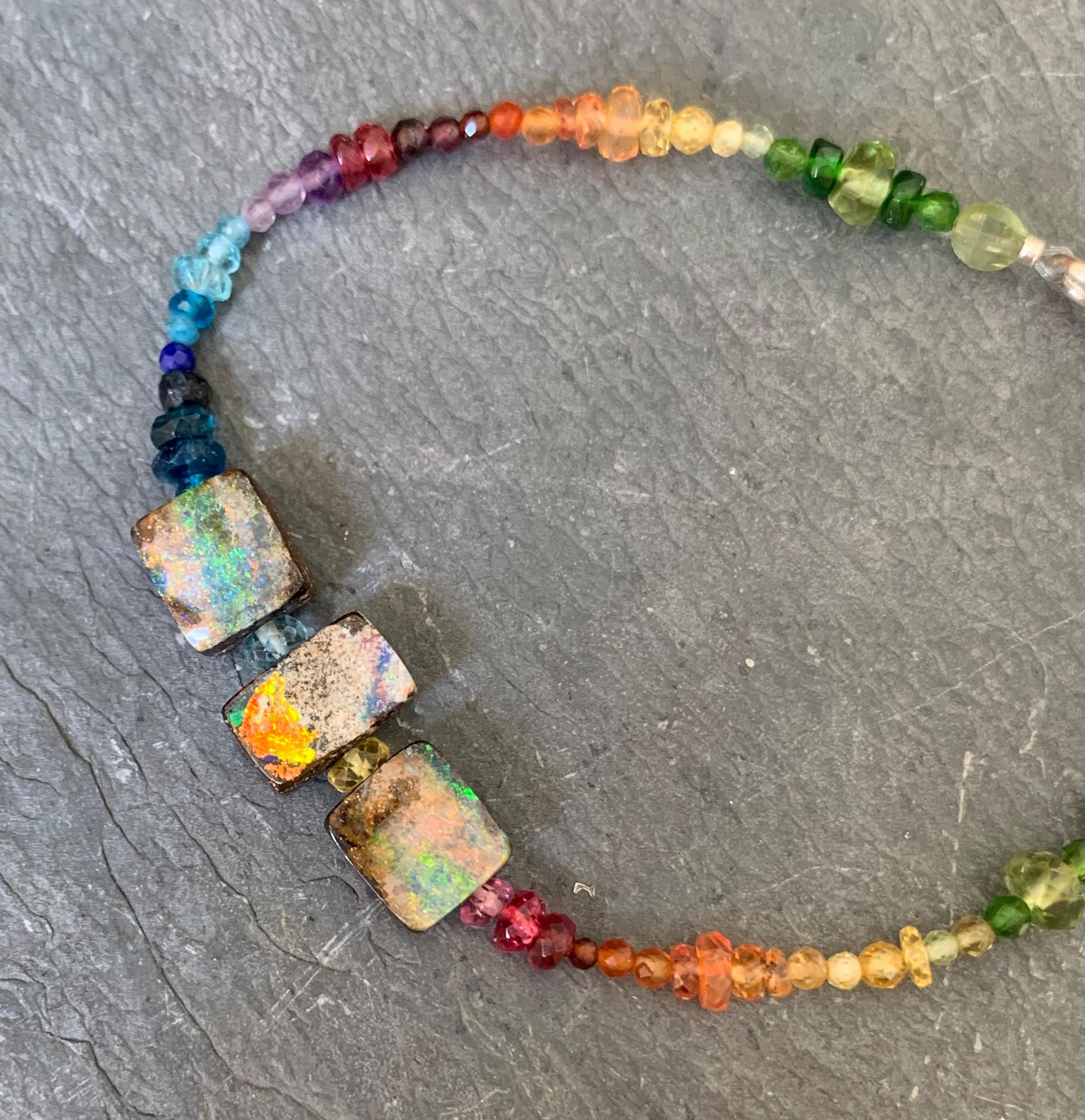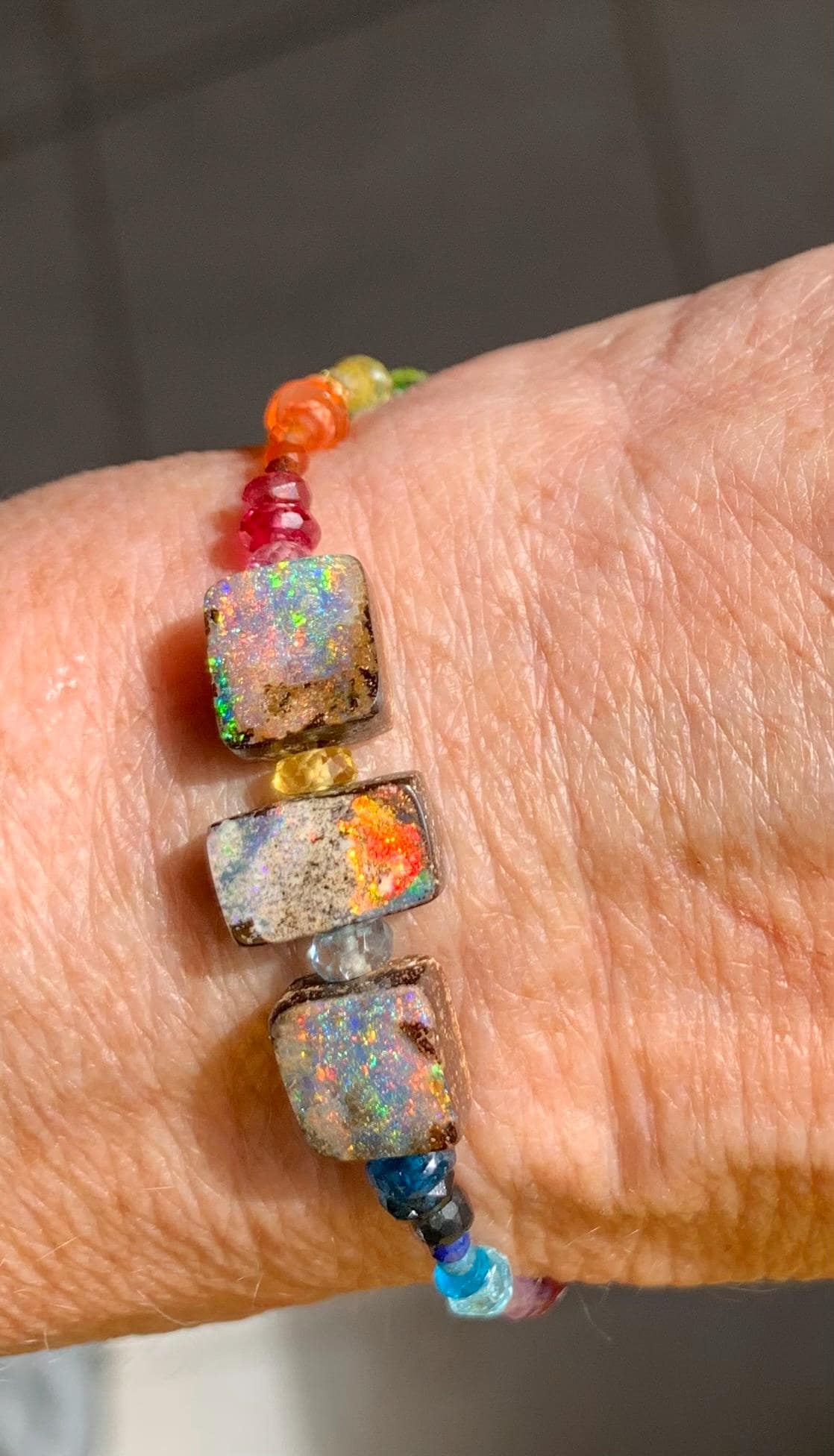 It's done with gemstones ( rose, yellow and blue sapphire, mexikan fire opal, aqua marine, ethiopian opal, améthyste, chromdiopside, lapislazuli, spinel, garnet, ruby, péridot and apatite) and 3 australian boulder opals in his middle.