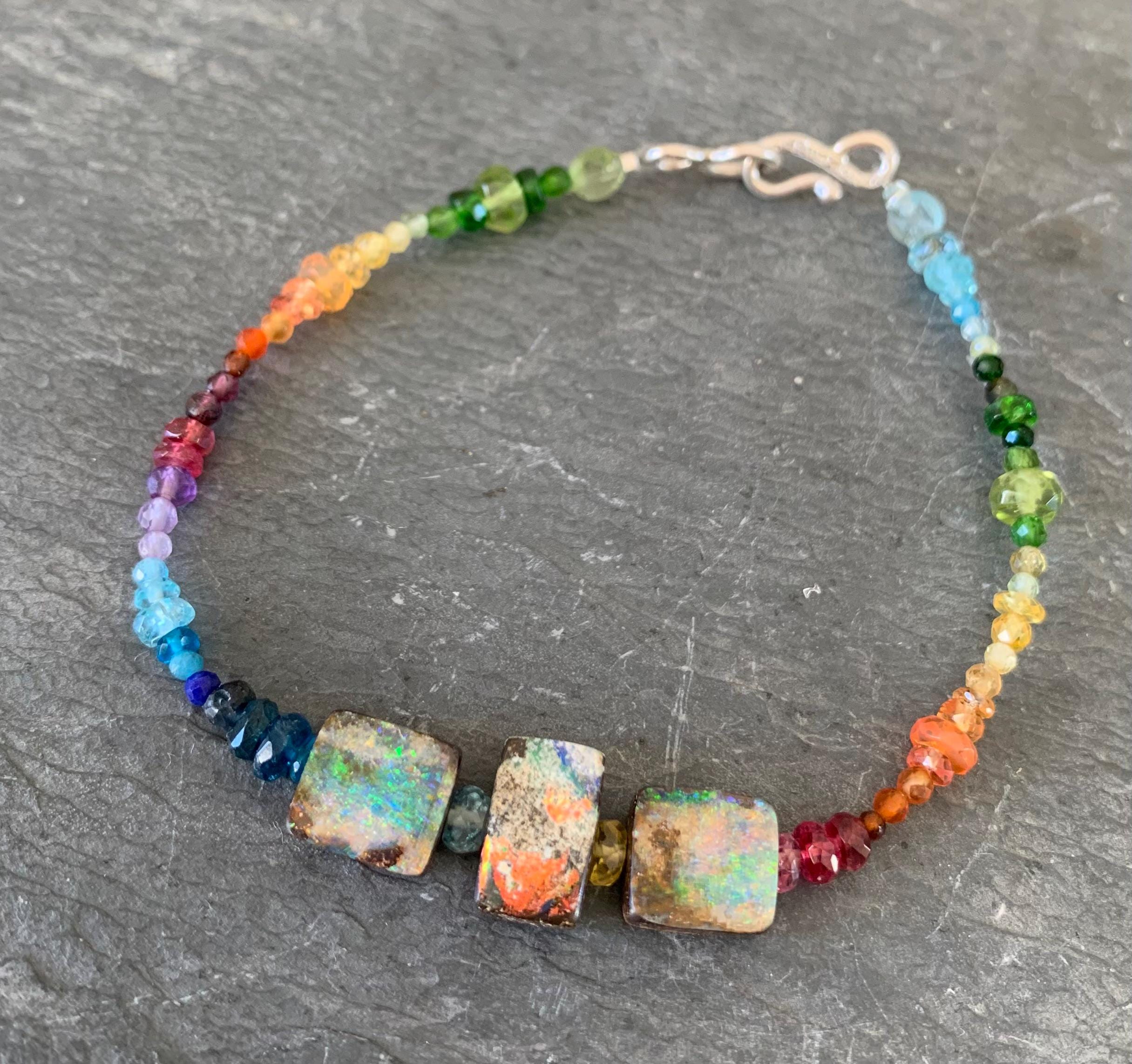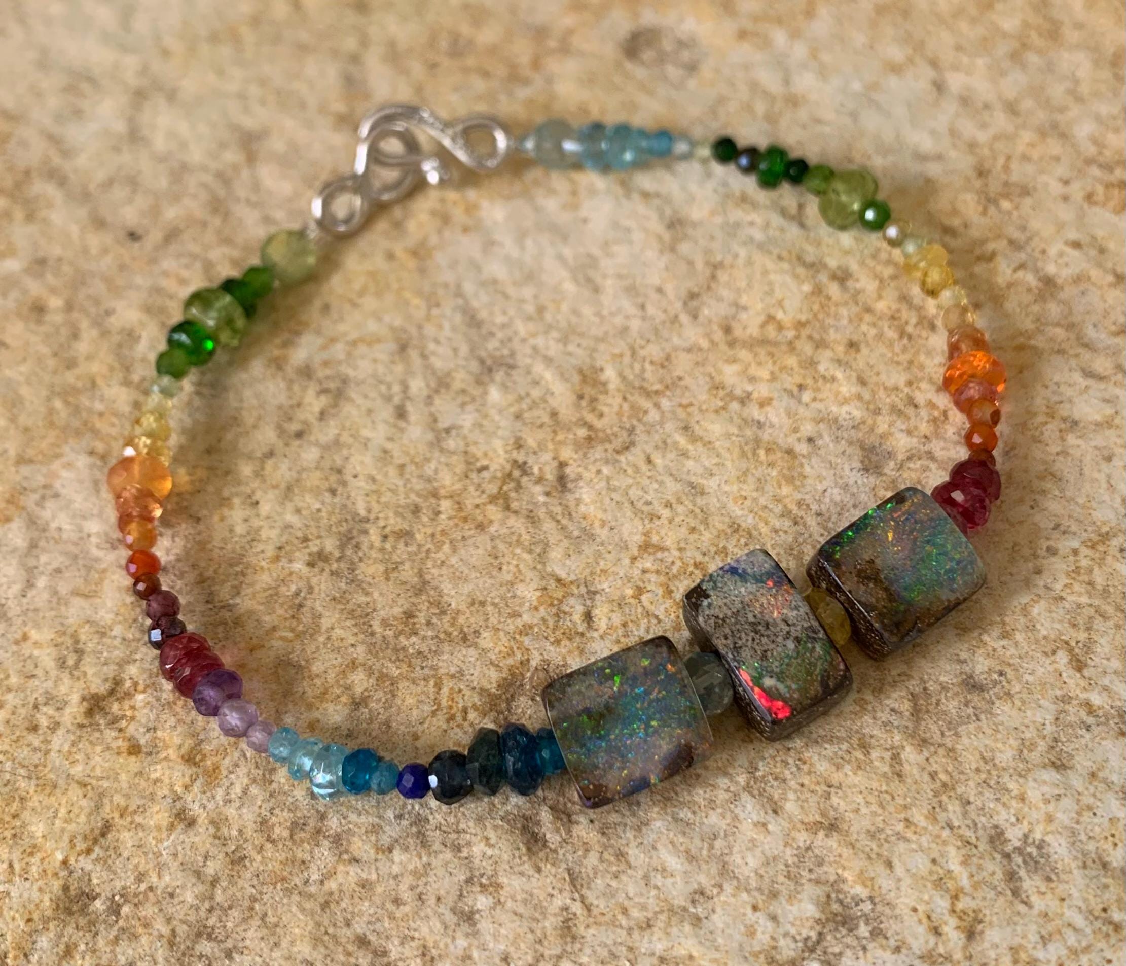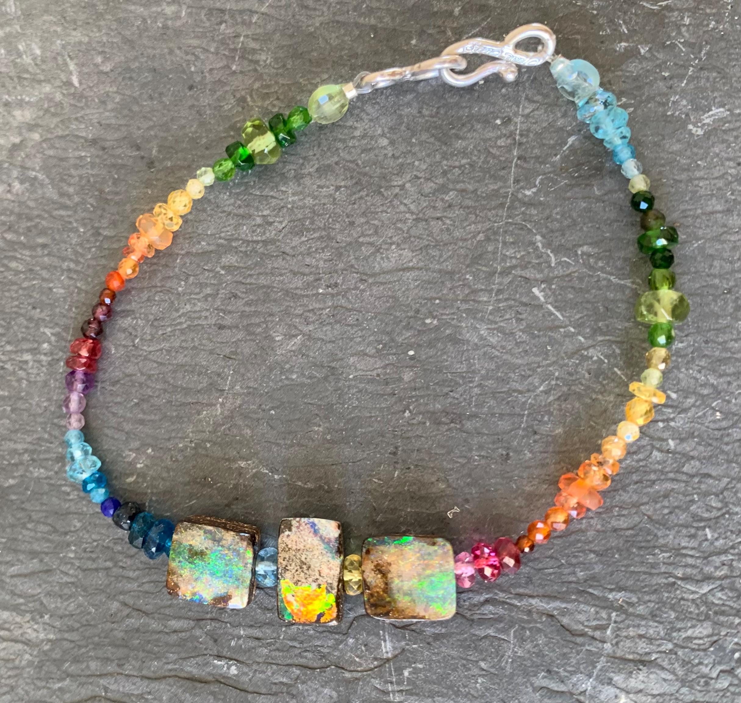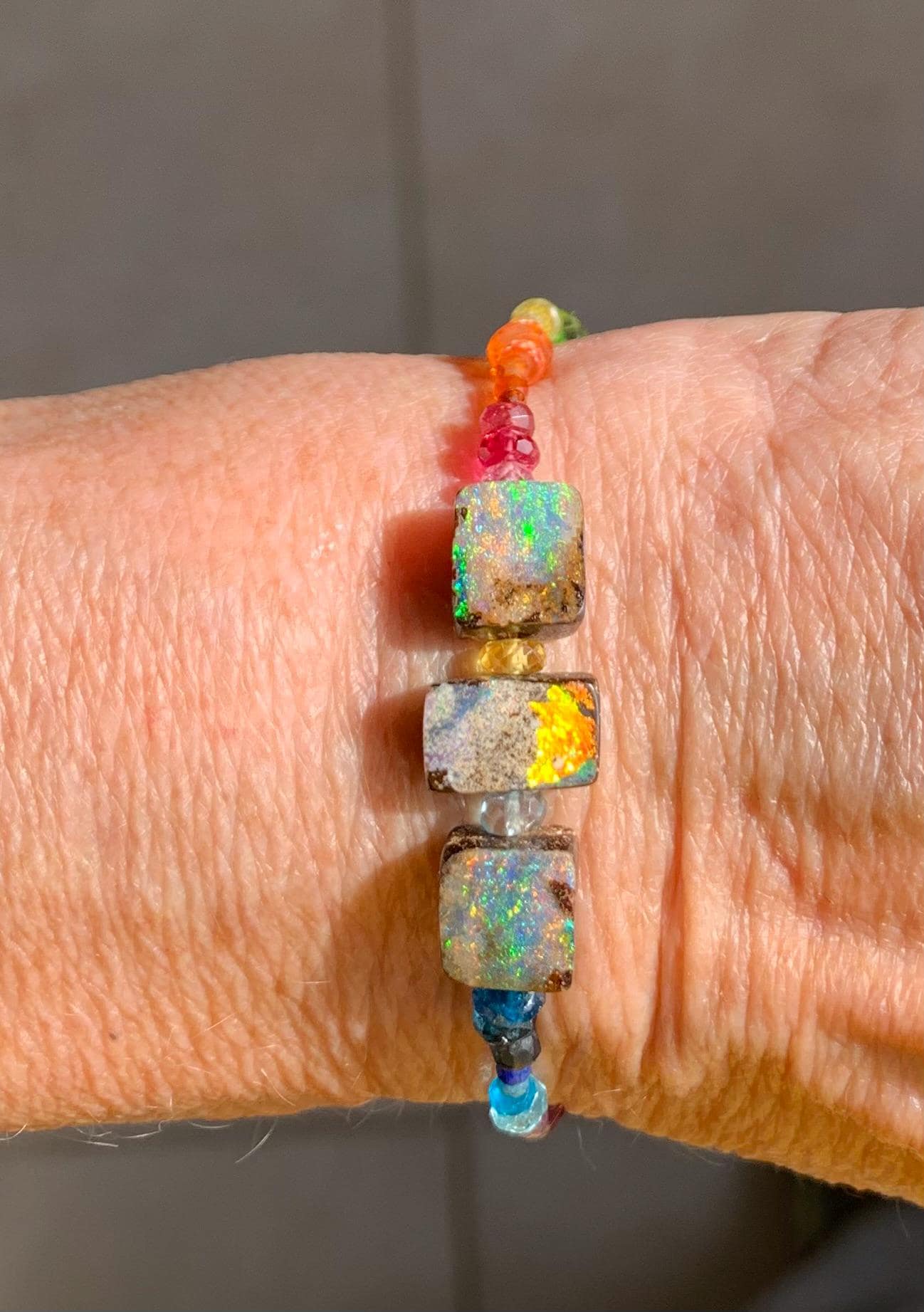 It's done with gemstones ( rose, yellow and blue sapphire, mexikan fire opal, aqua marine, ethiopian opal, améthyste, chromdiopside, lapislazuli, spinel, garnet, ruby, péridot and apatite) and 3 australian boulder opals in his middle.