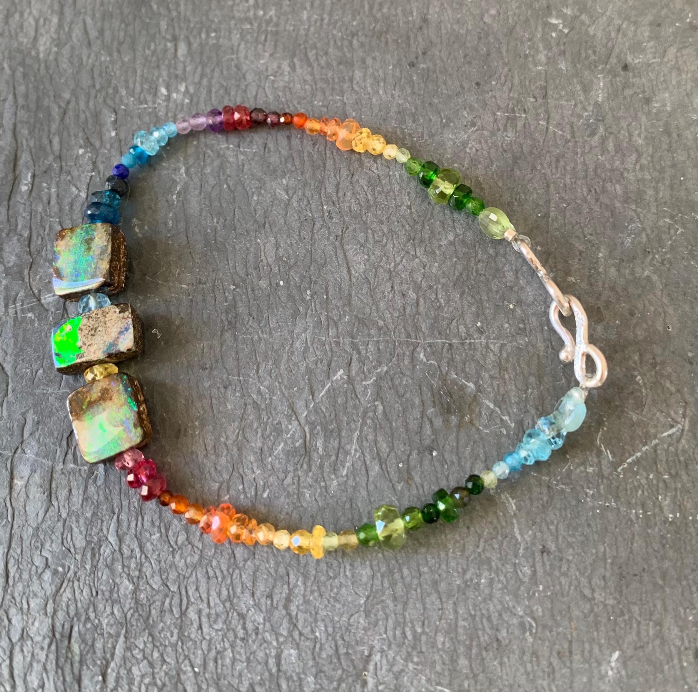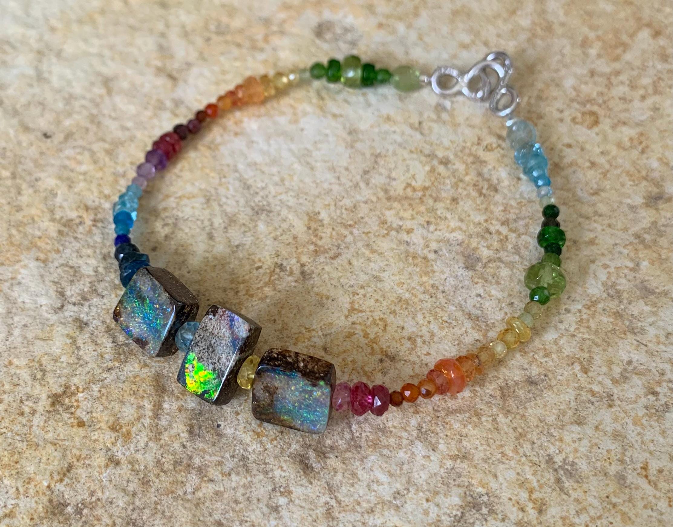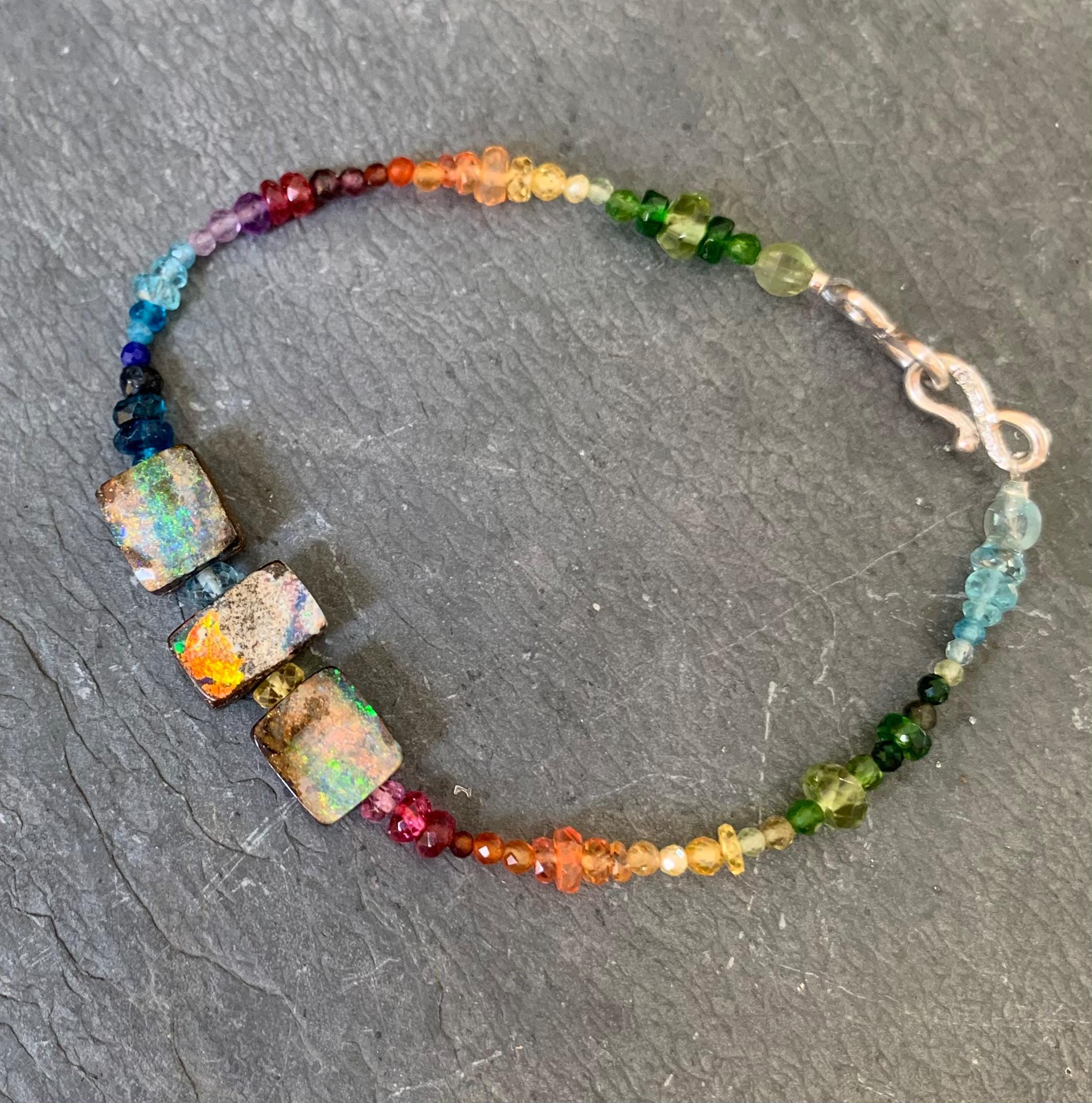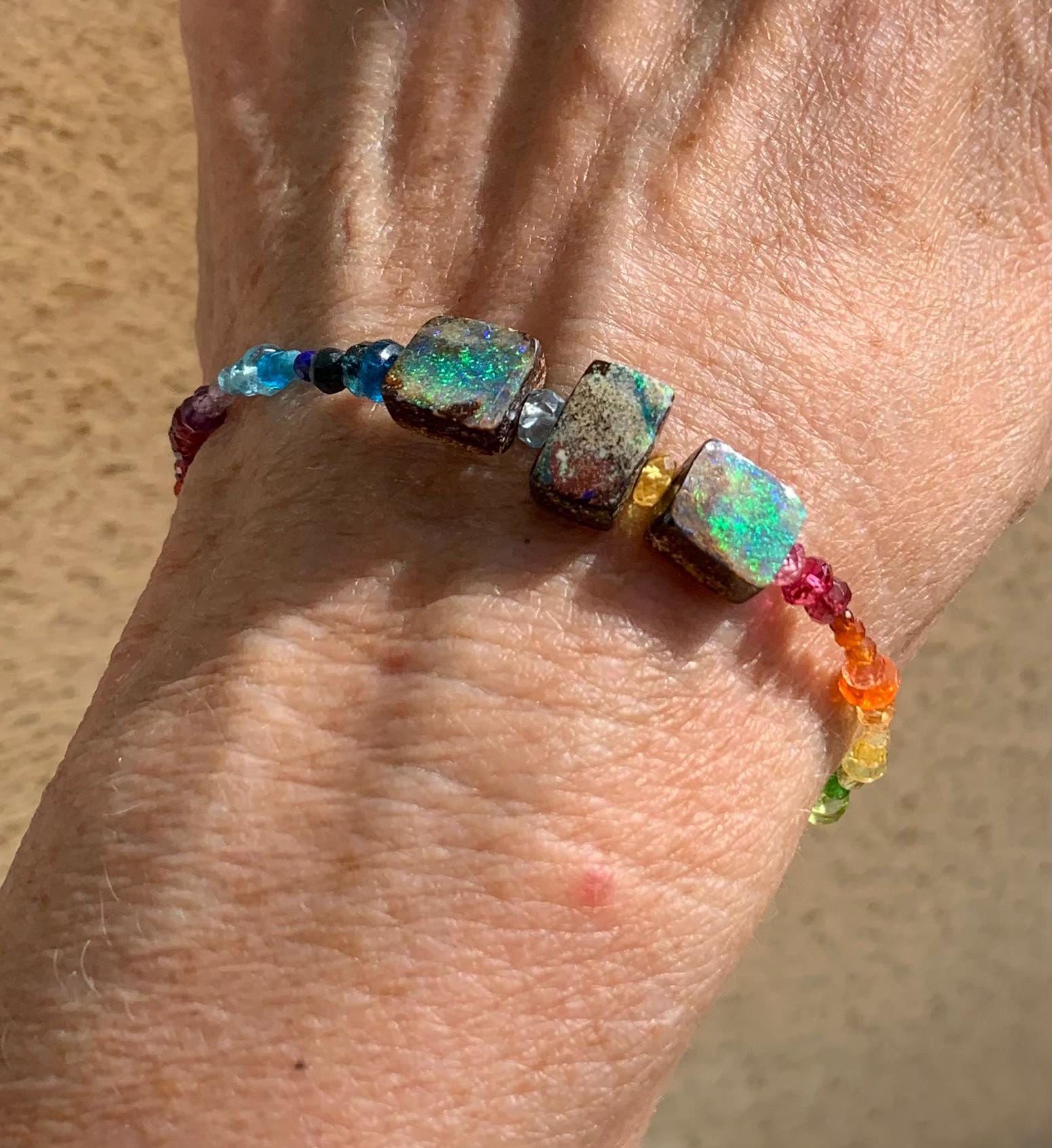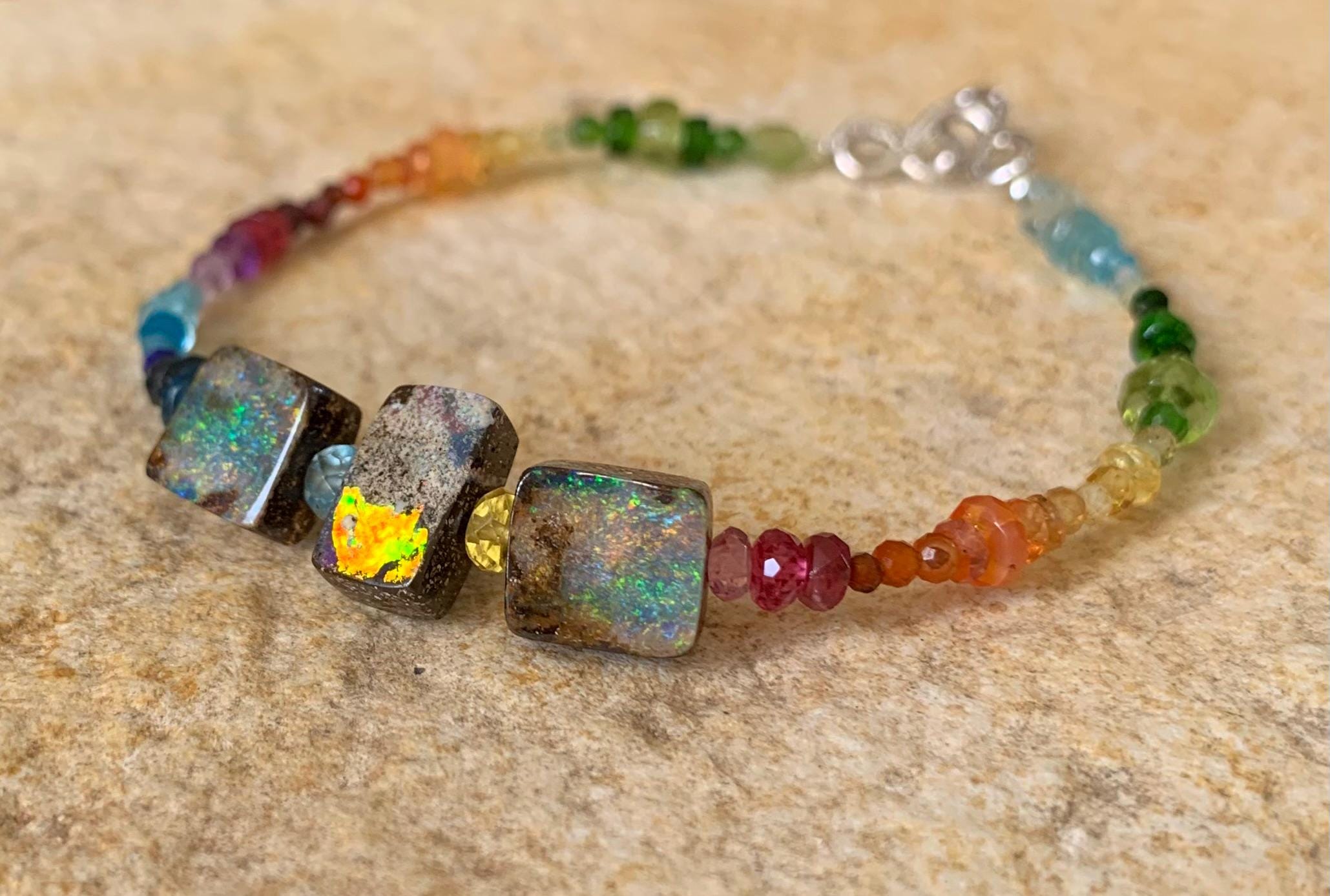 It's done with gemstones ( rose, yellow and blue sapphire, mexikan fire opal, aqua marine, ethiopian opal, améthyste, chromdiopside, lapislazuli, spinel, garnet, ruby, péridot and apatite) and 3 australian boulder opals in his middle.