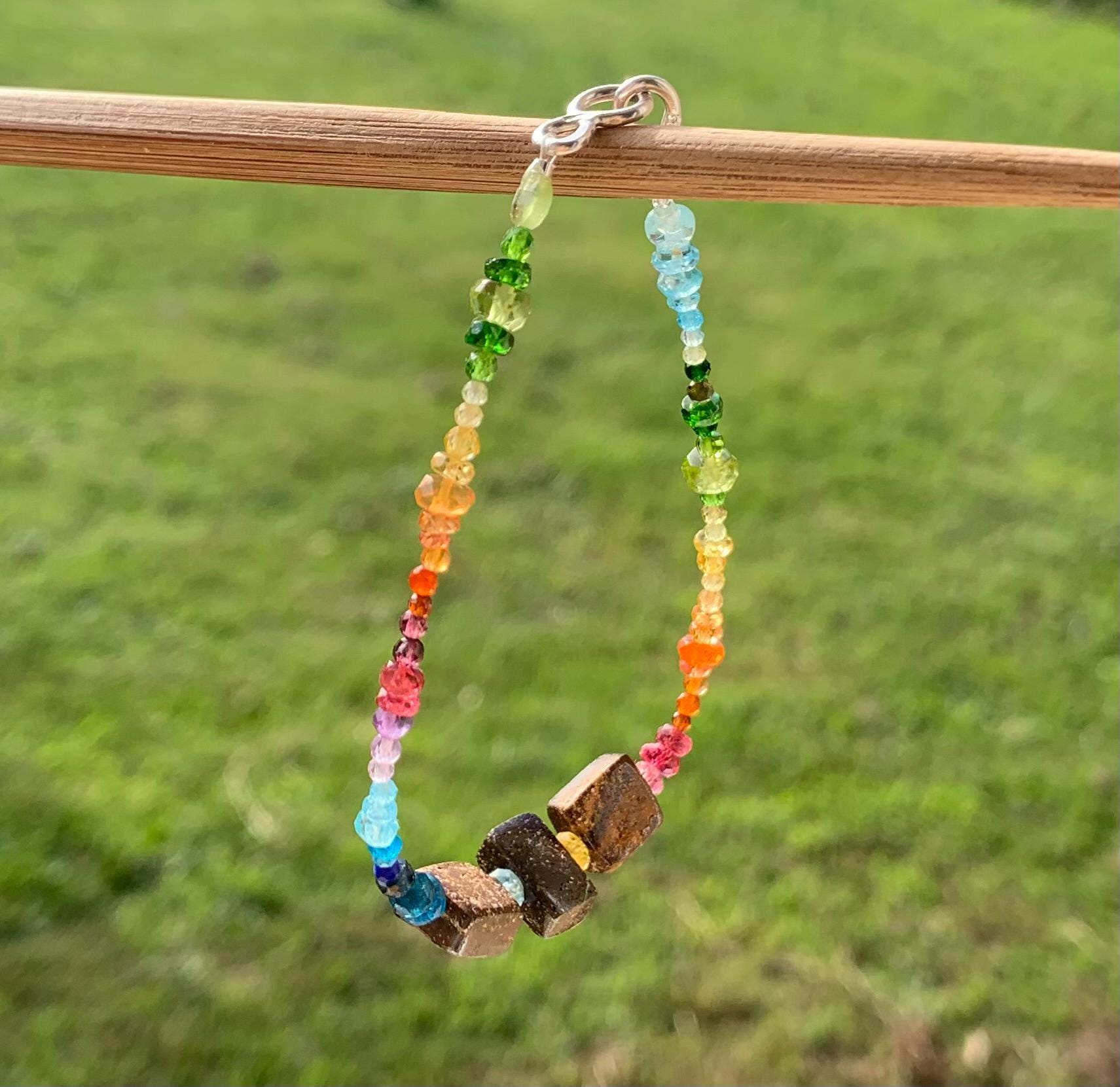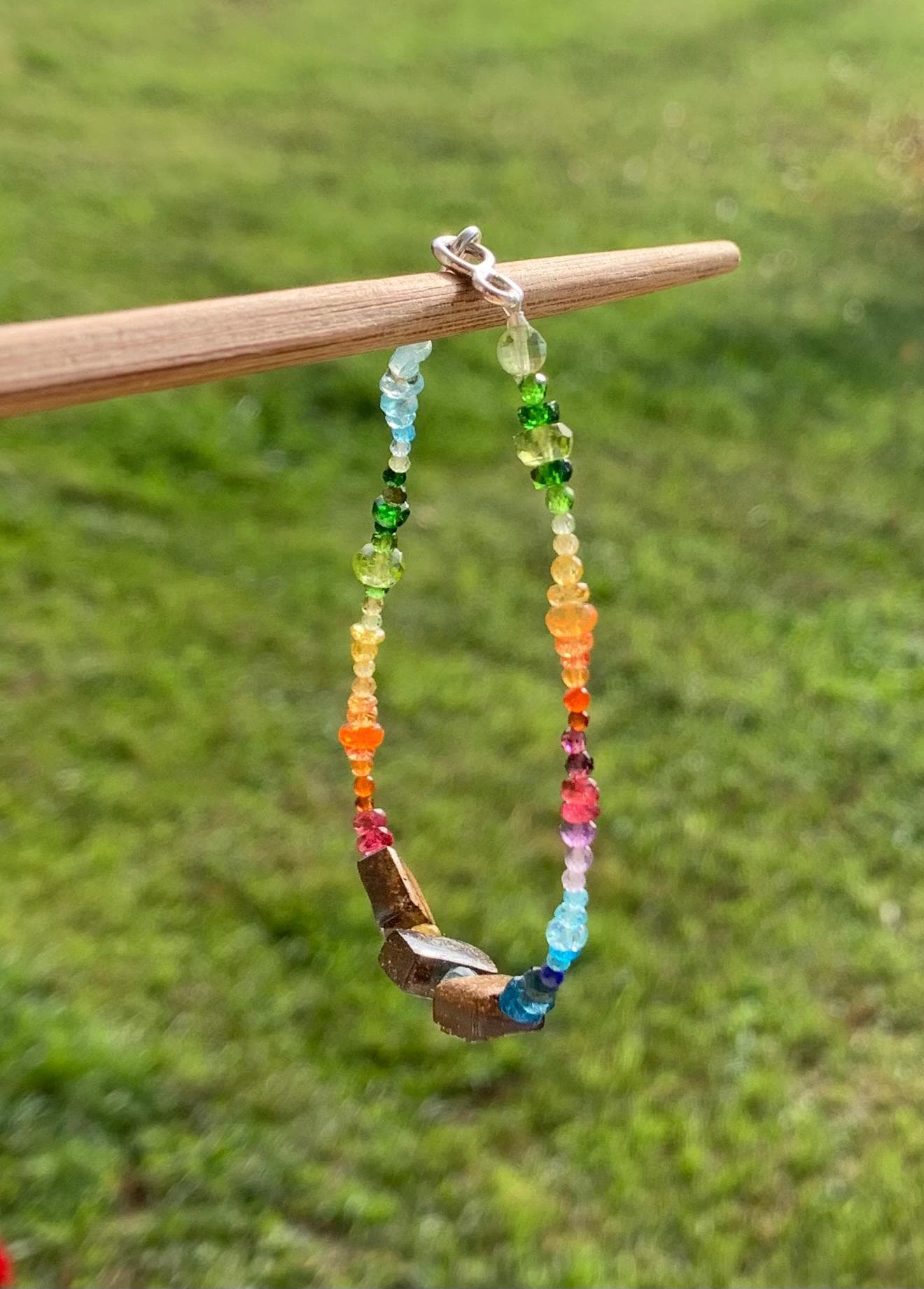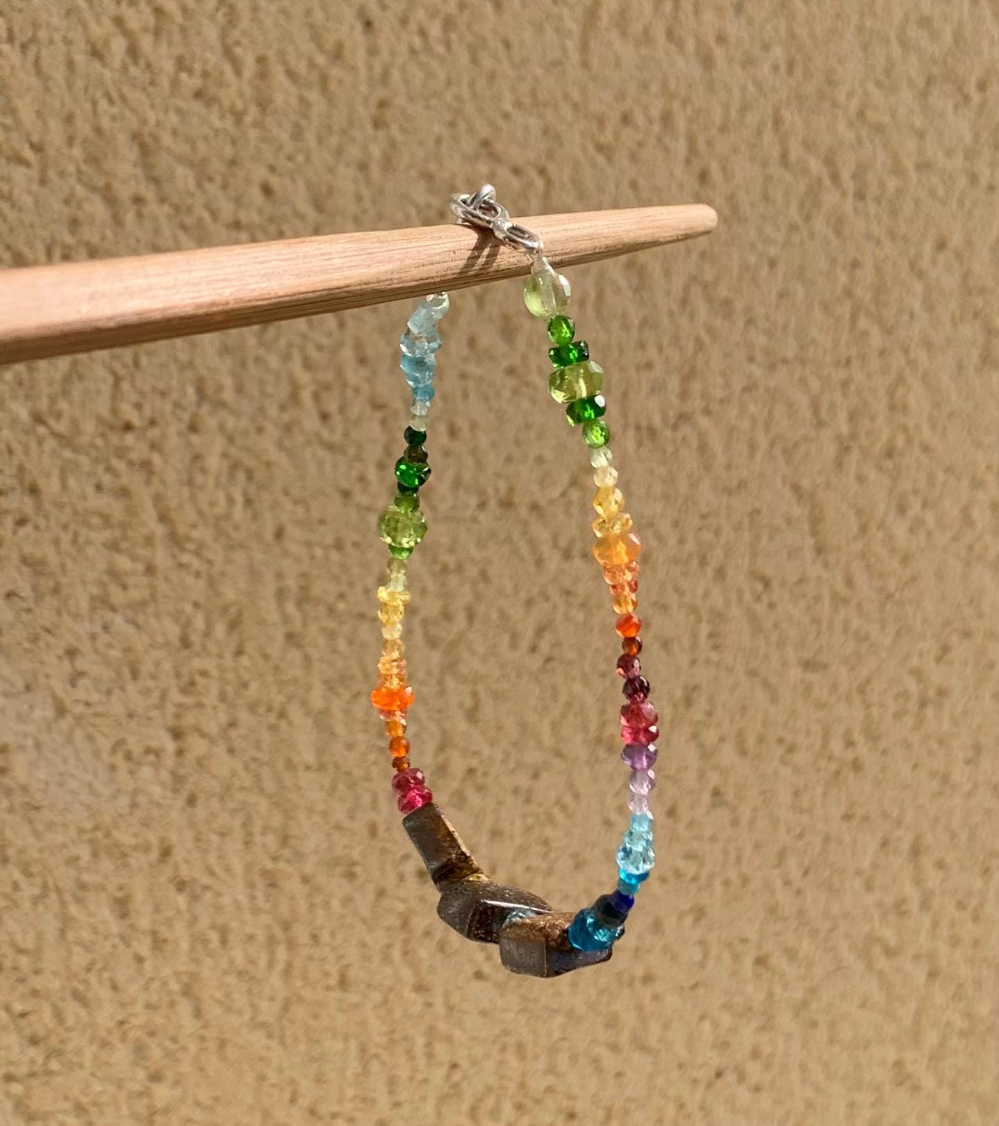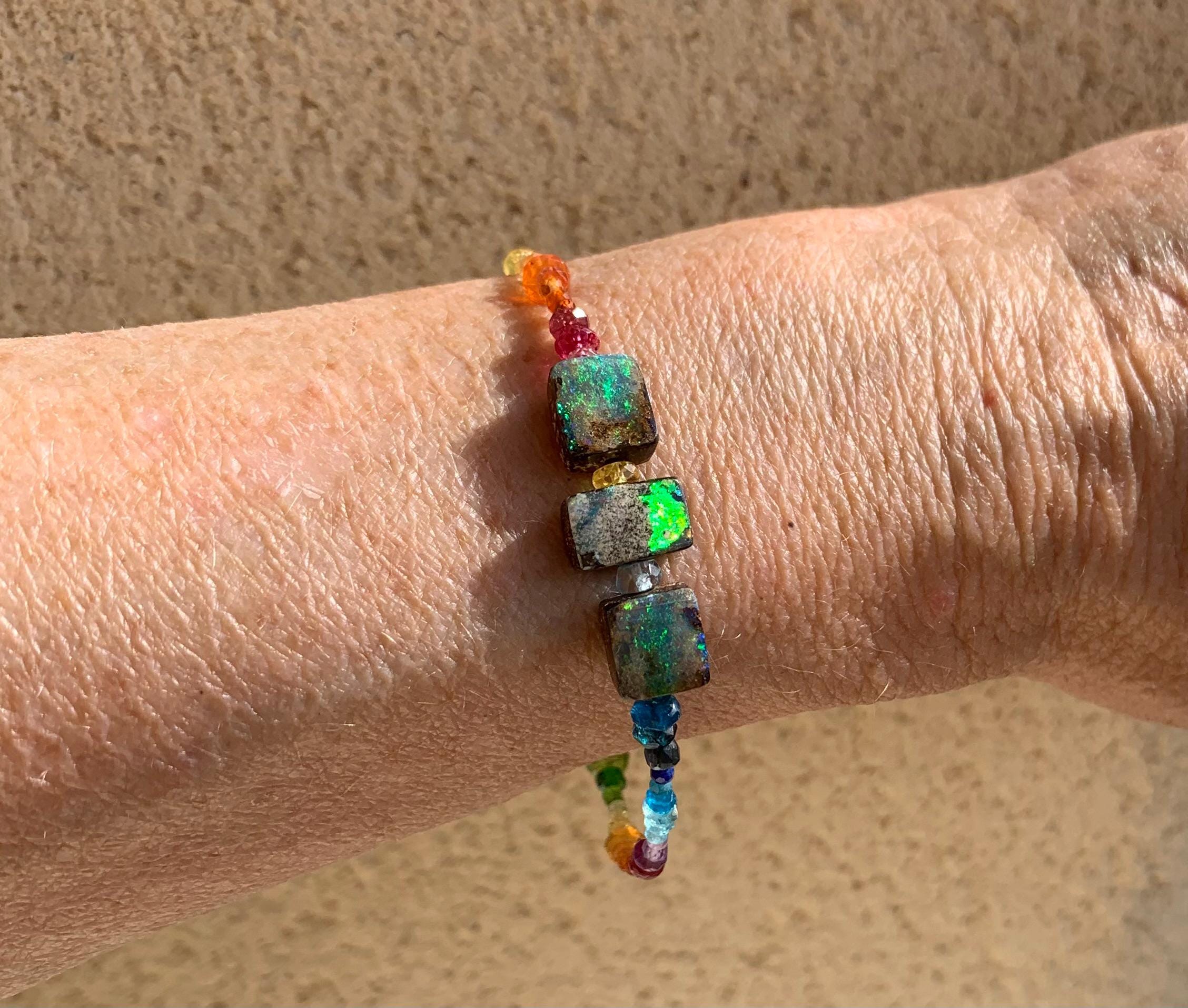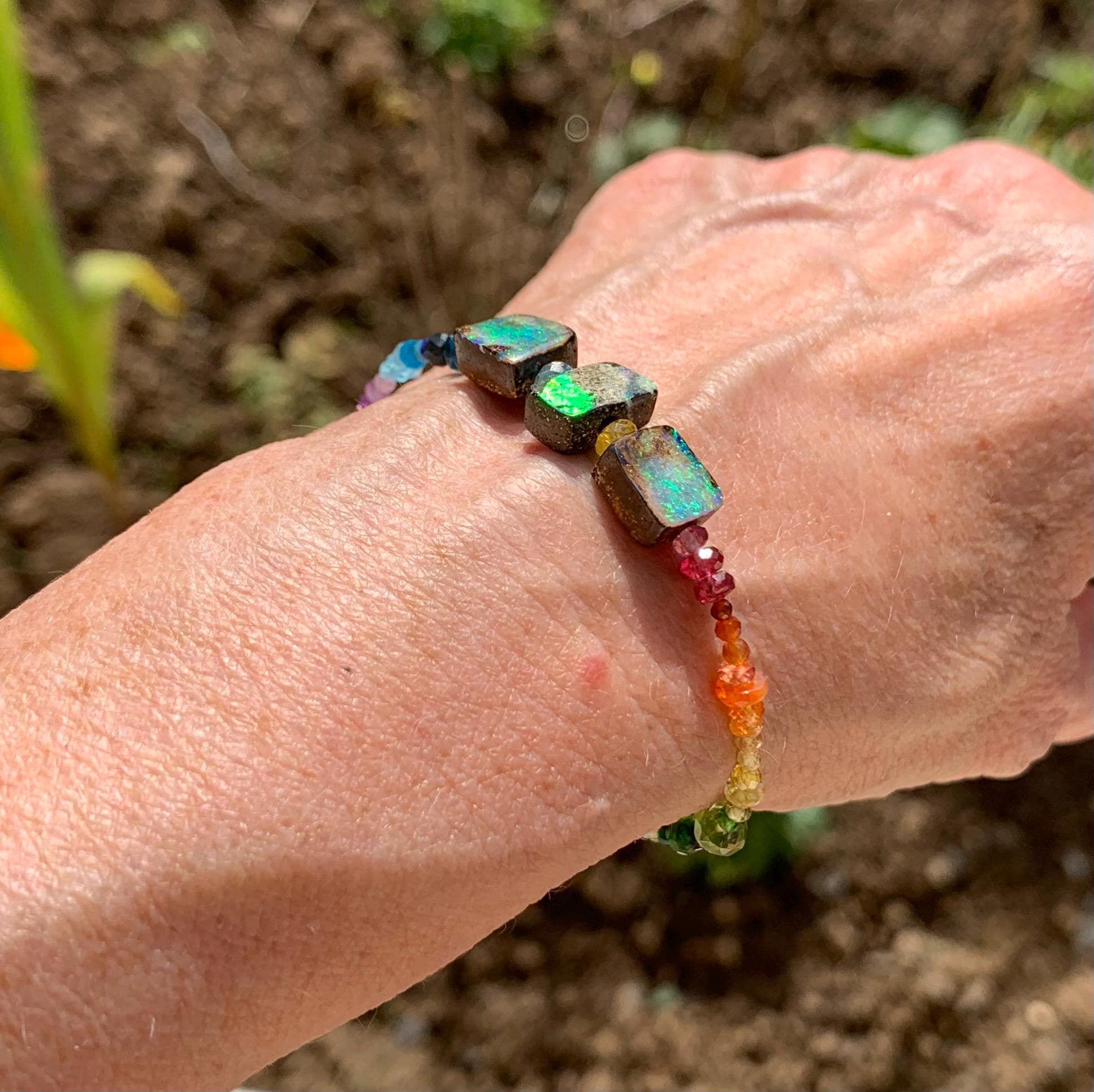 It's done with gemstones ( rose, yellow and blue sapphire, mexikan fire opal, aqua marine, ethiopian opal, améthyste, chromdiopside, lapislazuli, spinel, garnet, ruby, péridot and apatite) and 3 australian boulder opals in his middle.