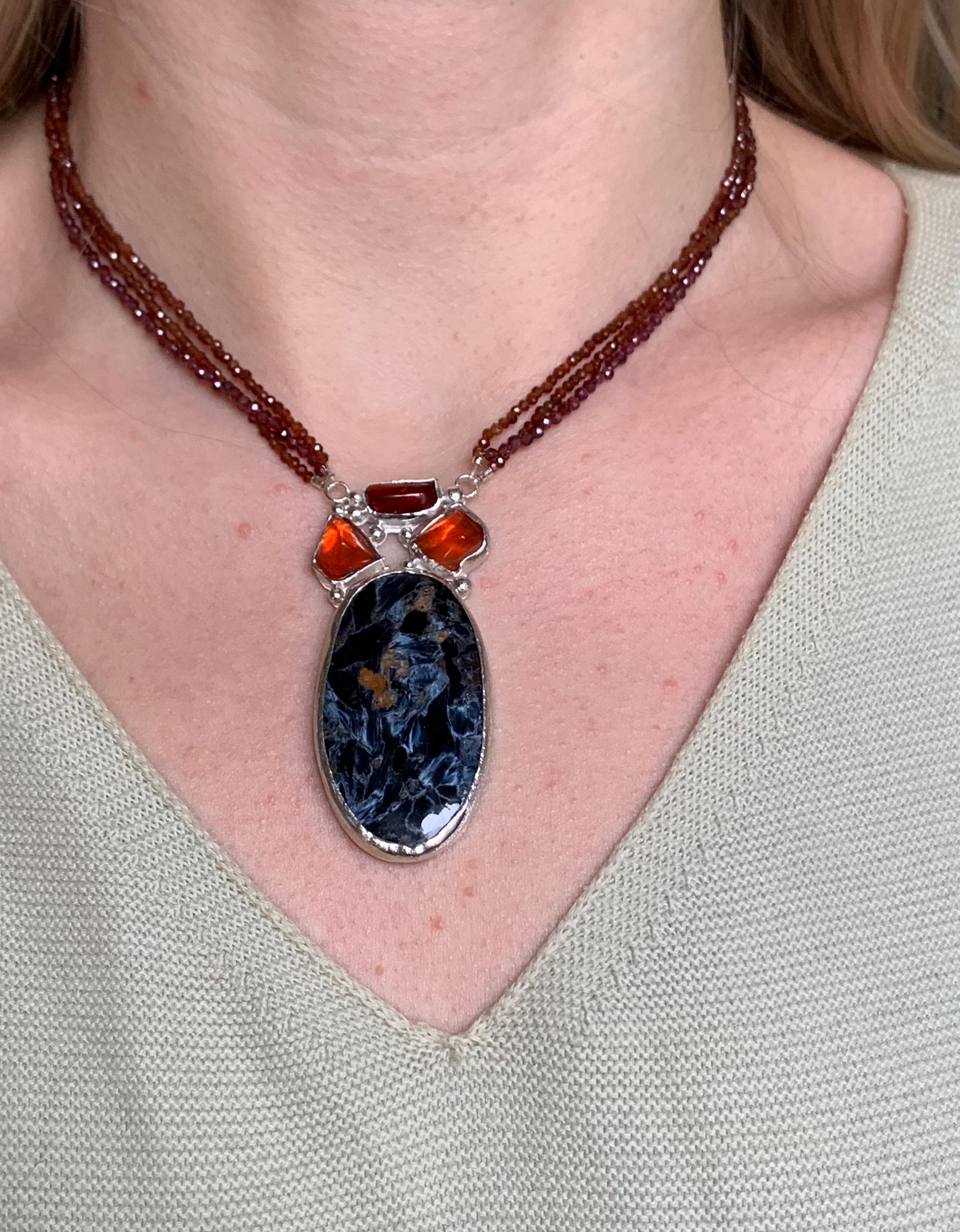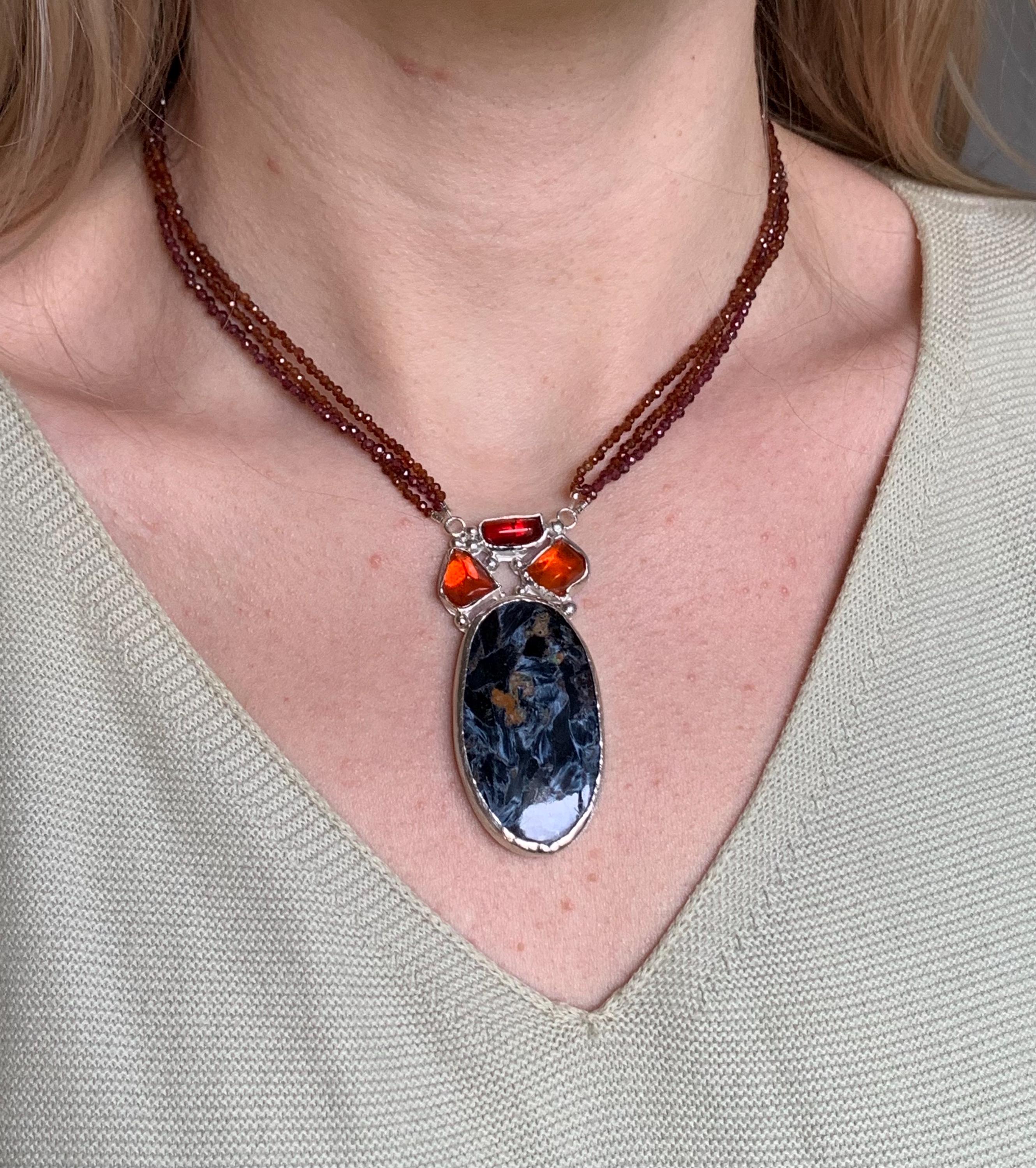 In the middle is hanging a pendant done with 1 big pietersite and 3 mexican fire opals setted in 925 solid silver.