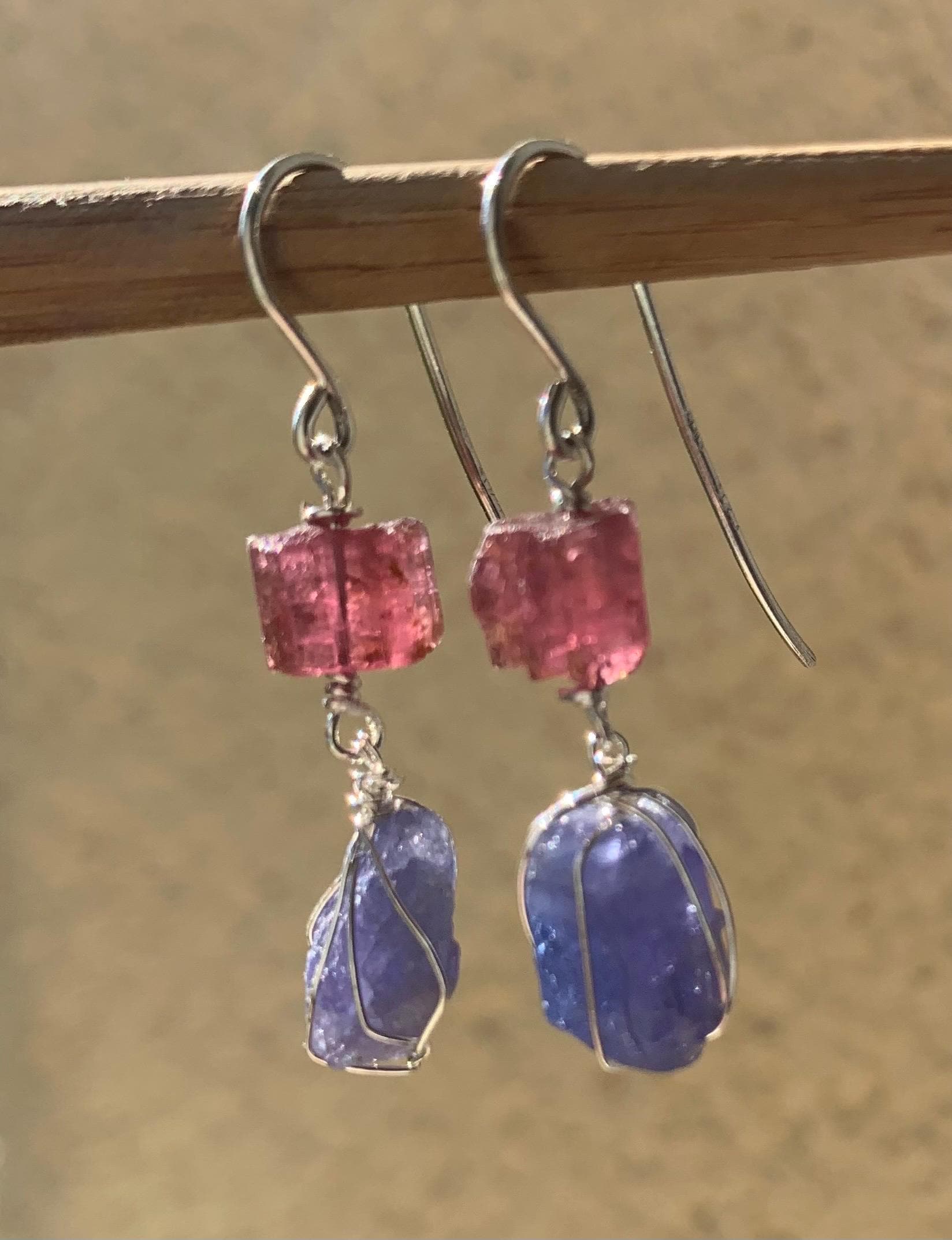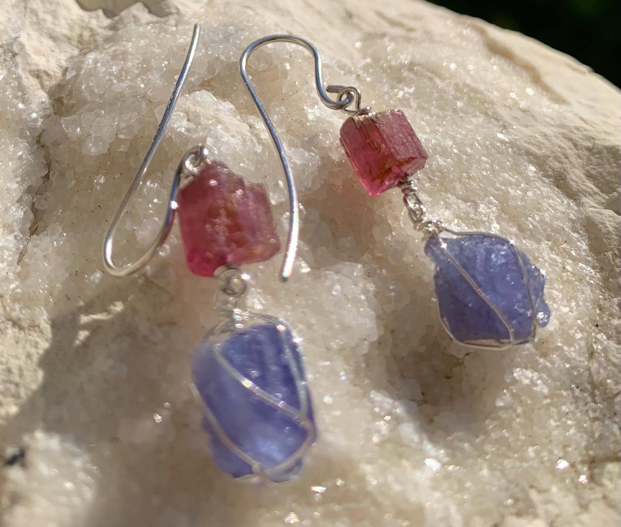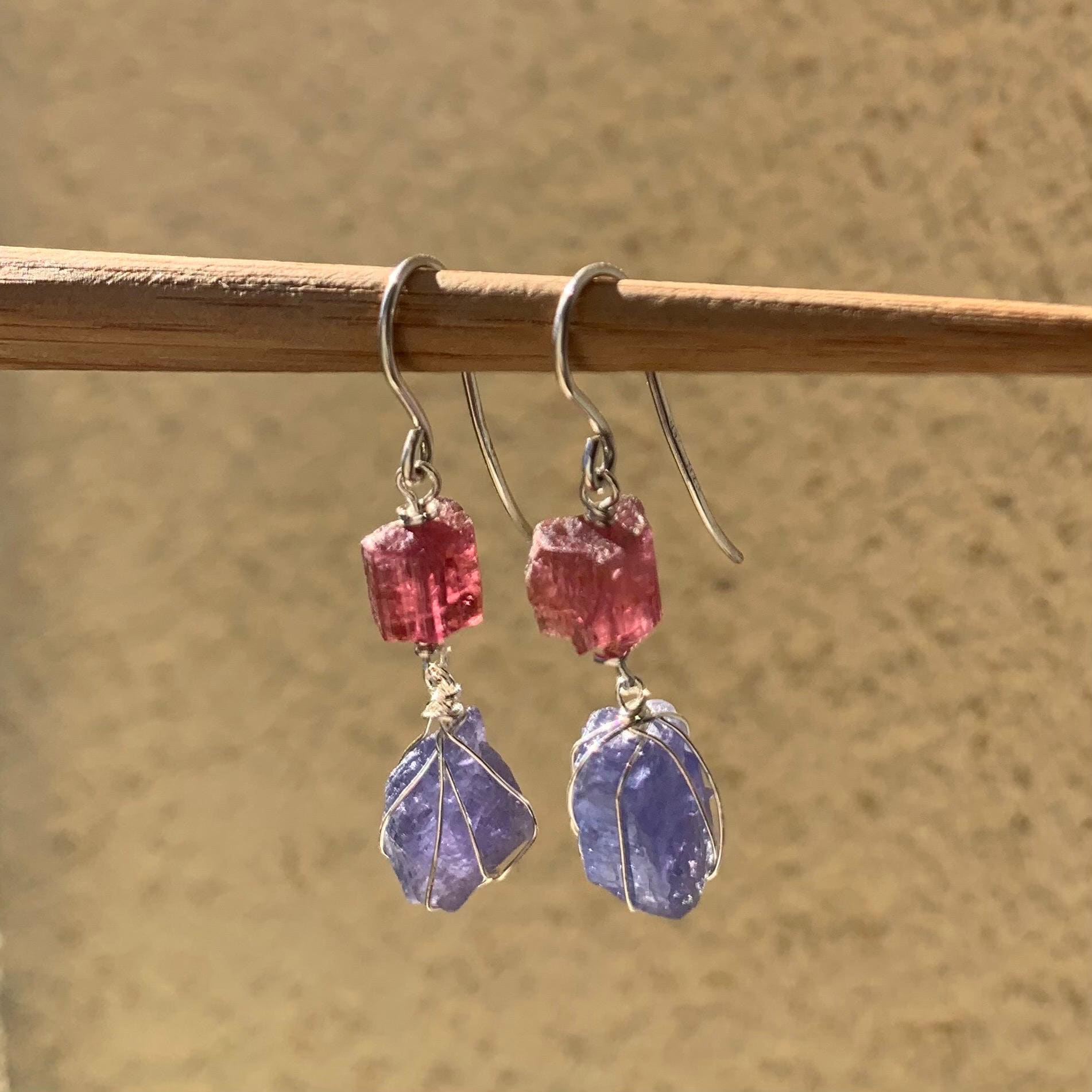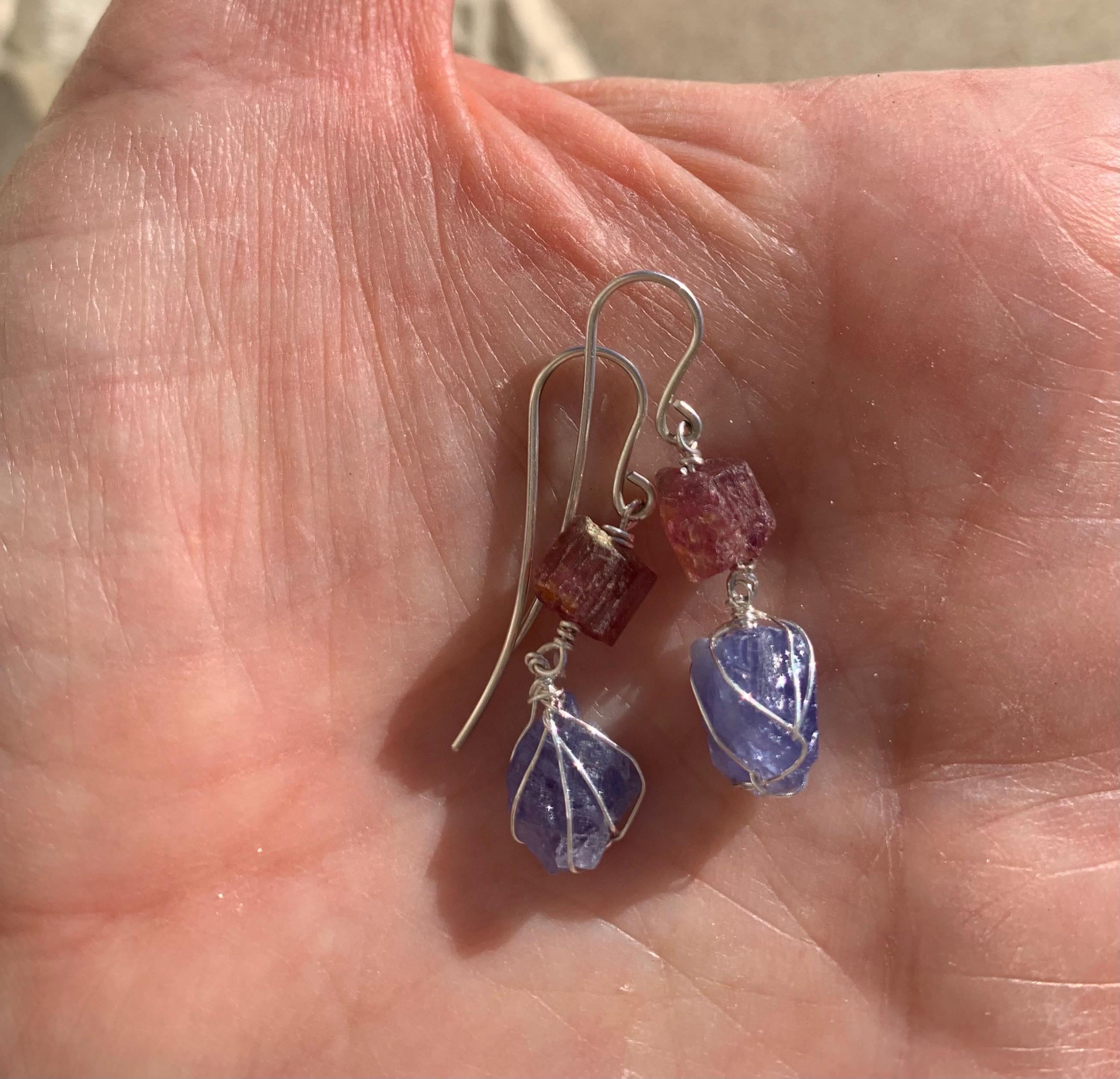 The earrings are done with 2 rough tourmalines and 2 rough tanzanites wrapped in silver wire and hanging on silver wire.