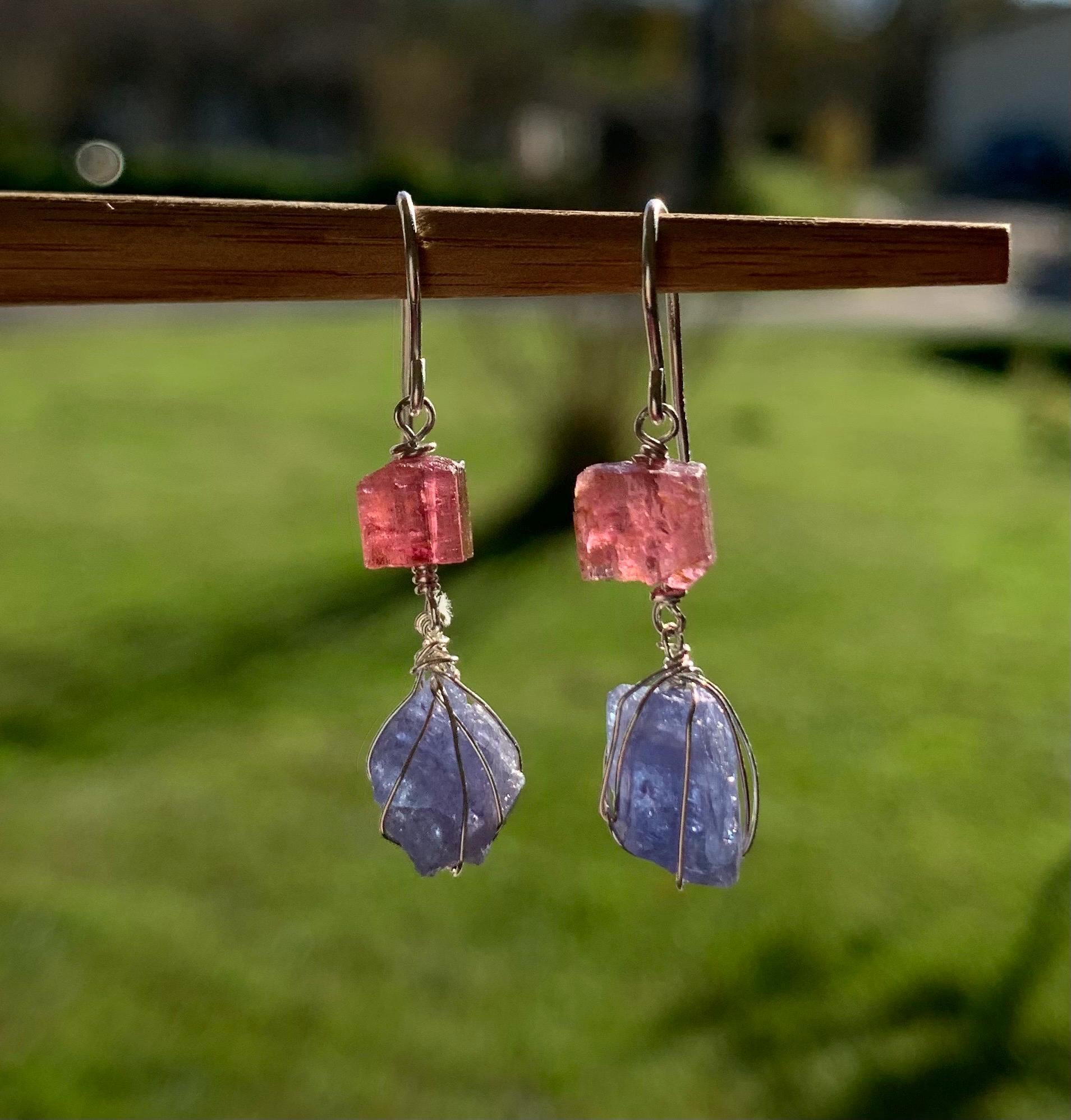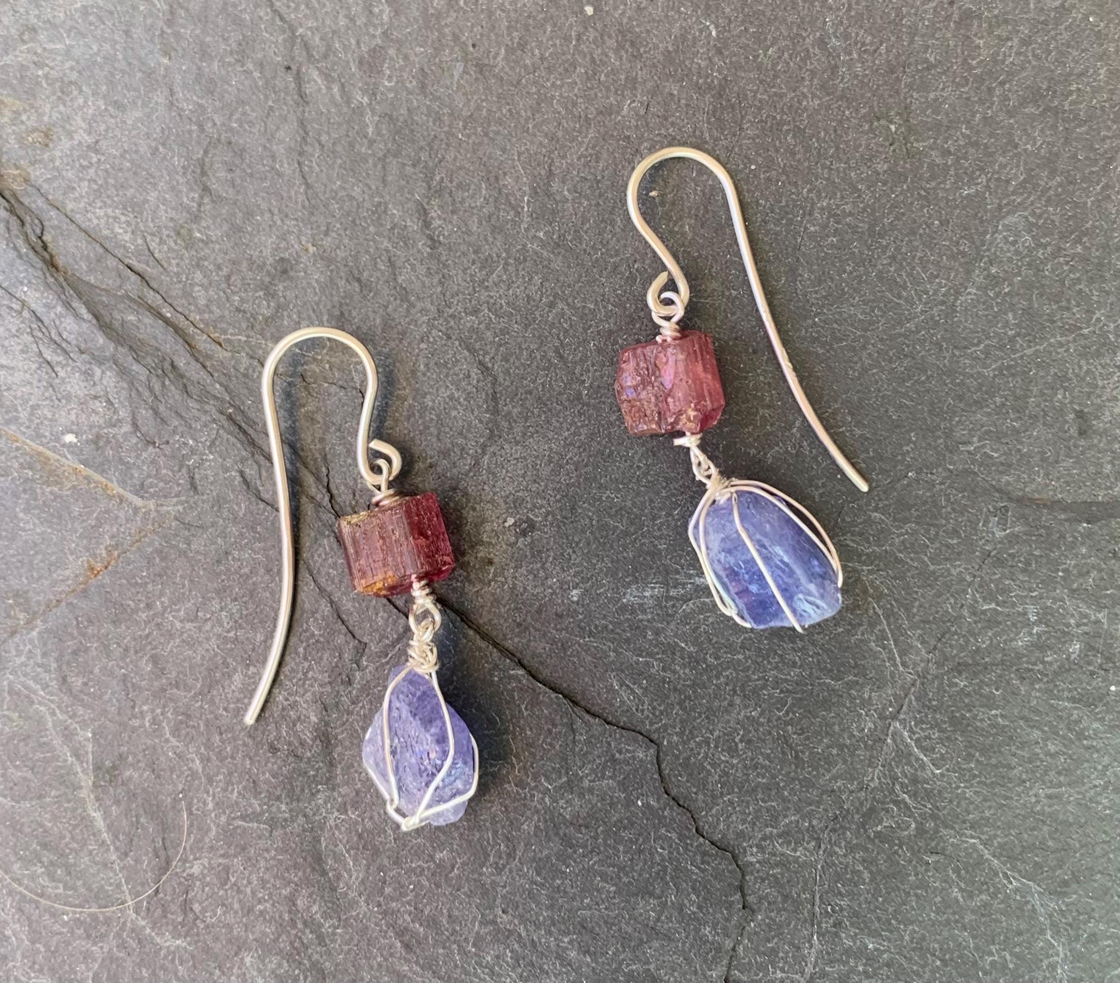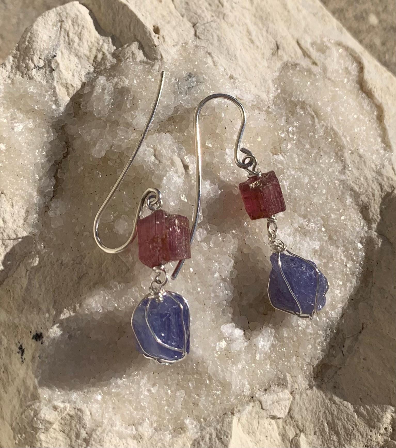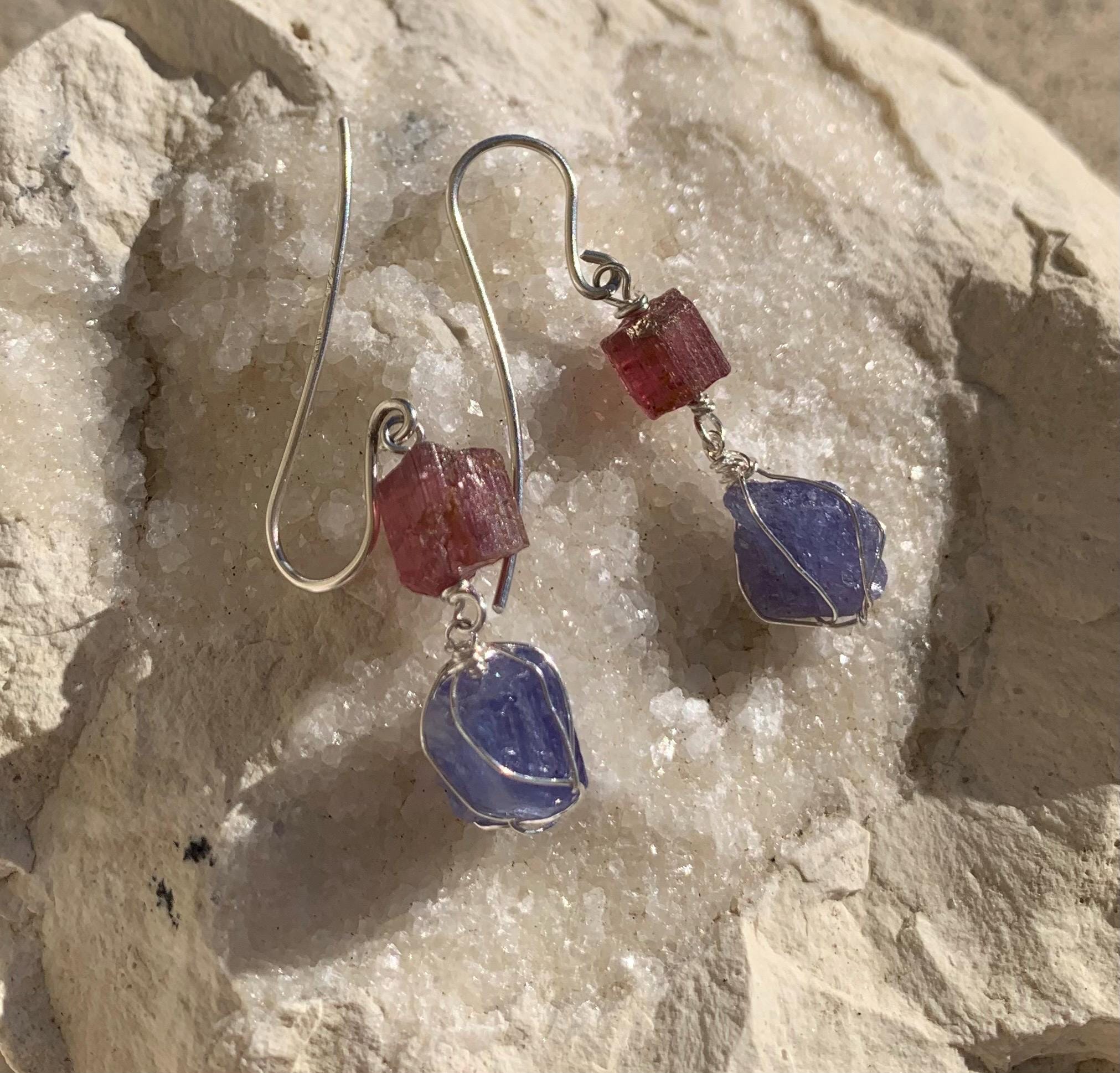 The earrings are done with 2 rough tourmalines and 2 rough tanzanites wrapped in silver wire and hanging on silver wire.