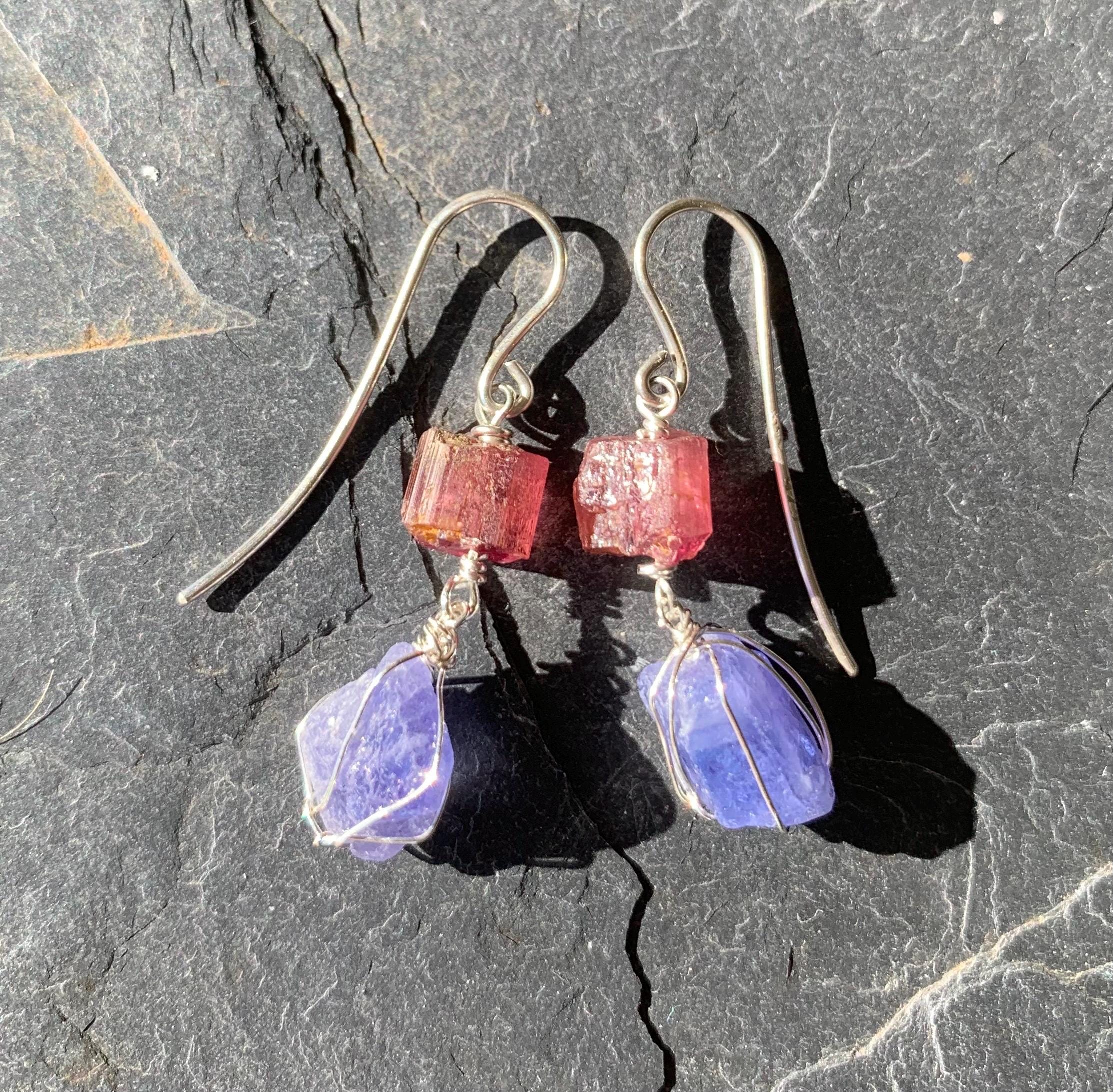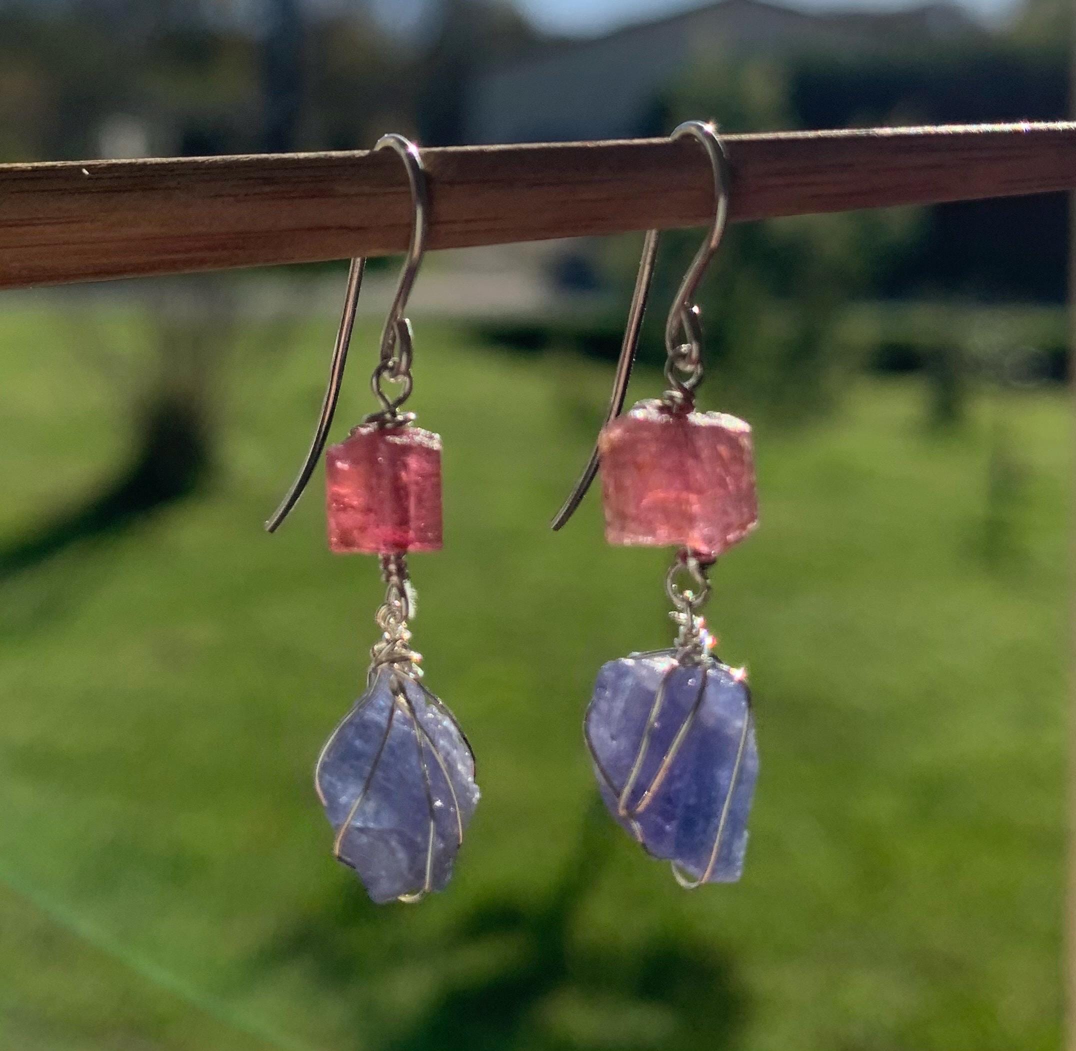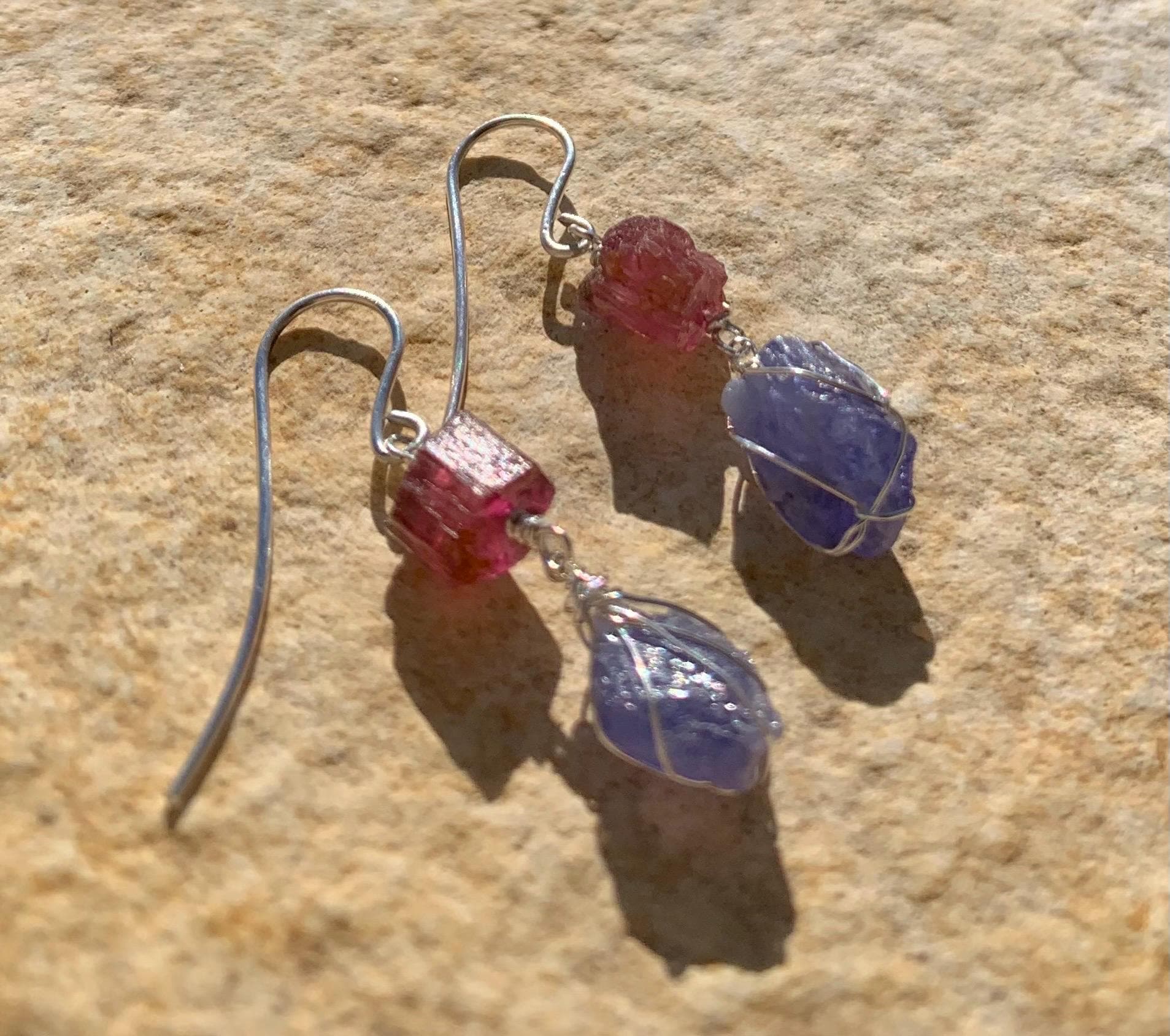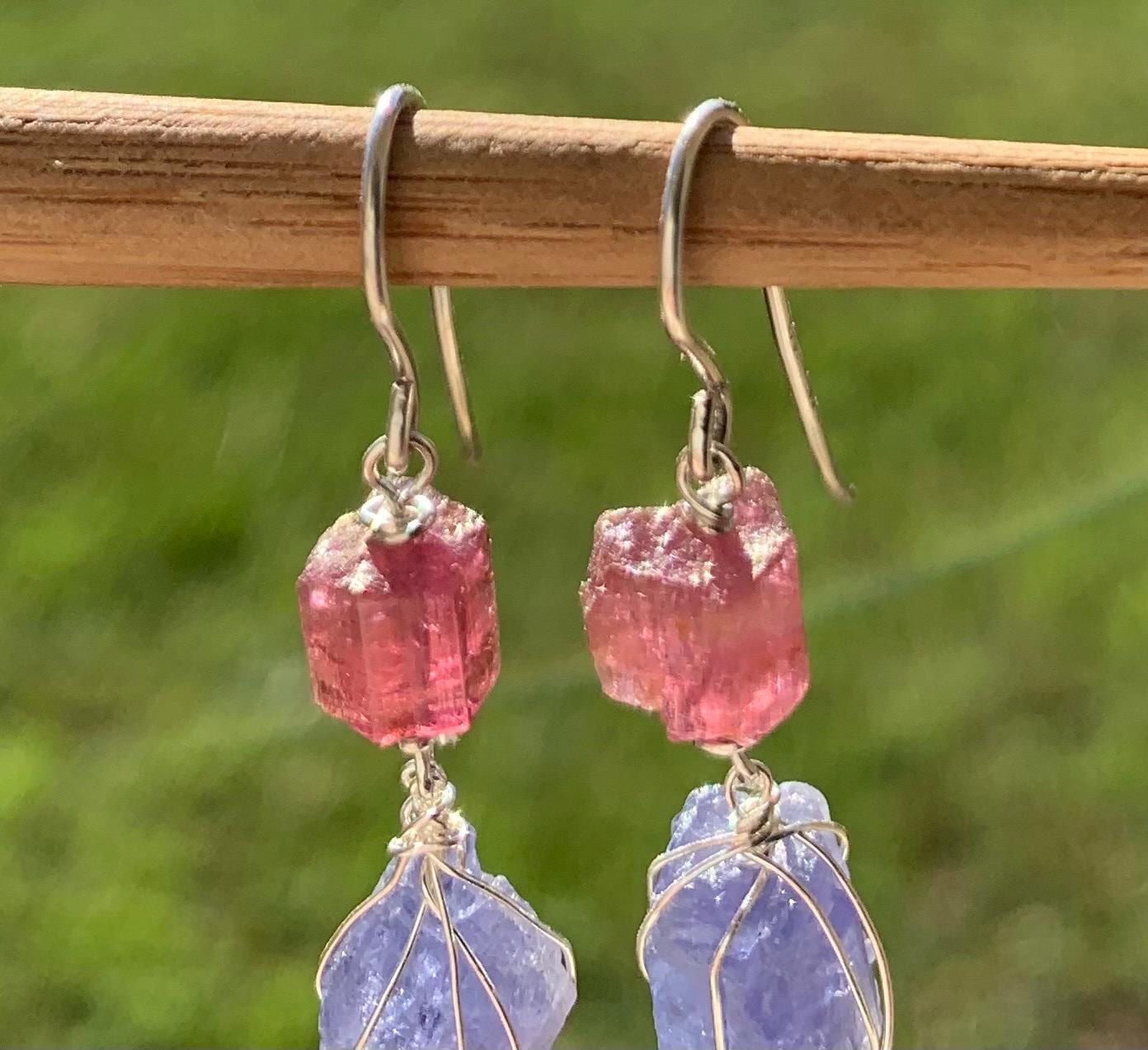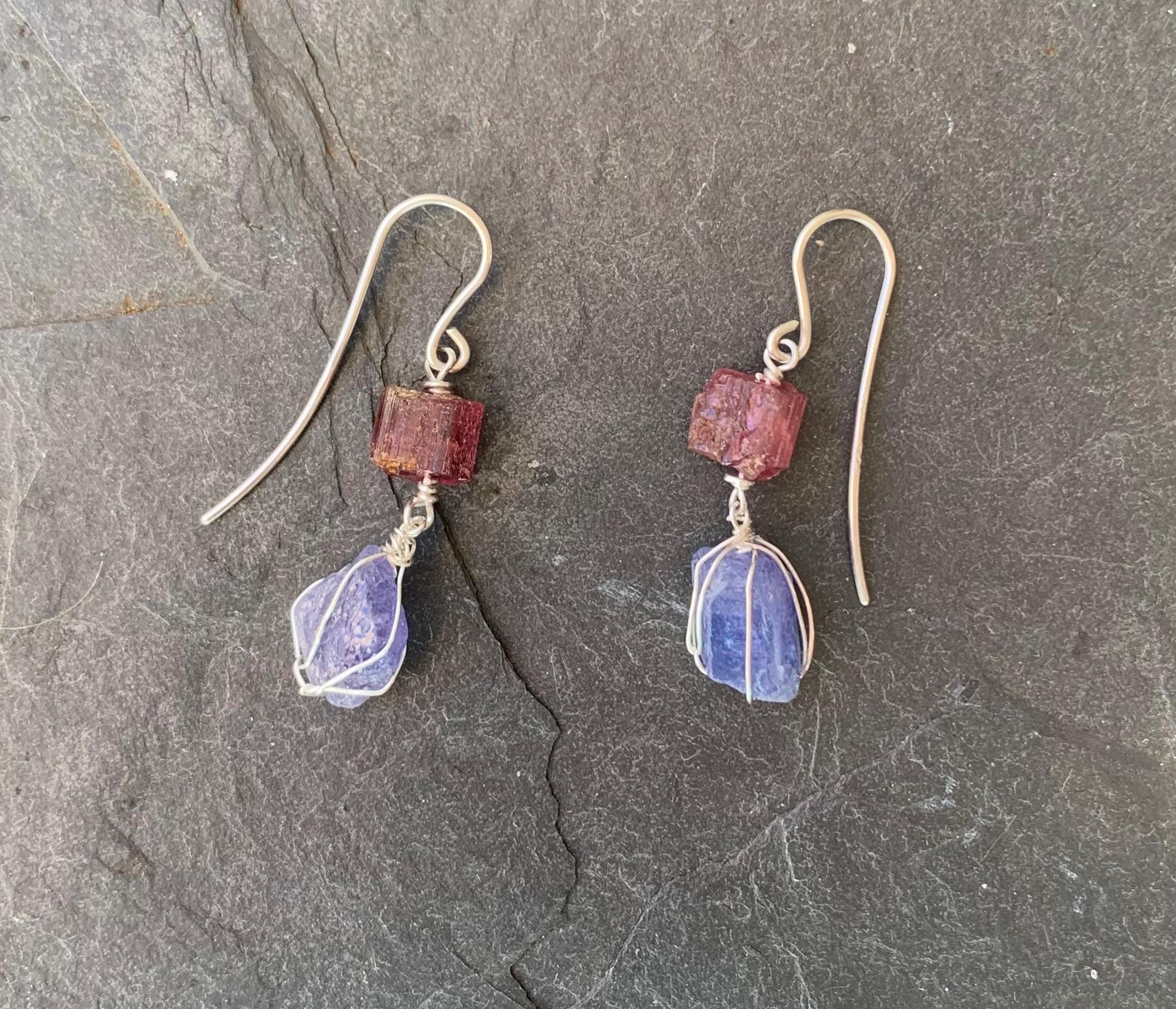 The earrings are done with 2 rough tourmalines and 2 rough tanzanites wrapped in silver wire and hanging on silver wire.