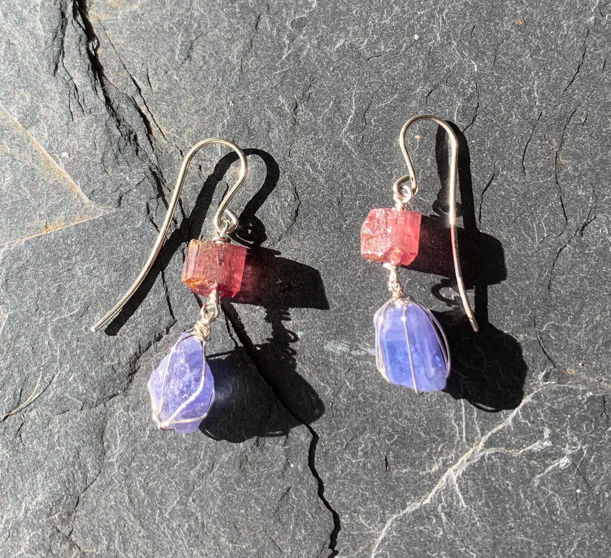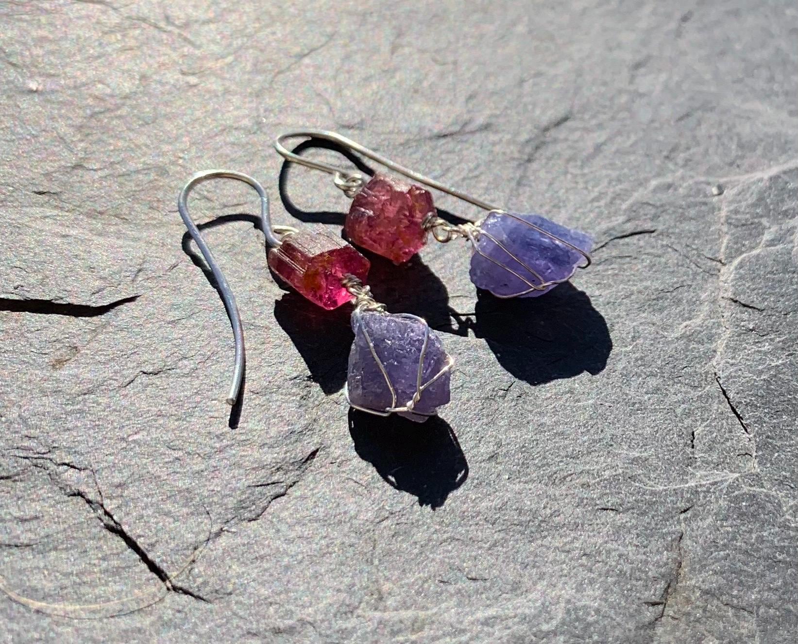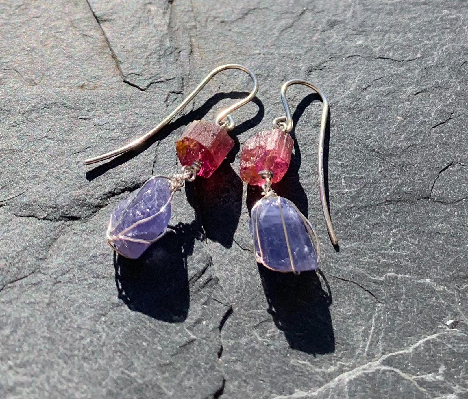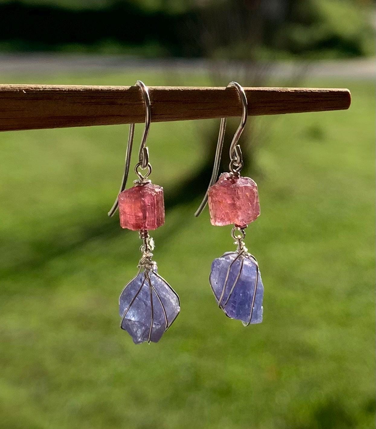 The earrings are done with 2 rough tourmalines and 2 rough tanzanites wrapped in silver wire and hanging on silver wire.