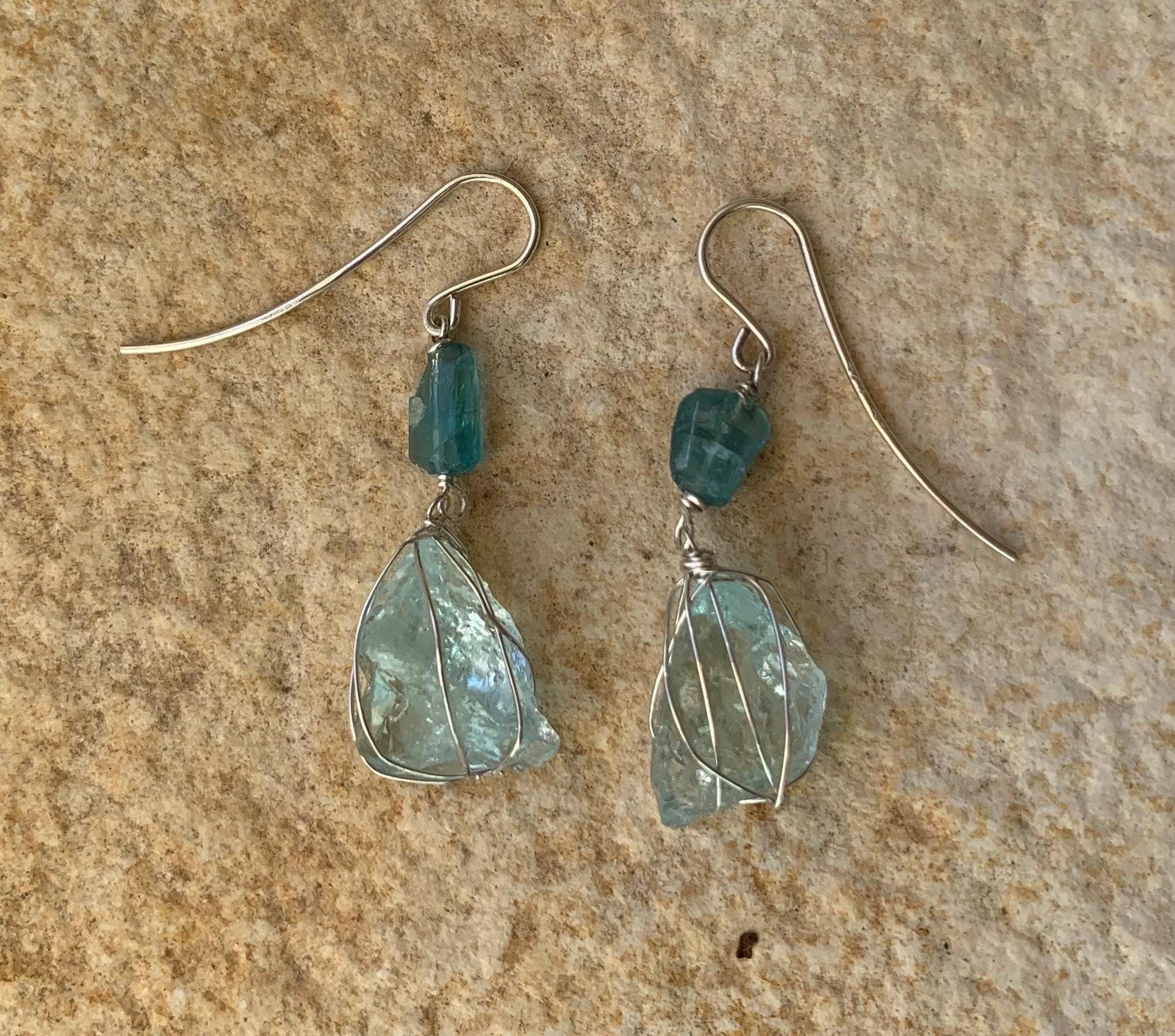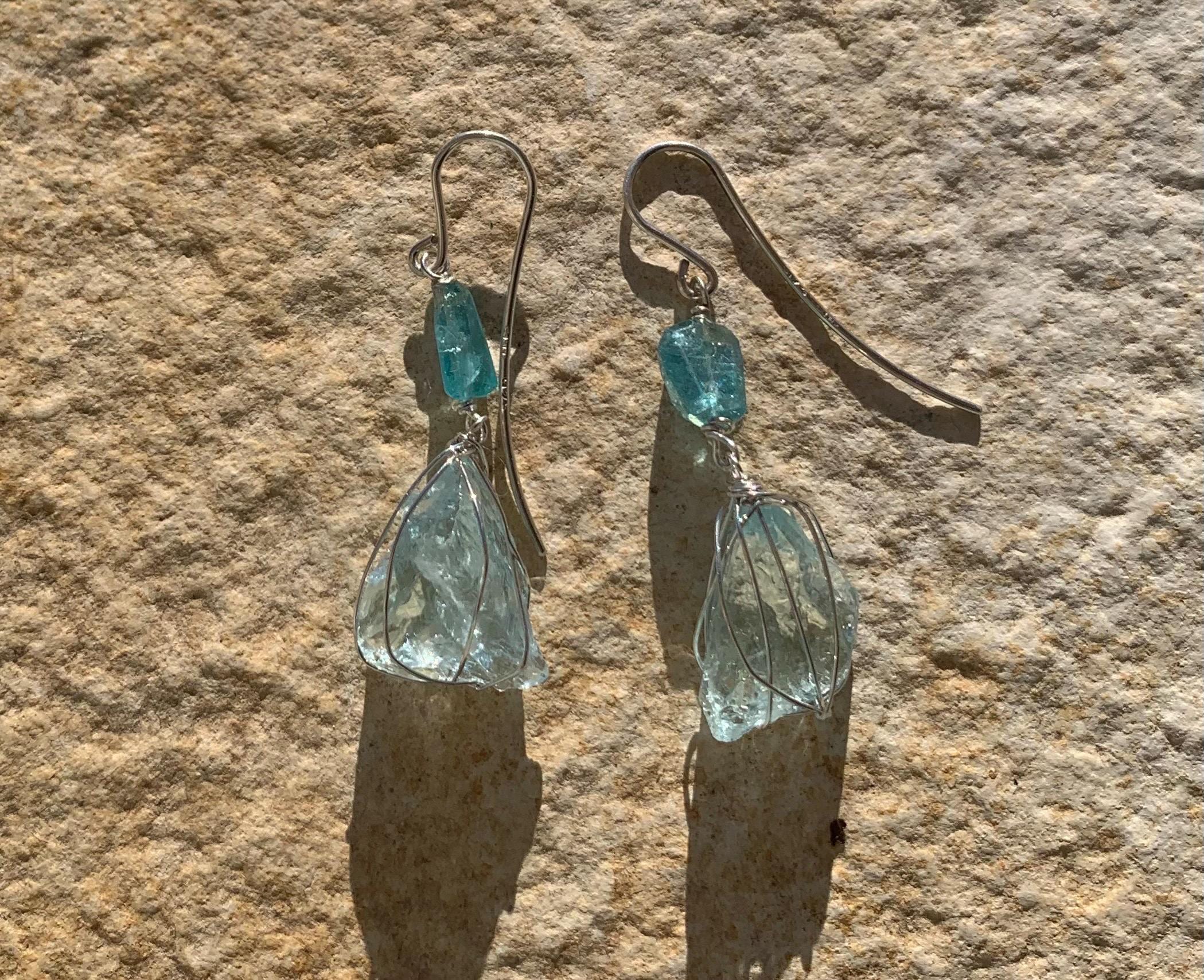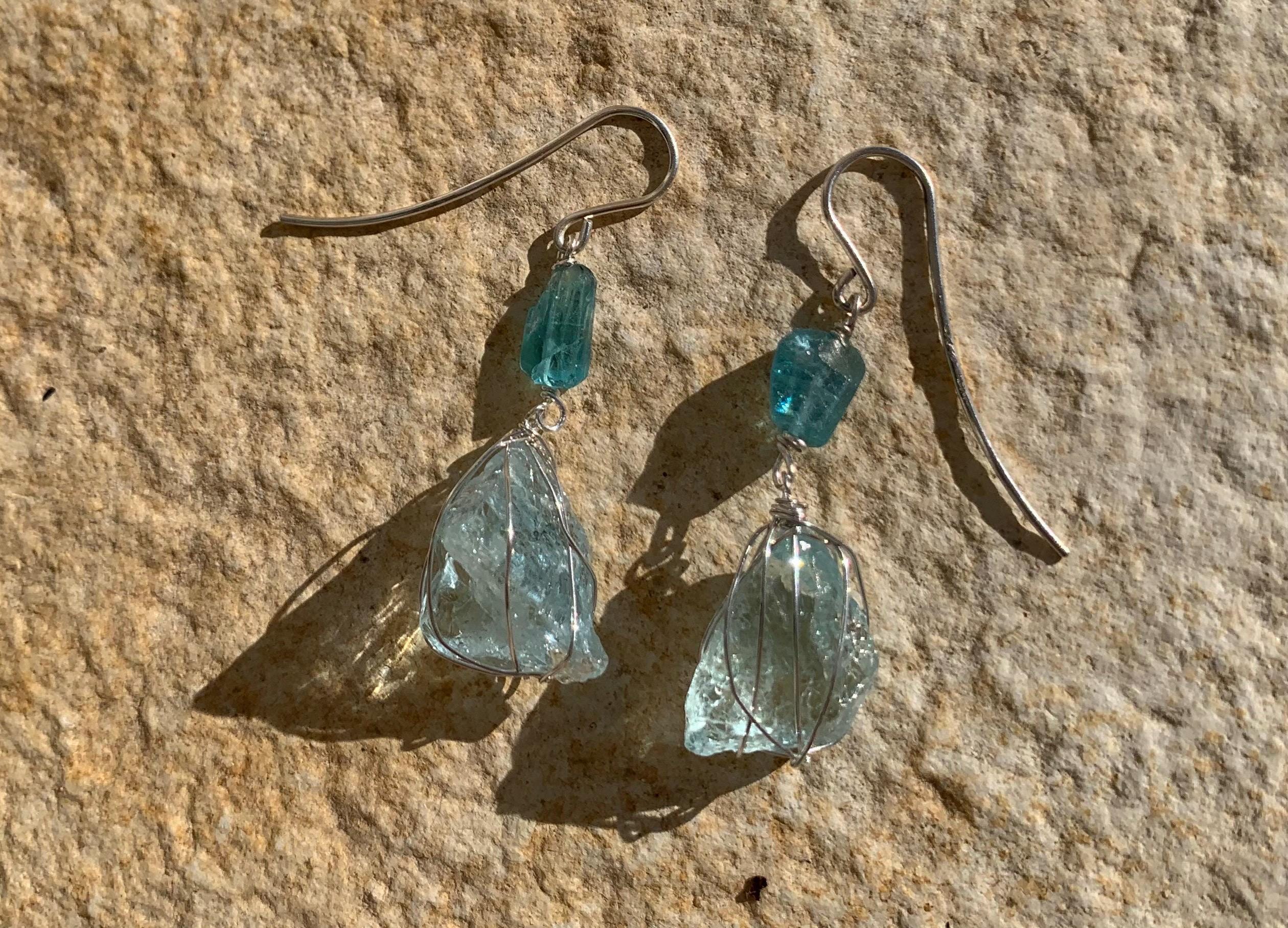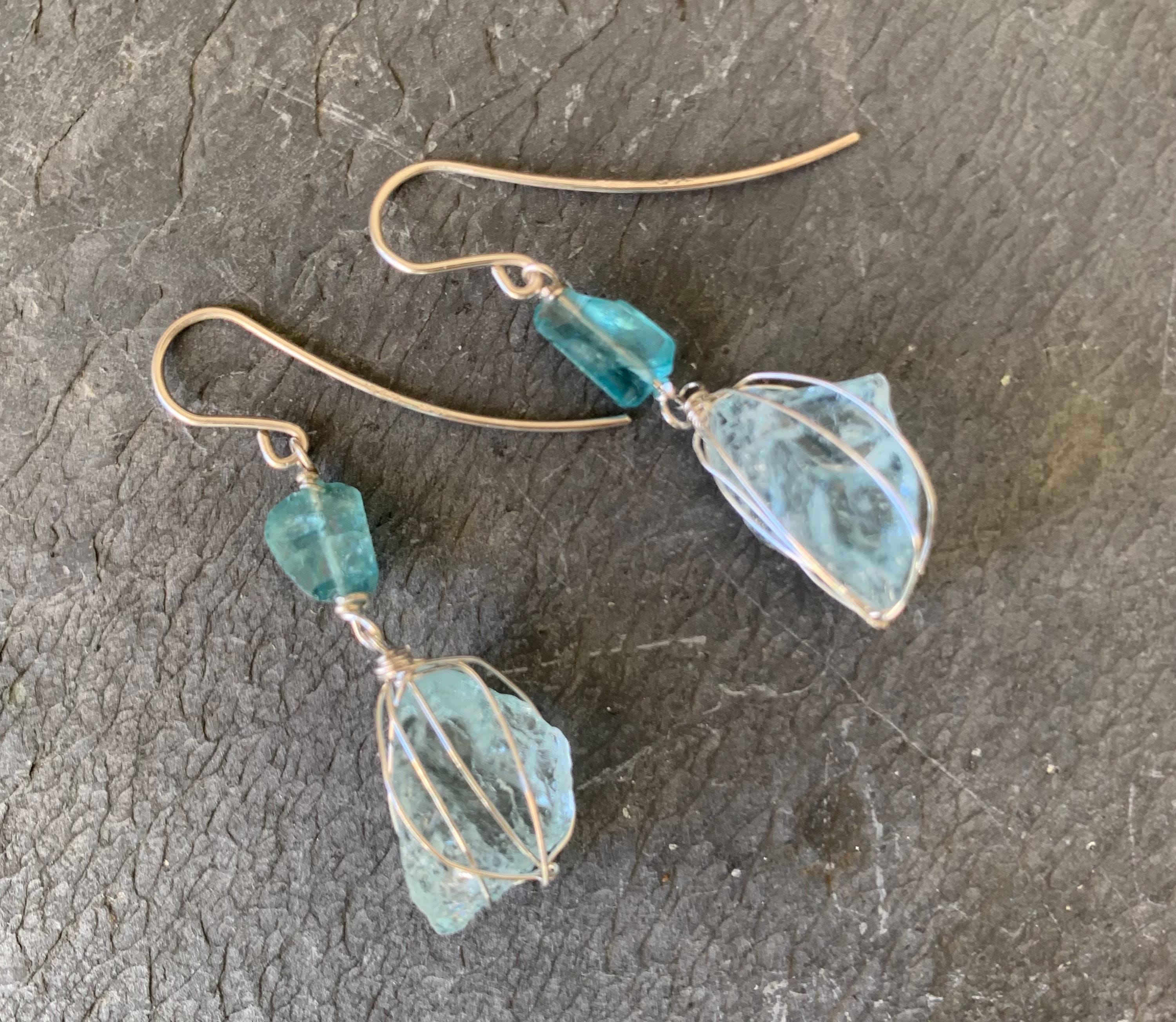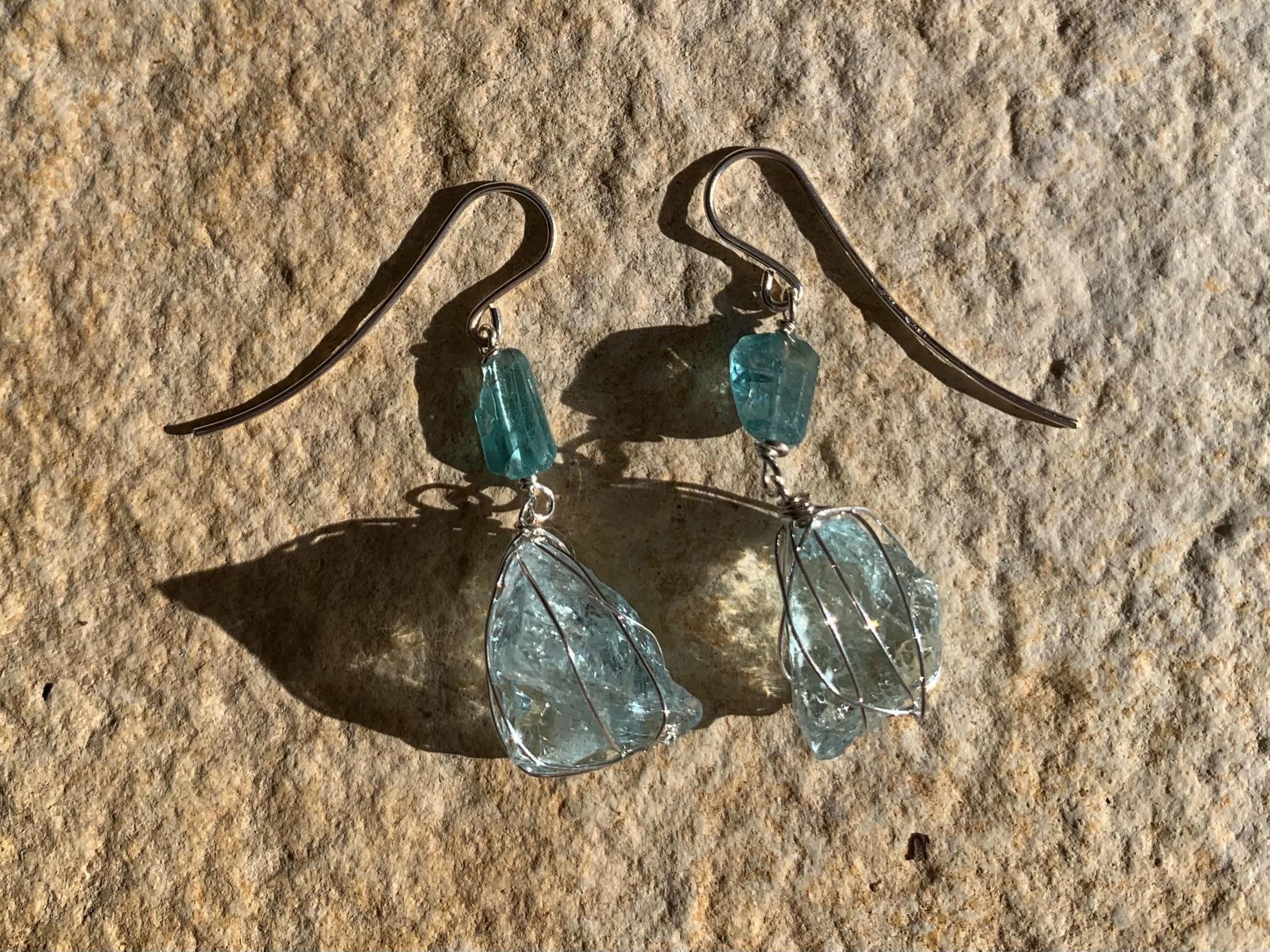 They are done in solid silver with rough apatites and rough aquamarines wrapped in silver wire.