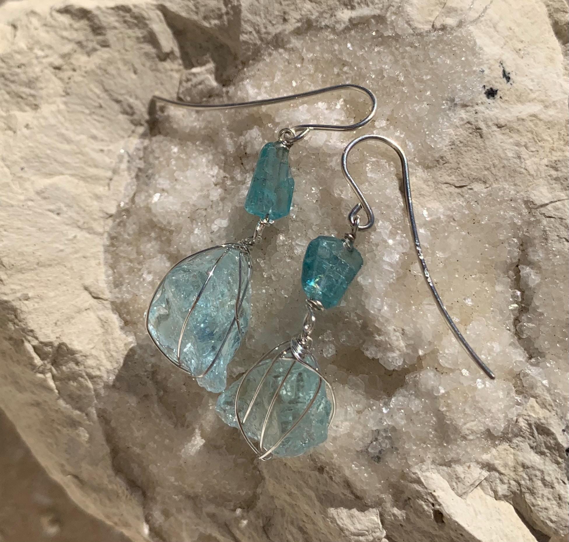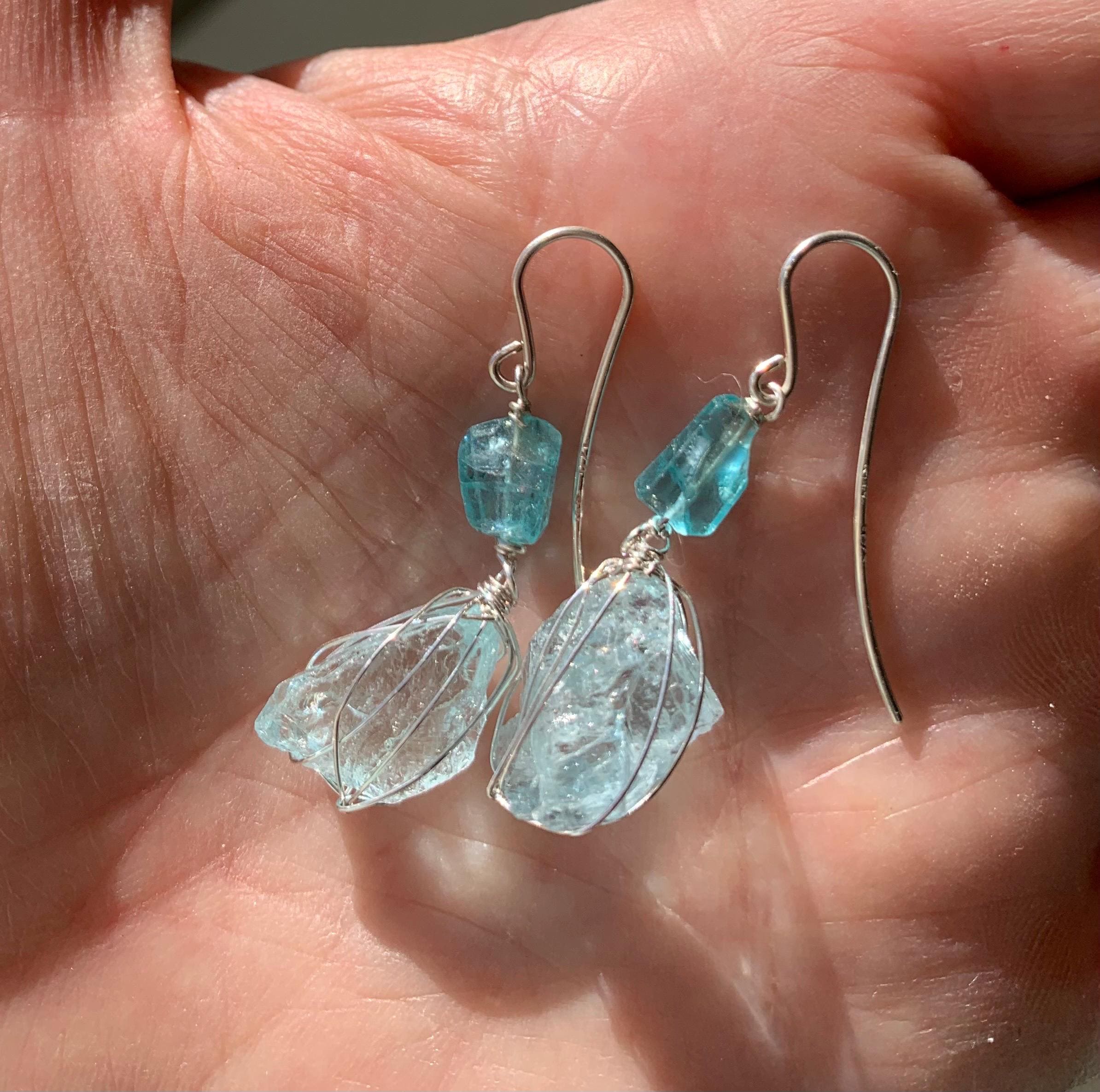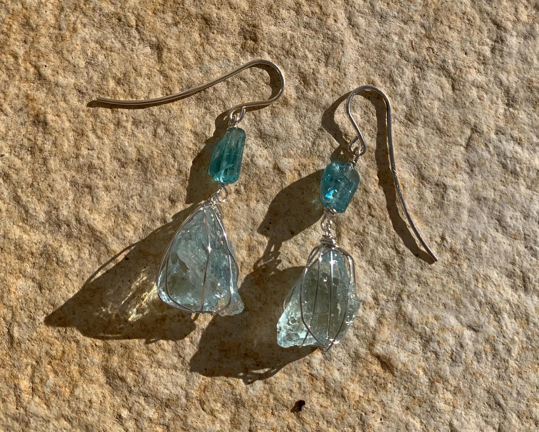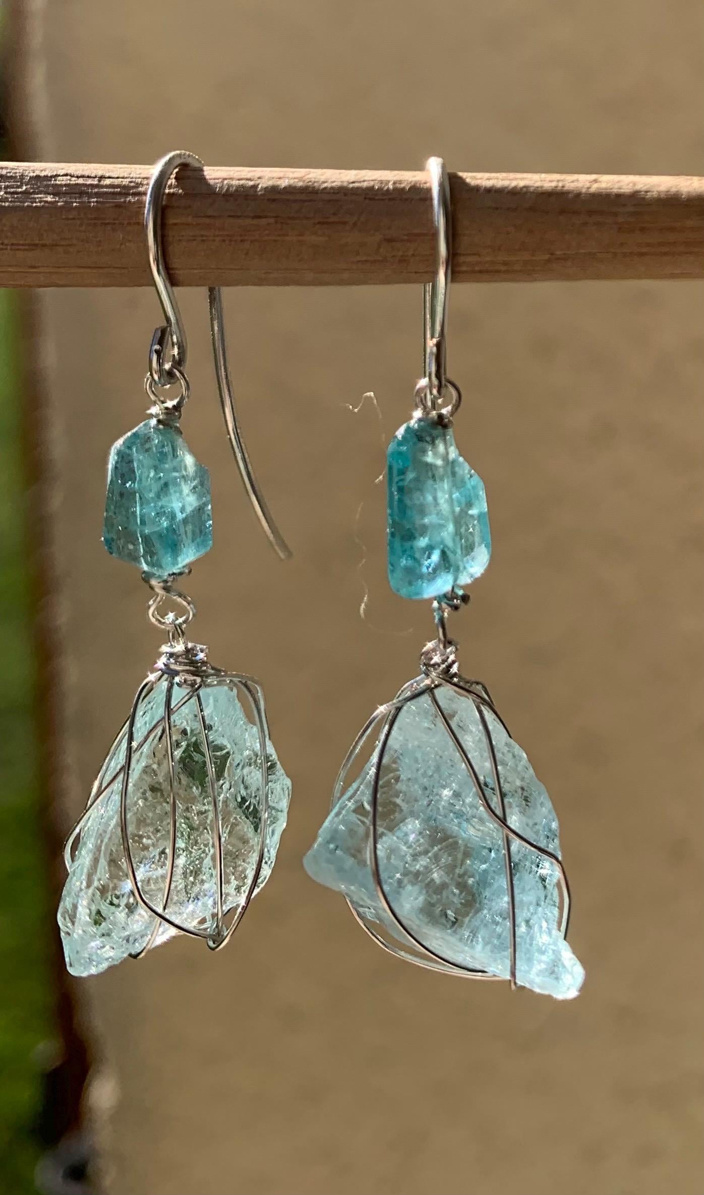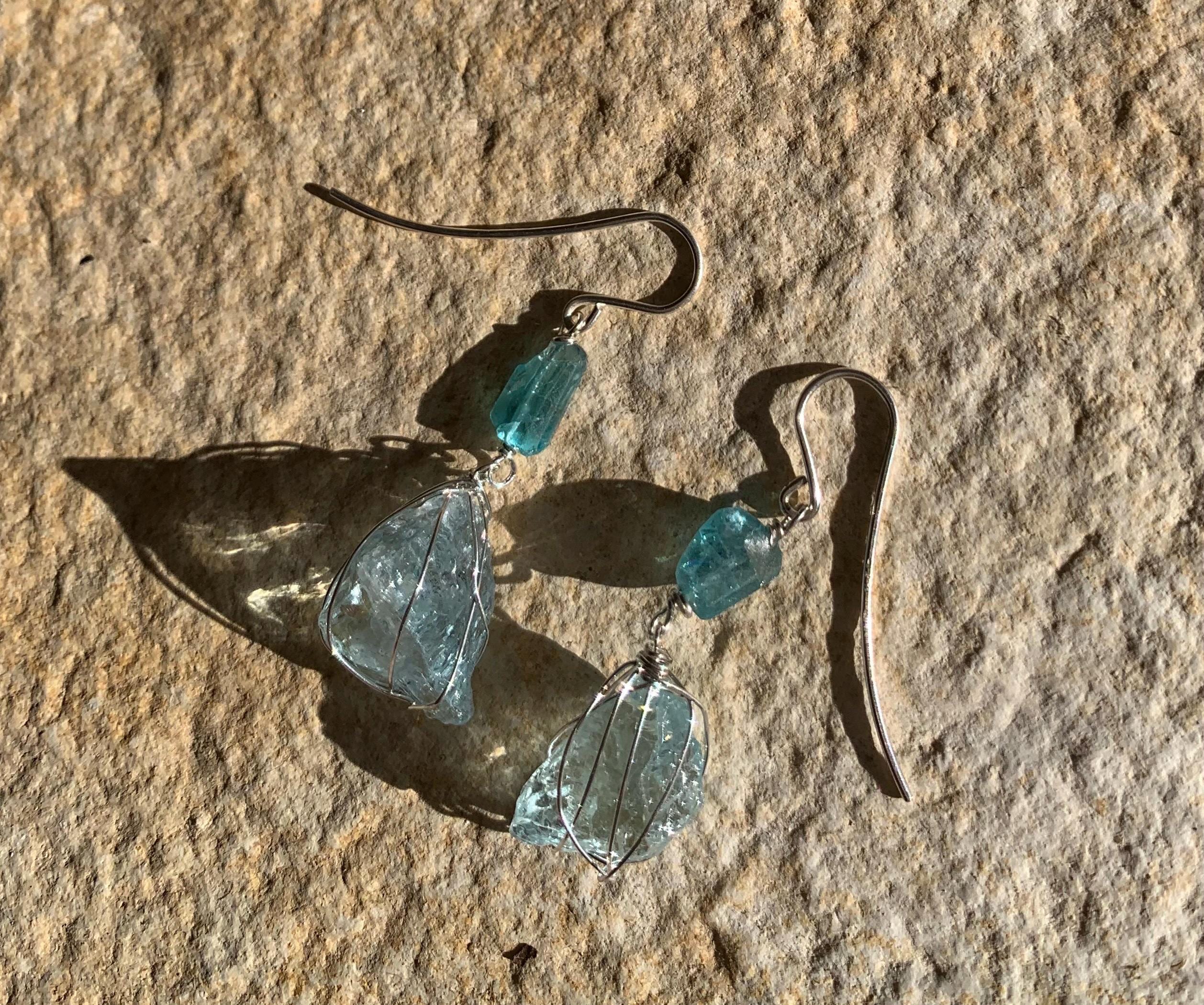 They are done in solid silver with rough apatites and rough aquamarines wrapped in silver wire.