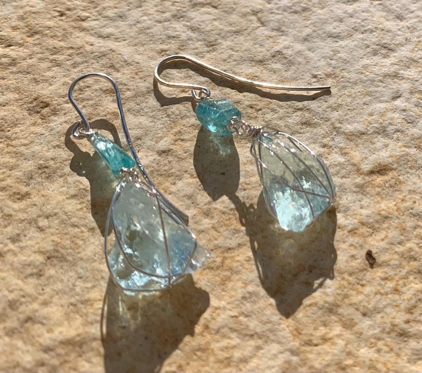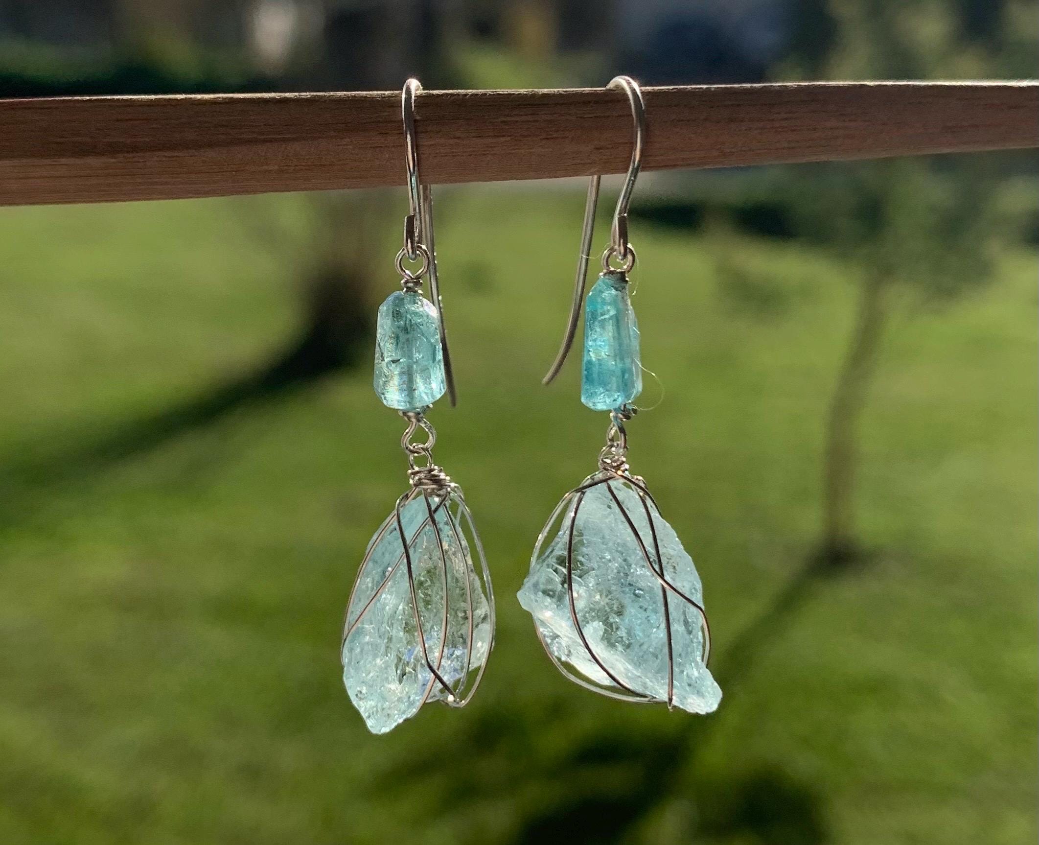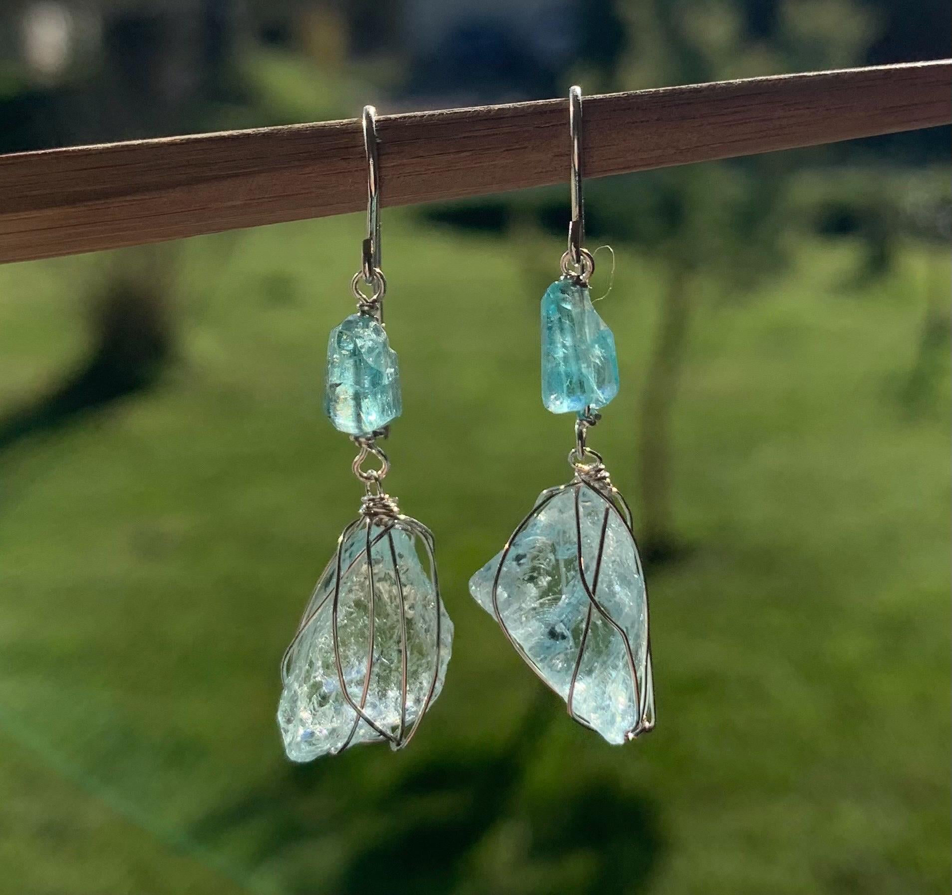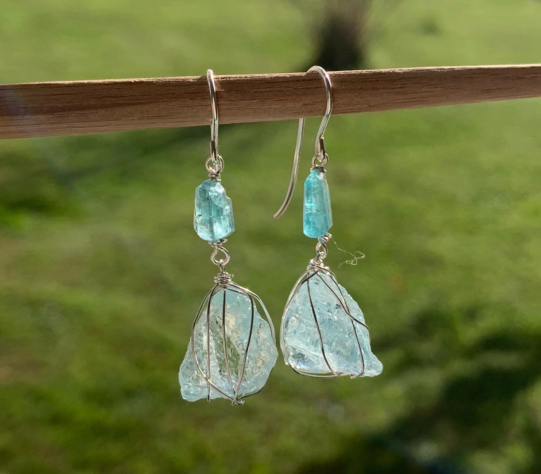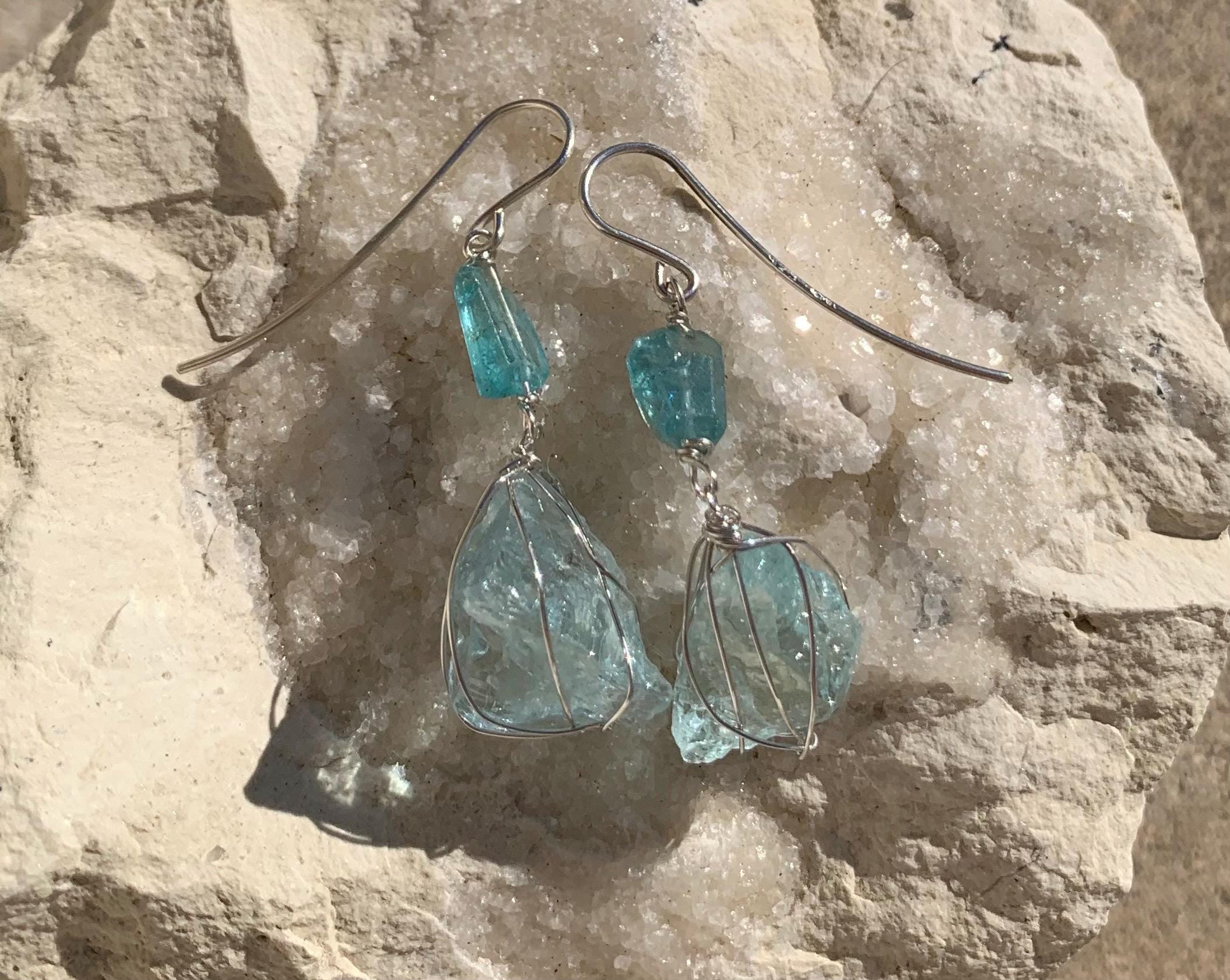 They are done in solid silver with rough apatites and rough aquamarines wrapped in silver wire.