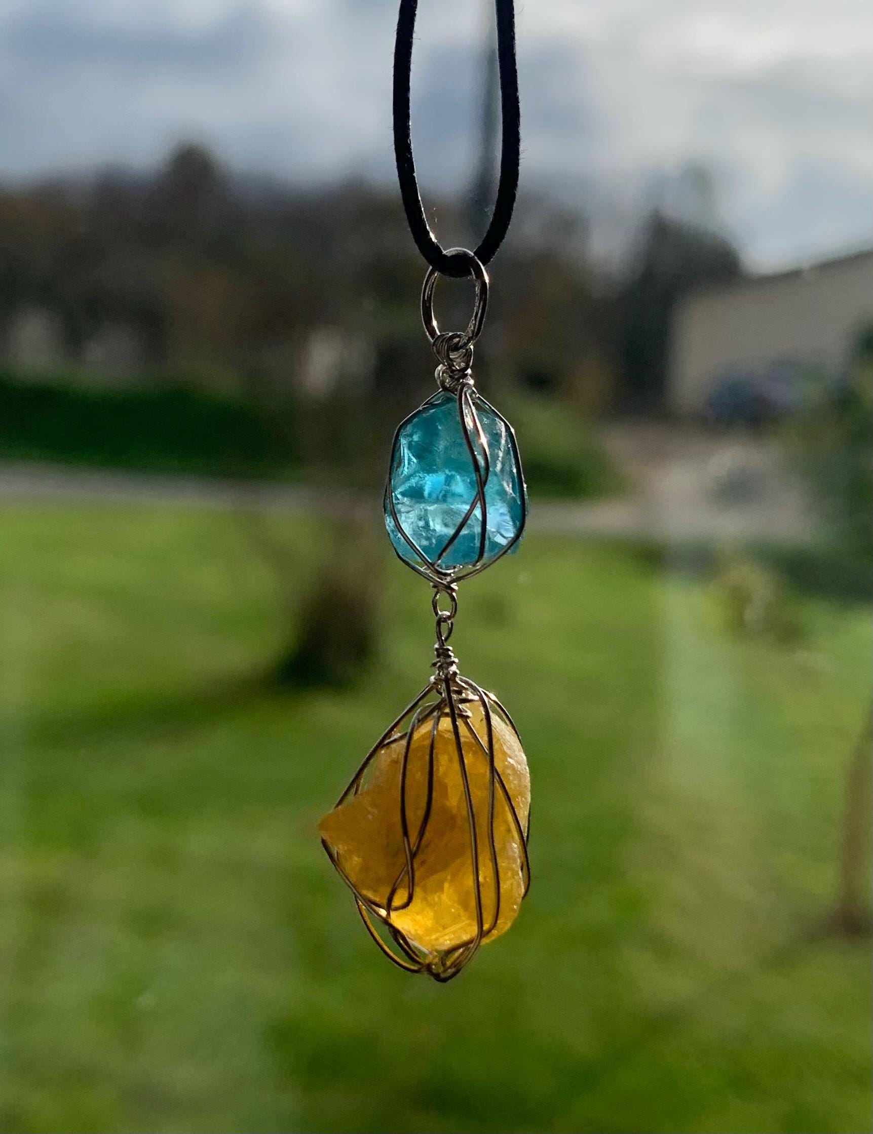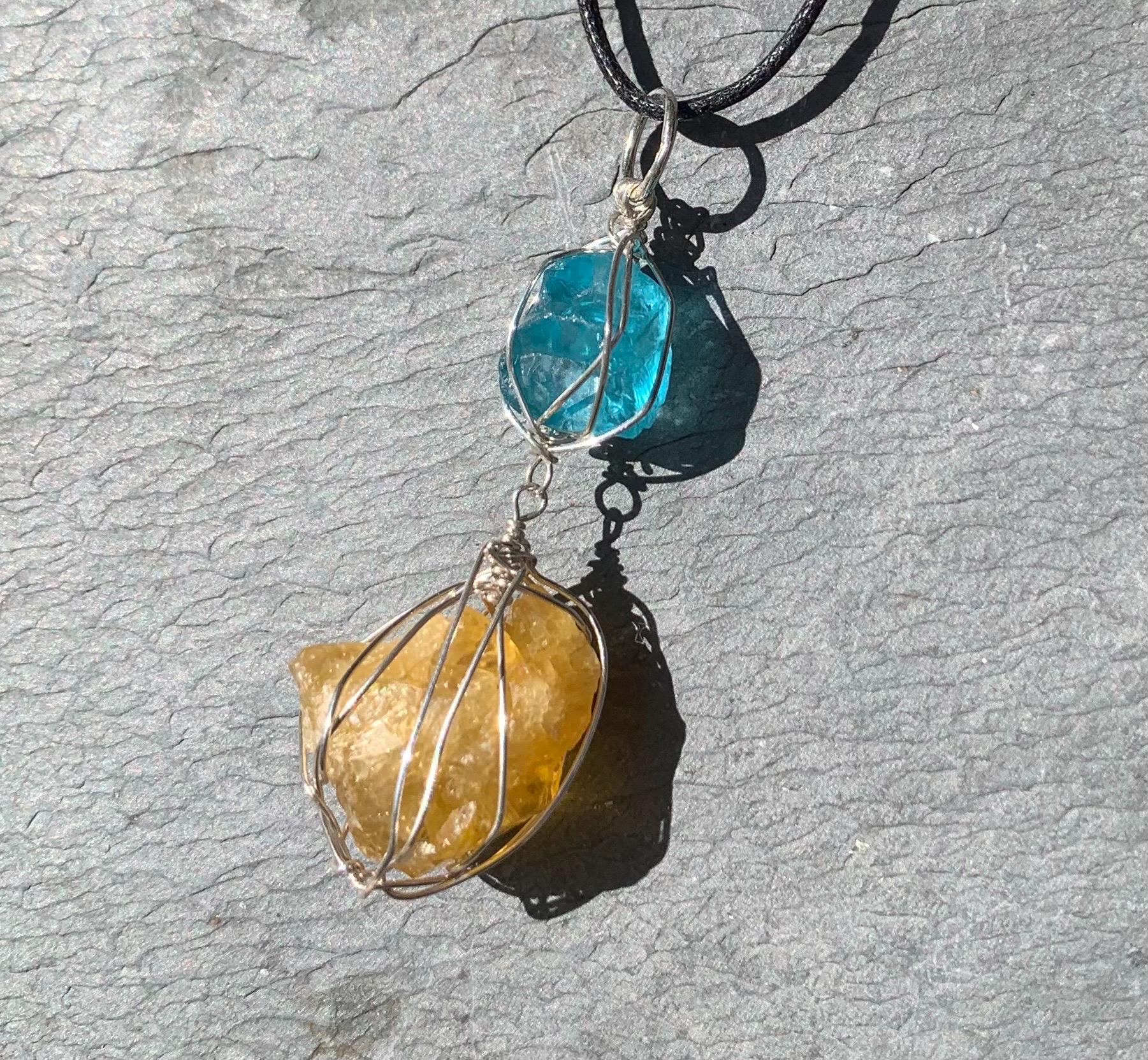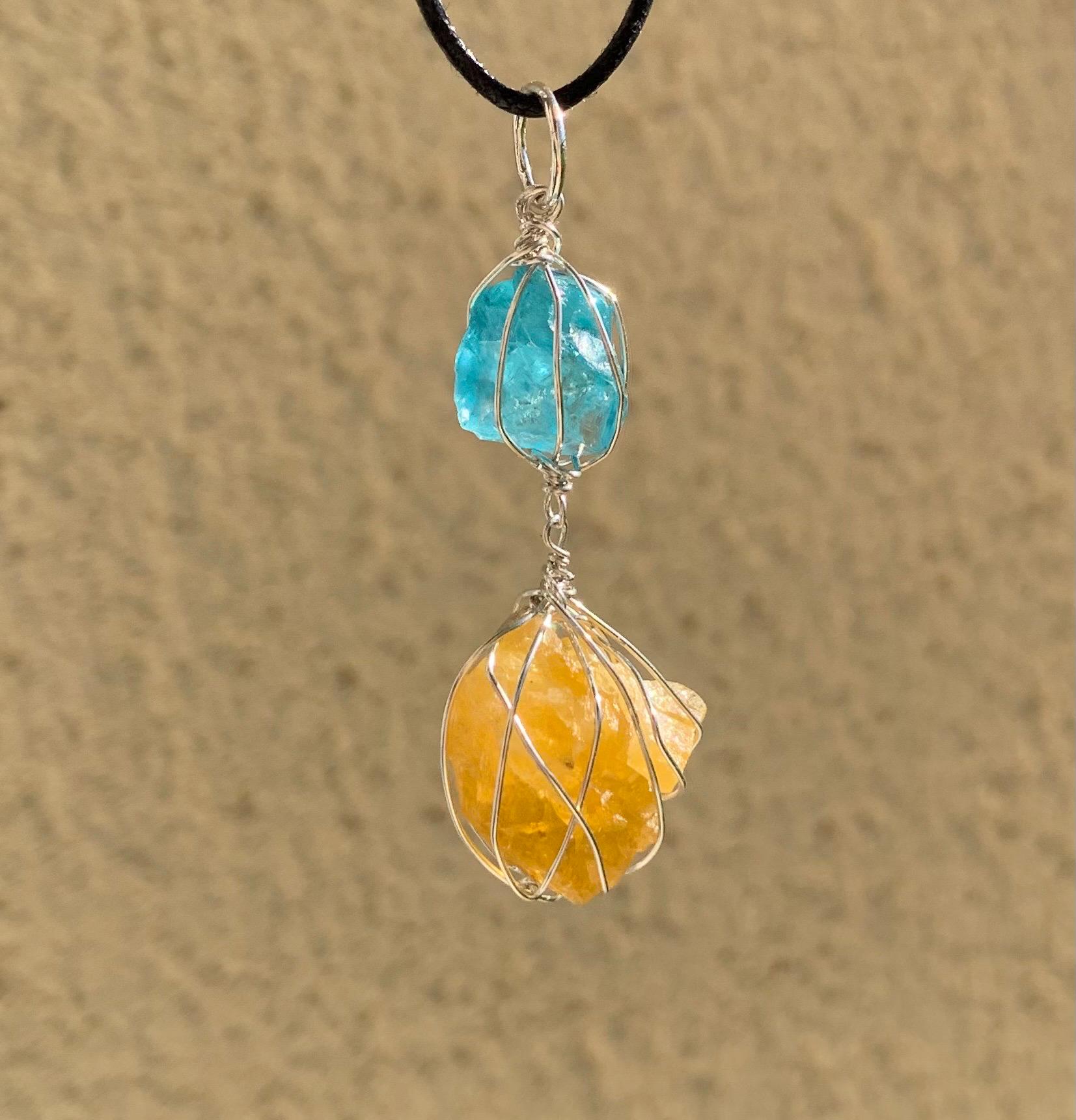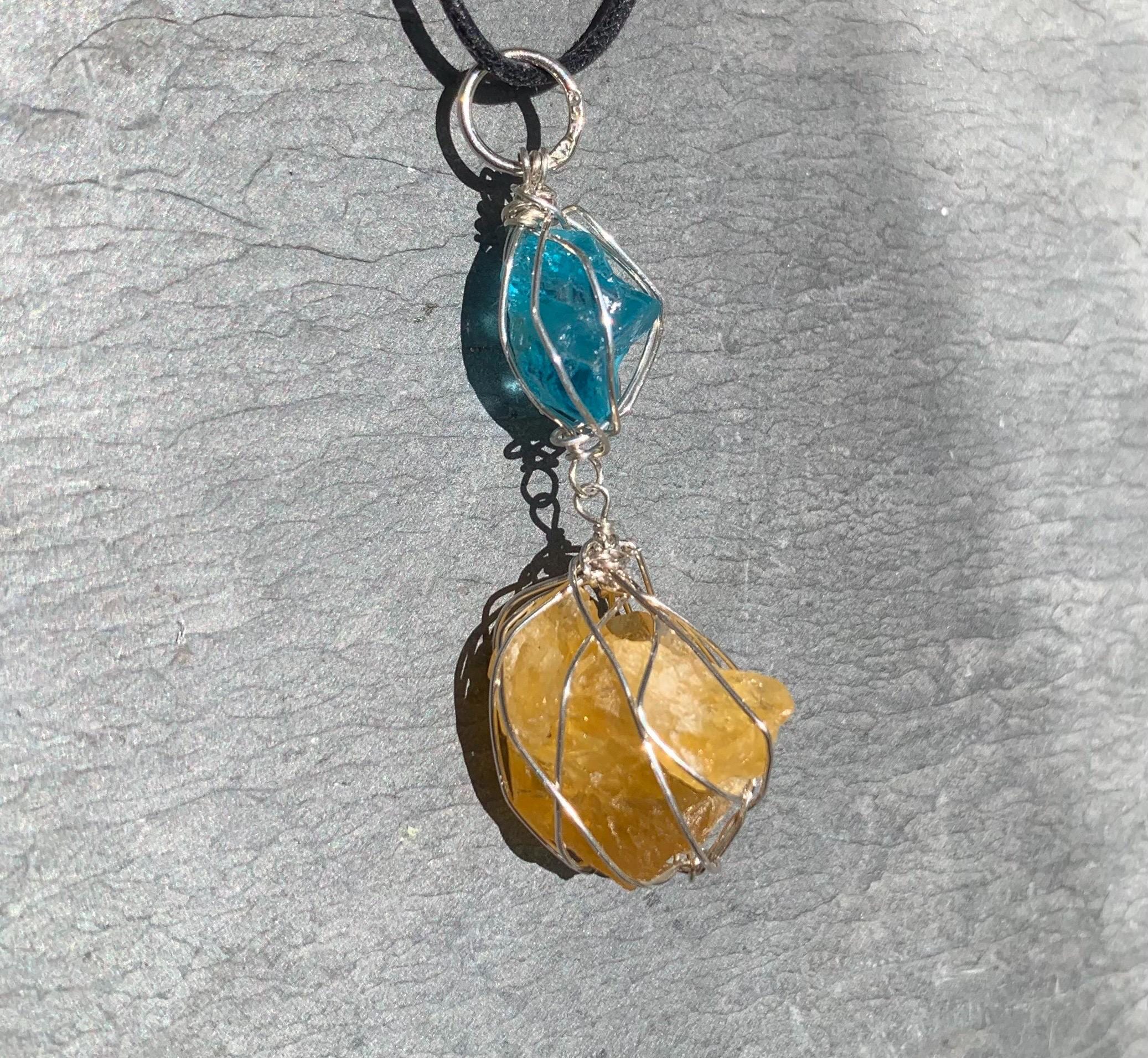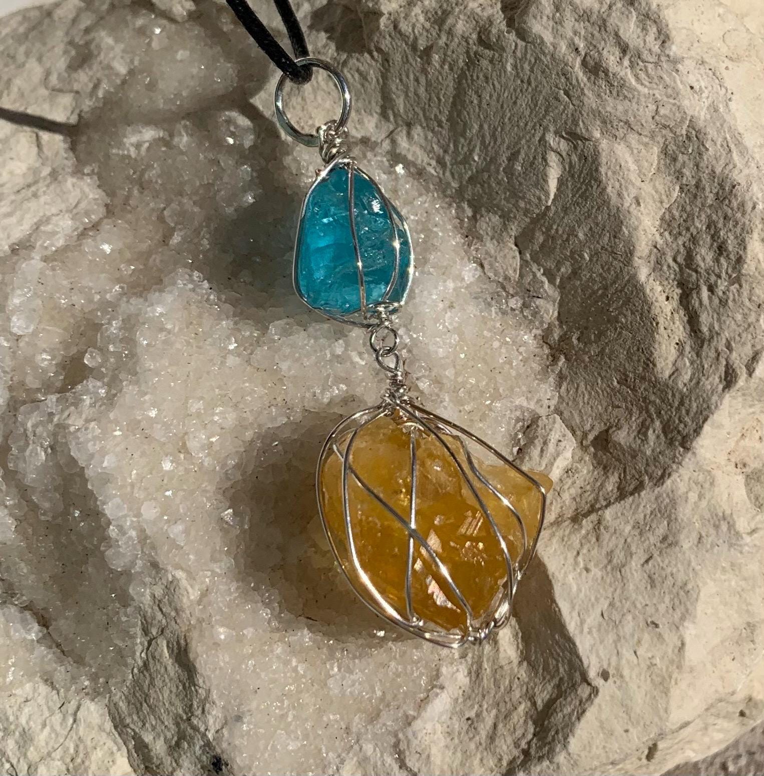 It is done in solid silver with a rough apatit and a rough, yellow fluorite from France, wrapped in silver wire.