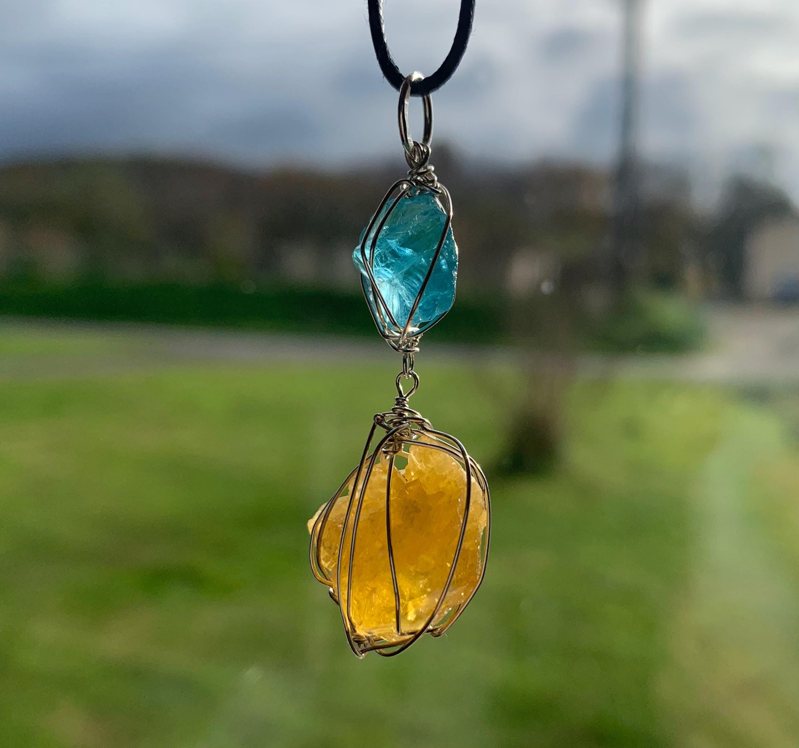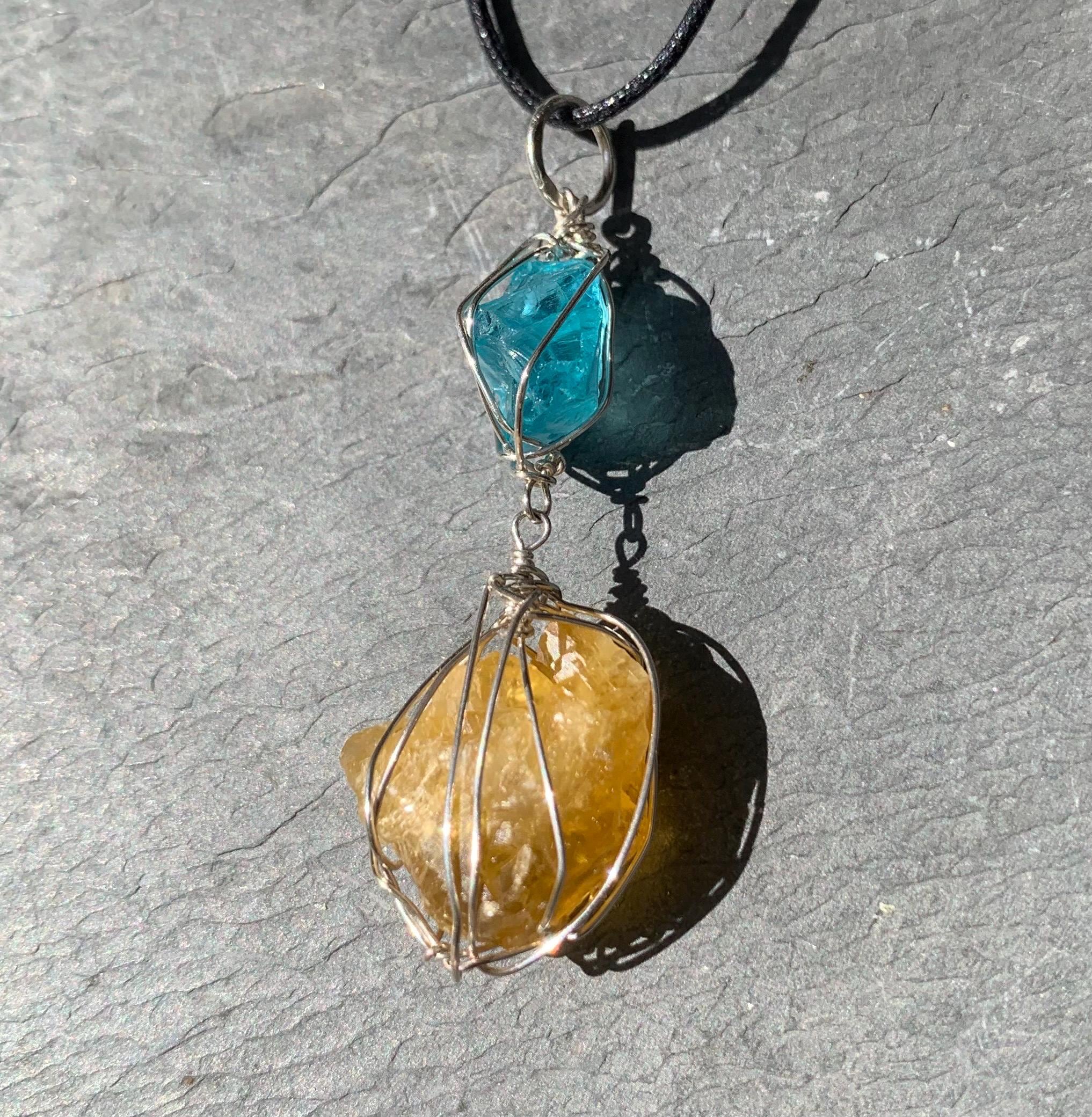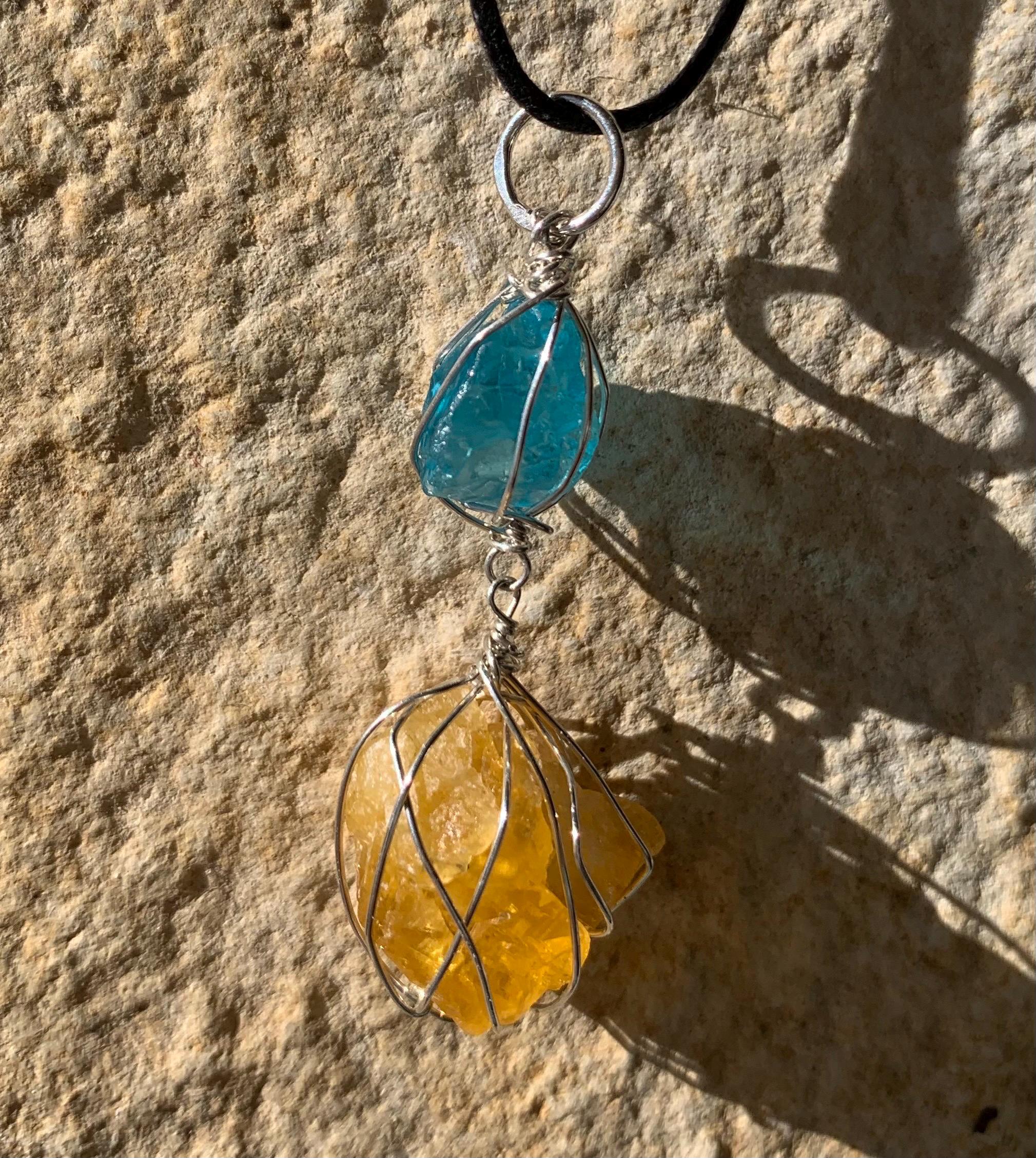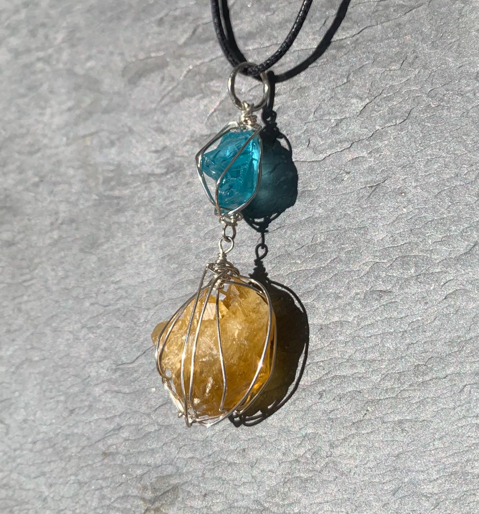 It is done in solid silver with a rough apatit and a rough, yellow fluorite from France, wrapped in silver wire.