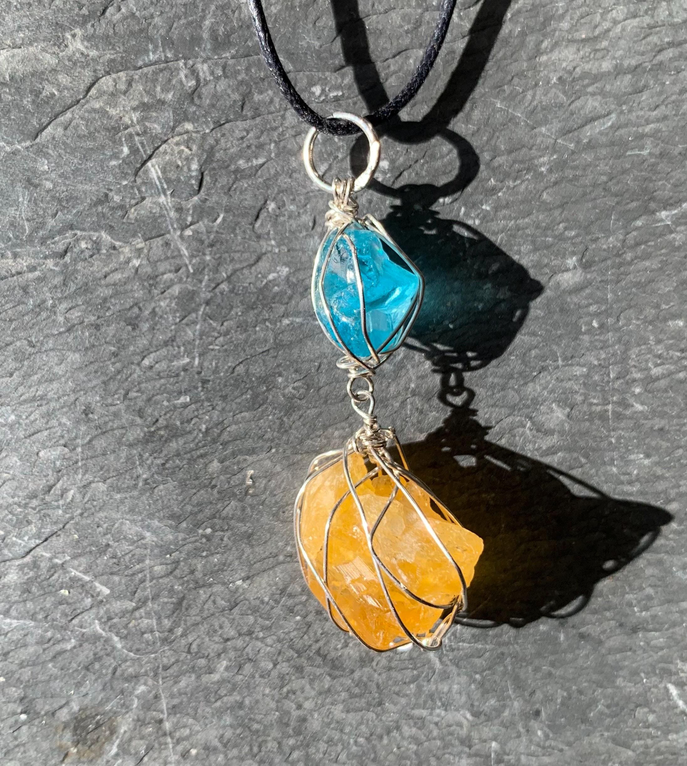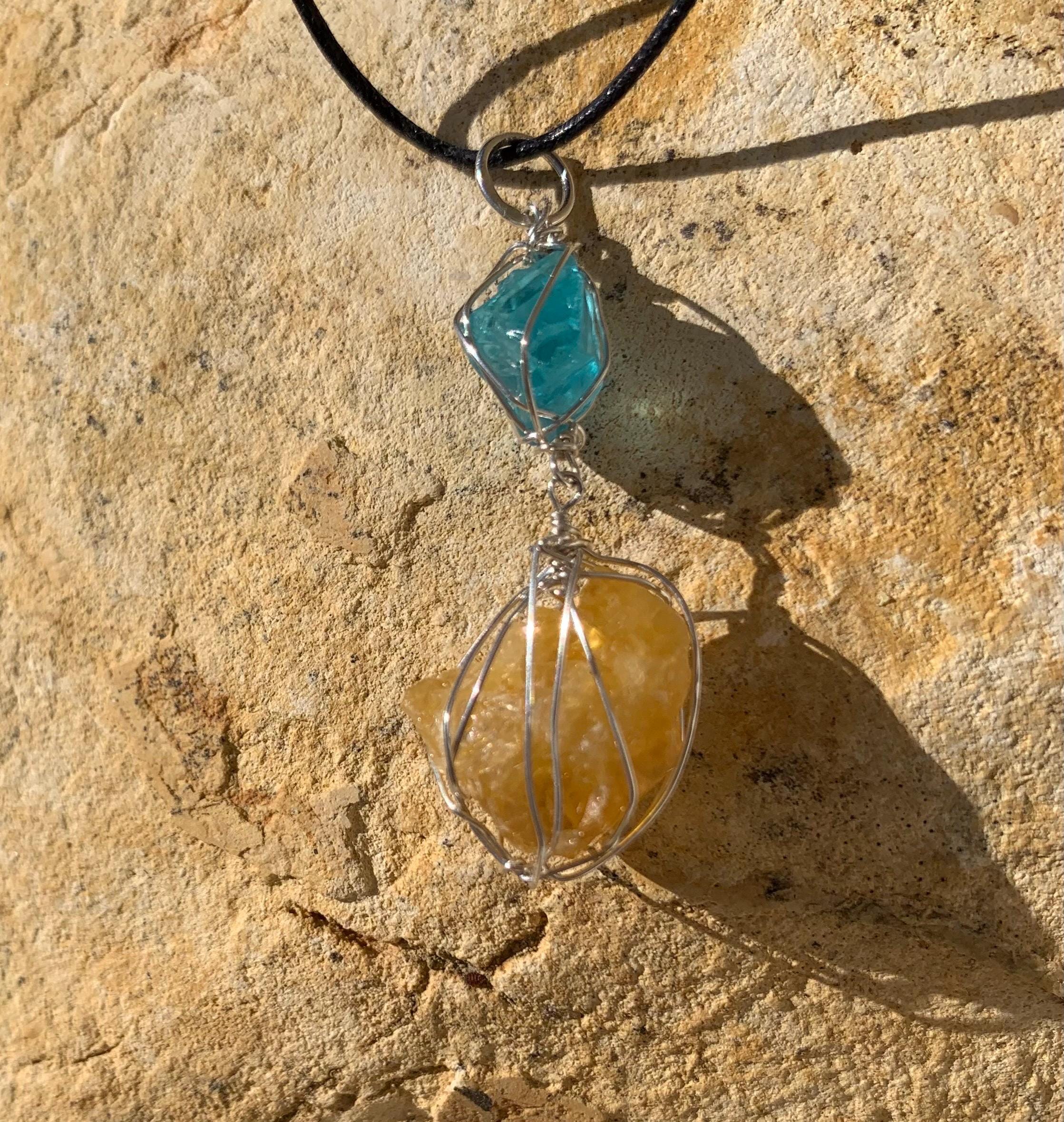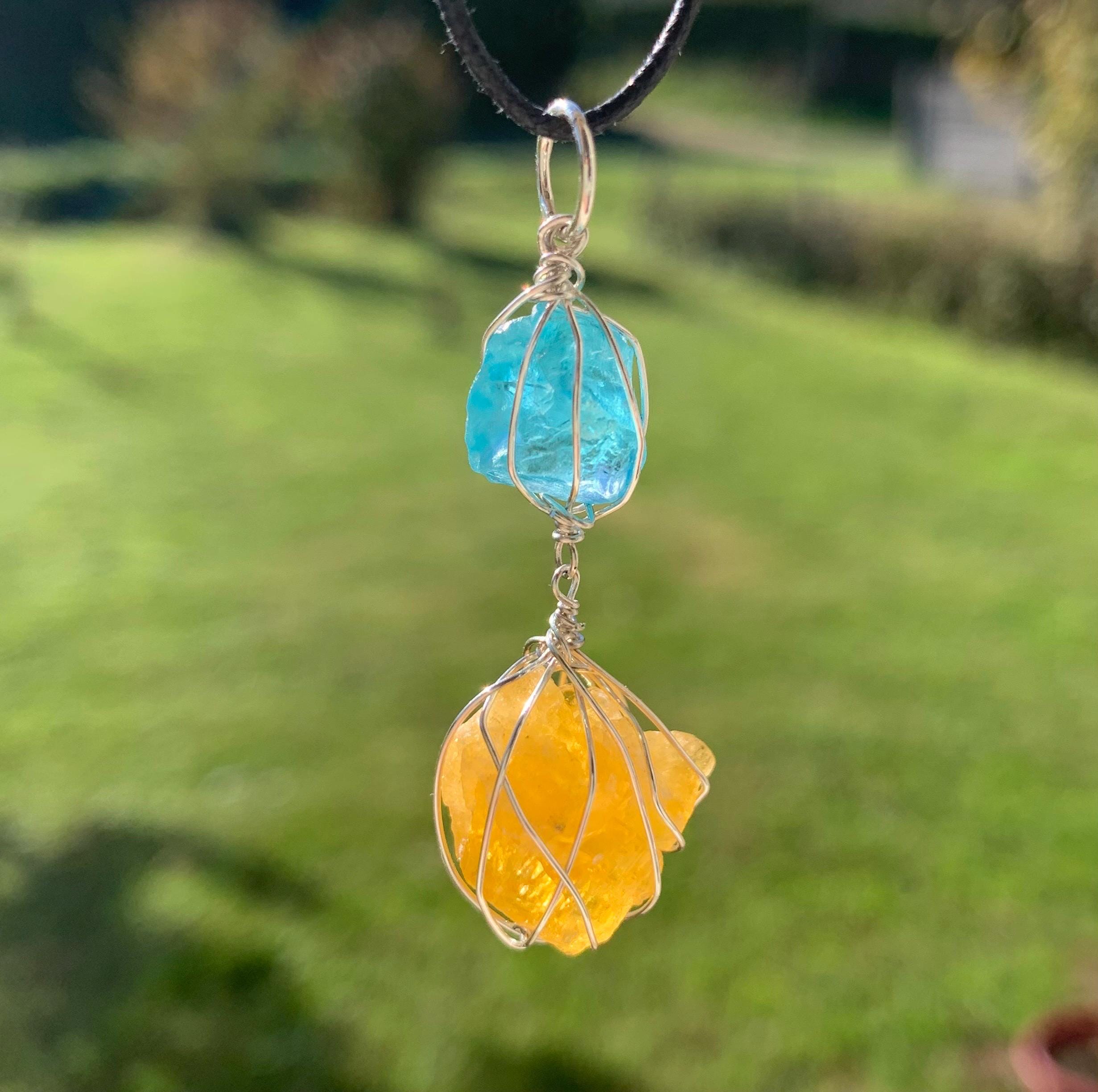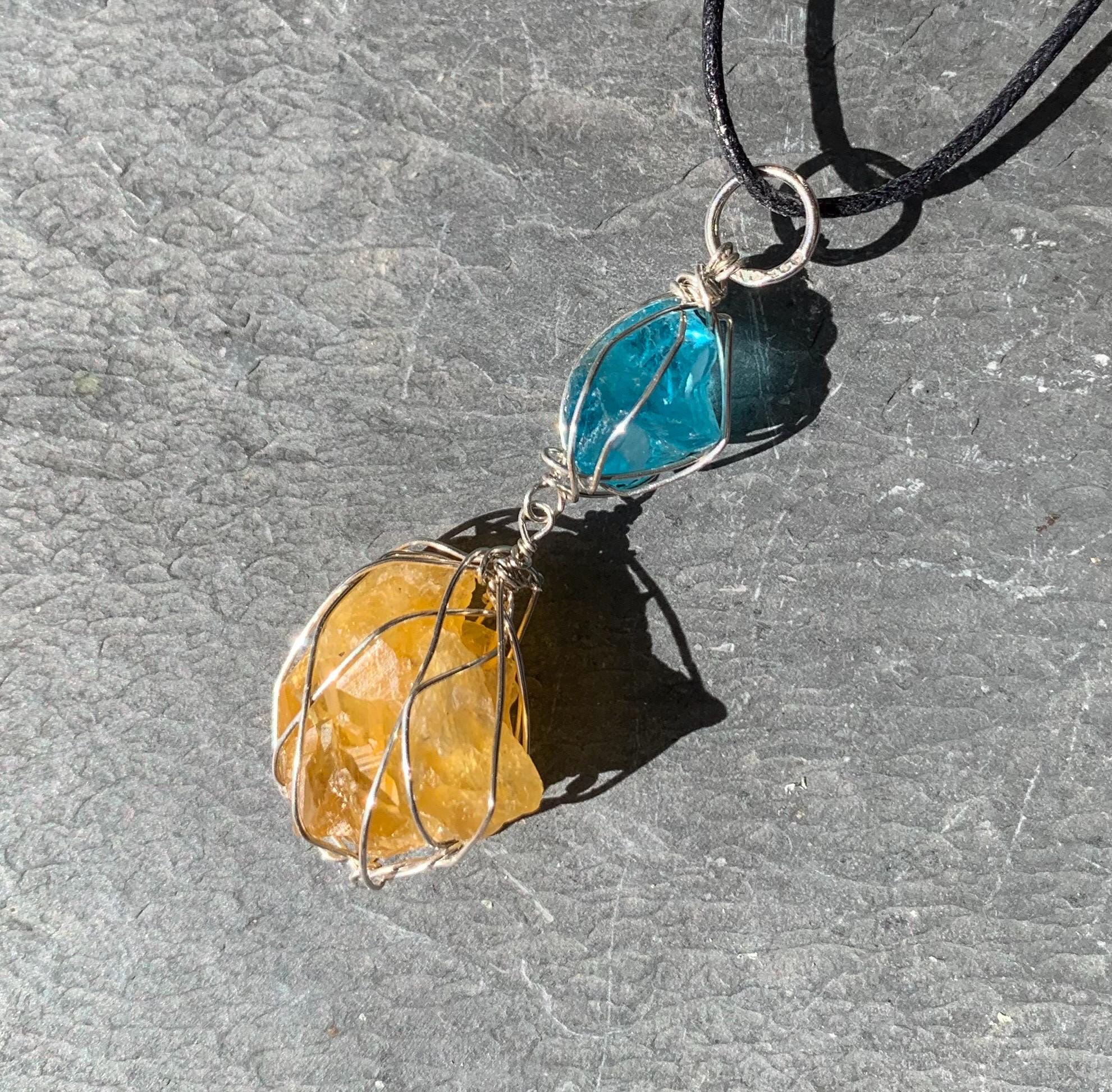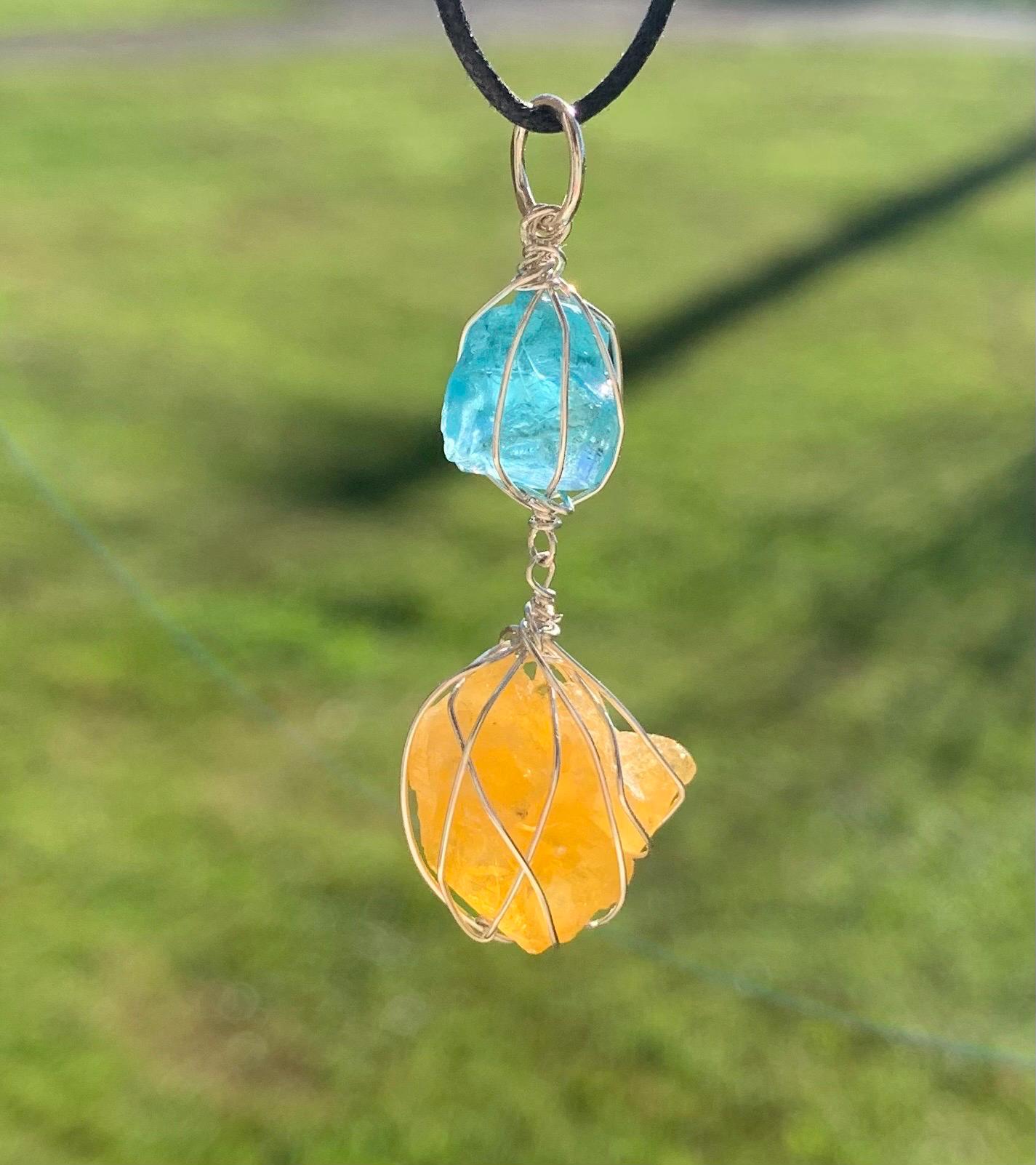 It is done in solid silver with a rough apatit and a rough, yellow fluorite from France, wrapped in silver wire.