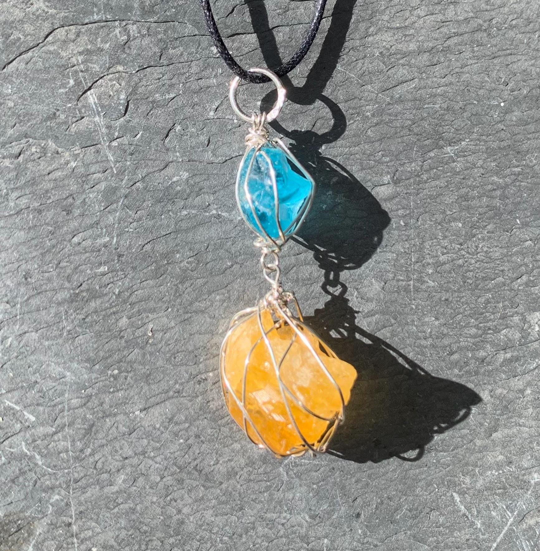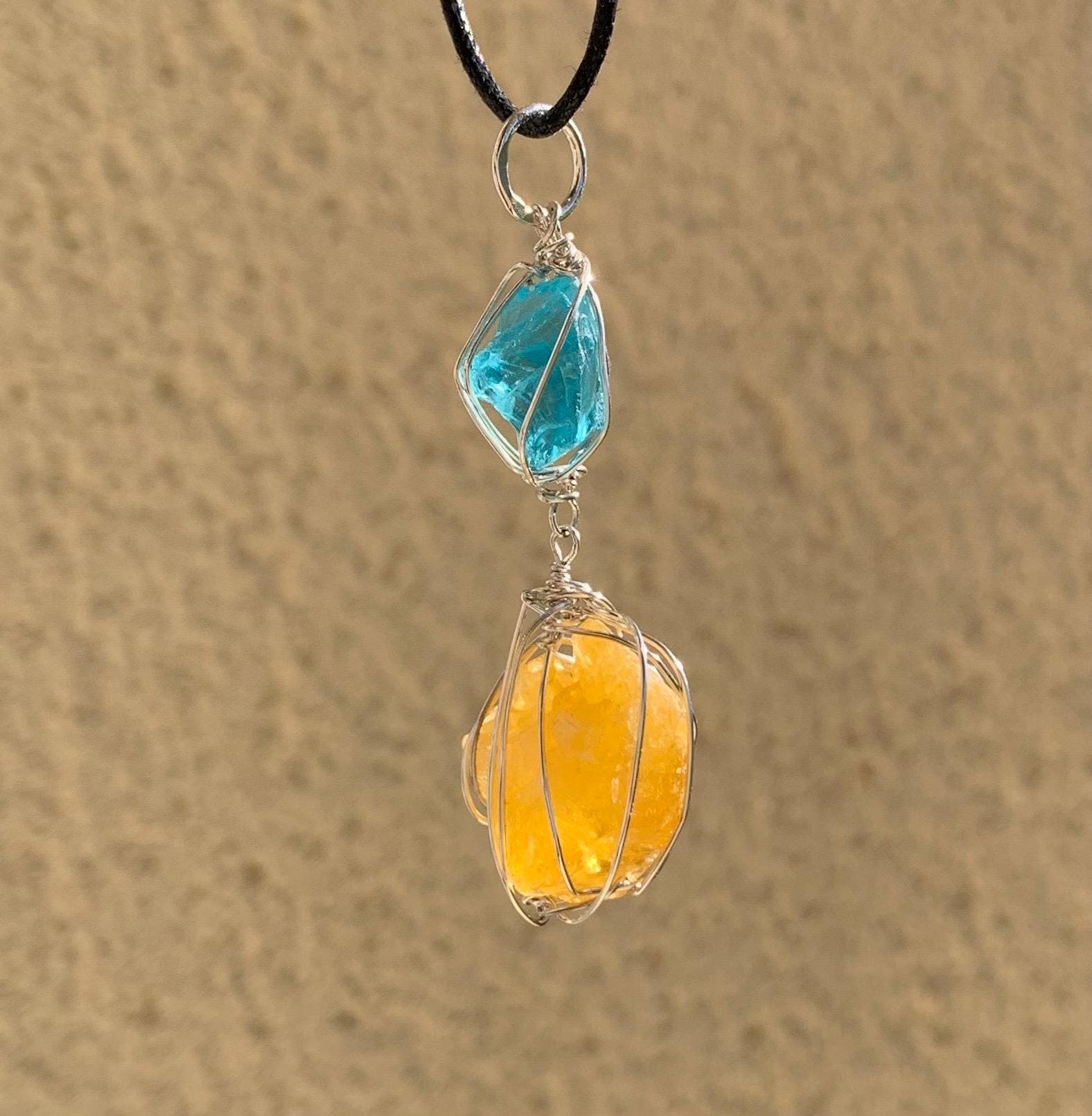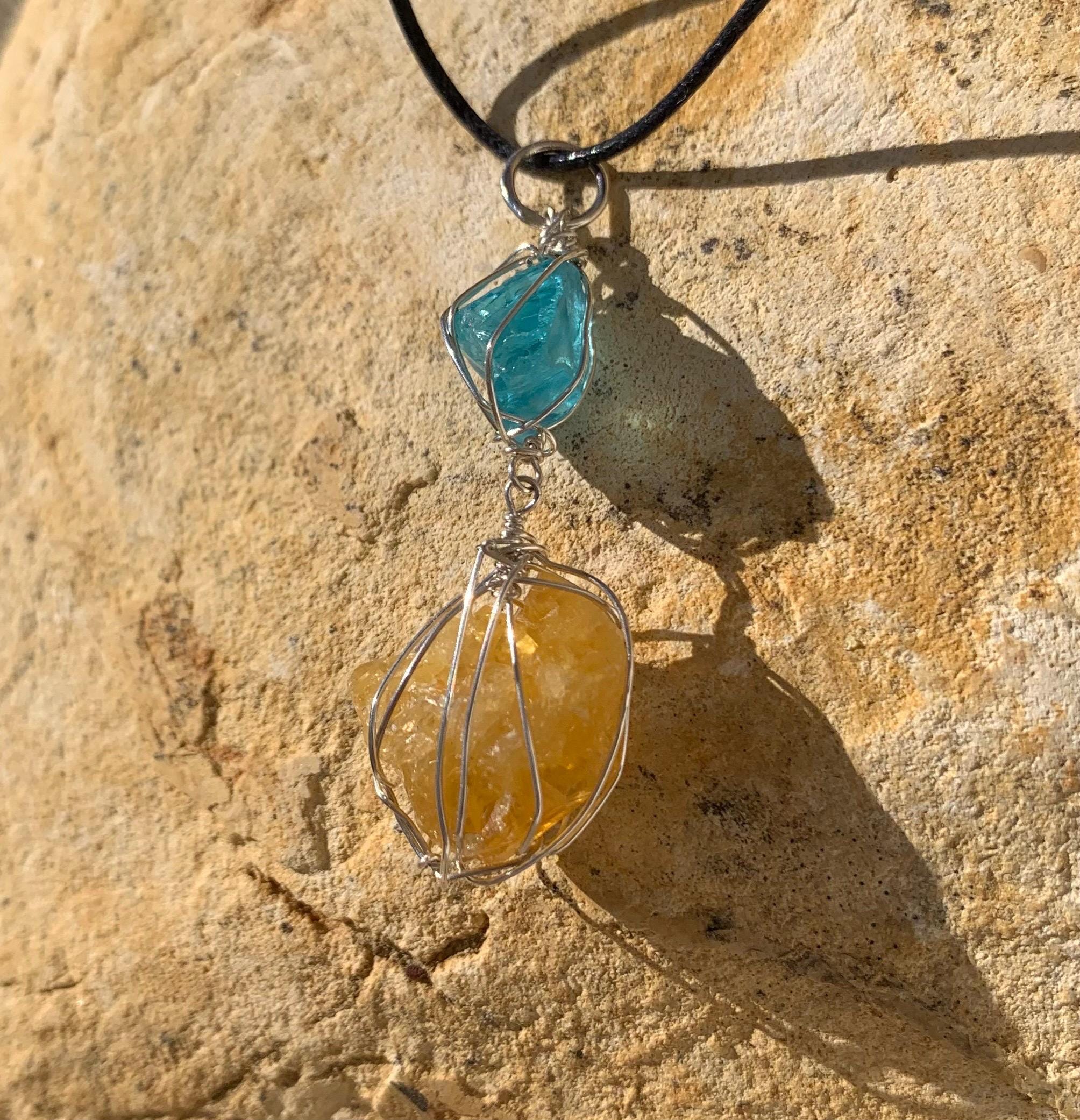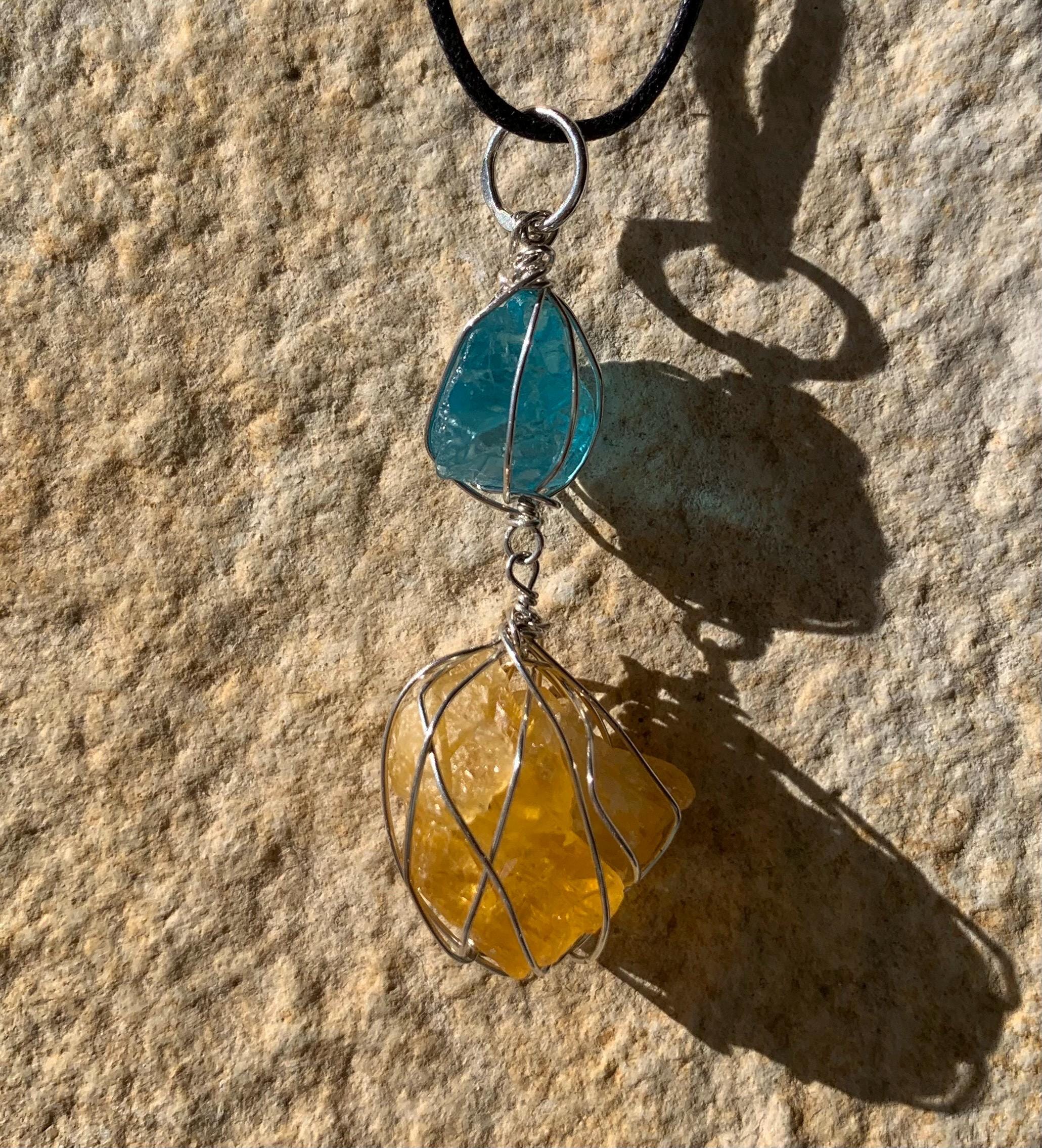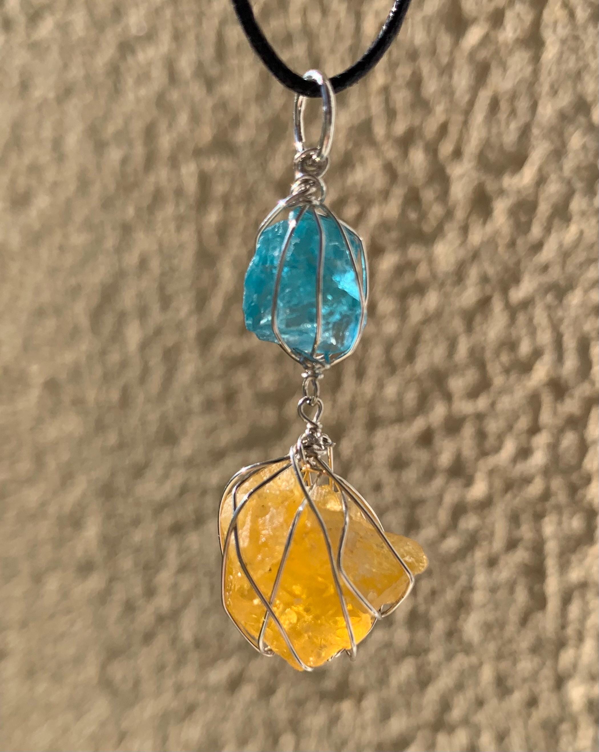 It is done in solid silver with a rough apatit and a rough, yellow fluorite from France, wrapped in silver wire.