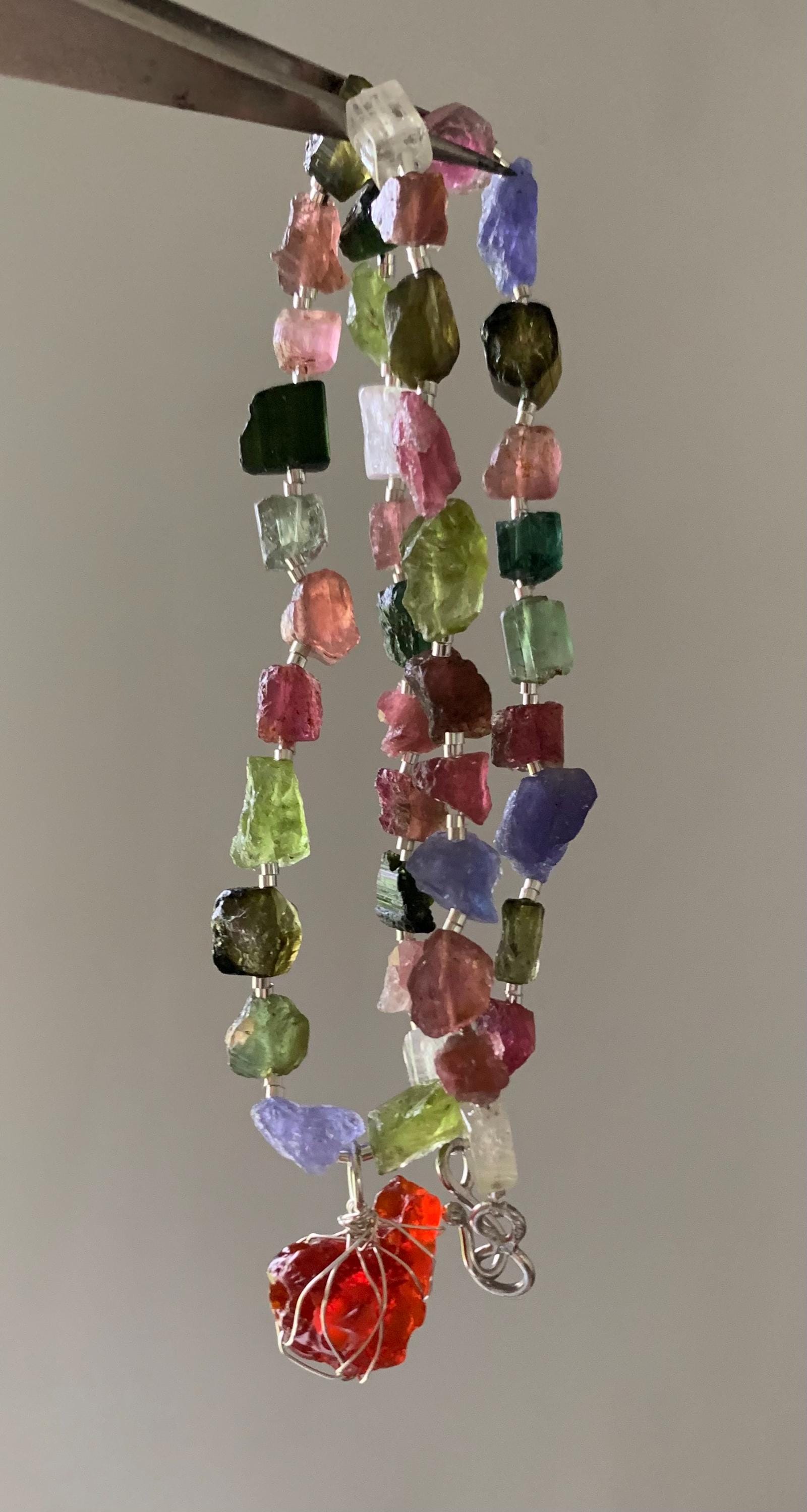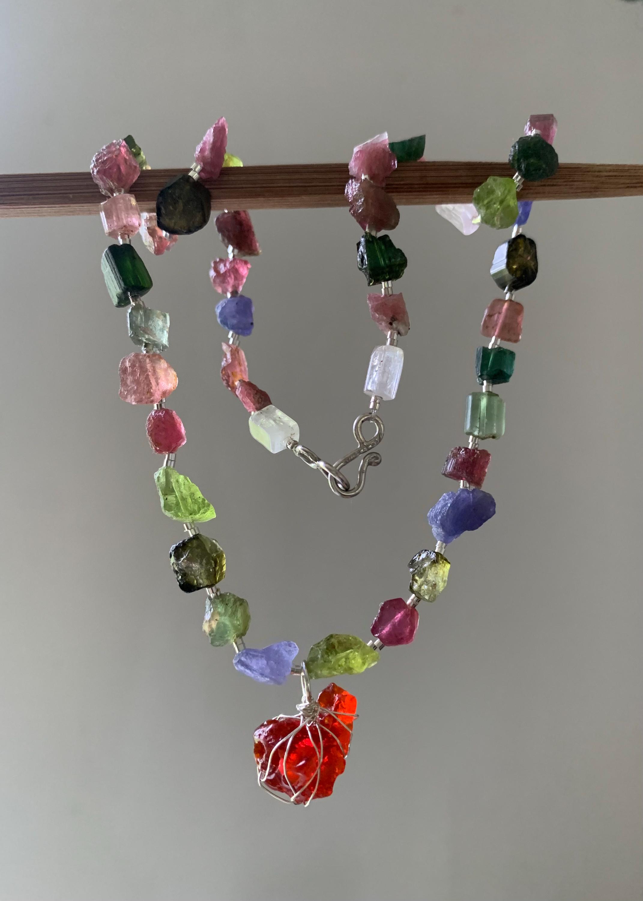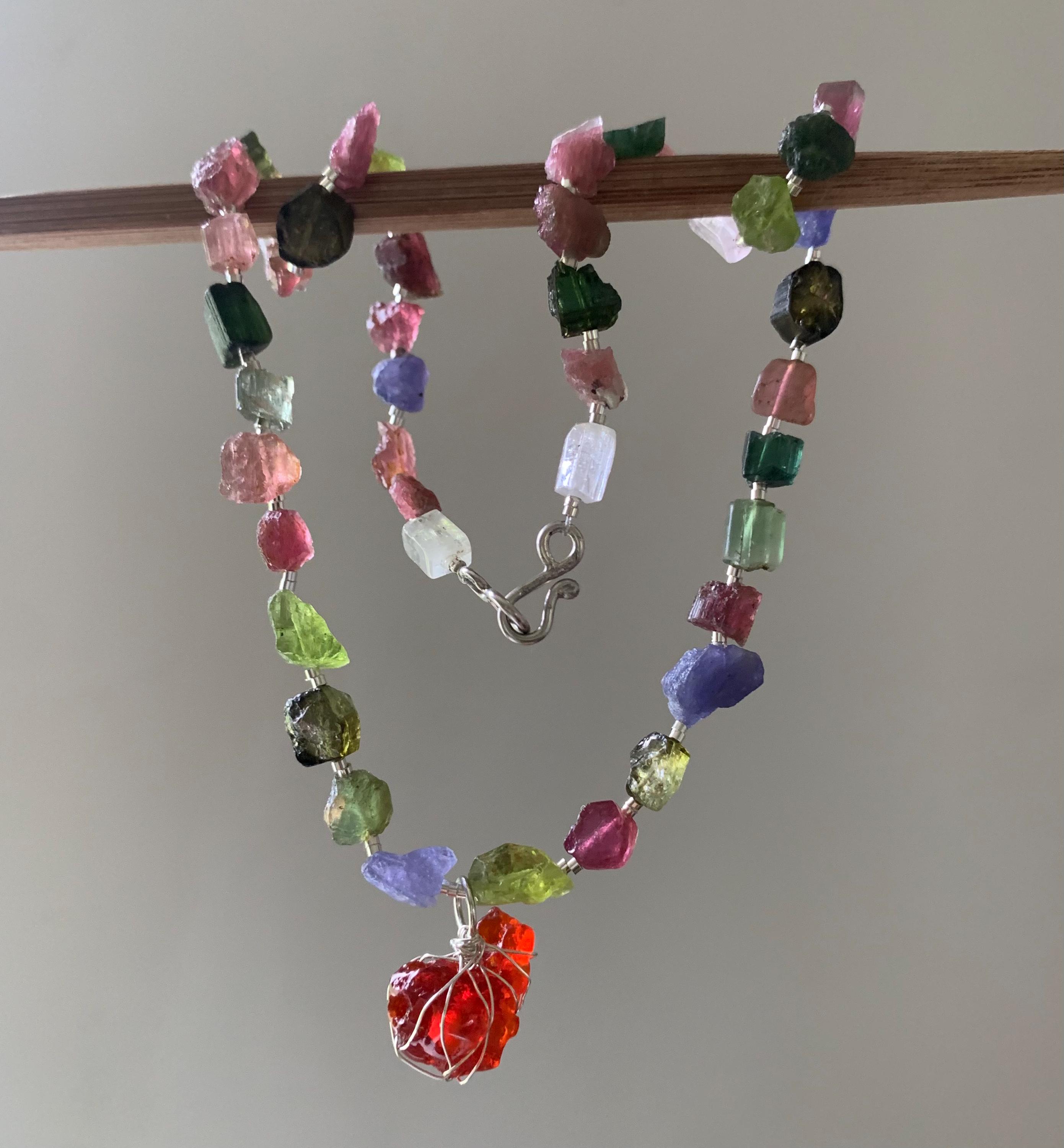 In the middle of the necklace is hanging a mexican fire opal wrapped in silver wire.