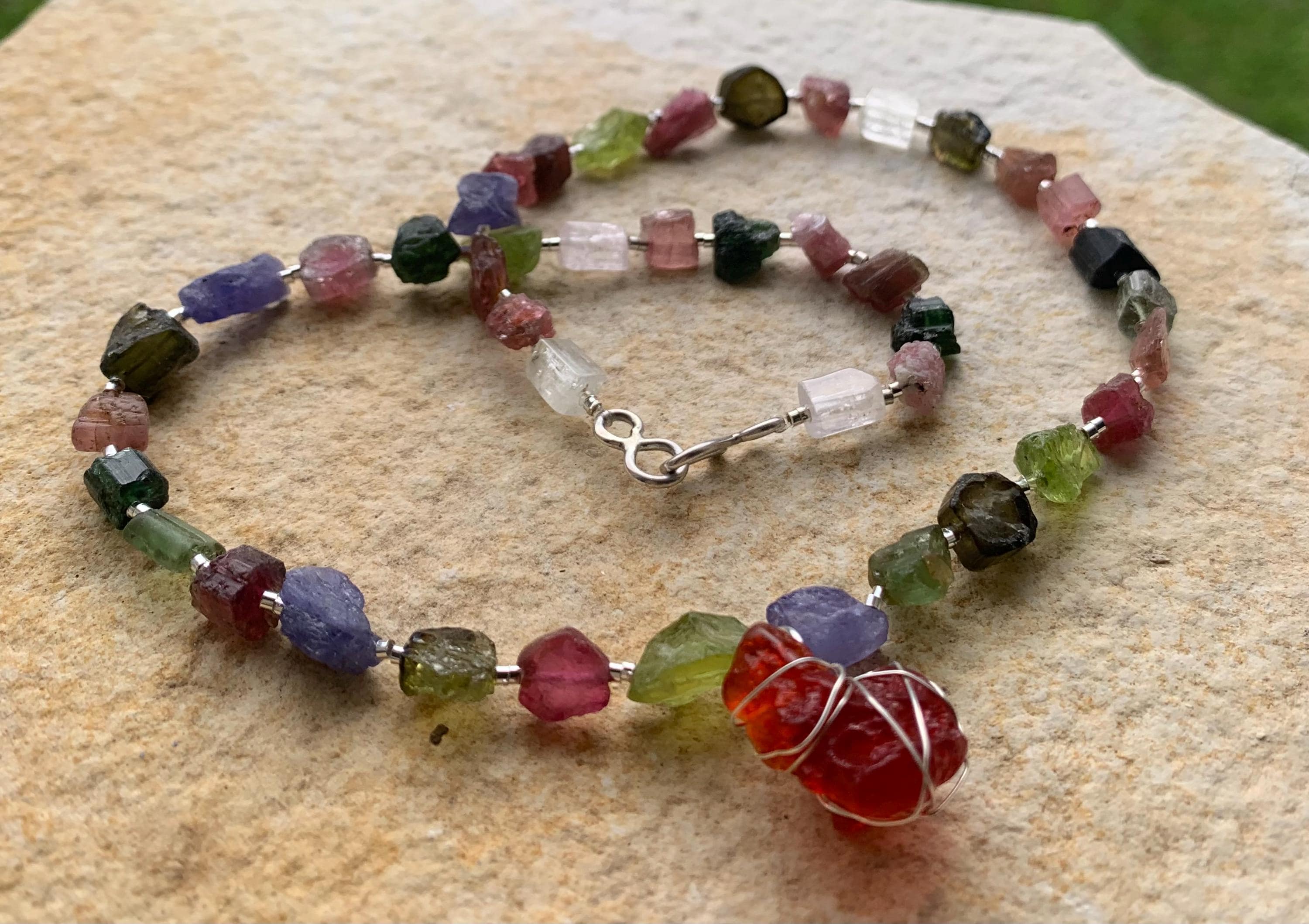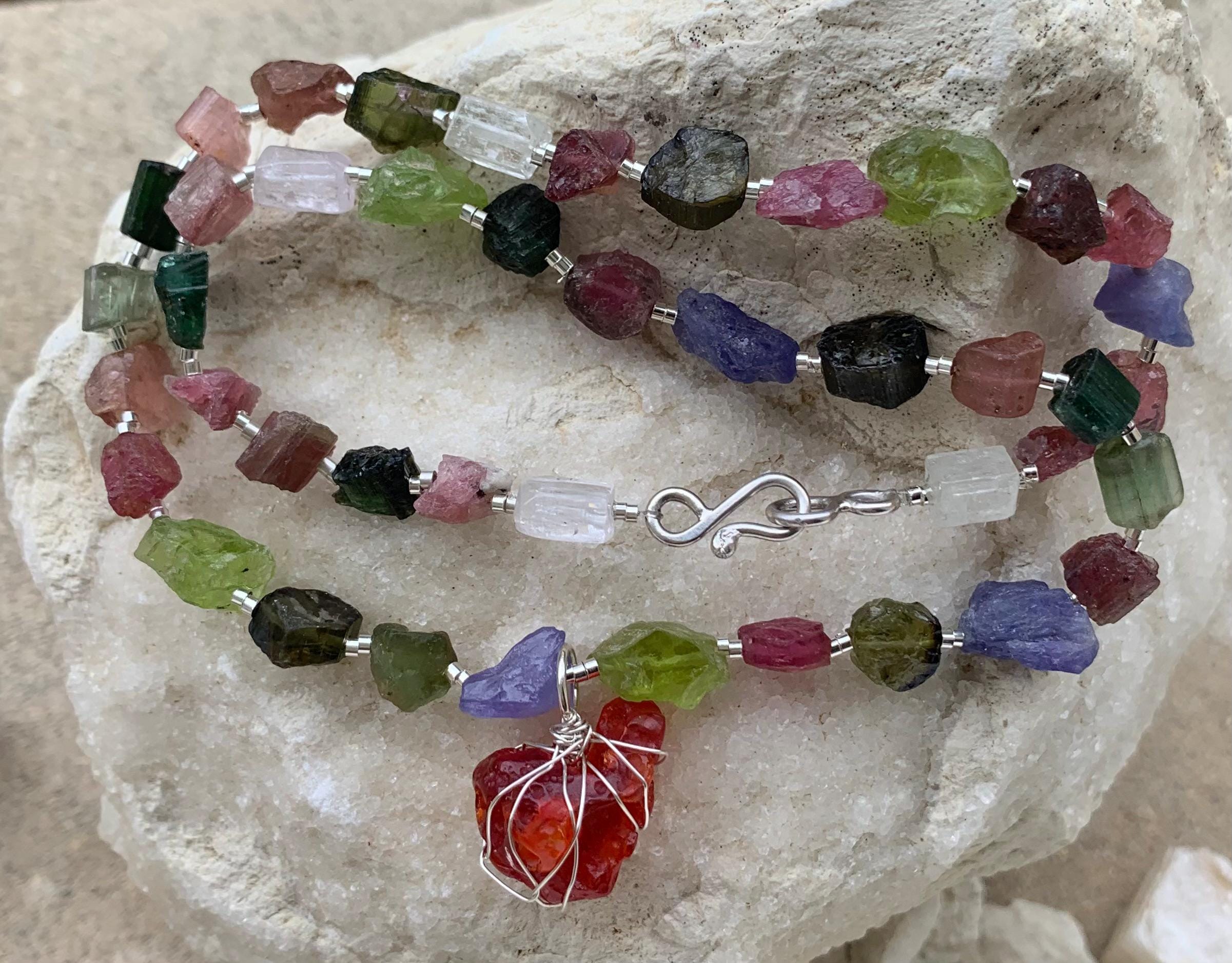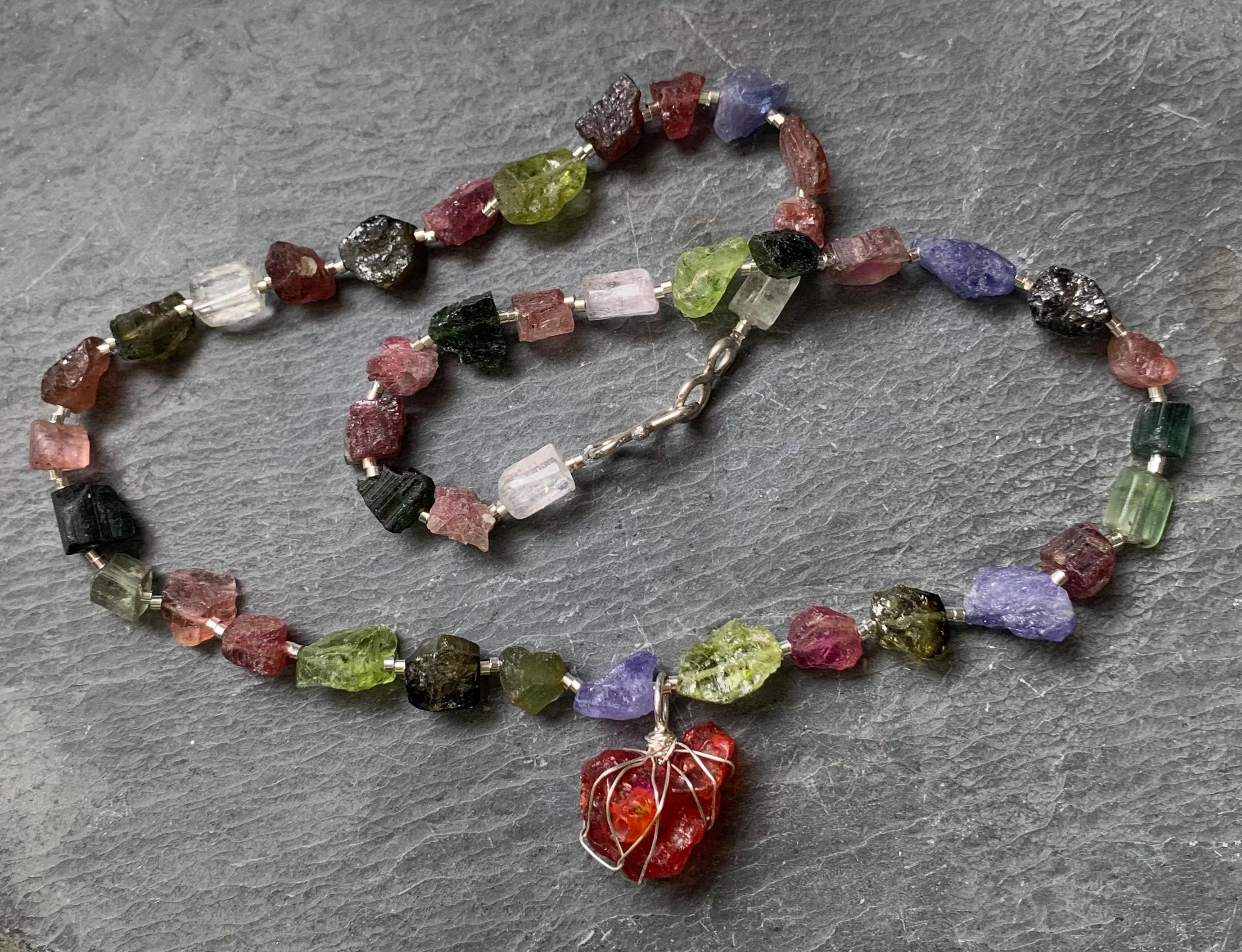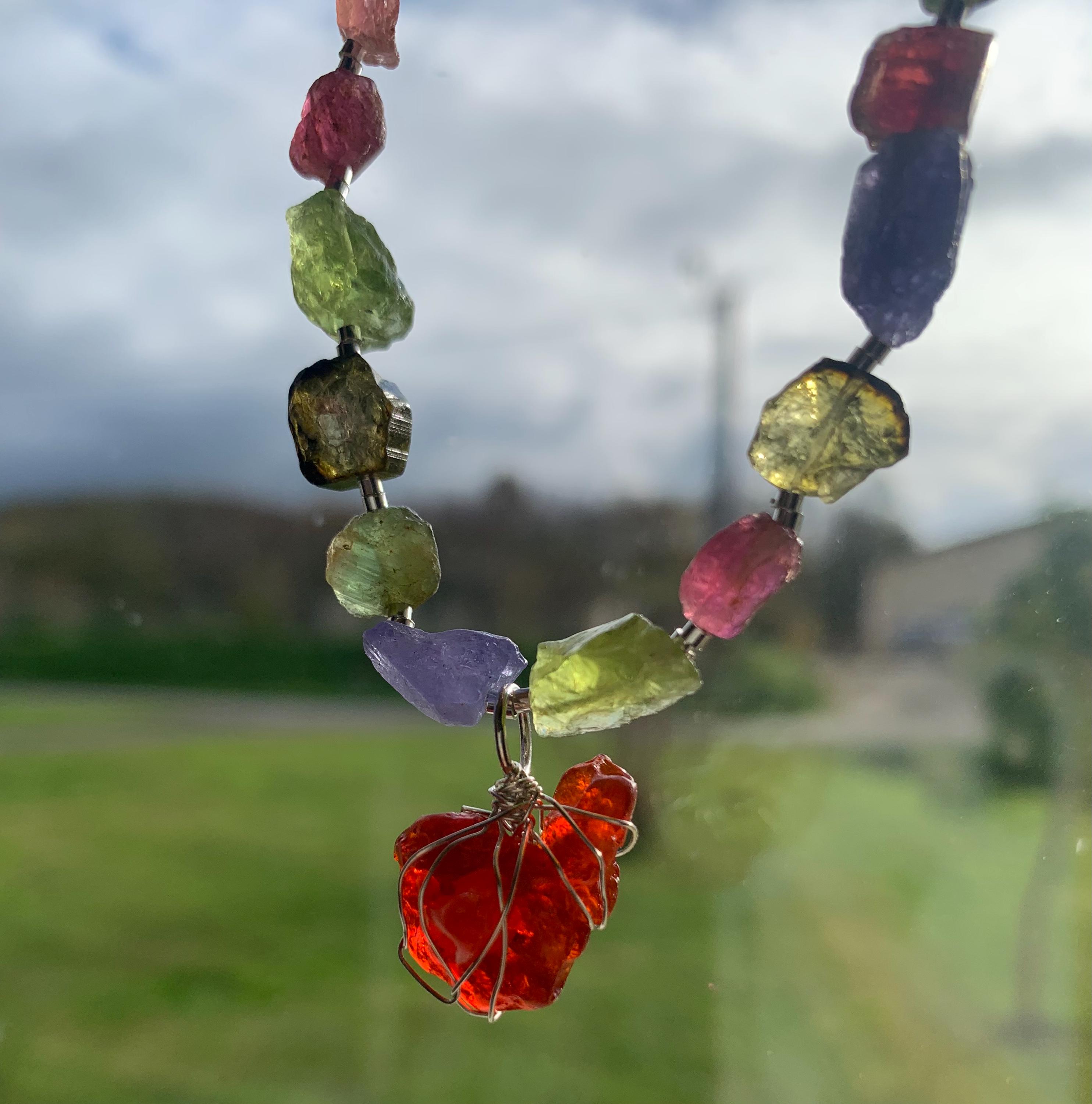 In the middle of the necklace is hanging a mexican fire opal wrapped in silver wire.